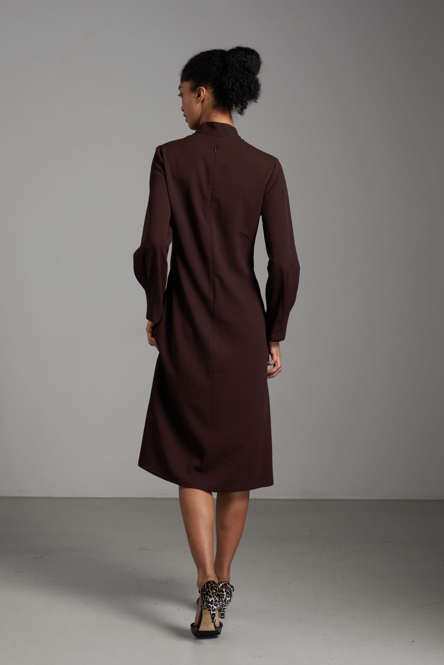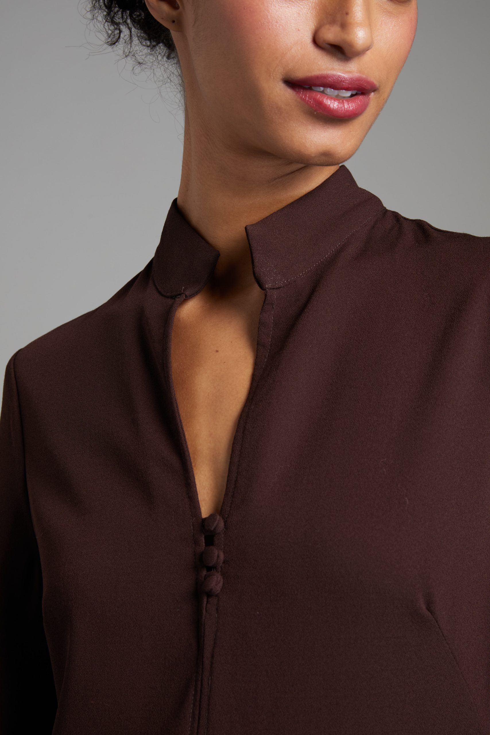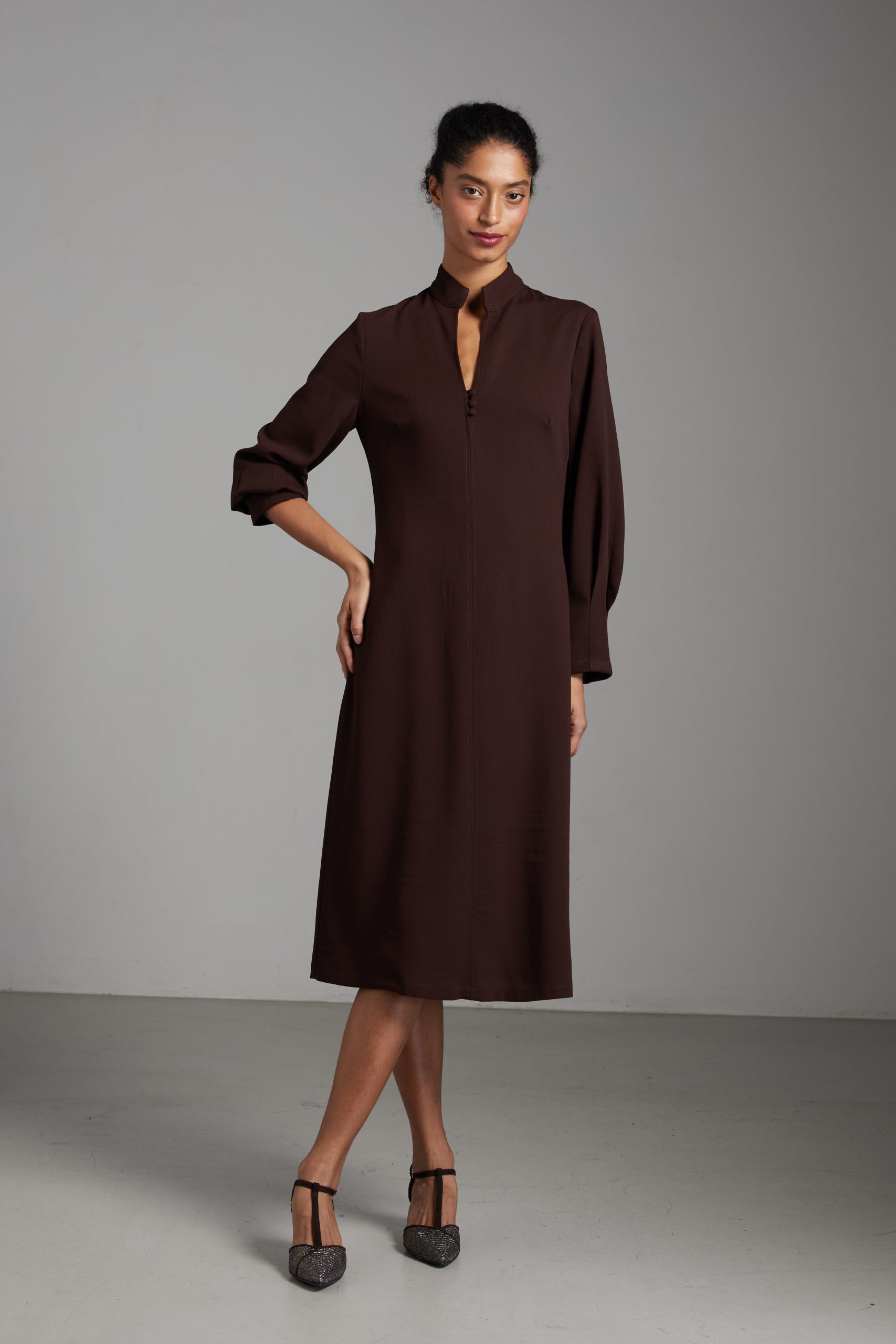 Abito Jasmine di Carla Saibene in seta rossa con stampa pitonata, longuette, collo alla coreana e scollo chiuso da tre bottoncini in tessuto, manica lunga tenuta da pieghe sul fondo.