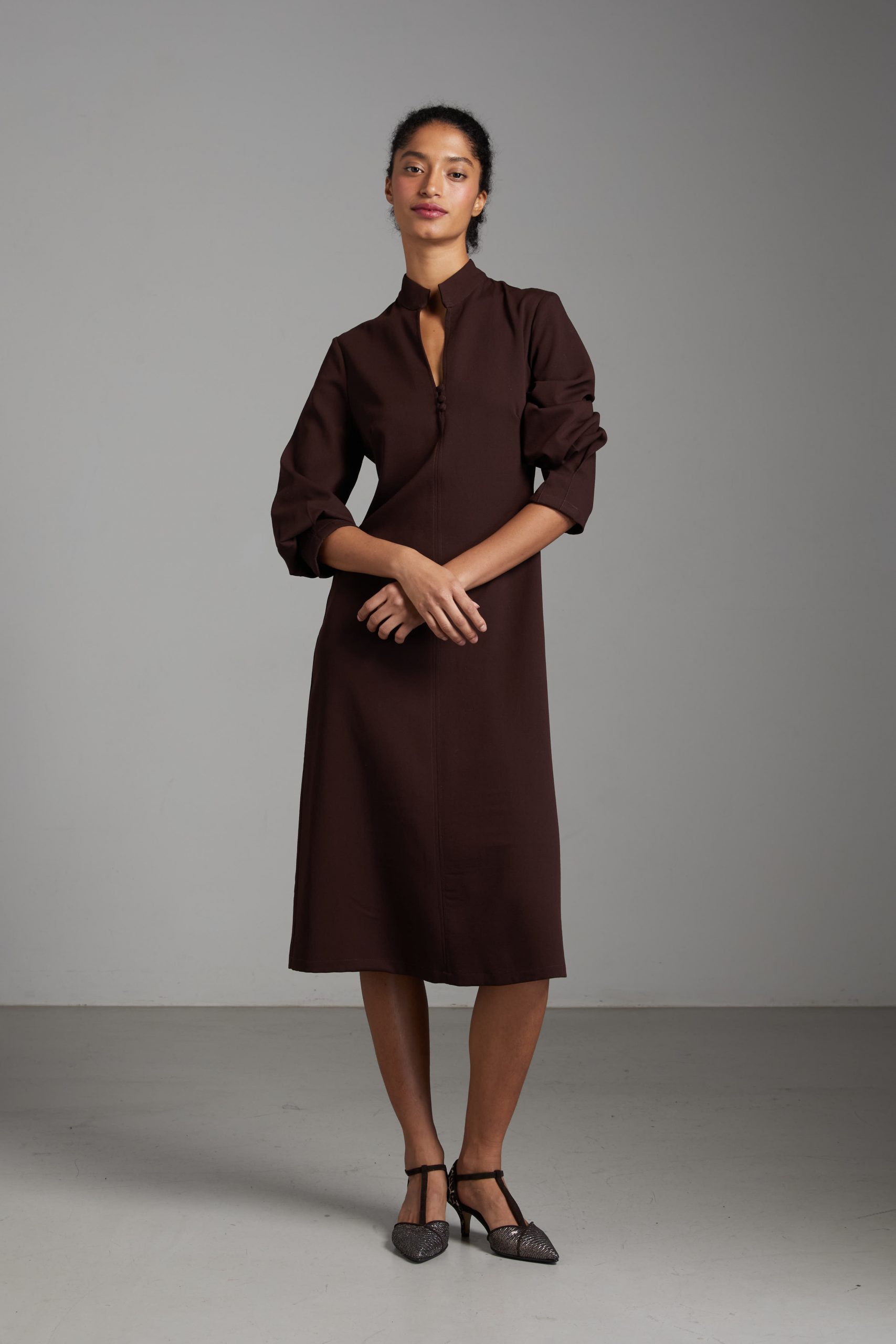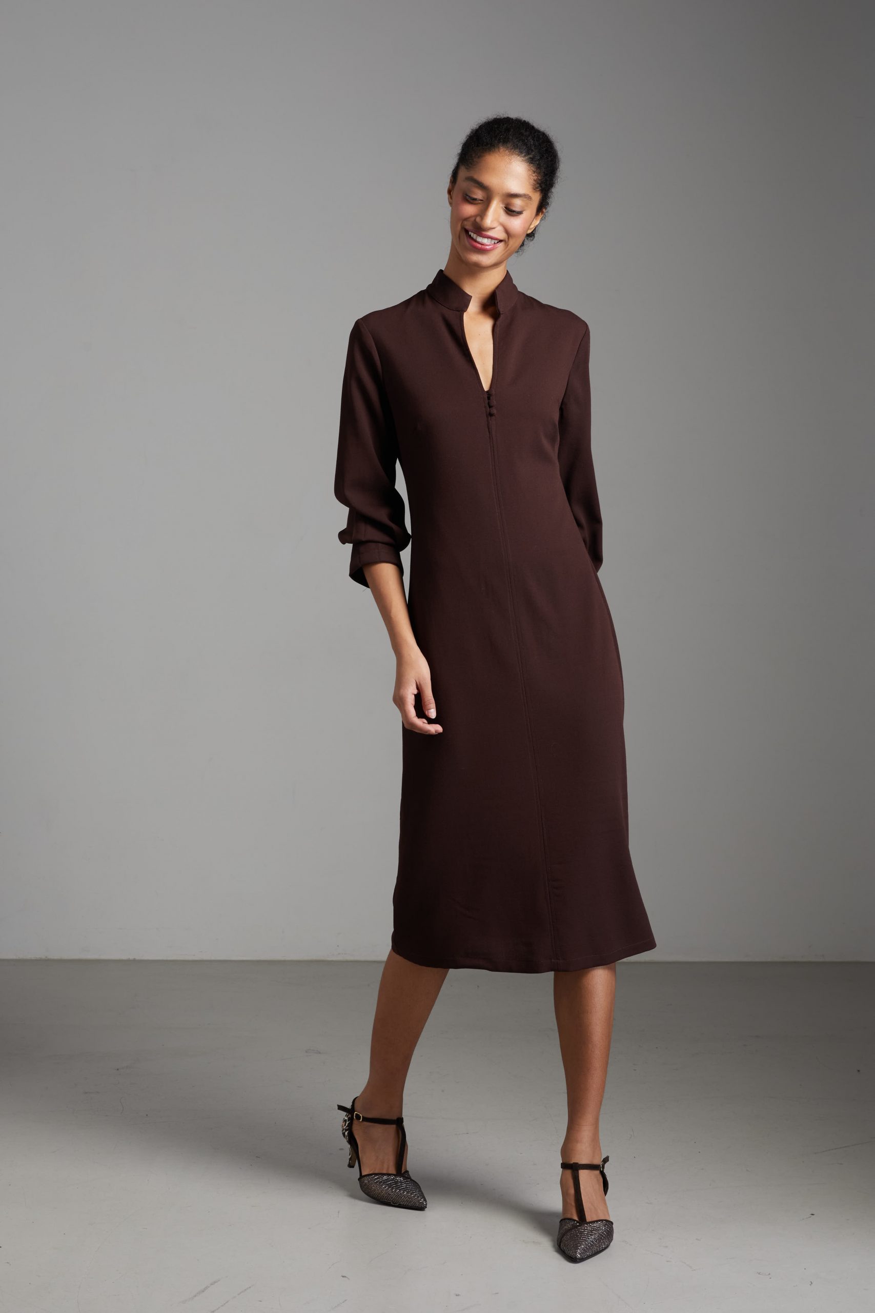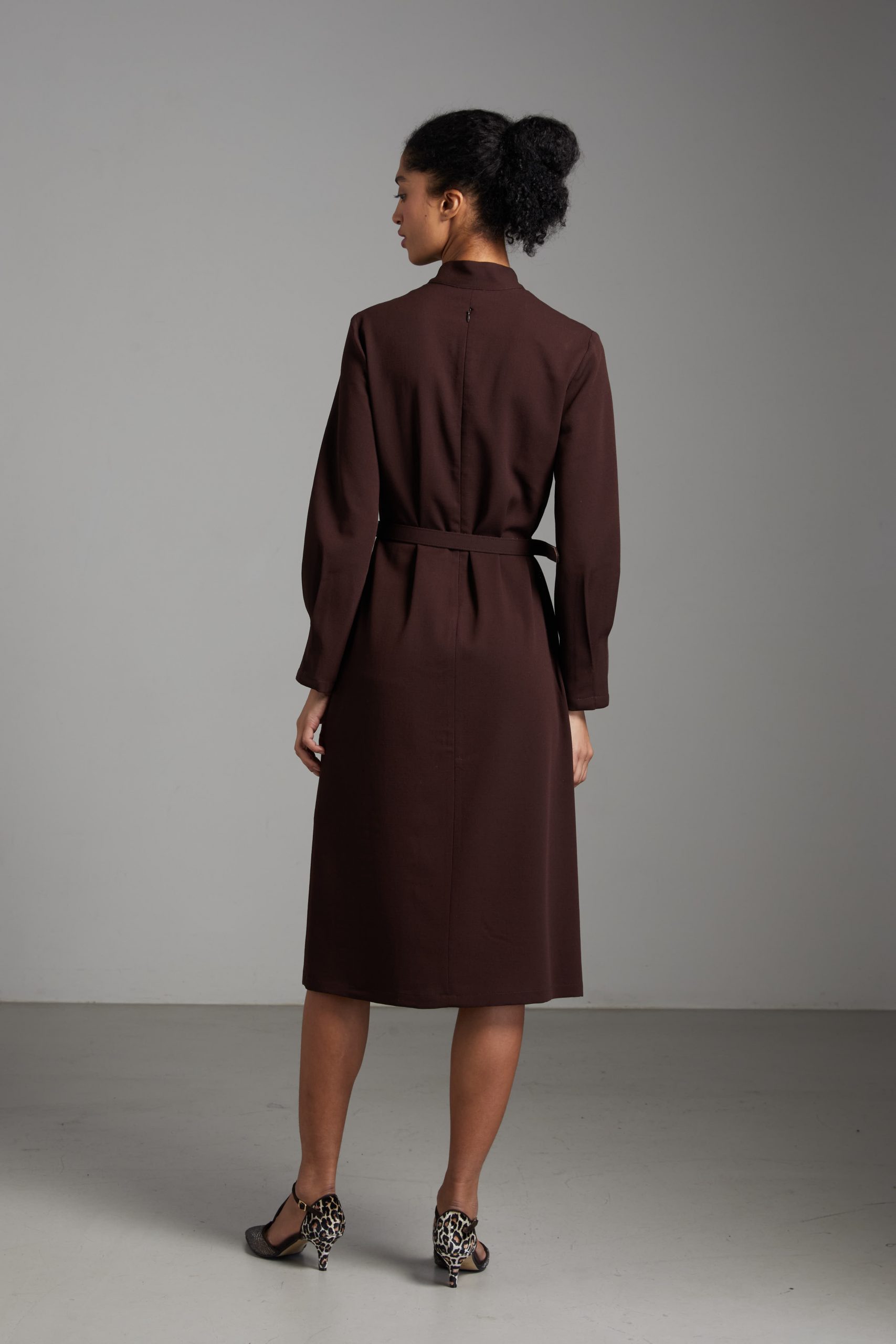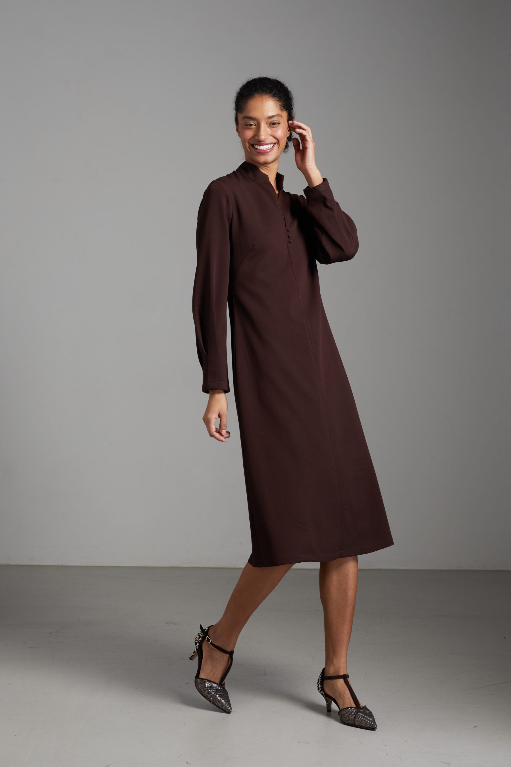 Abito Jasmine di Carla Saibene in seta rossa con stampa pitonata, longuette, collo alla coreana e scollo chiuso da tre bottoncini in tessuto, manica lunga tenuta da pieghe sul fondo.