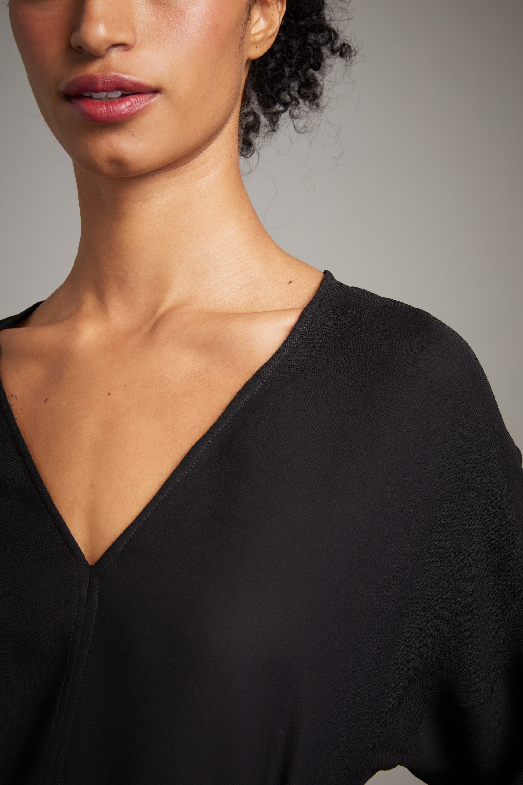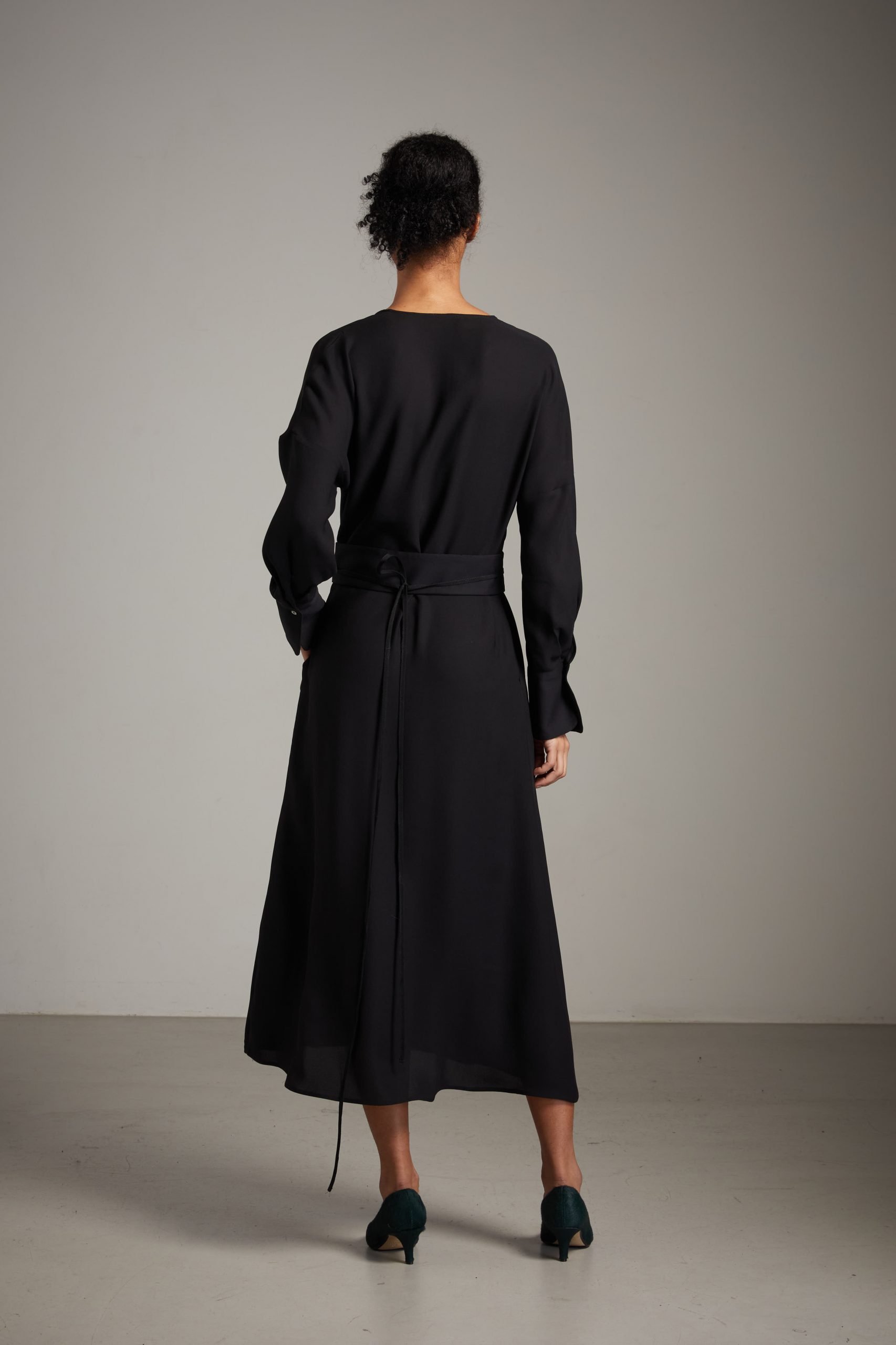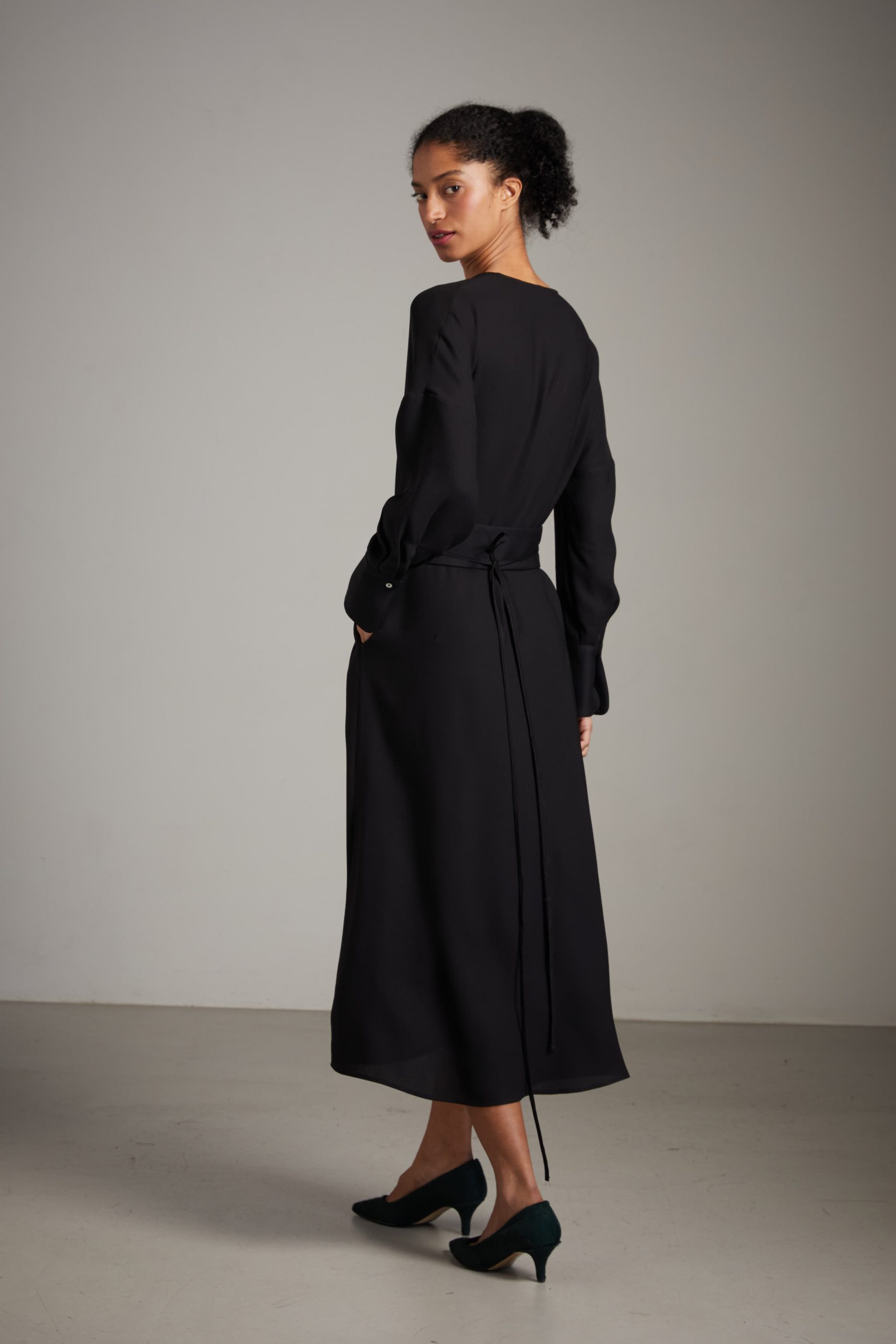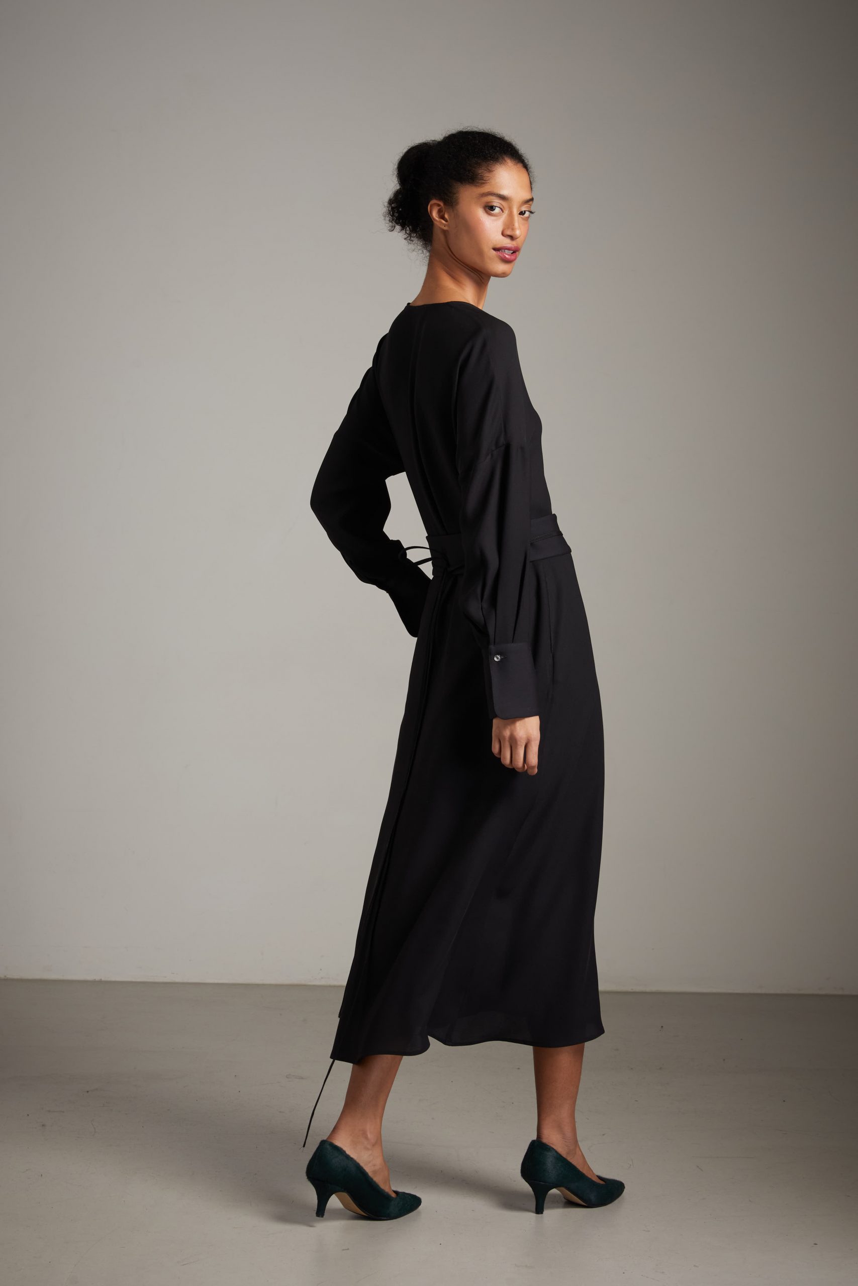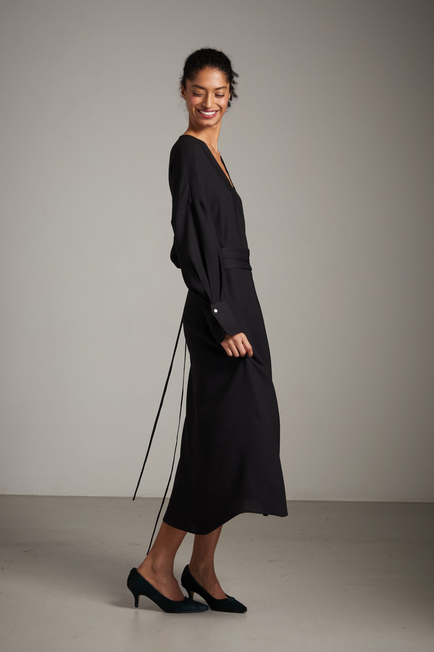 Abito Scarlett di Carla Saibene, longuette, scollo a V, manica lunga e ampia, con cintura alta in tinta