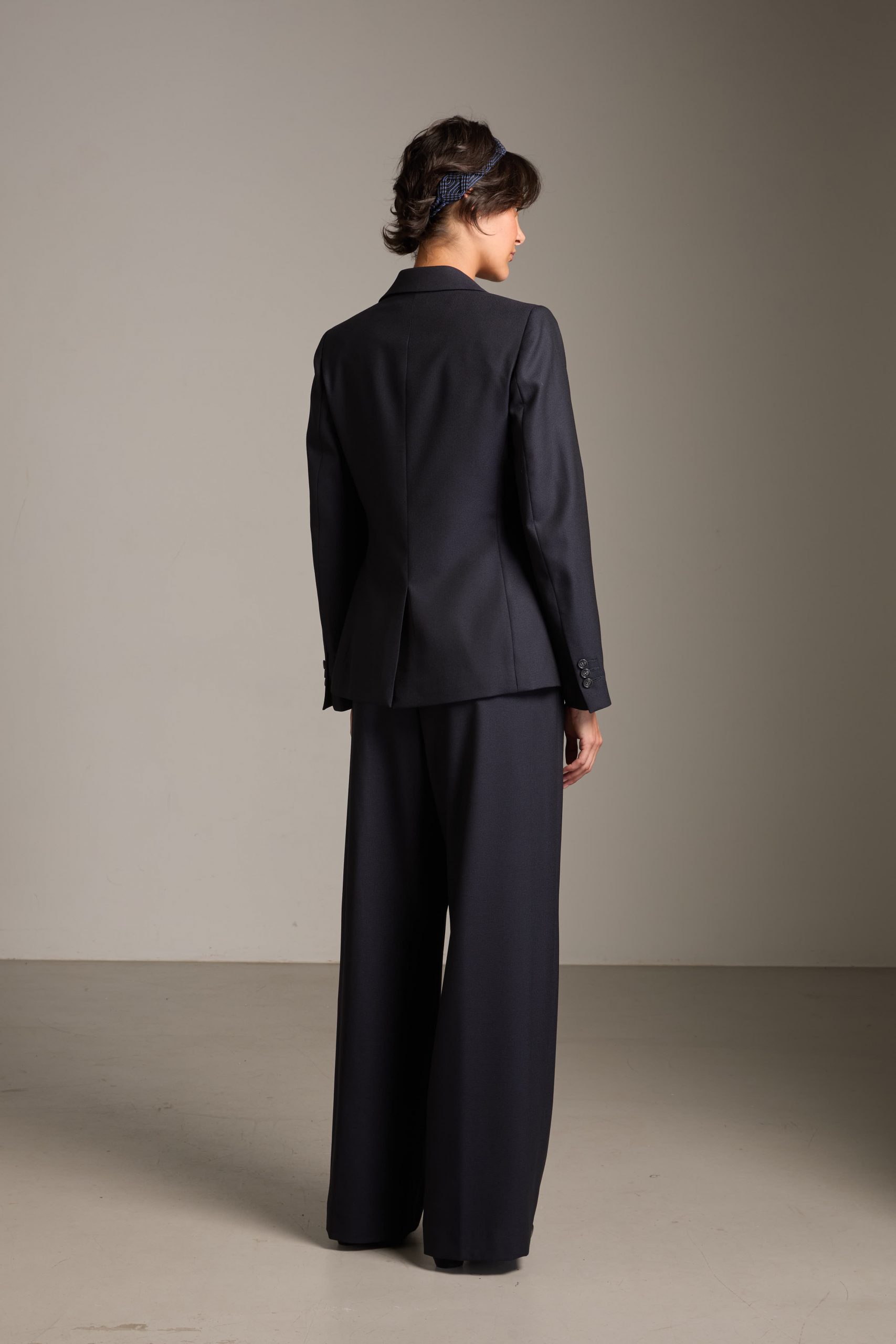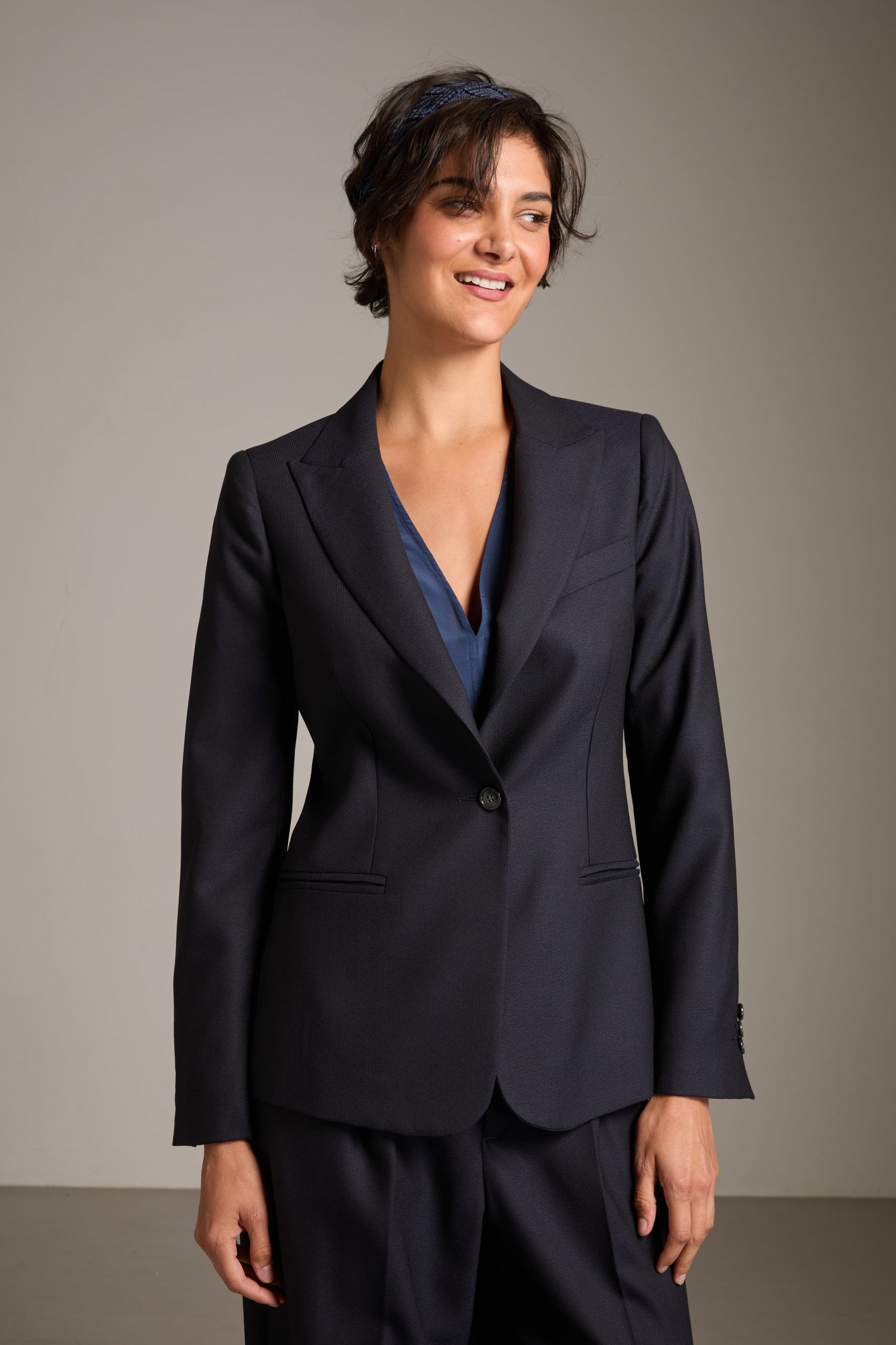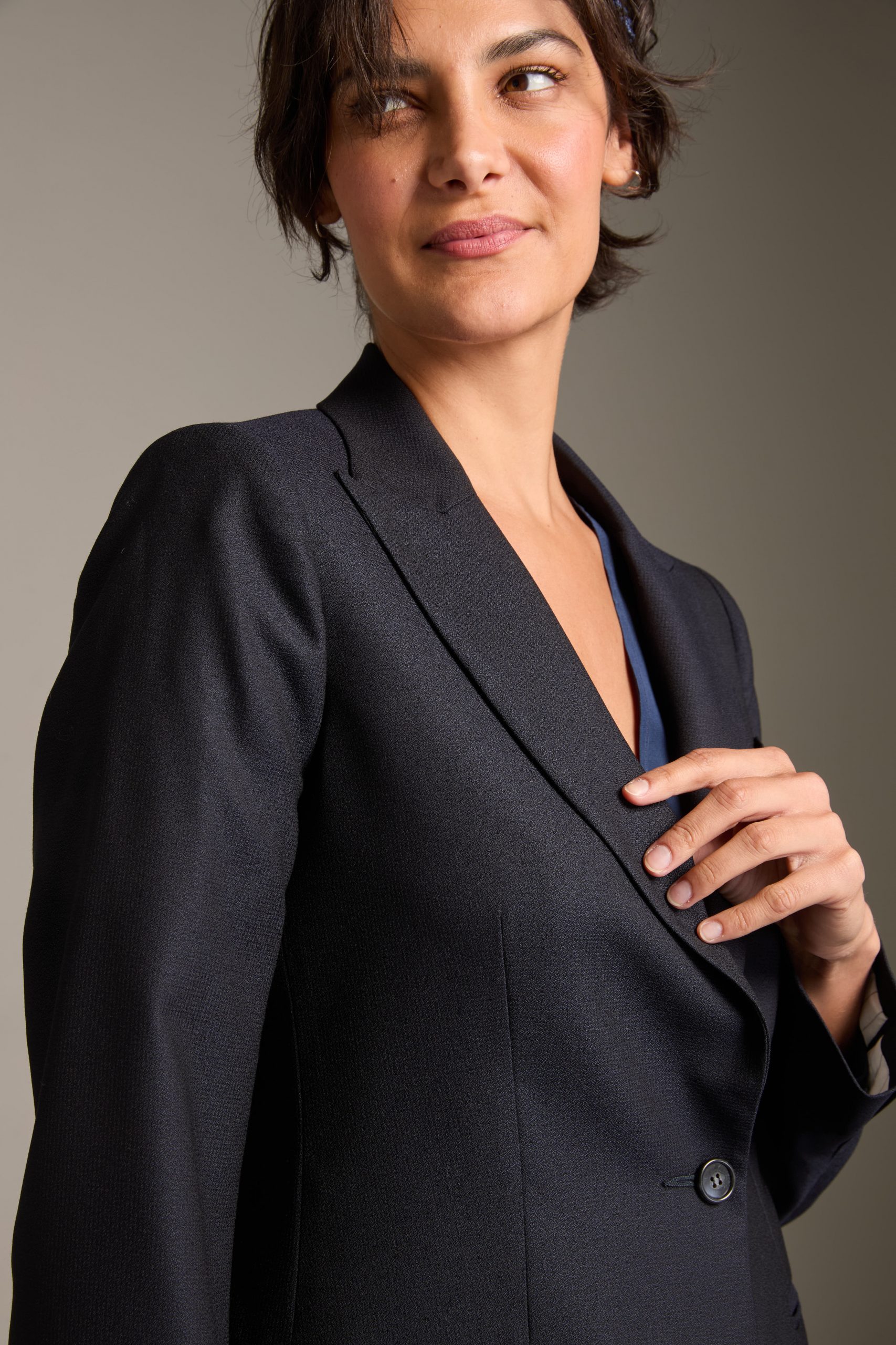 Blazer Liz di Carla Saibene, giacca monopetto in crepe di lana nera e blu, ad un bottone dal taglio elegante e sartoriale , con ampi revers a lancia.