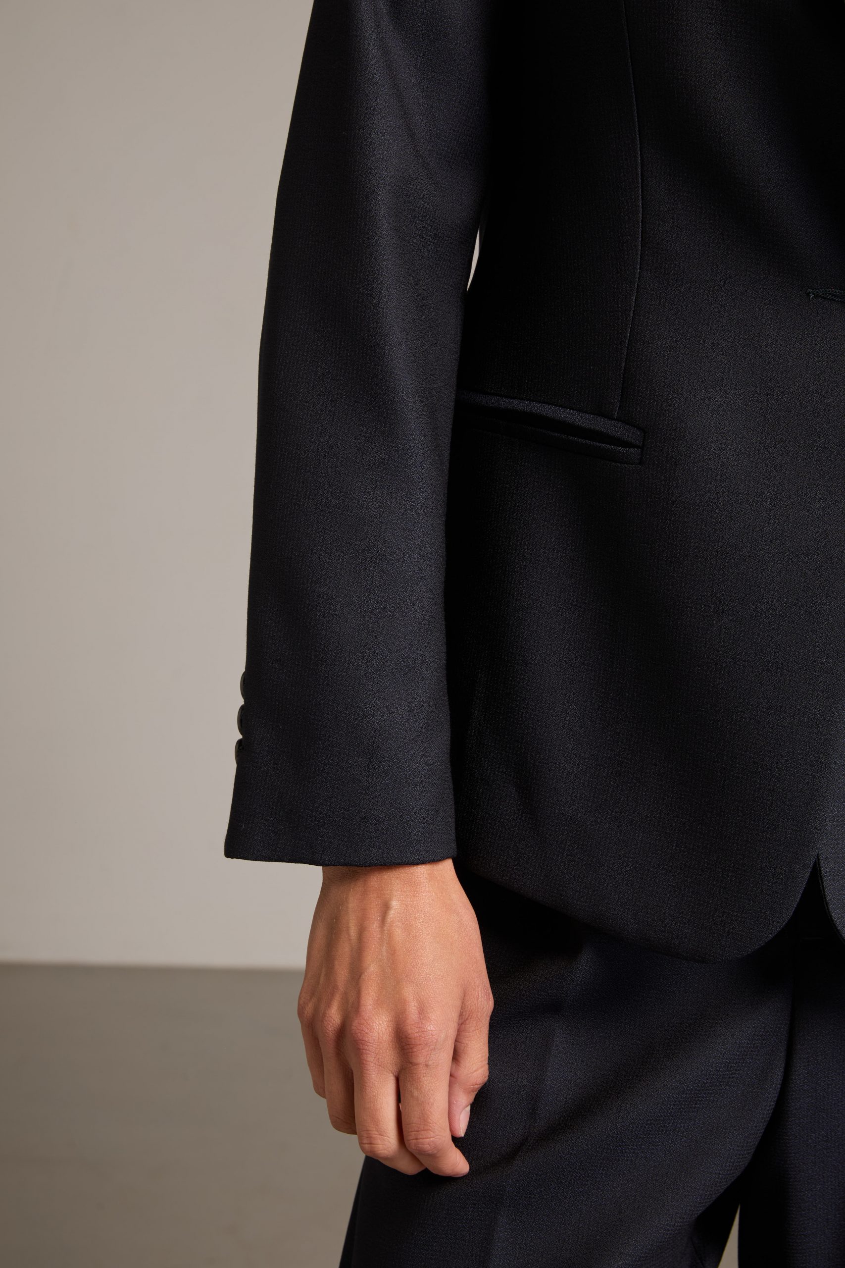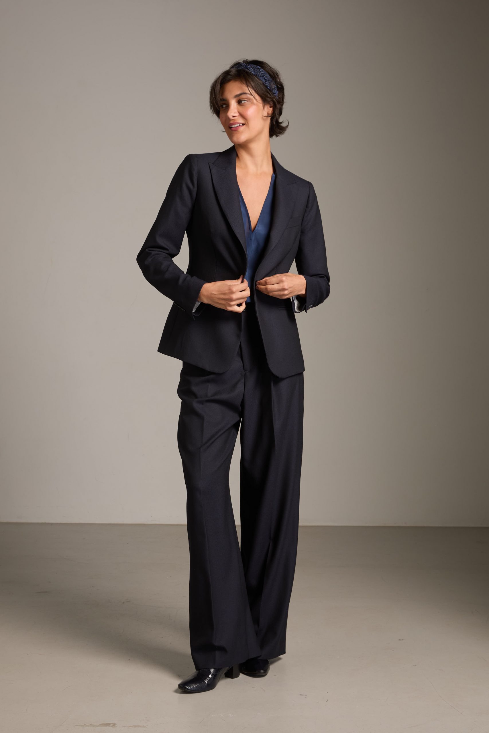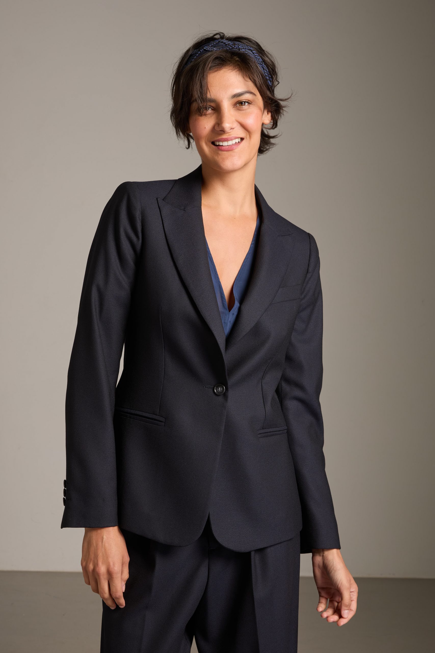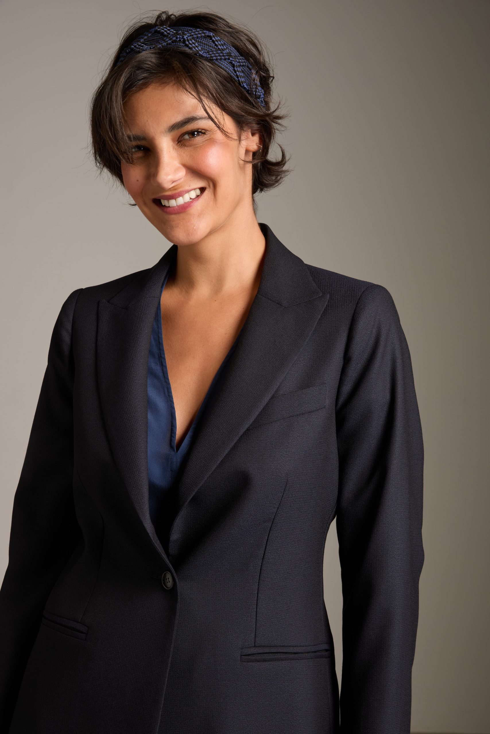 Blazer Liz di Carla Saibene, giacca monopetto in crepe di lana nera e blu, ad un bottone dal taglio elegante e sartoriale , con ampi revers a lancia.