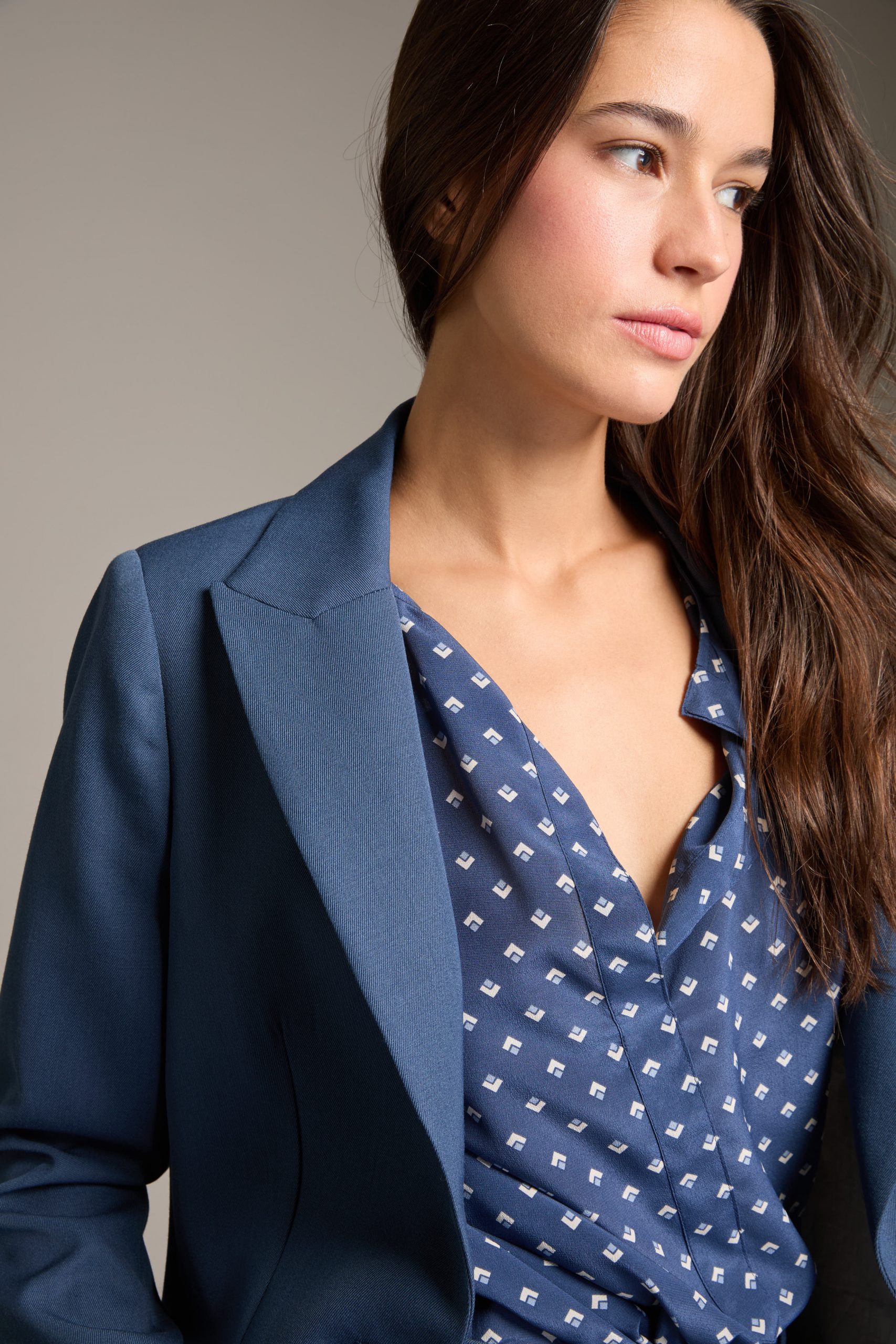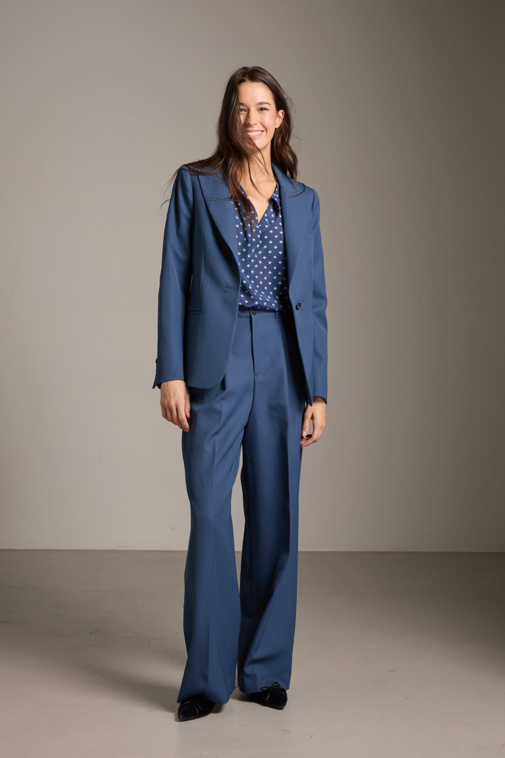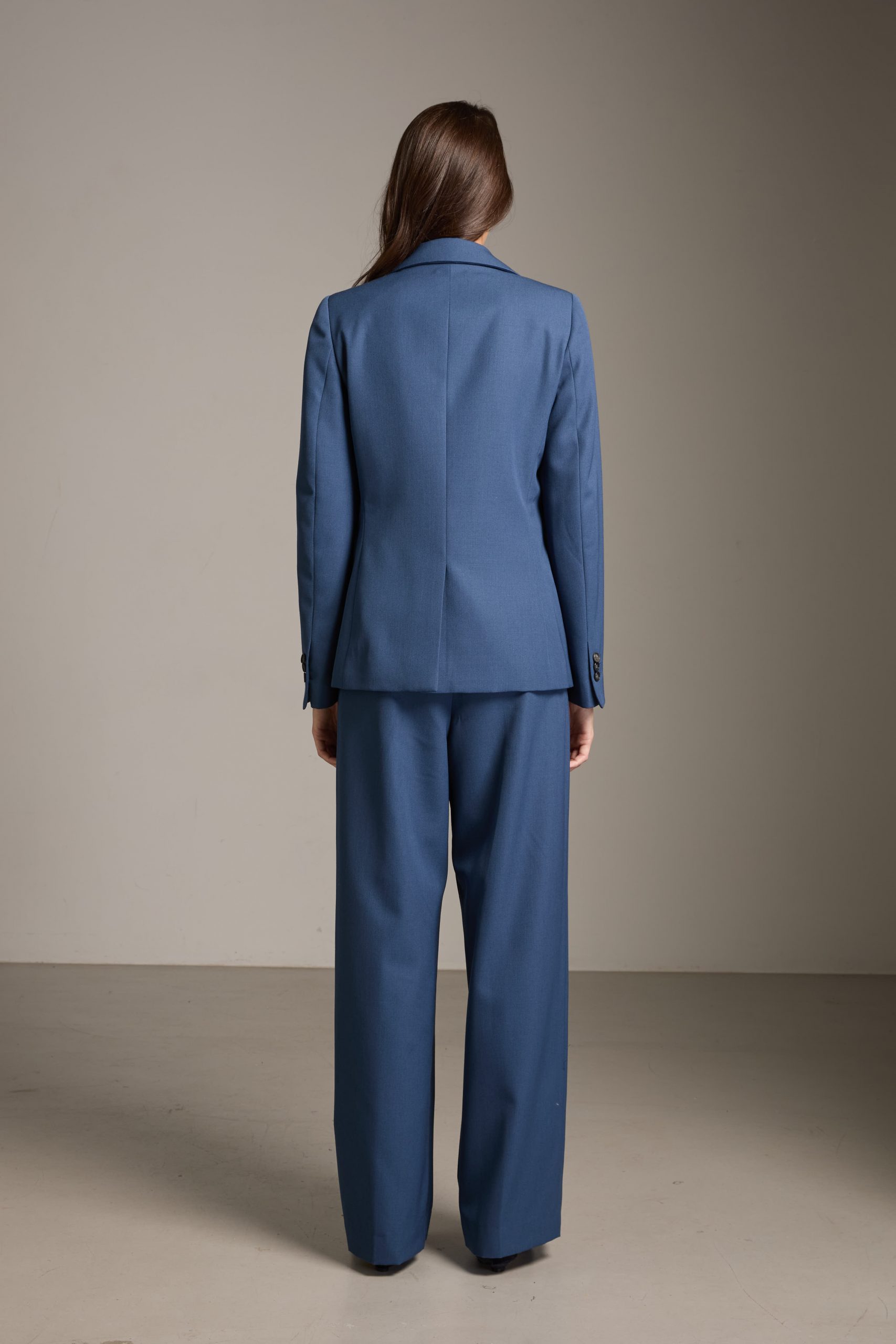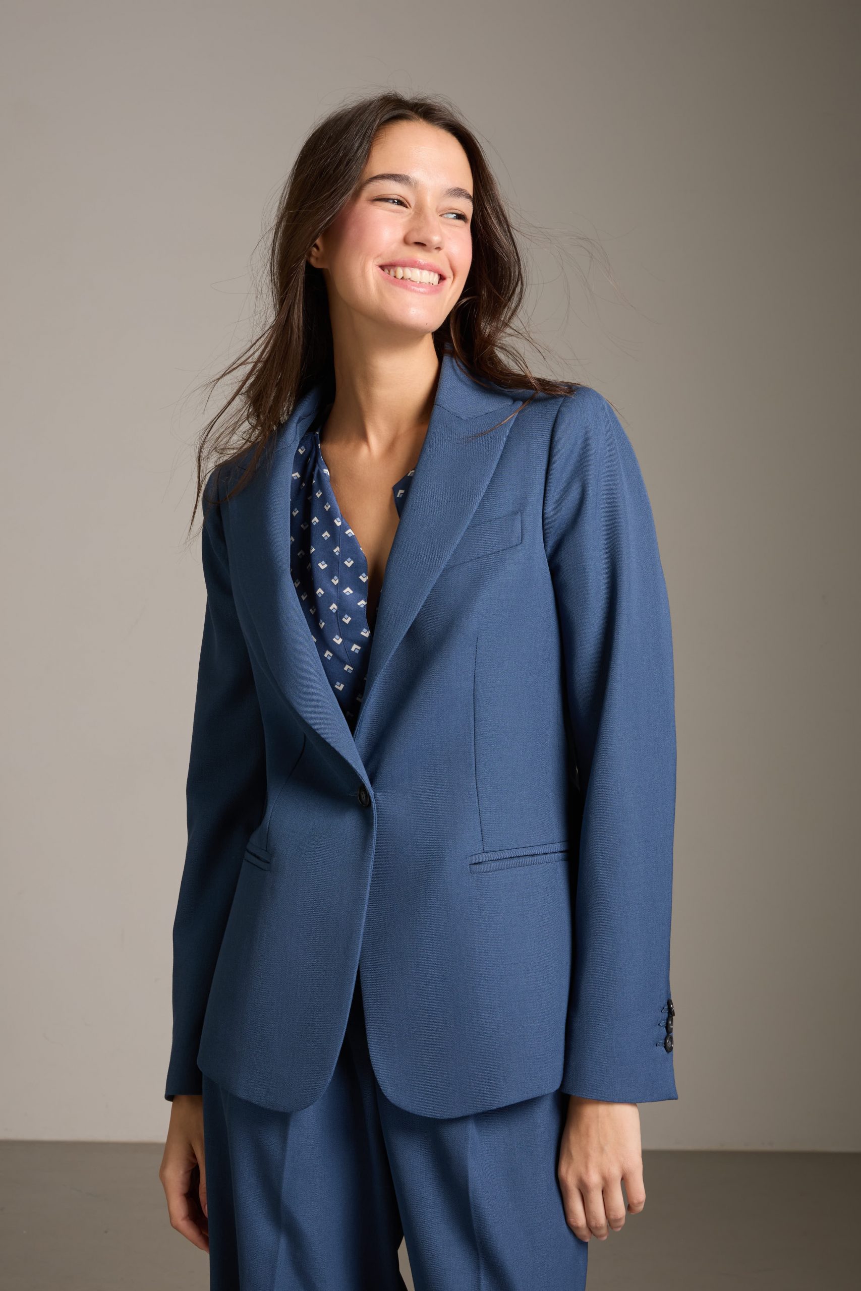 Blazer Liz di Carla Saibene, giacca monopetto in drill di lana azzurro polvere, ad un bottone dal taglio elegante e sartoriale , con ampi revers a lancia.