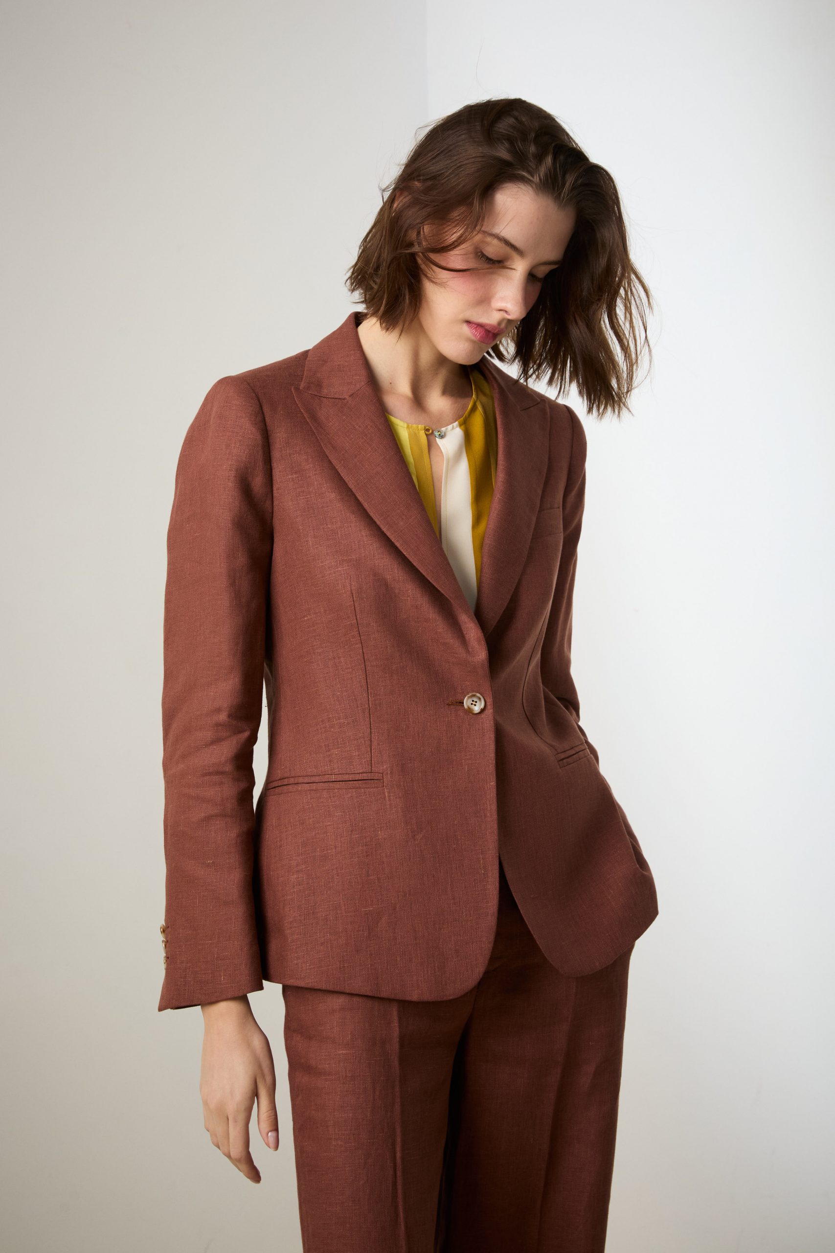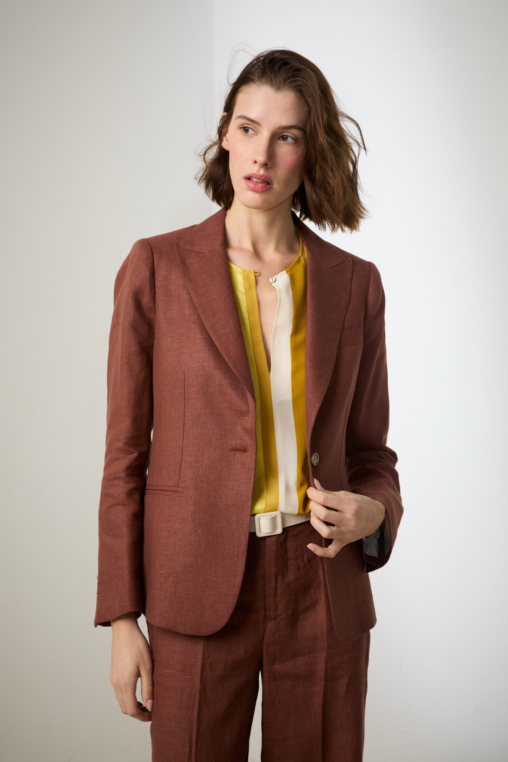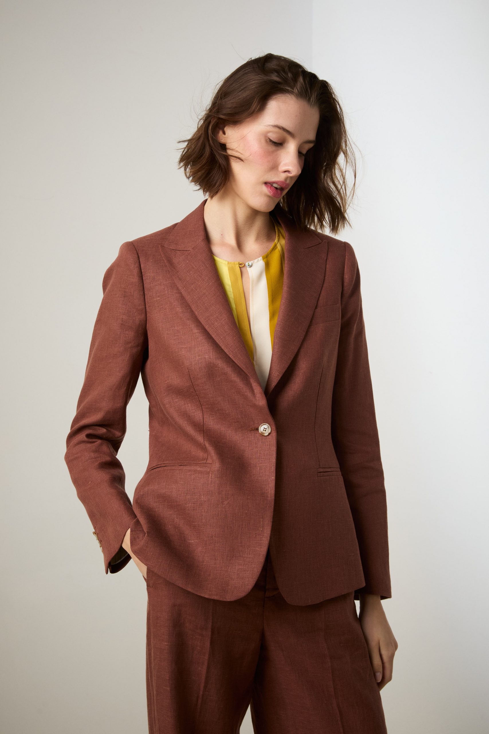 Blazer Liz di Carla Saibene, giacca monopetto in lino nocciola, ad un bottone dal taglio elegante e sartoriale , con ampi revers a lancia.