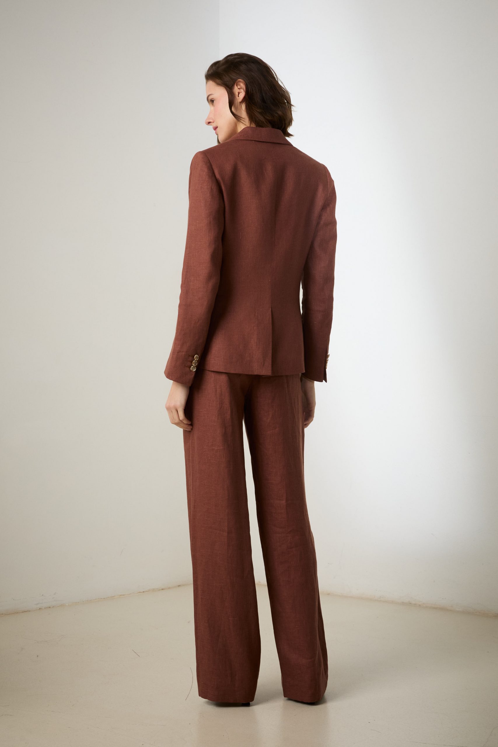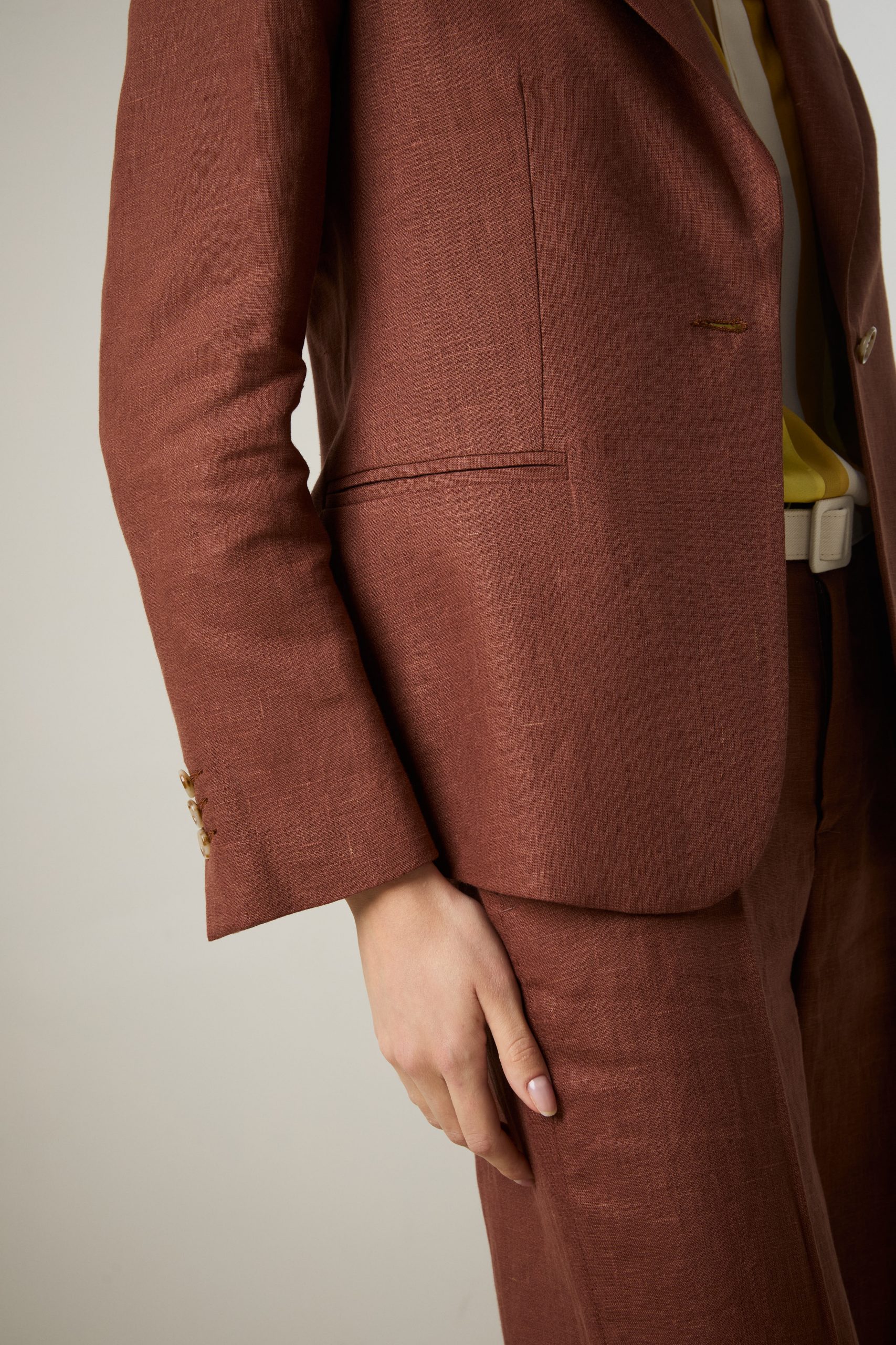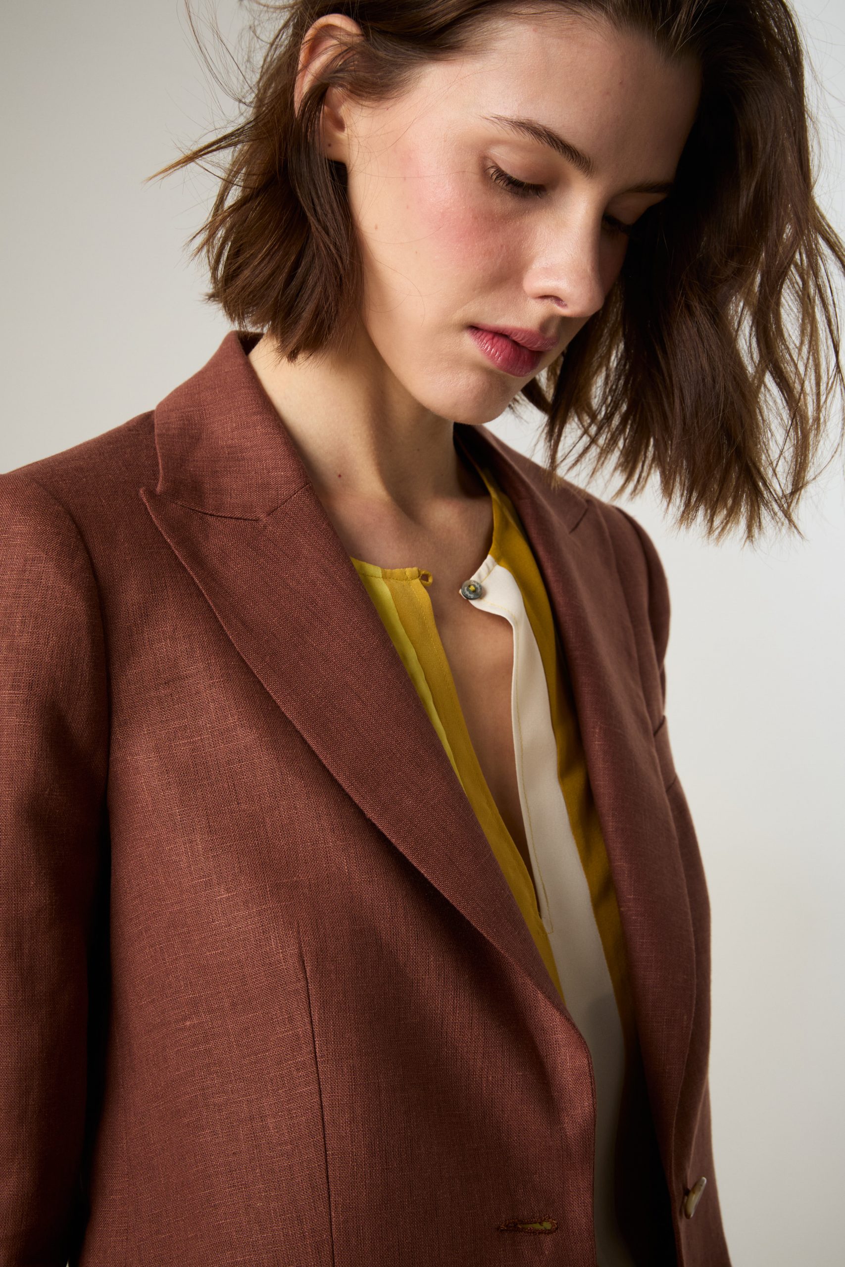 Blazer Liz di Carla Saibene, giacca monopetto in lino nocciola, ad un bottone dal taglio elegante e sartoriale , con ampi revers a lancia.