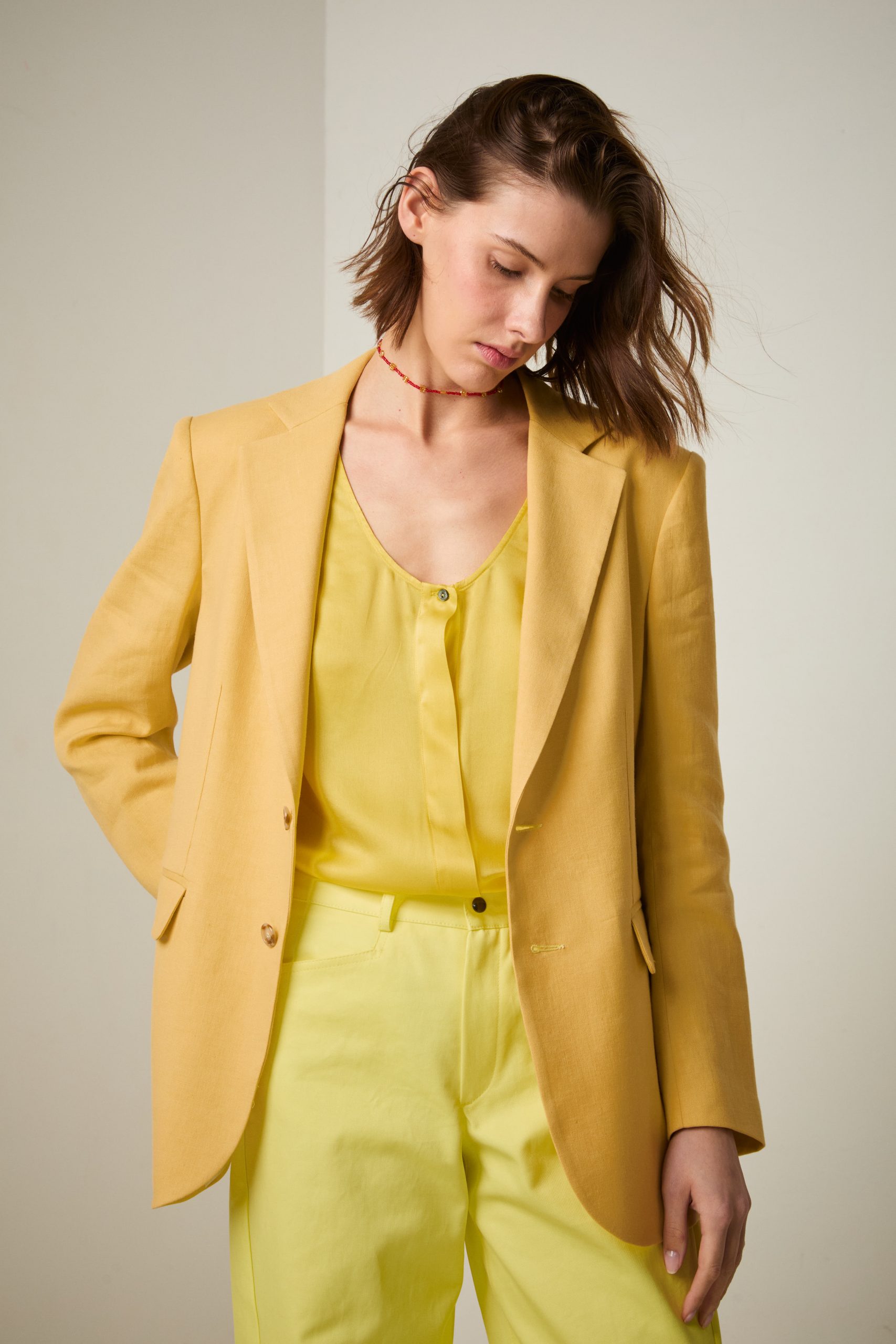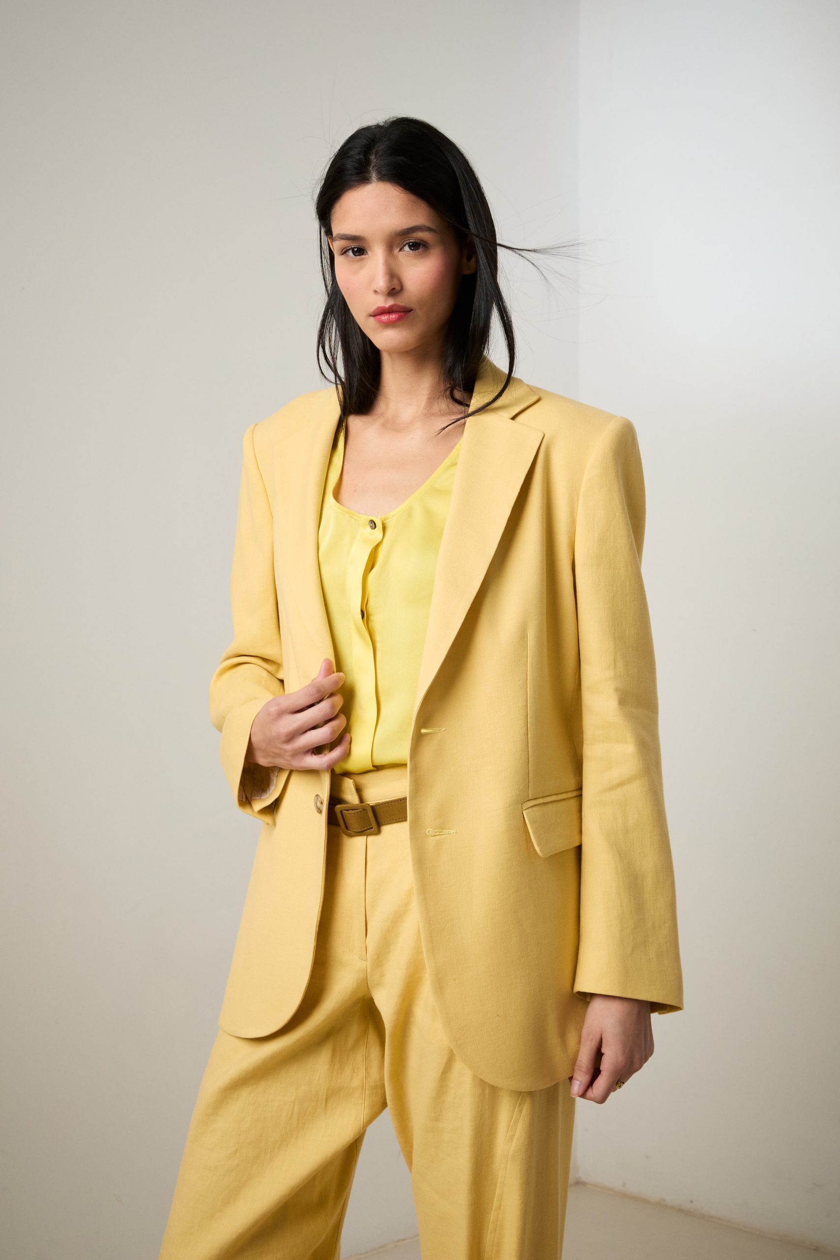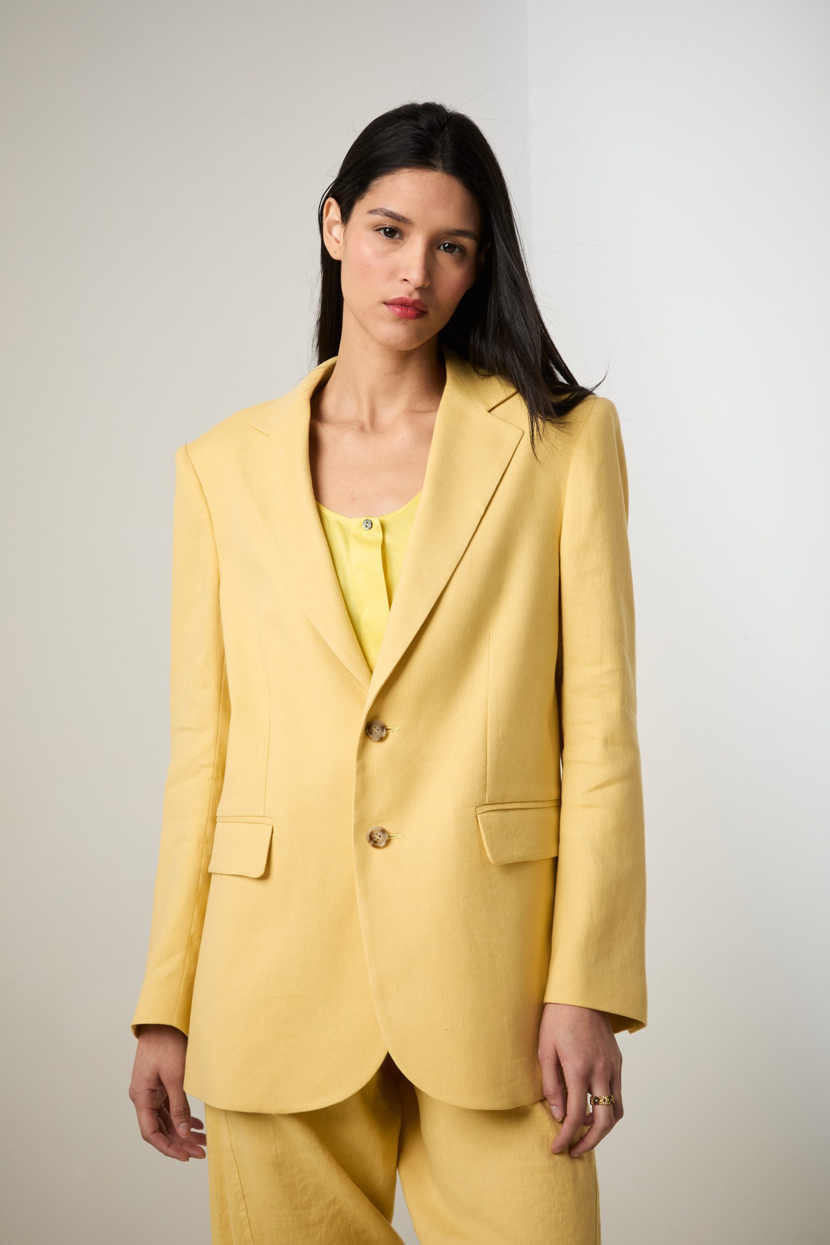 Blazer Pier di Carla Saibene, giacca monopetto a due bottoni dal taglio maschile in lino giallo chiaro. Con spalline, tasche a filetto e due spacchi sul retro.