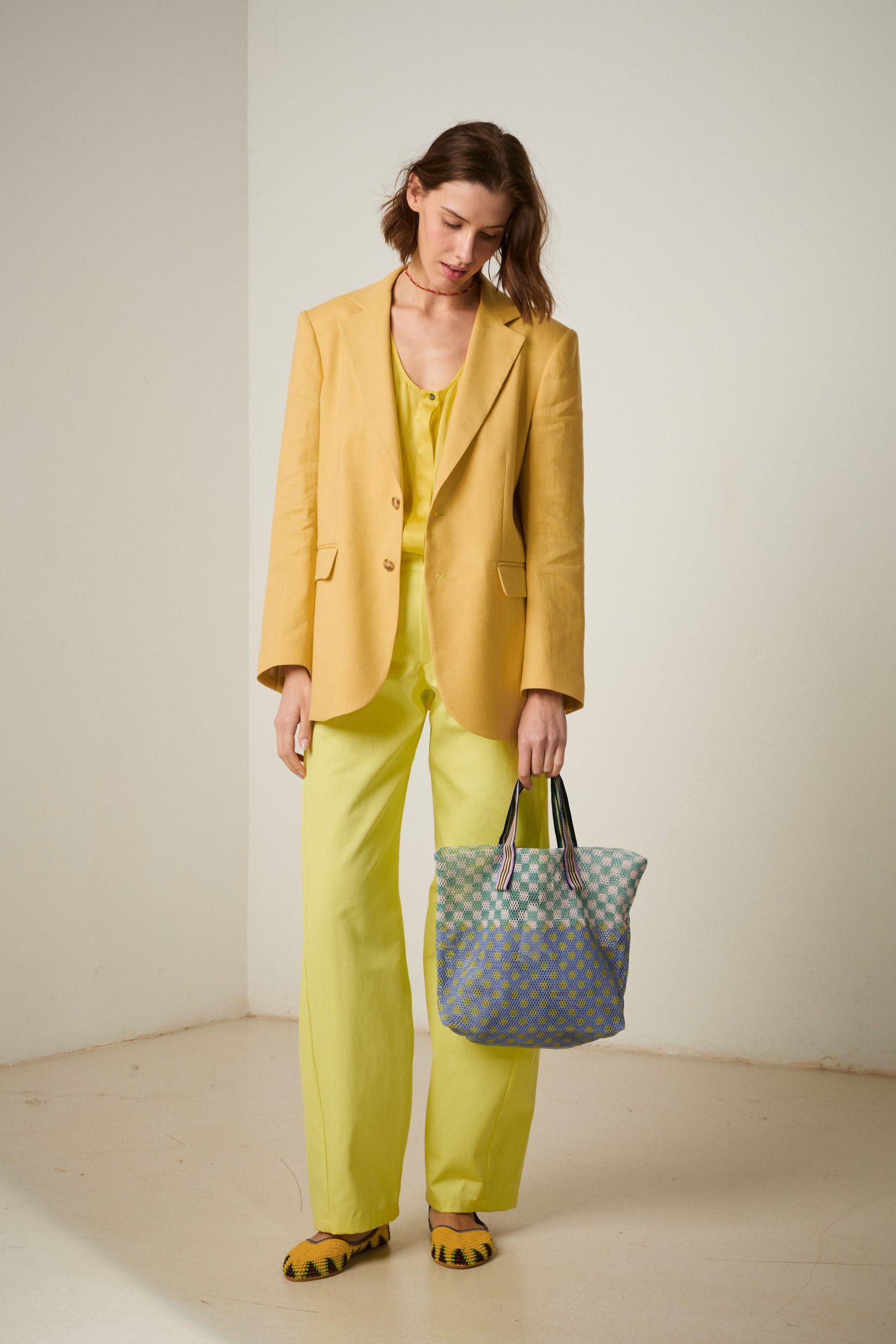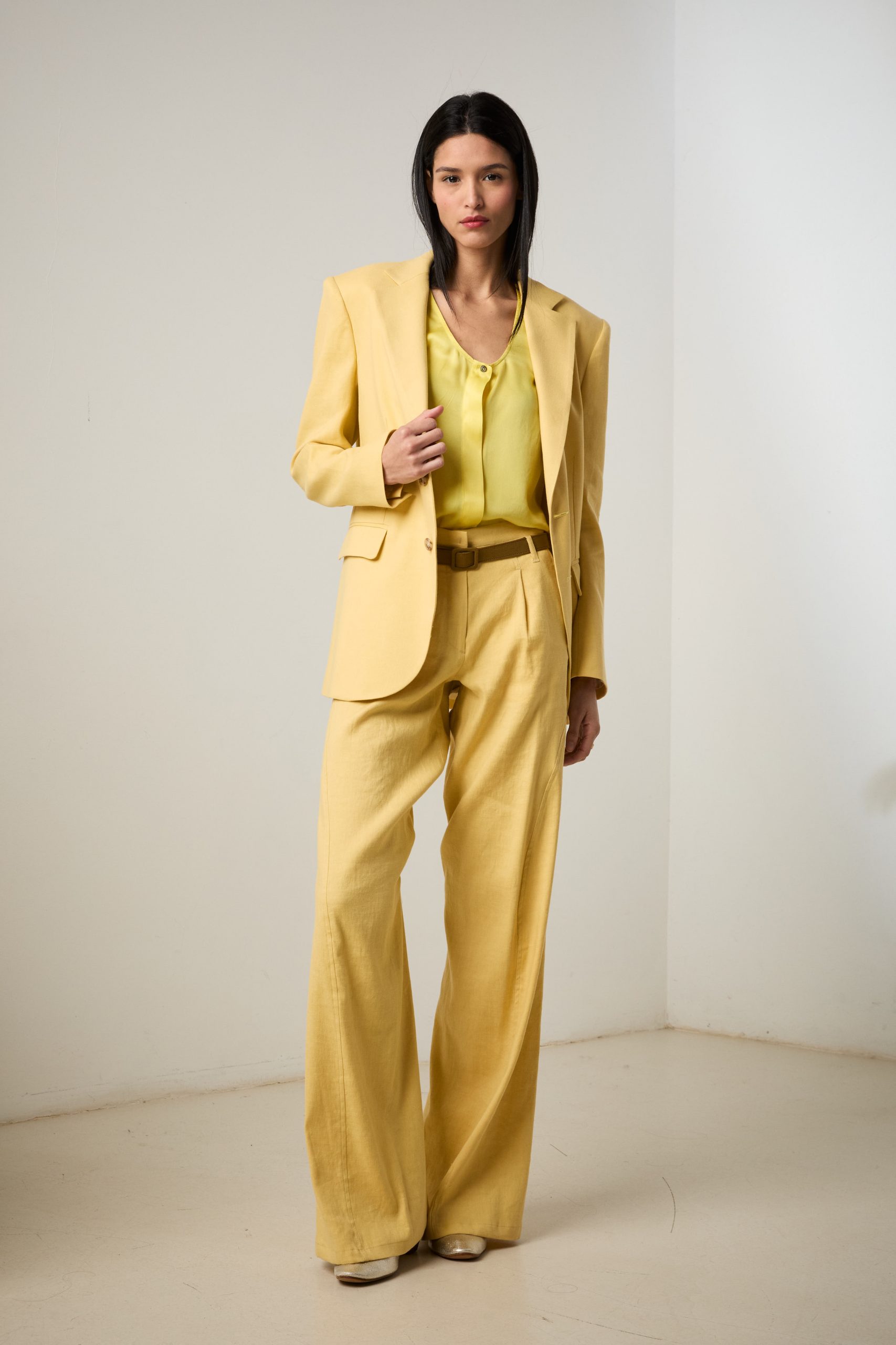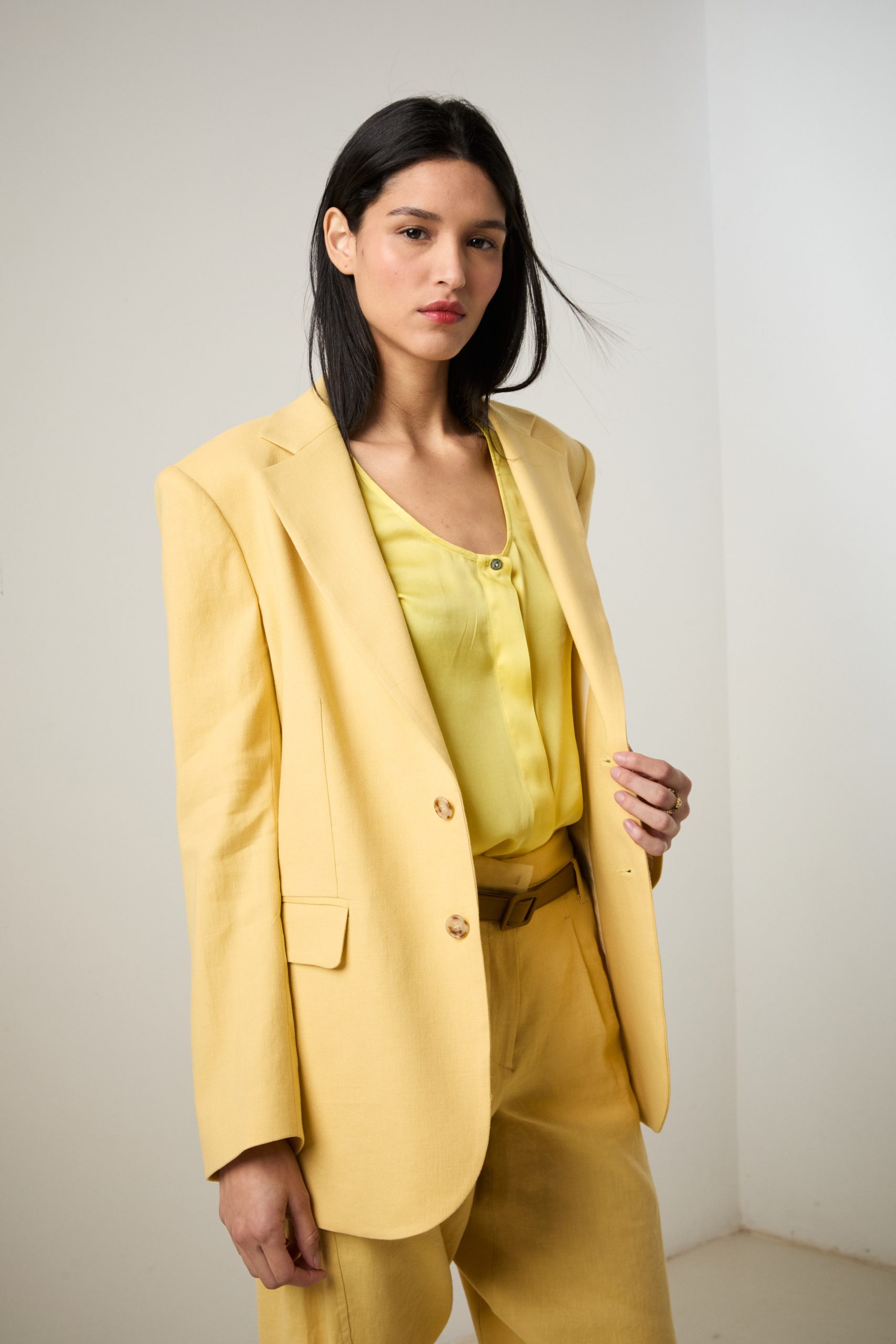 Blazer Pier di Carla Saibene, giacca monopetto a due bottoni dal taglio maschile in lino giallo chiaro. Con spalline, tasche a filetto e due spacchi sul retro.