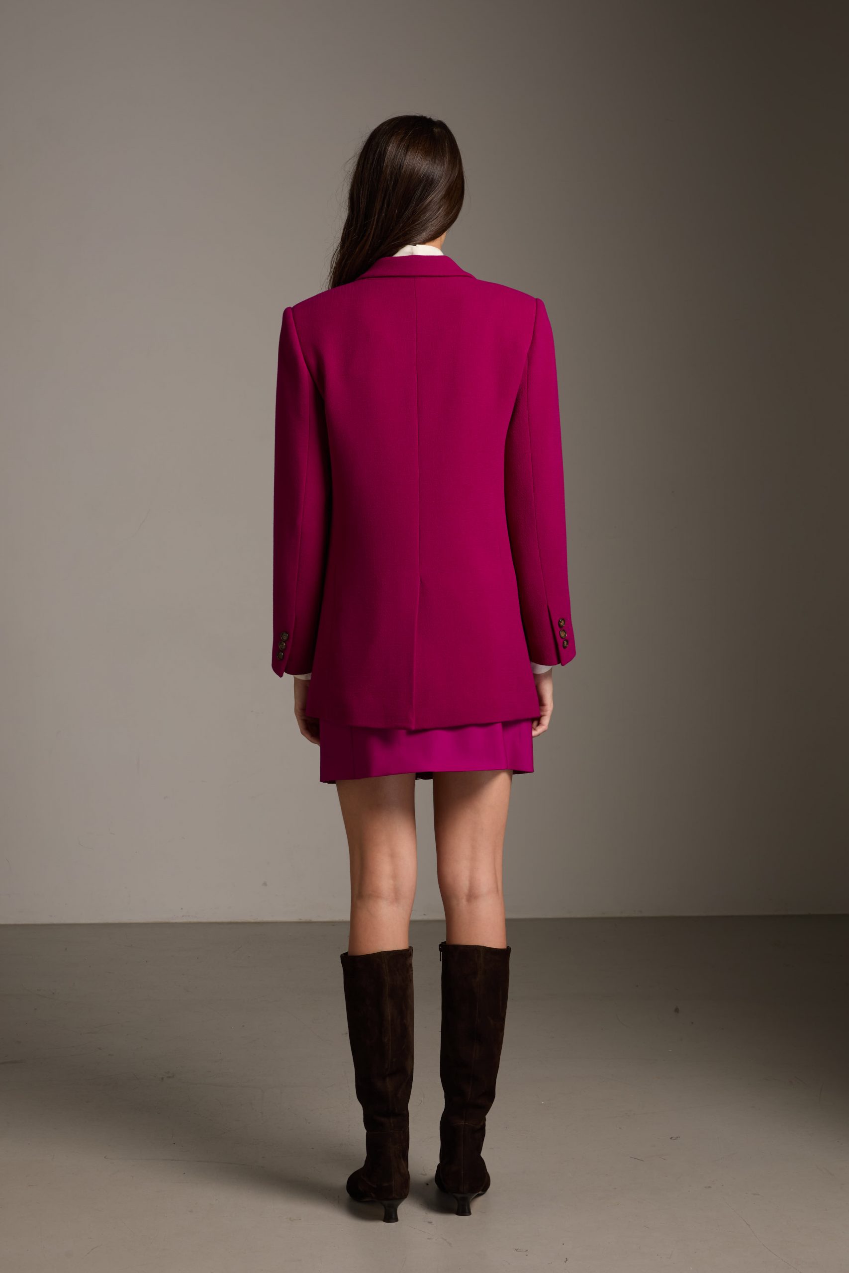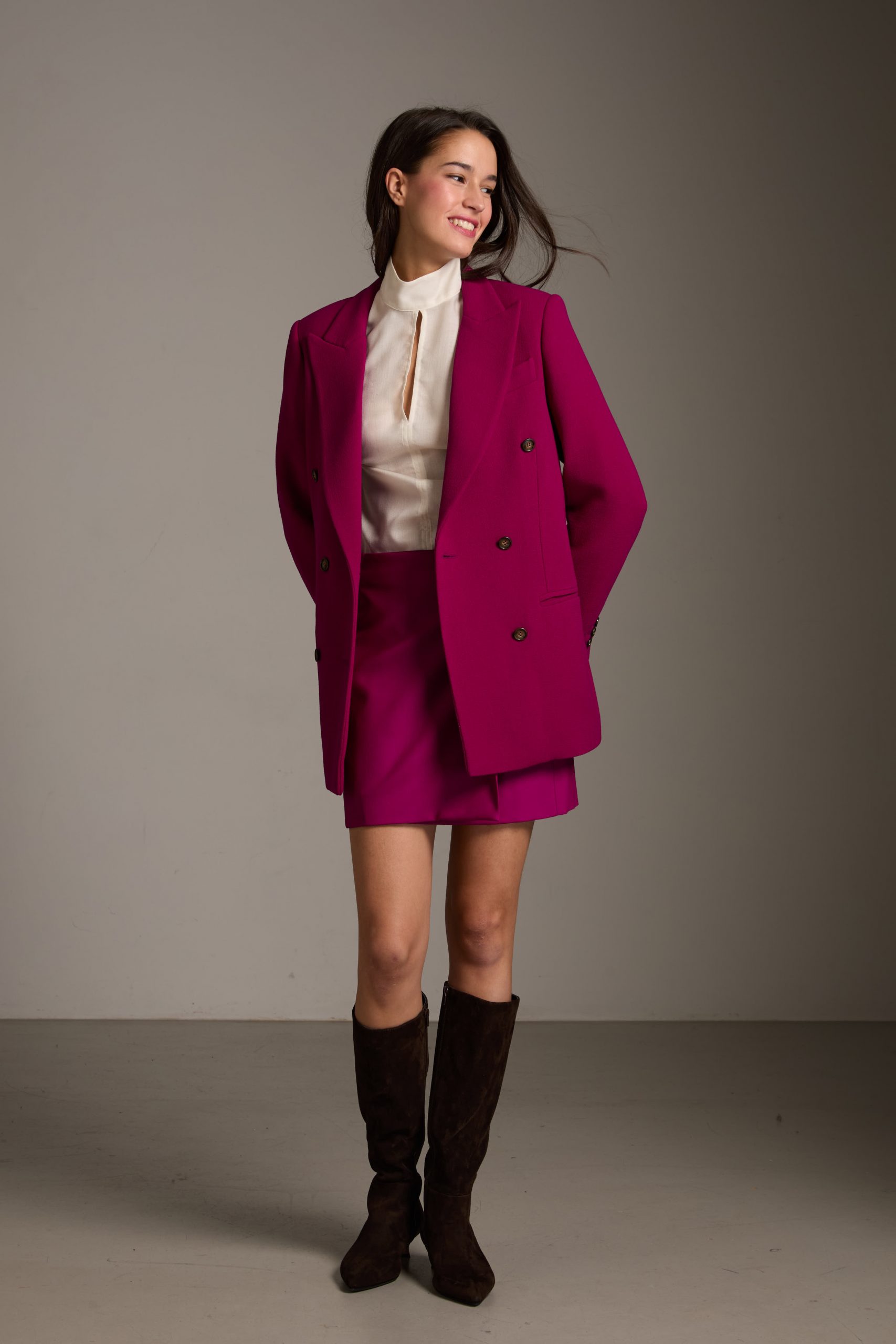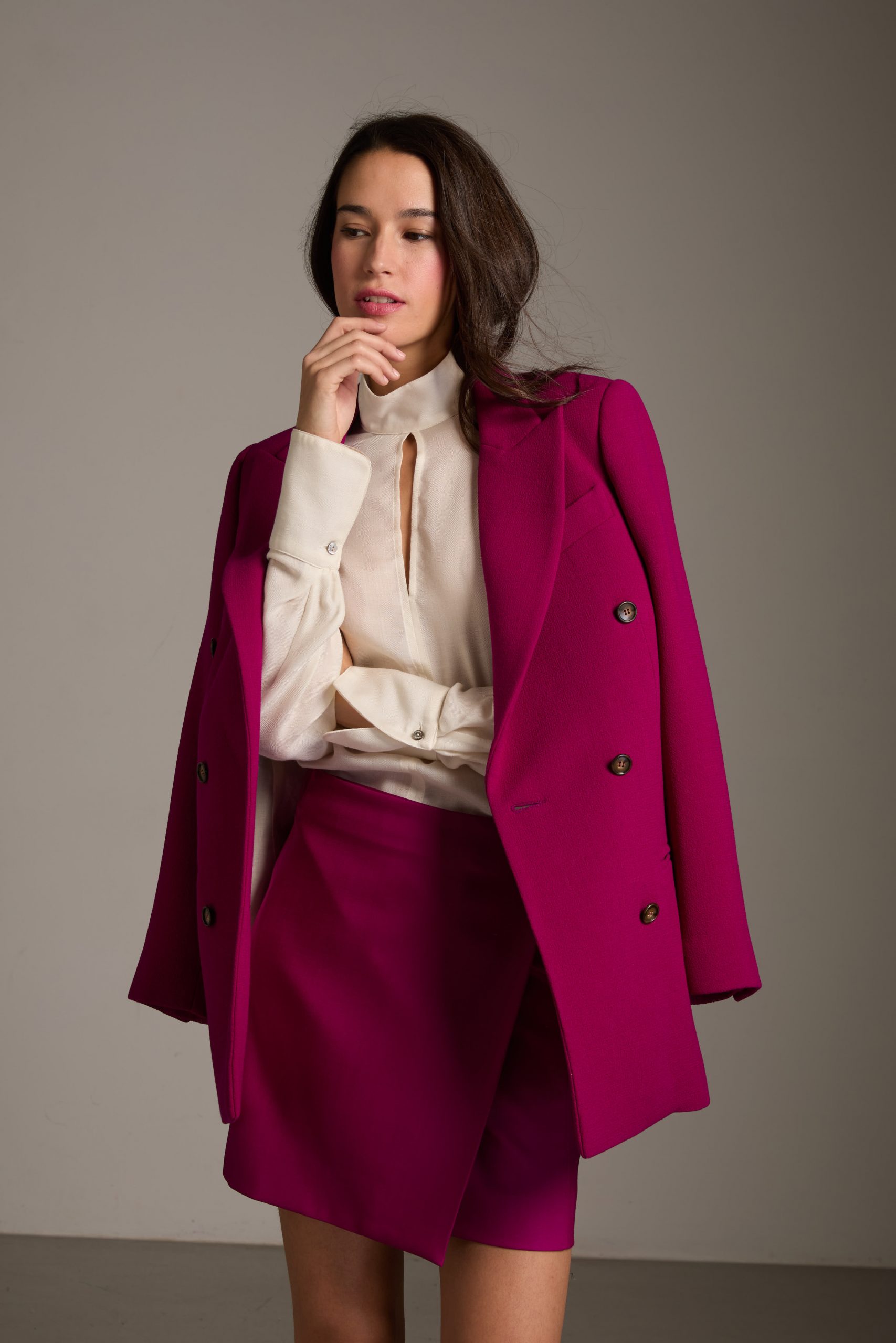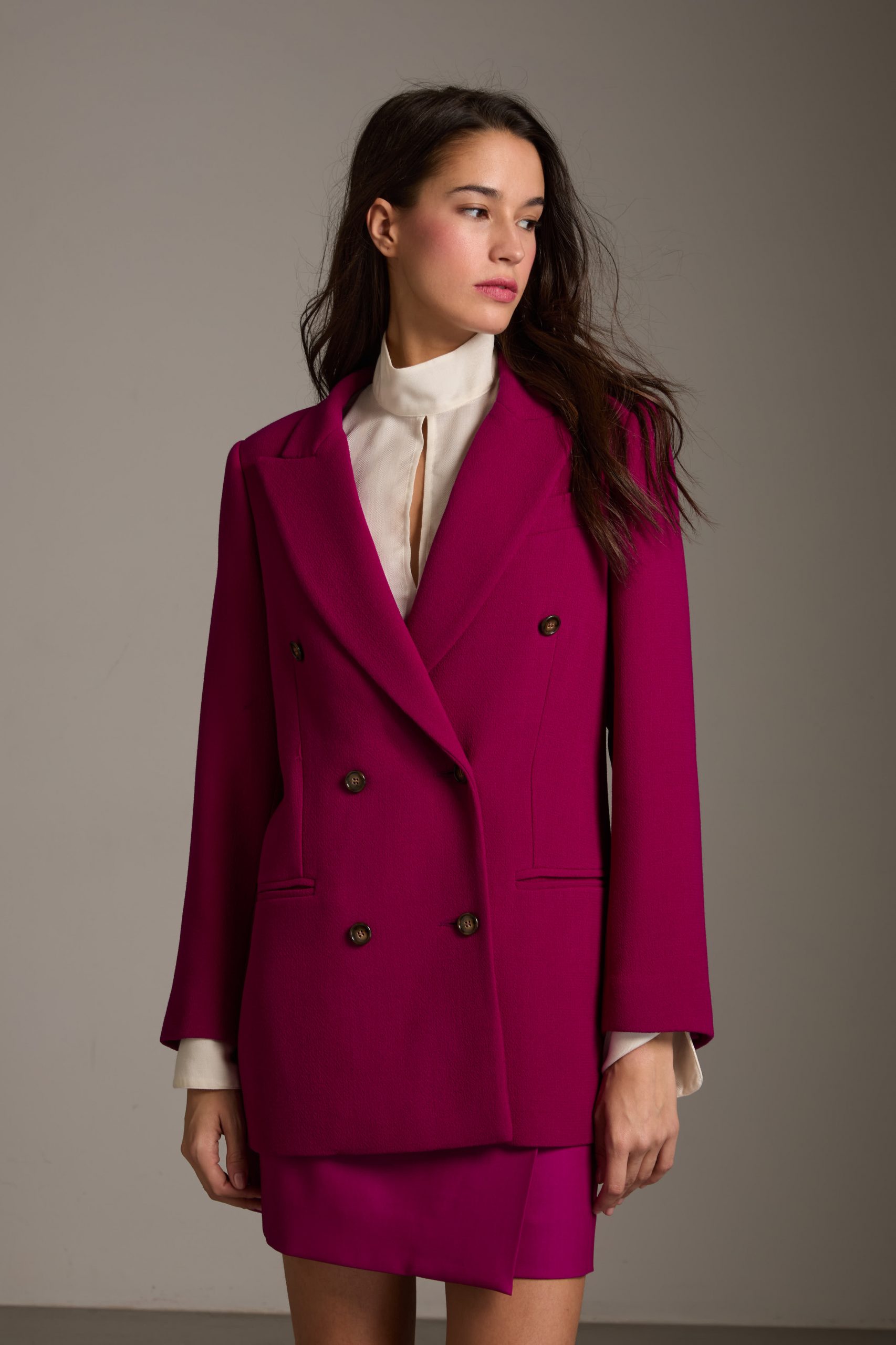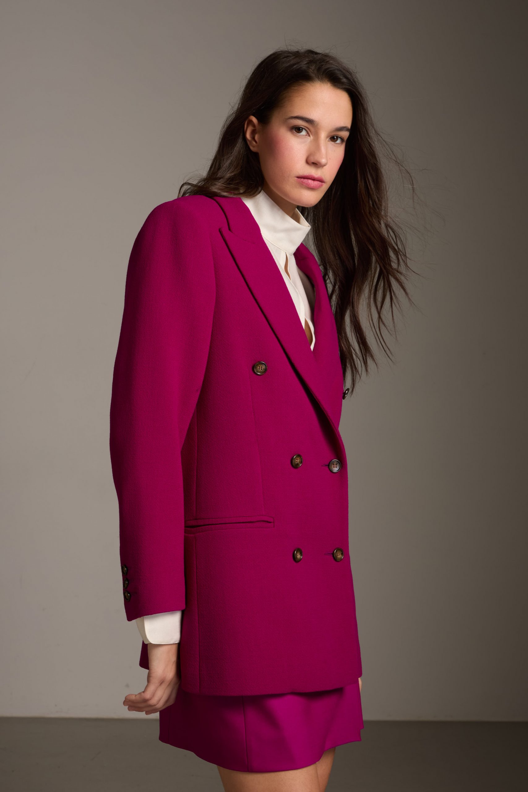 Blazer Sofia di Carla Saibene, giacca doppiopetto con taglio sartoriale, vestibilità over, in crepe di lana ciclamino