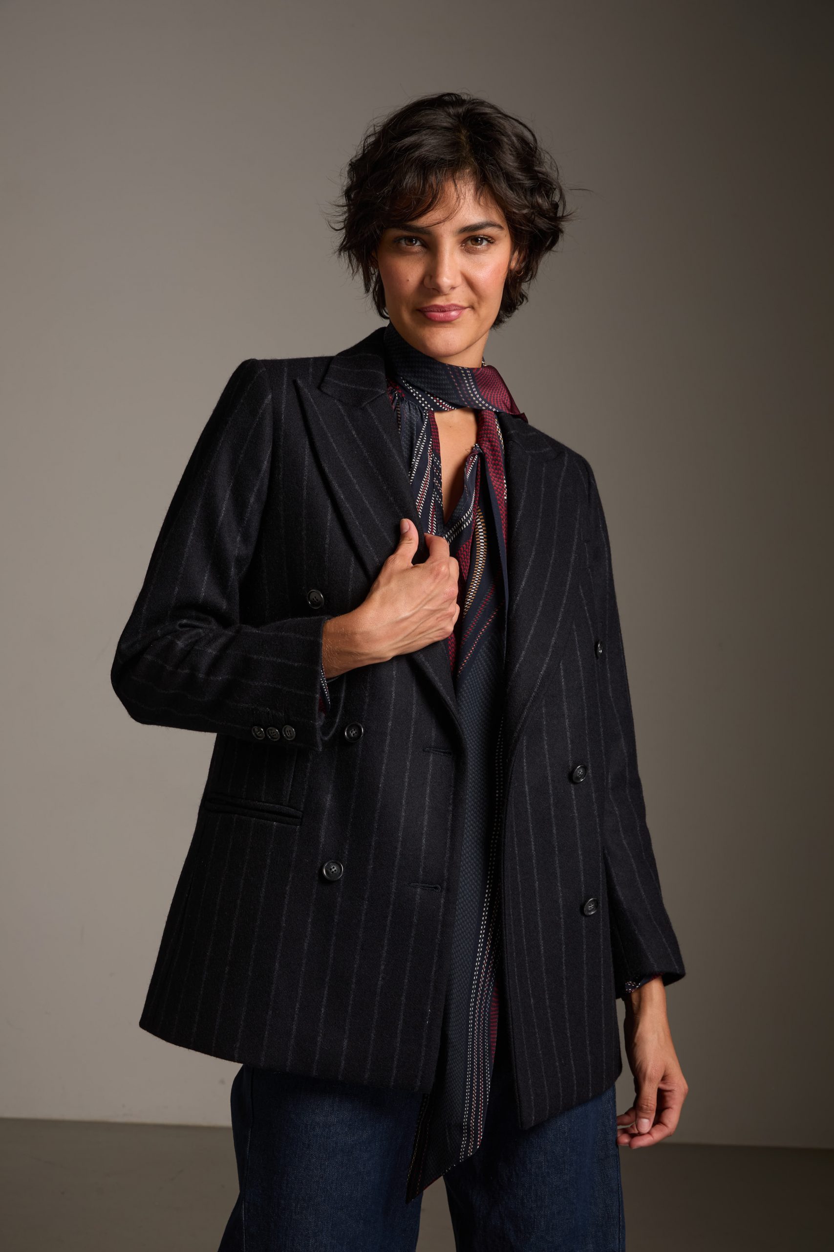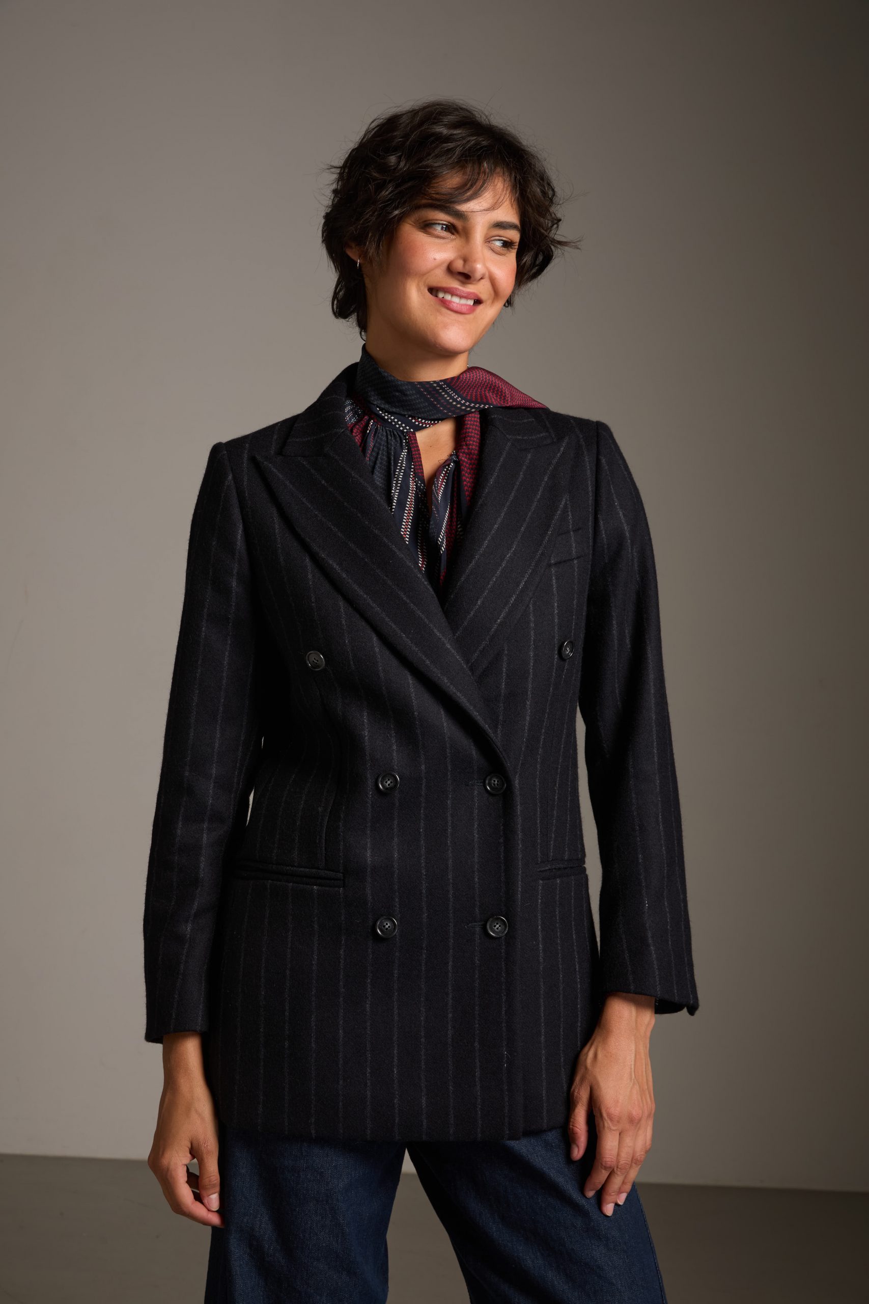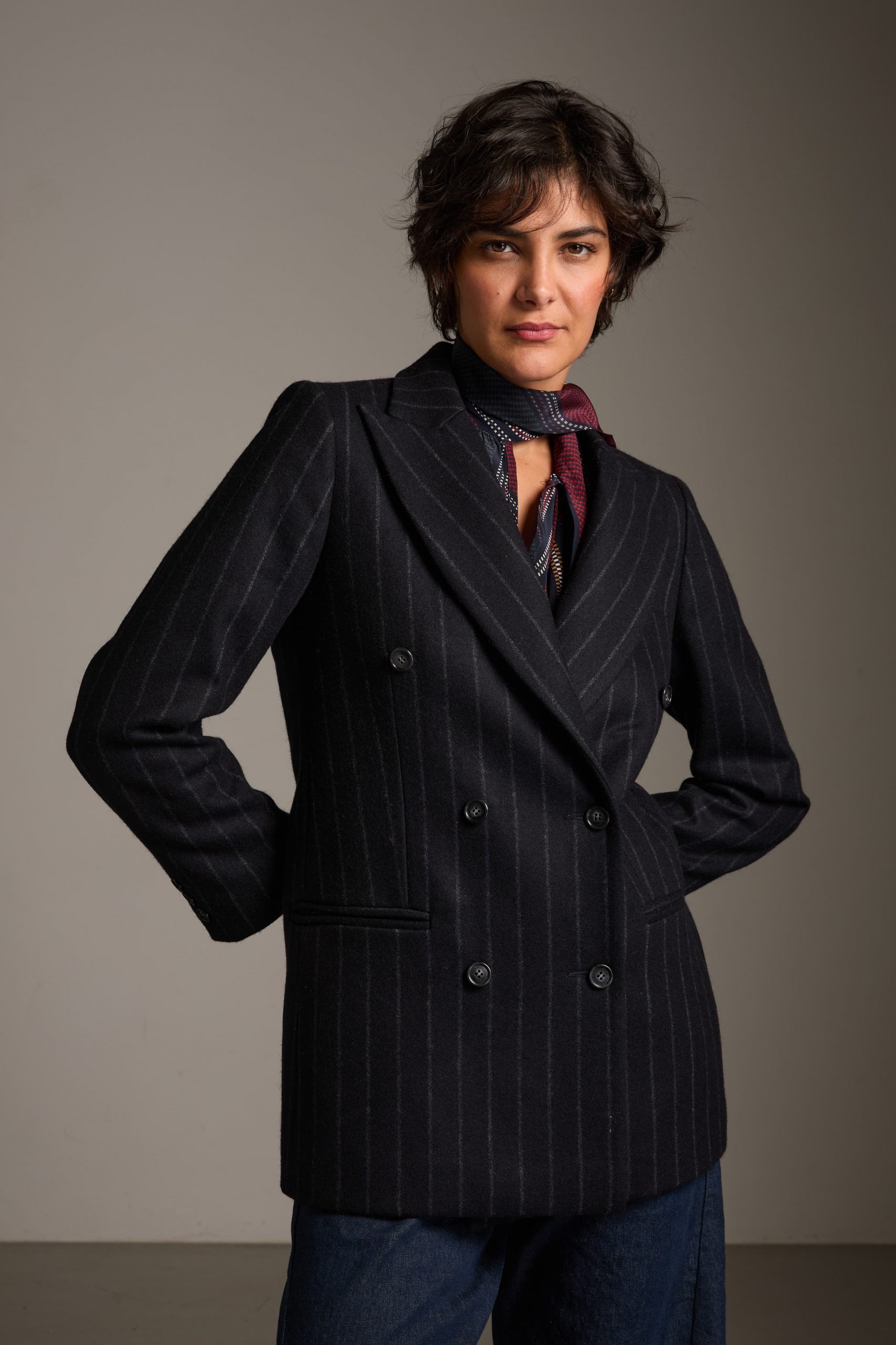 Blazer Sofia di Carla Saibene, giacca doppiopetto con taglio sartoriale, vestibiltà over, in panno di lana double blu navy gessato