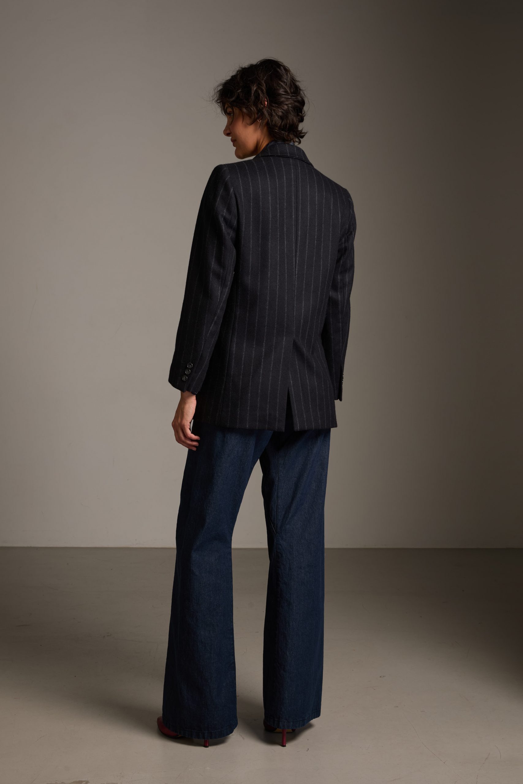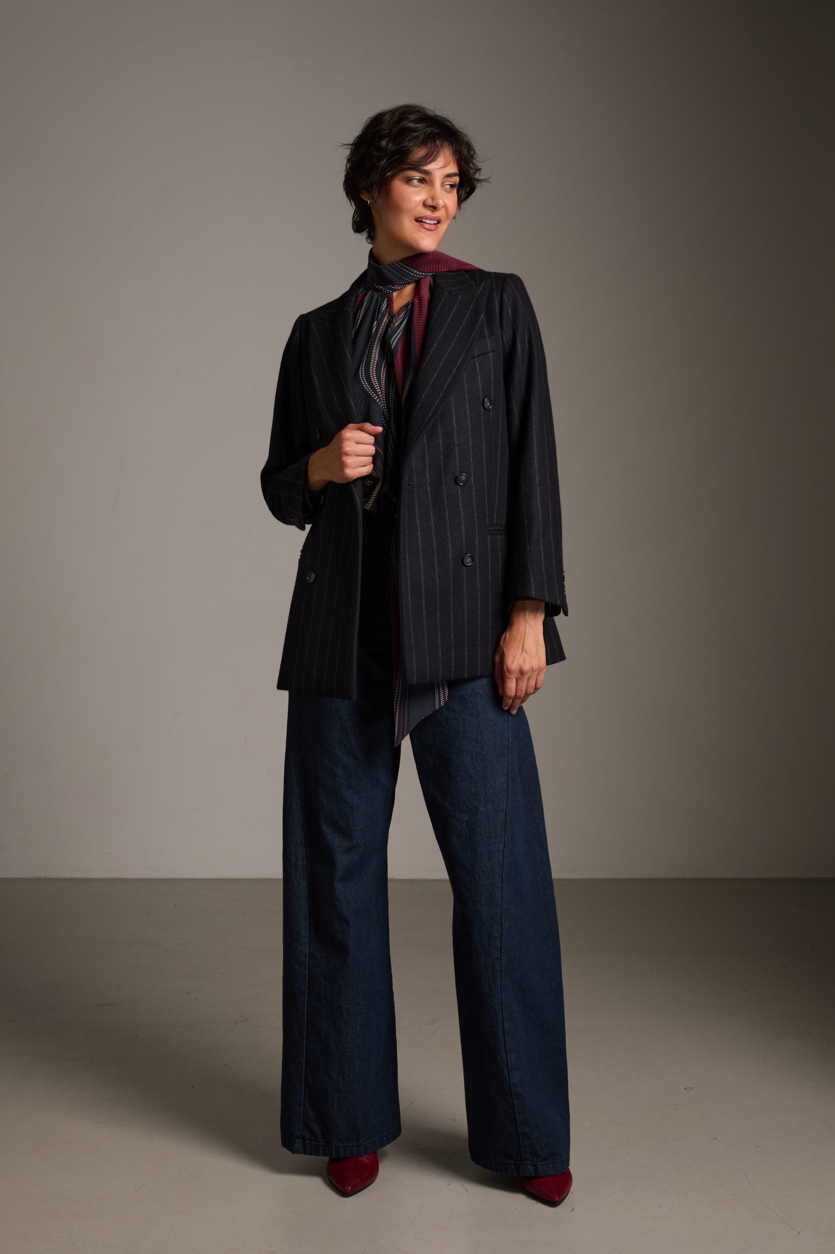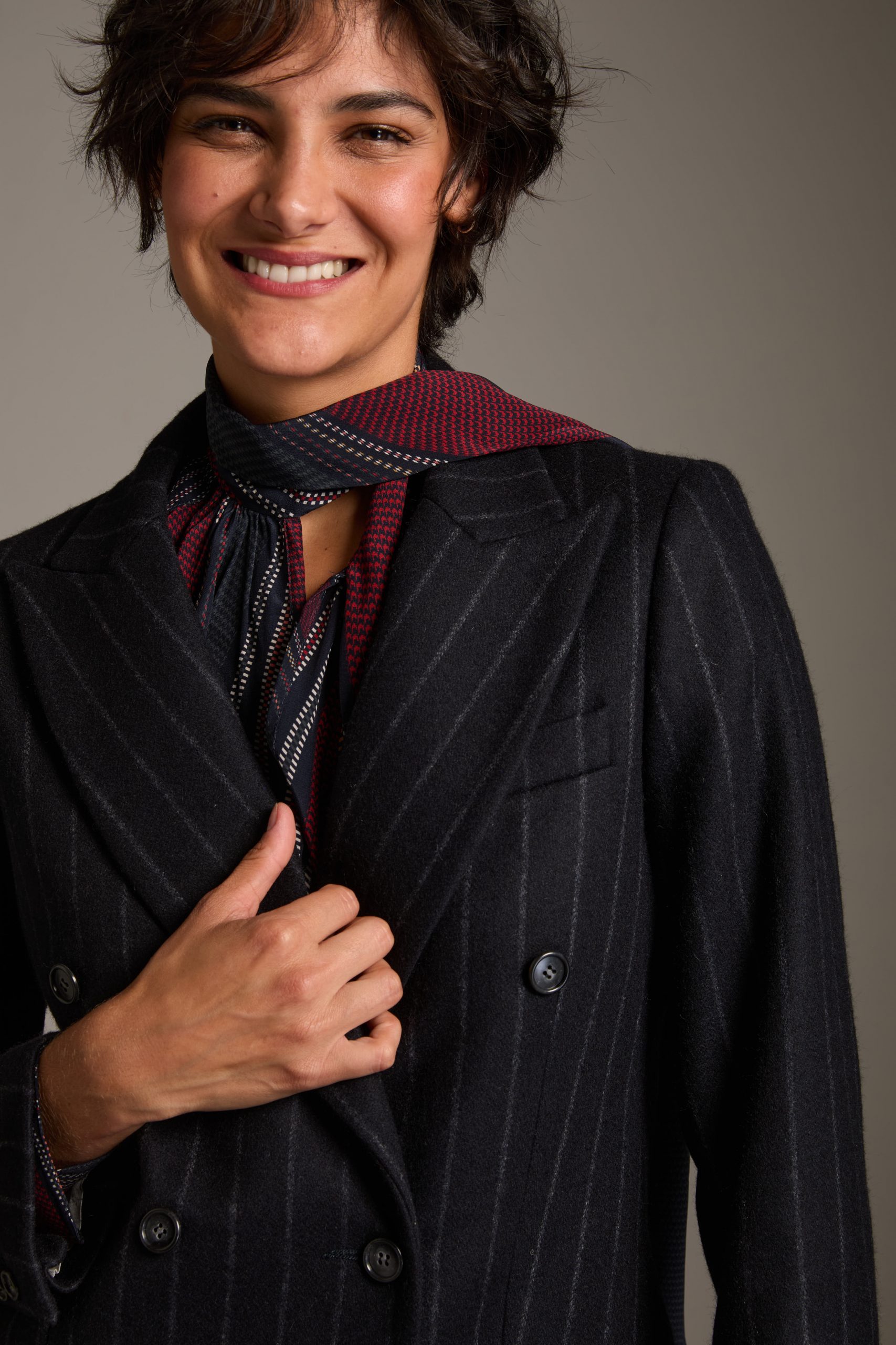 Blazer Sofia di Carla Saibene, giacca doppiopetto con taglio sartoriale, vestibiltà over, in panno di lana double blu navy gessato