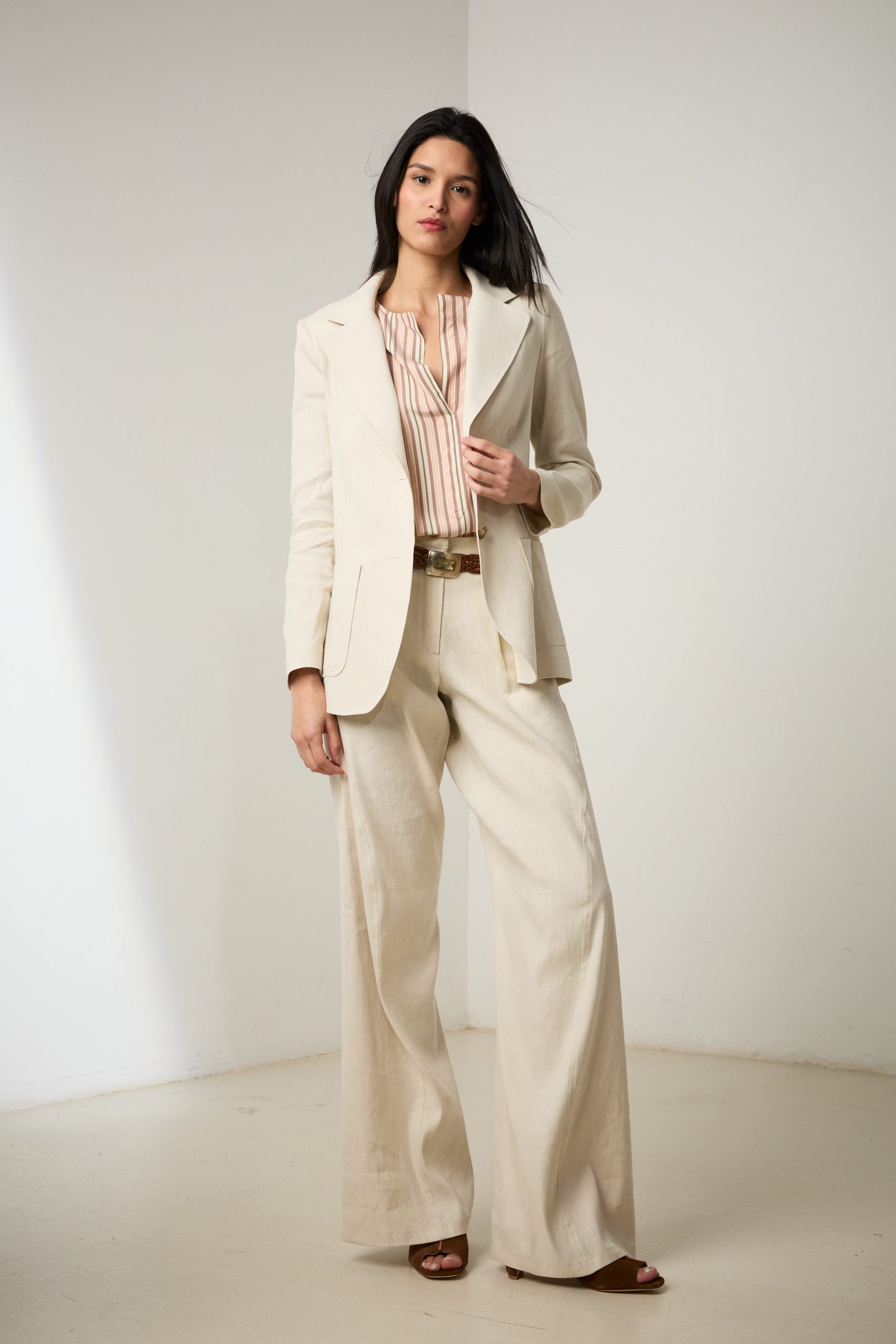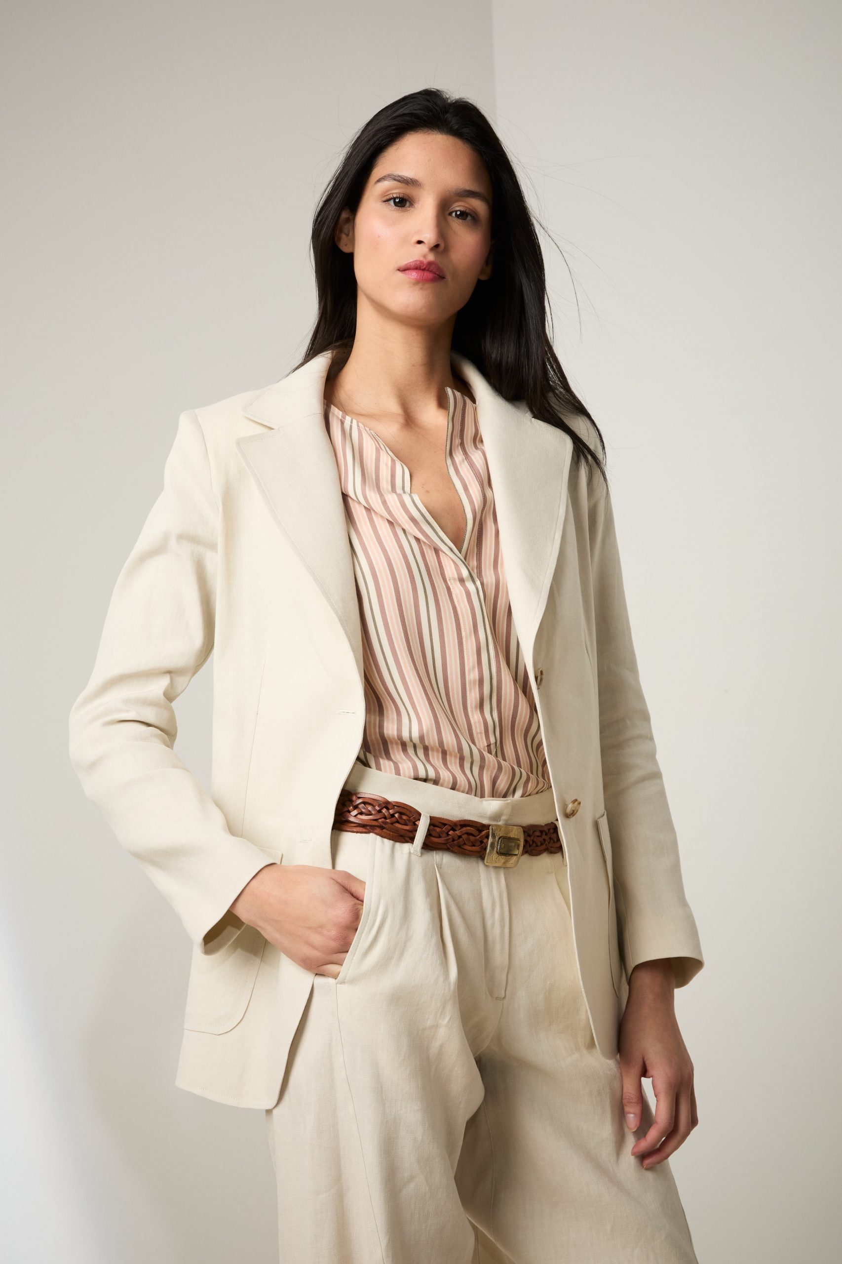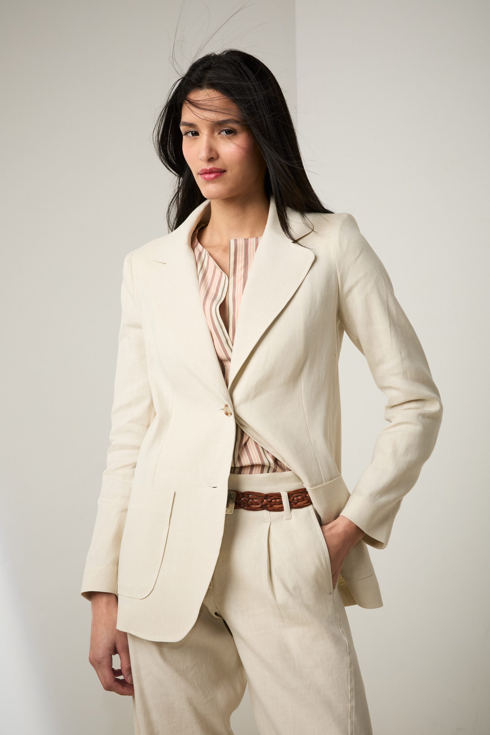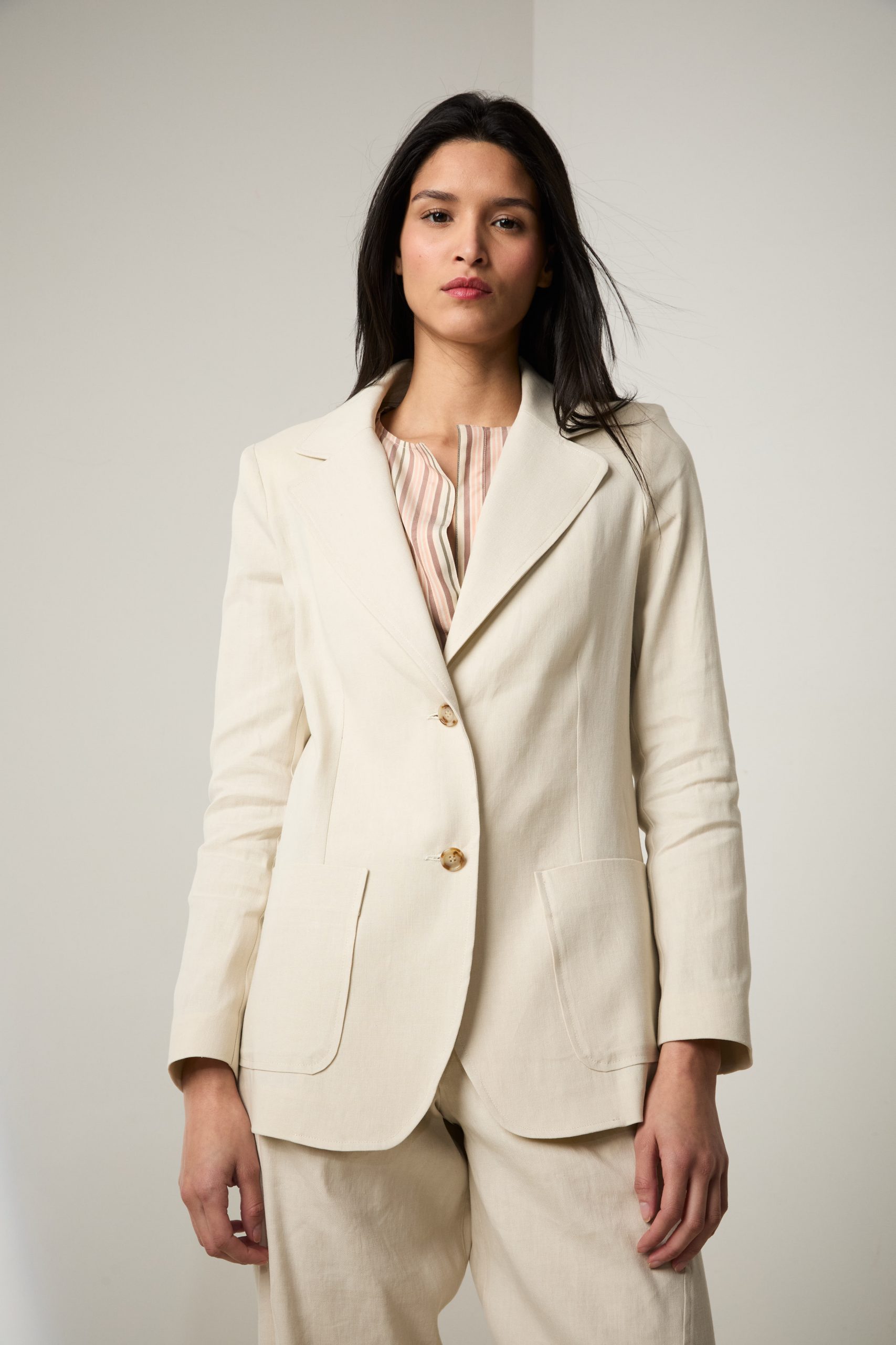 Blazer Tara di Carla Saibene, giacca monopetto in cotone e lino bianco gesso, a due bottoni dal taglio sartoriale , con tasche applicate.