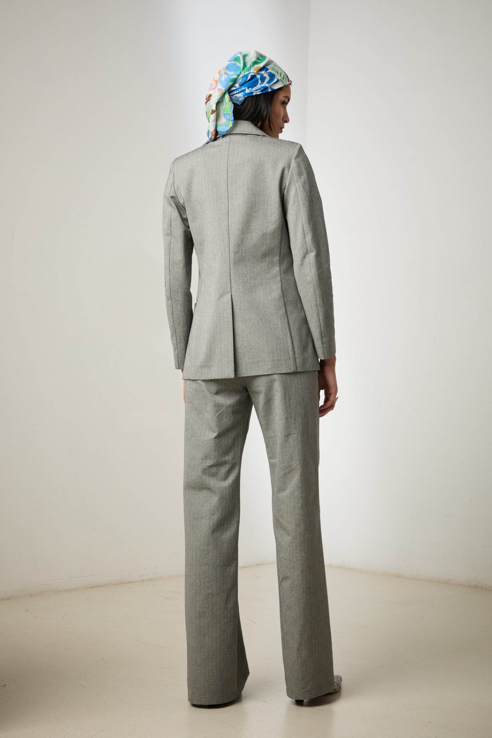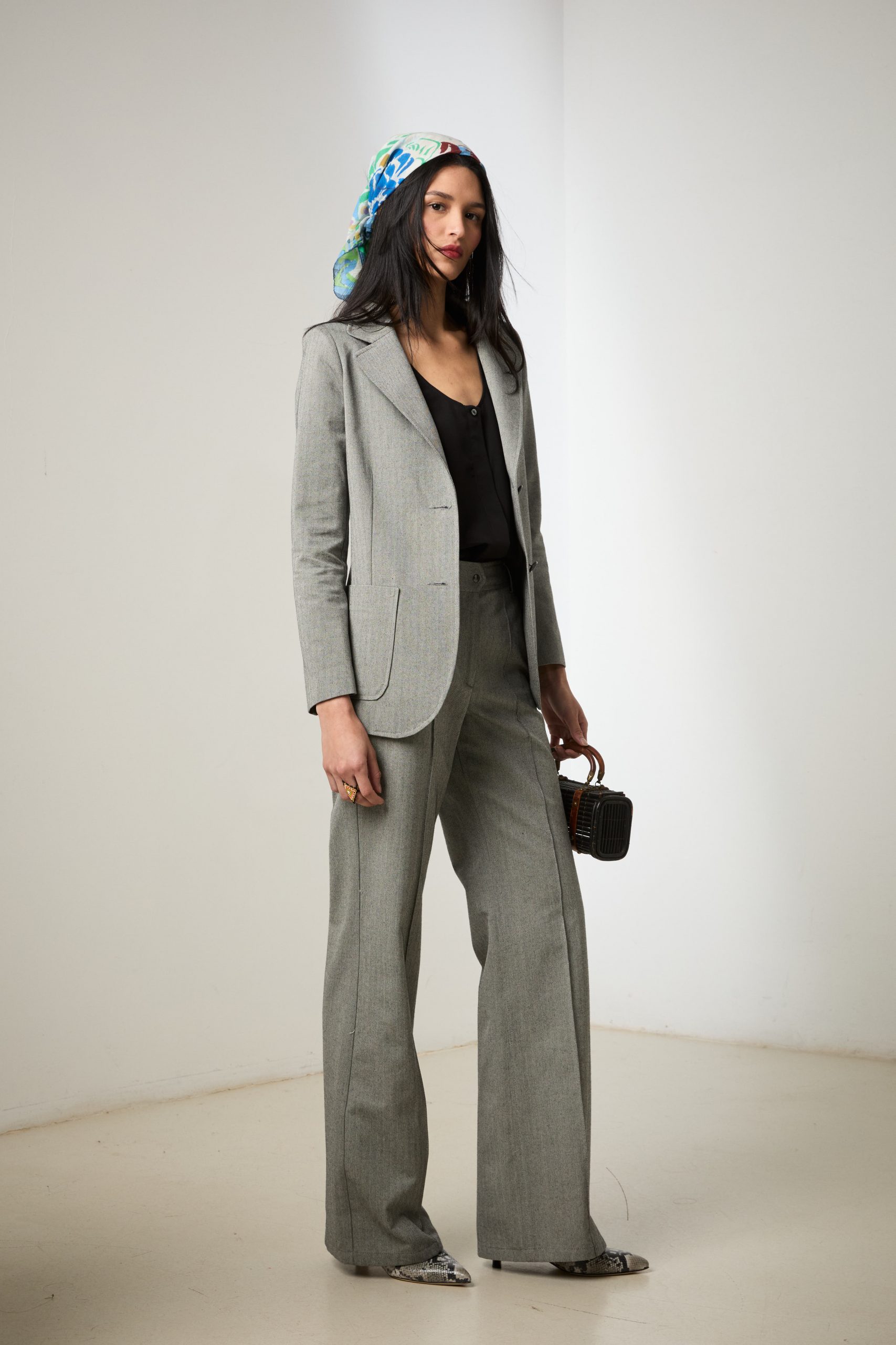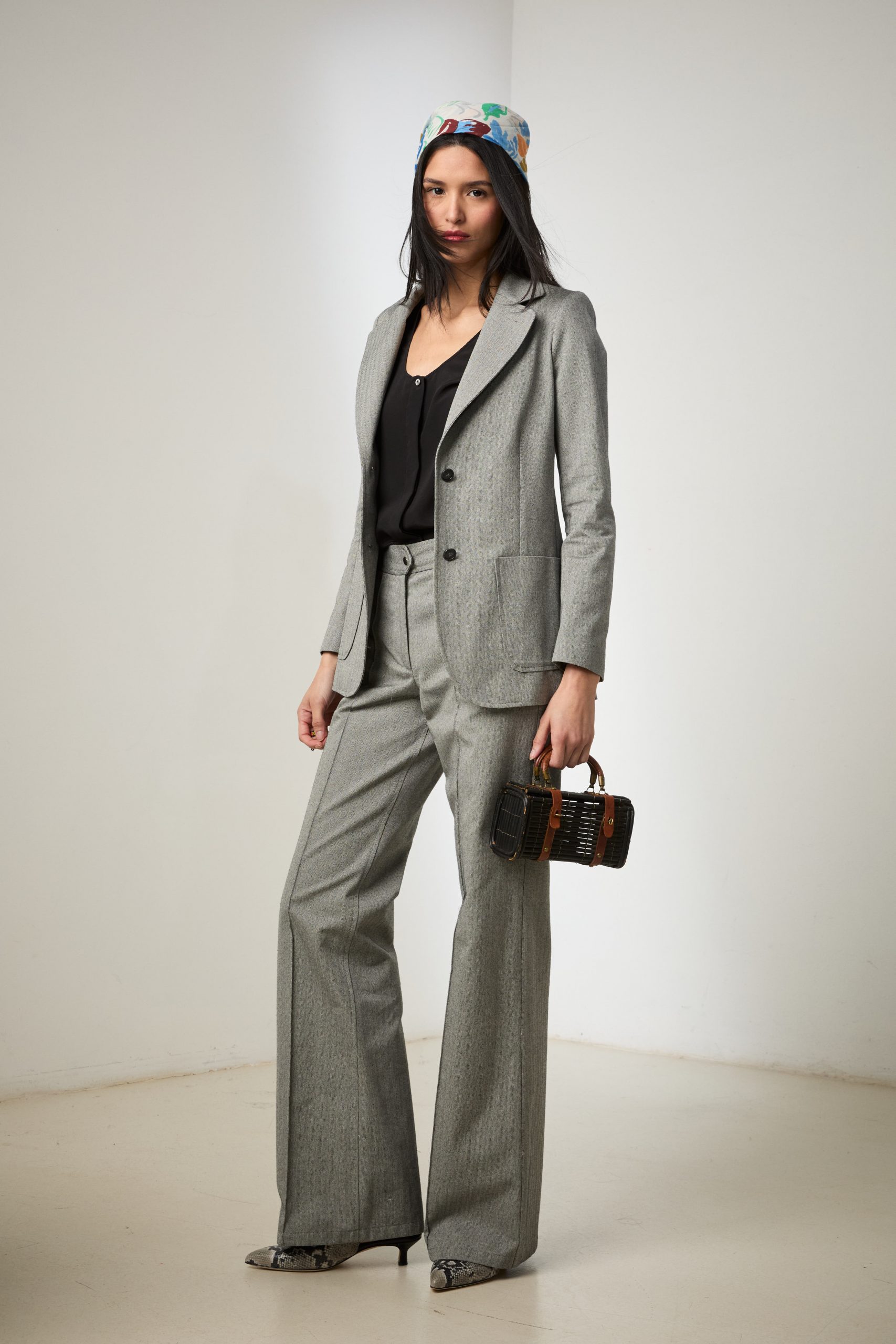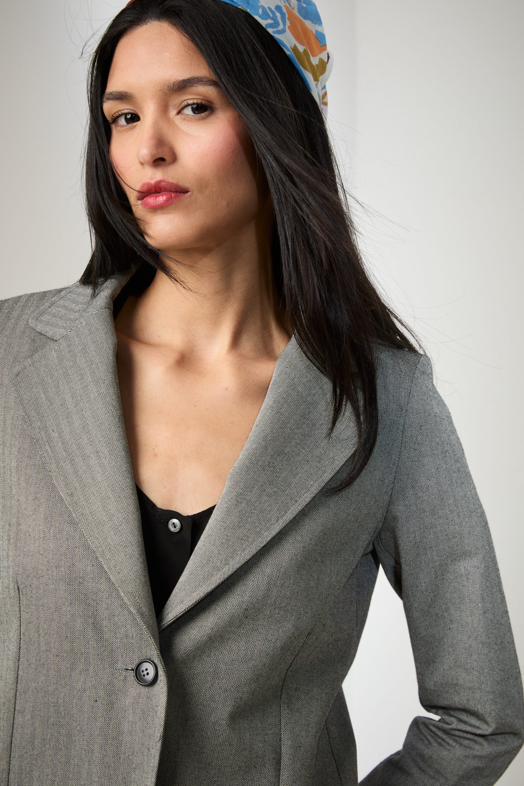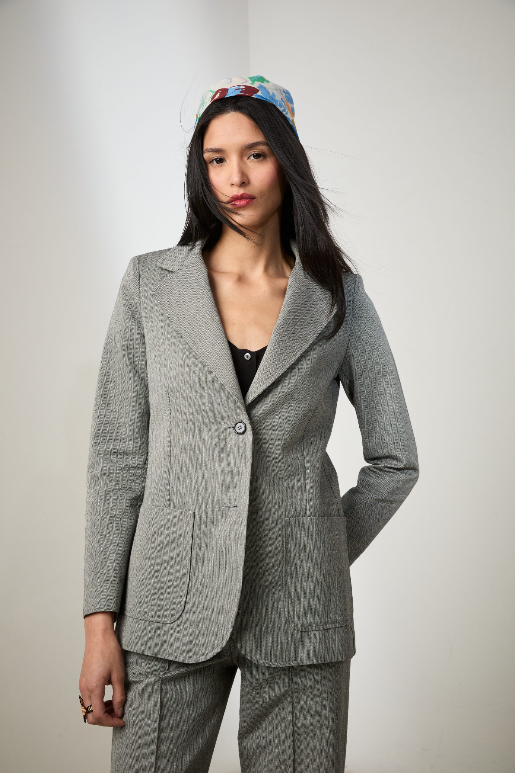 Blazer Tara di Carla Saibene, giacca monopetto in cotone spigato grigio, a due bottoni dal taglio sartoriale , con tasche applicate.