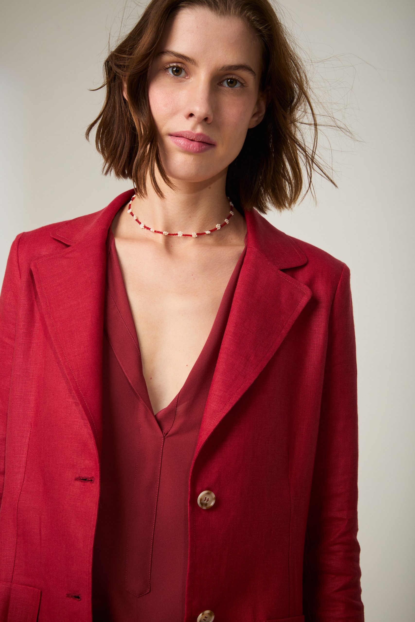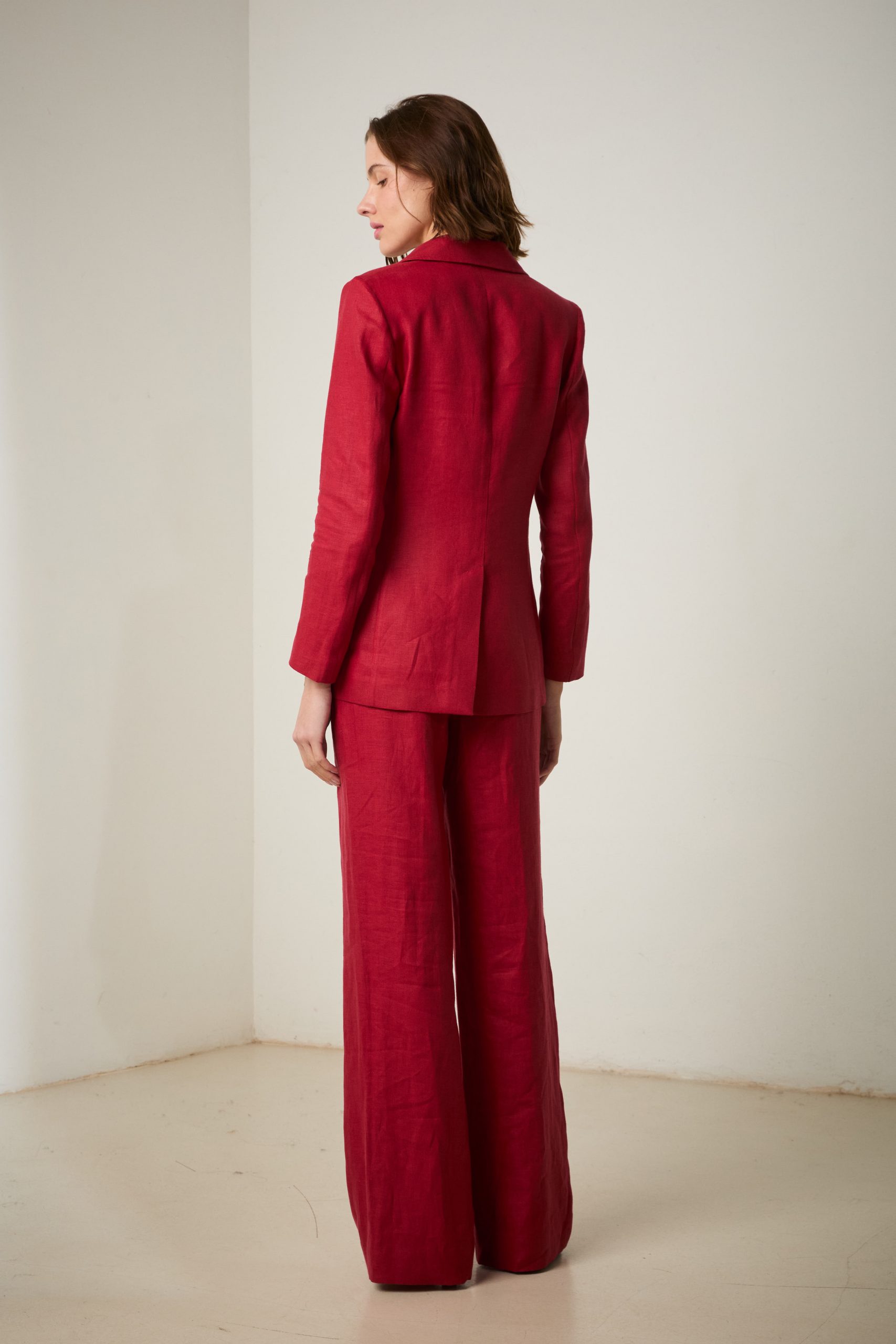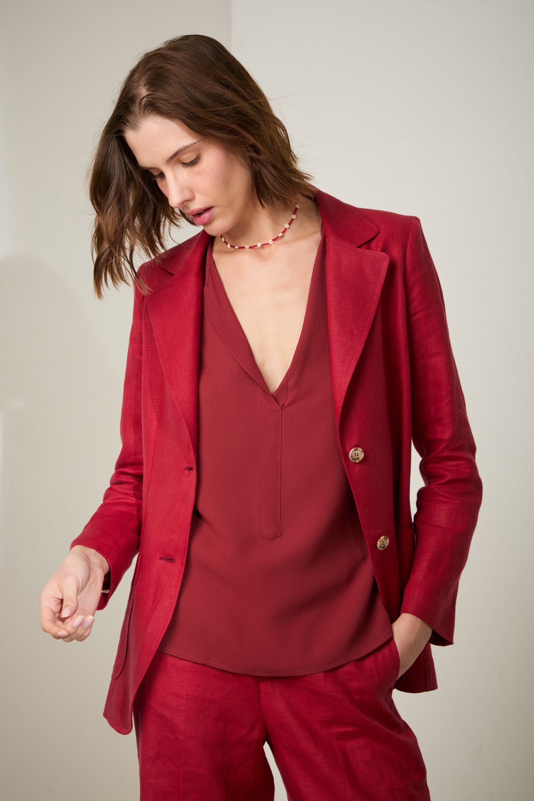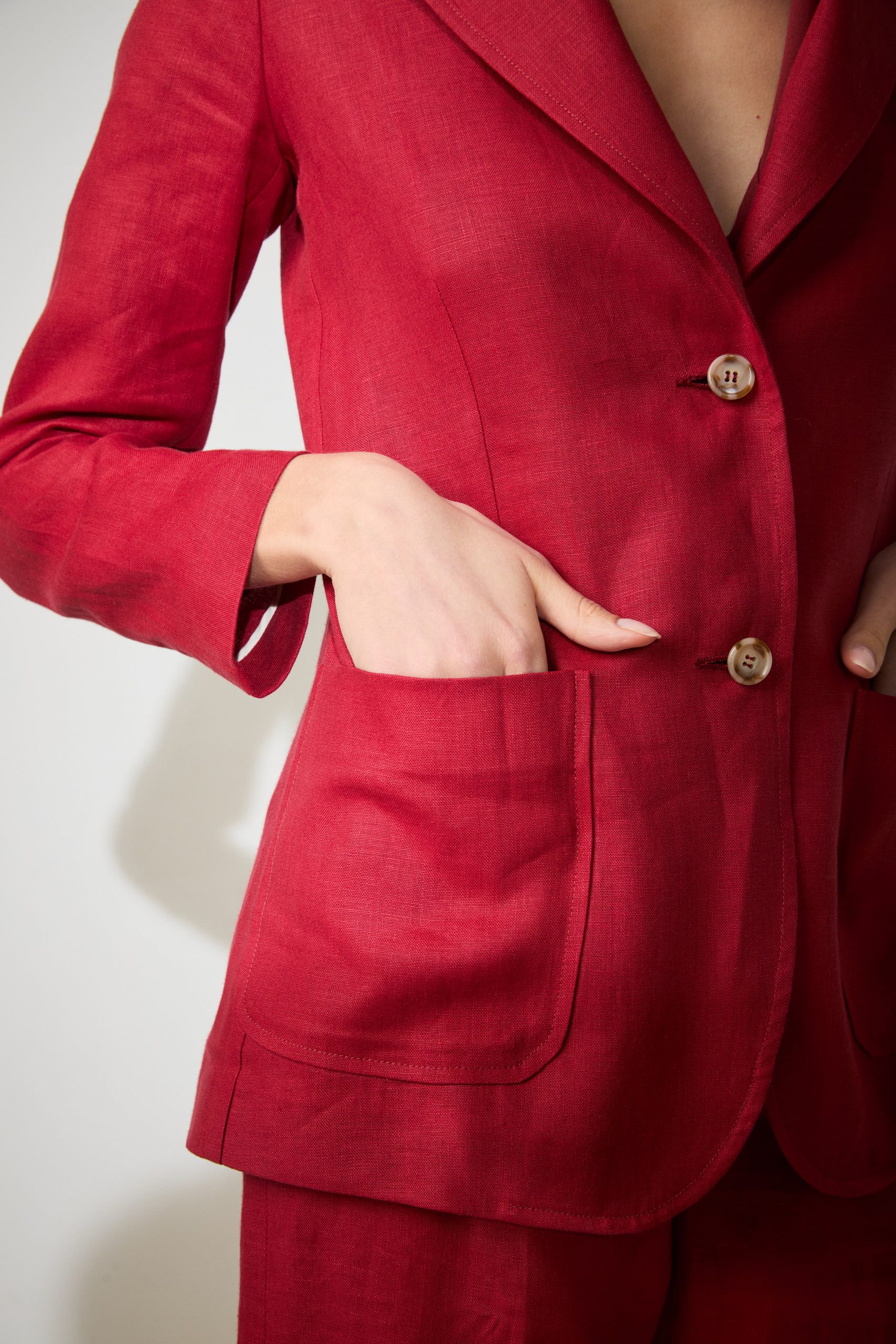 Blazer Tara di Carla Saibene, giacca monopetto in lino leggero rosso scuro, a due bottoni dal taglio sartoriale , con tasche applicate.