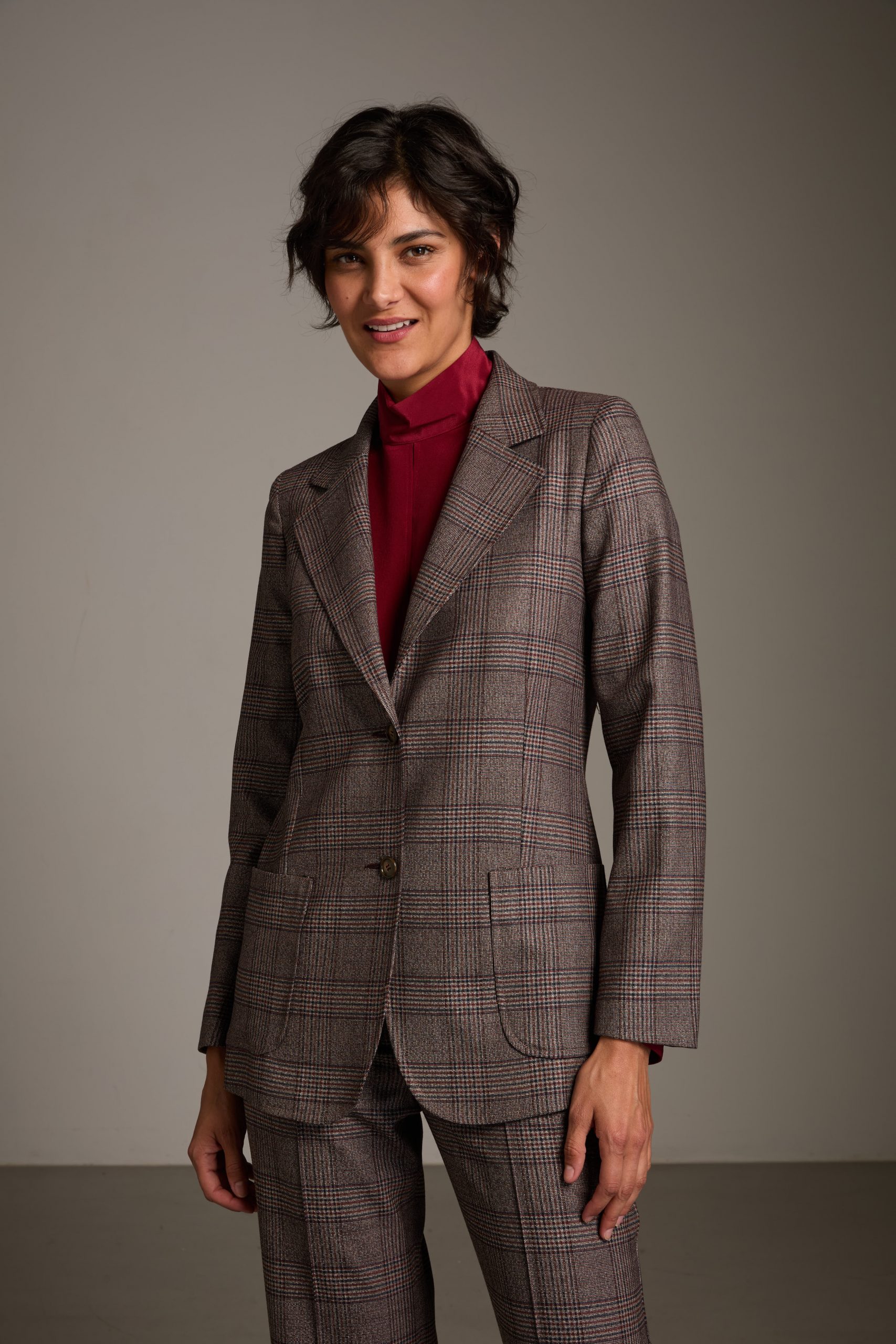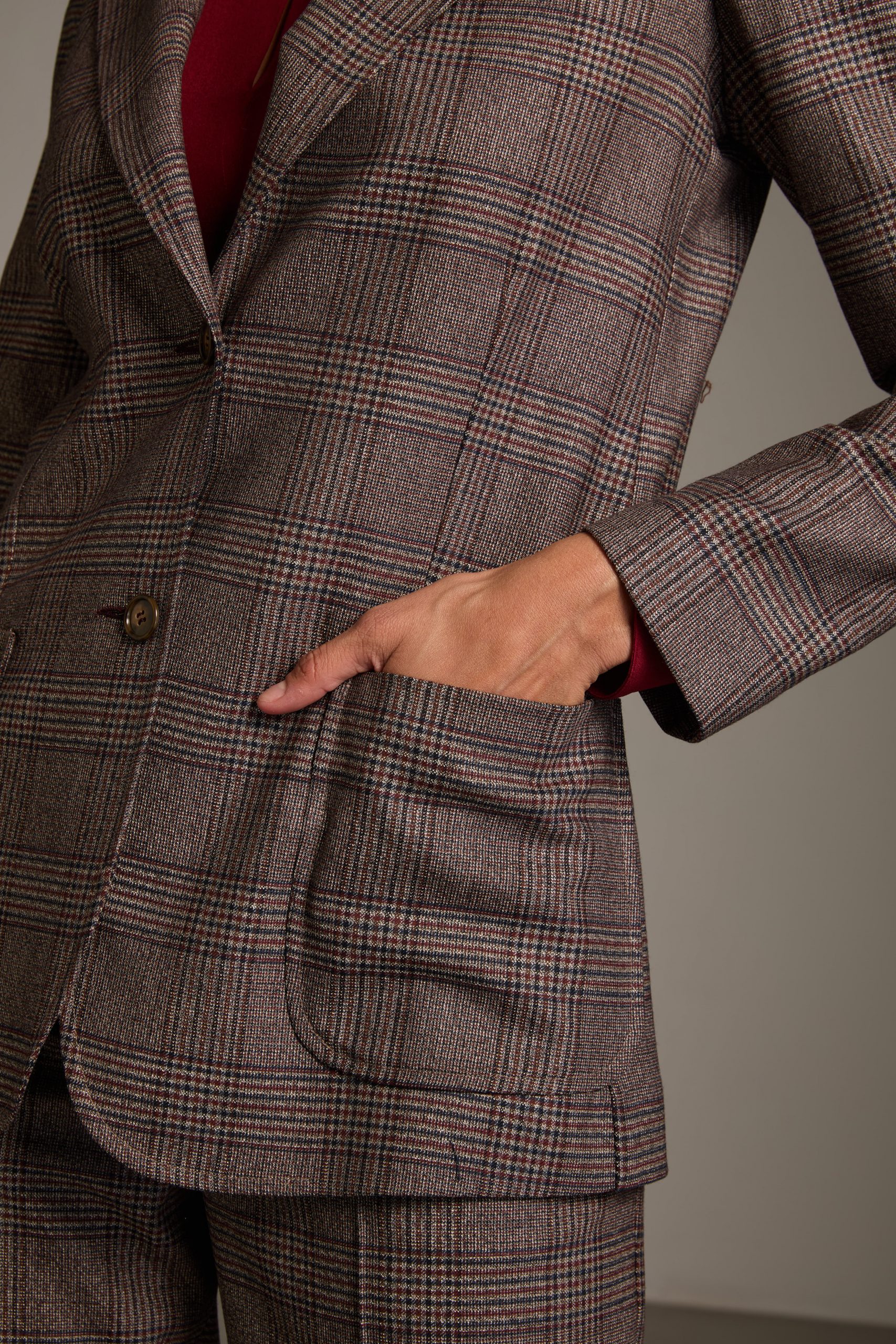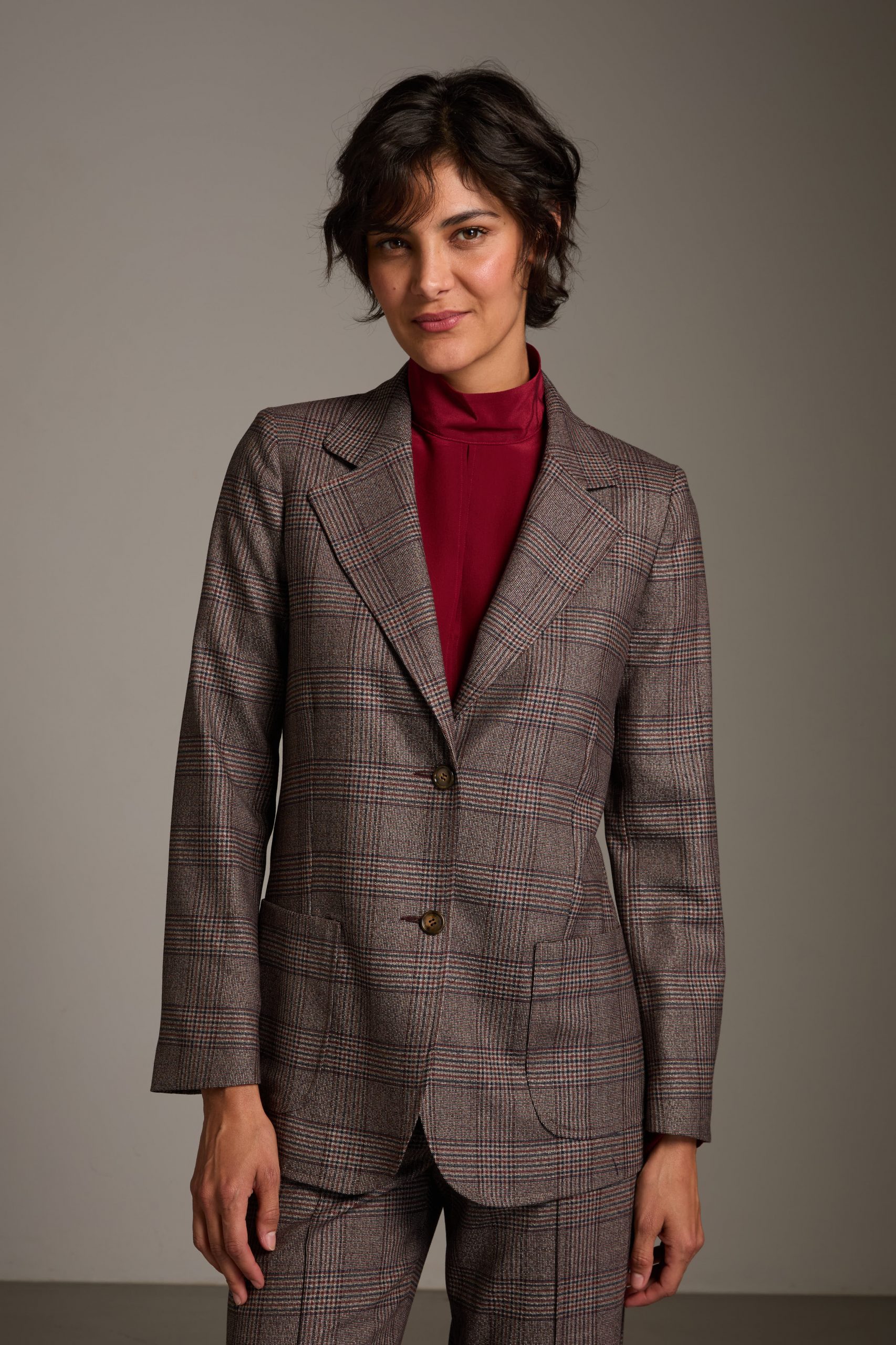 Blazer Tara di Carla Saibene, giacca monopetto in lana principe di Galles blu e bordeaux a due bottoni dal taglio sartoriale , con tasche applicate.