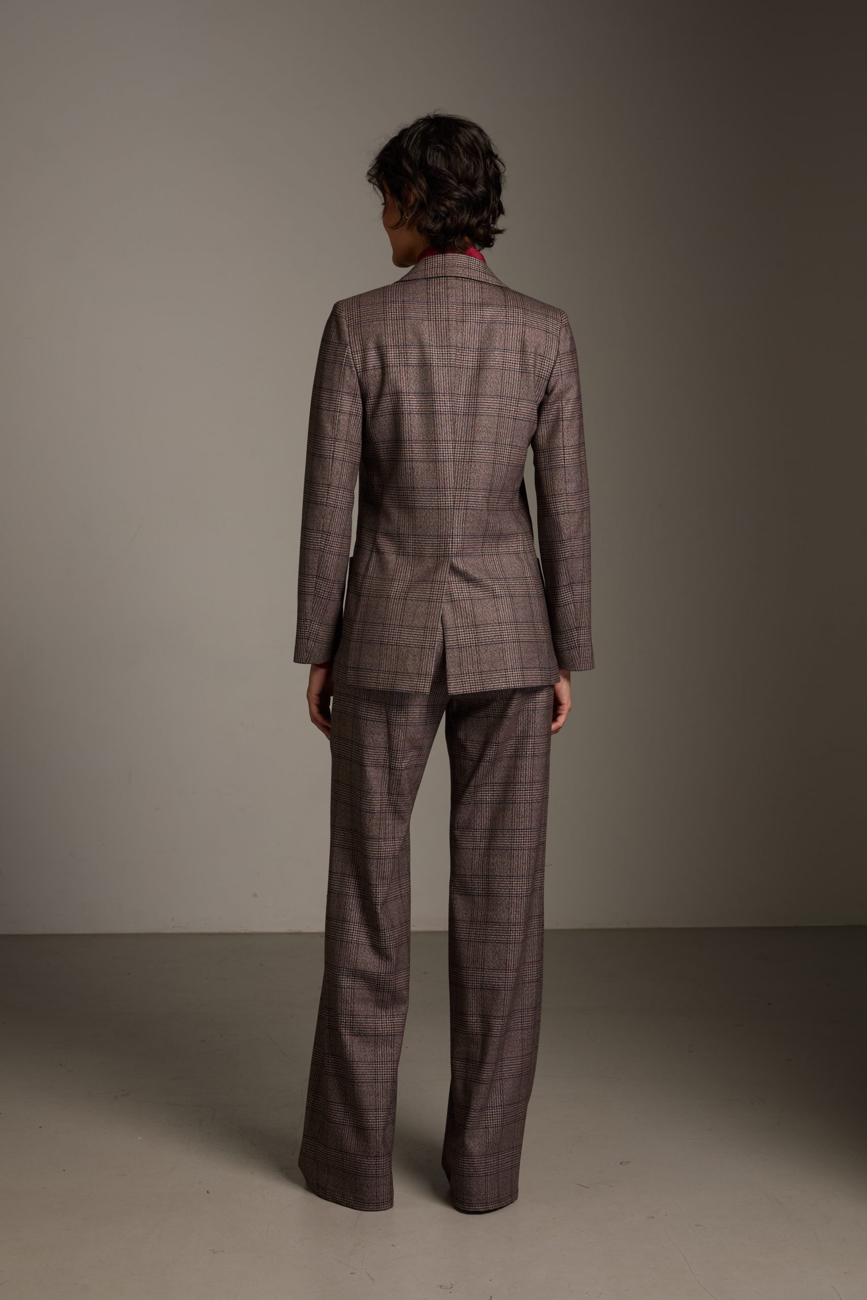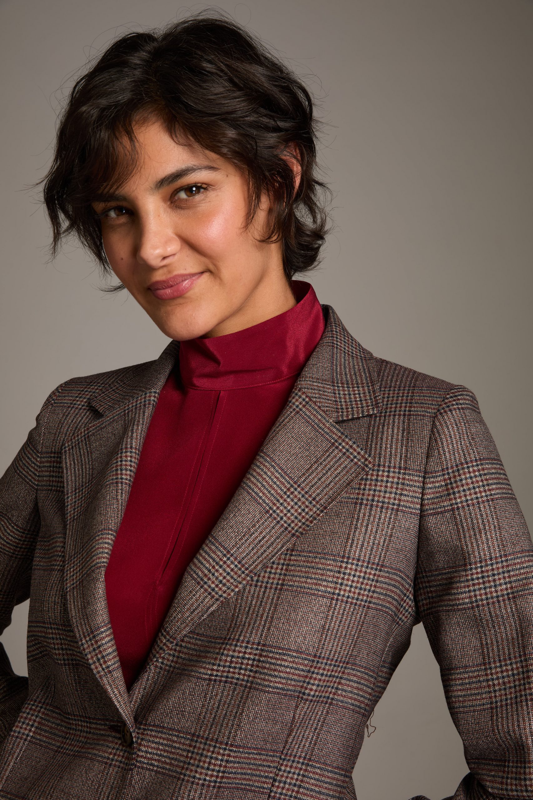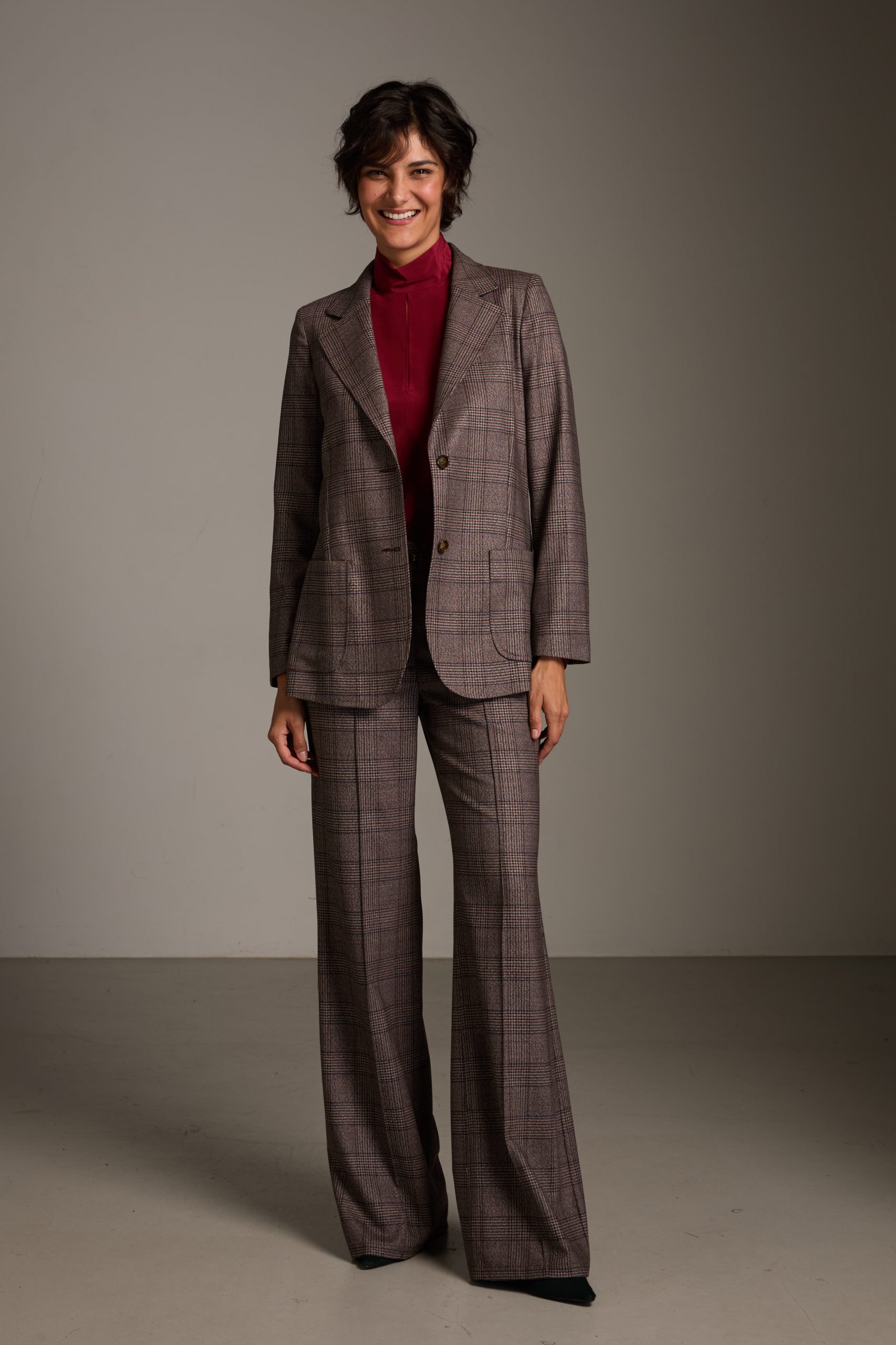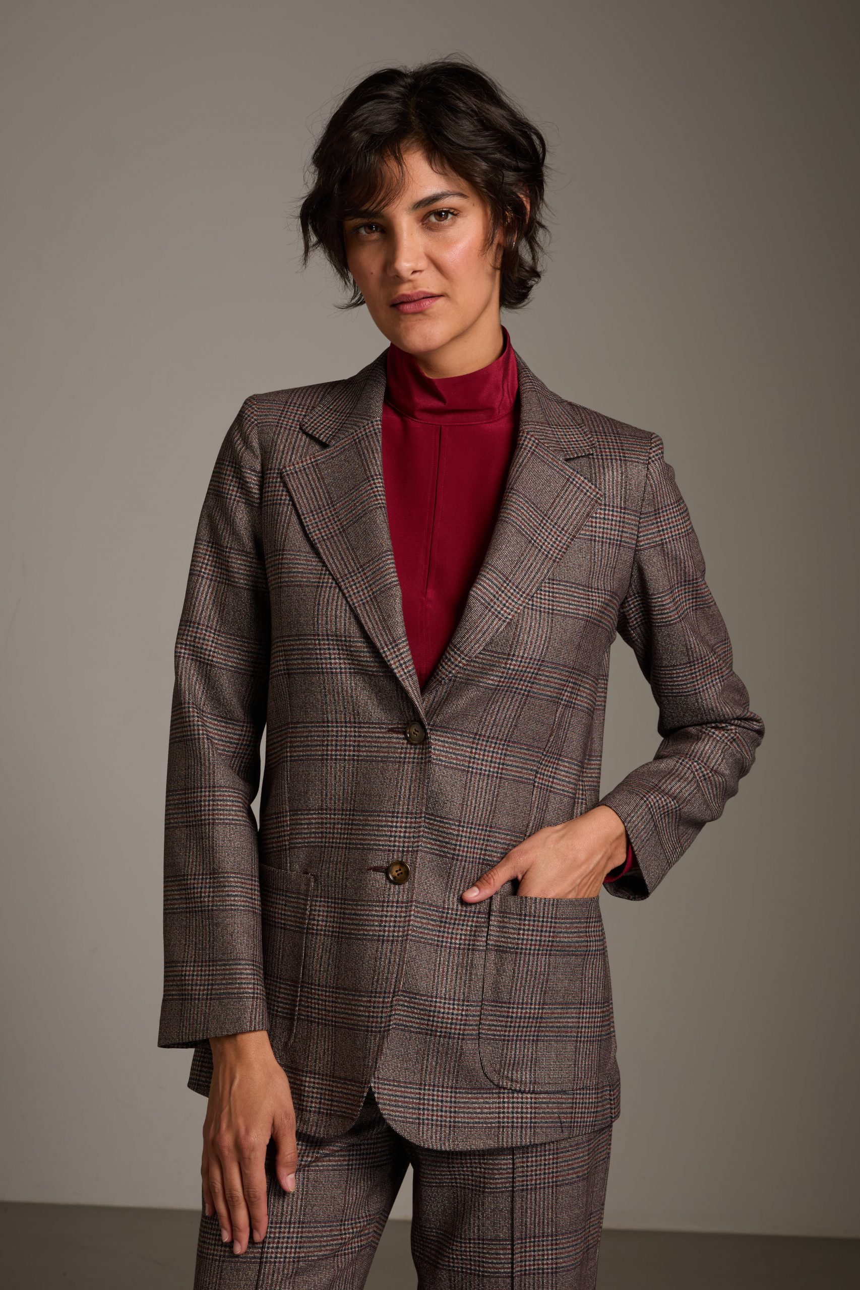 Blazer Tara di Carla Saibene, giacca monopetto in lana principe di Galles blu e bordeaux a due bottoni dal taglio sartoriale , con tasche applicate.