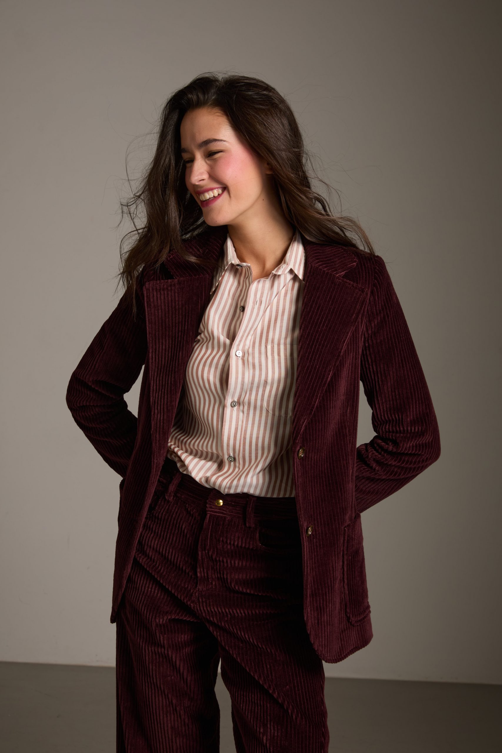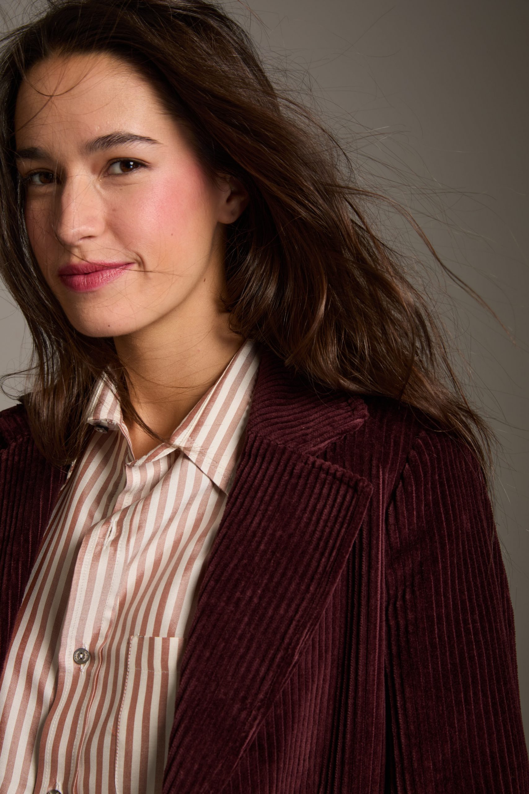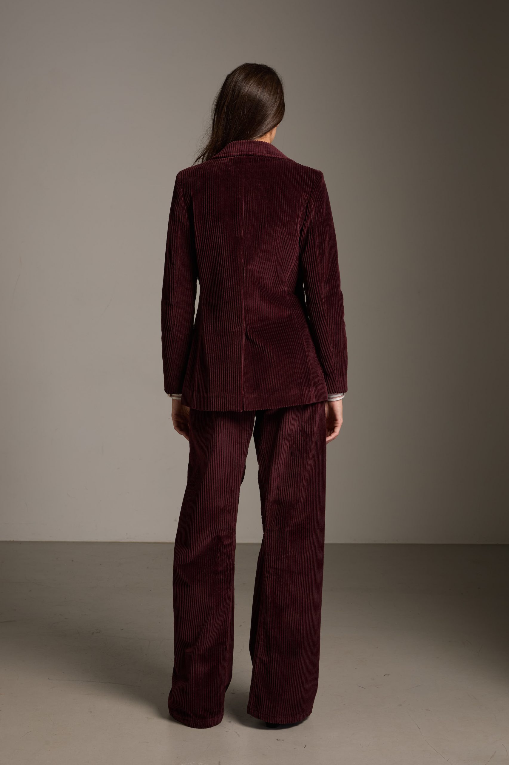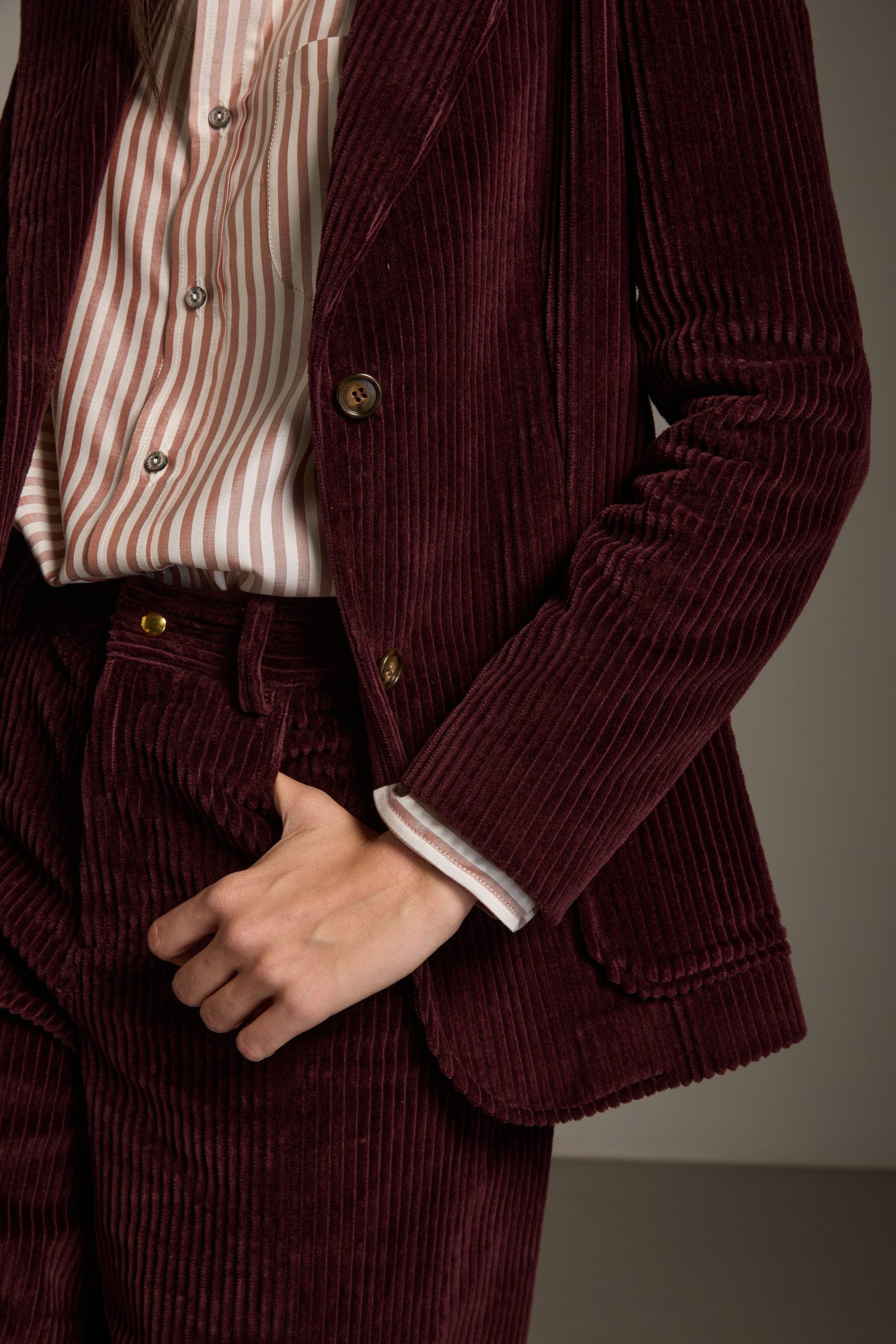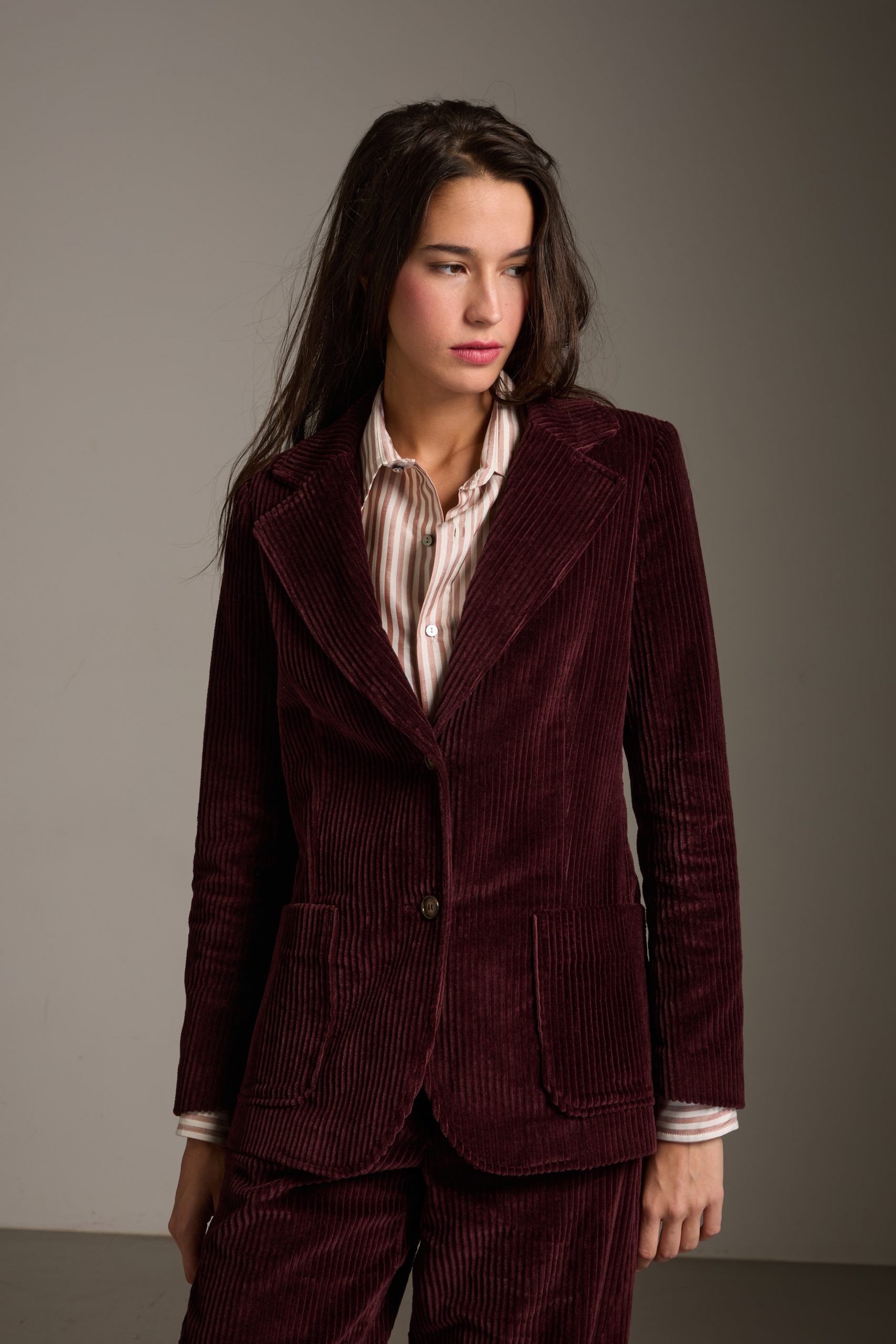 Blazer Tara di Carla Saibene, giacca monopetto in velluto a coste bordeaux a due bottoni dal taglio sartoriale , con tasche applicate.