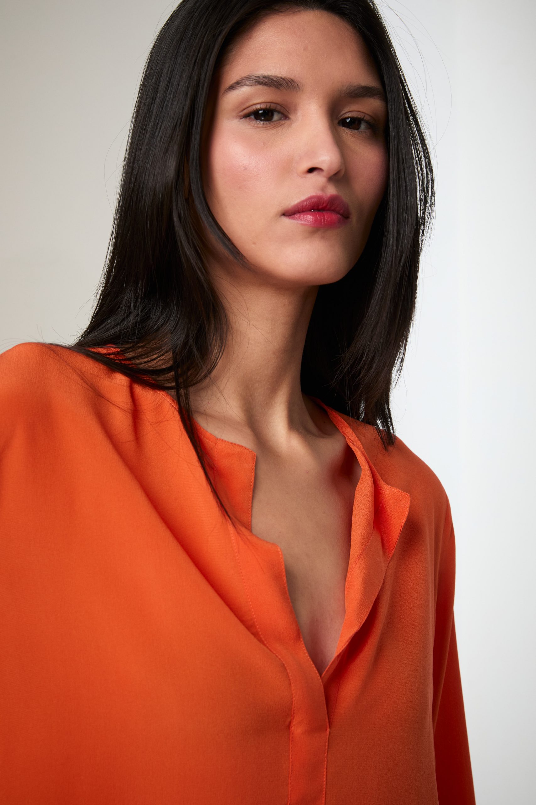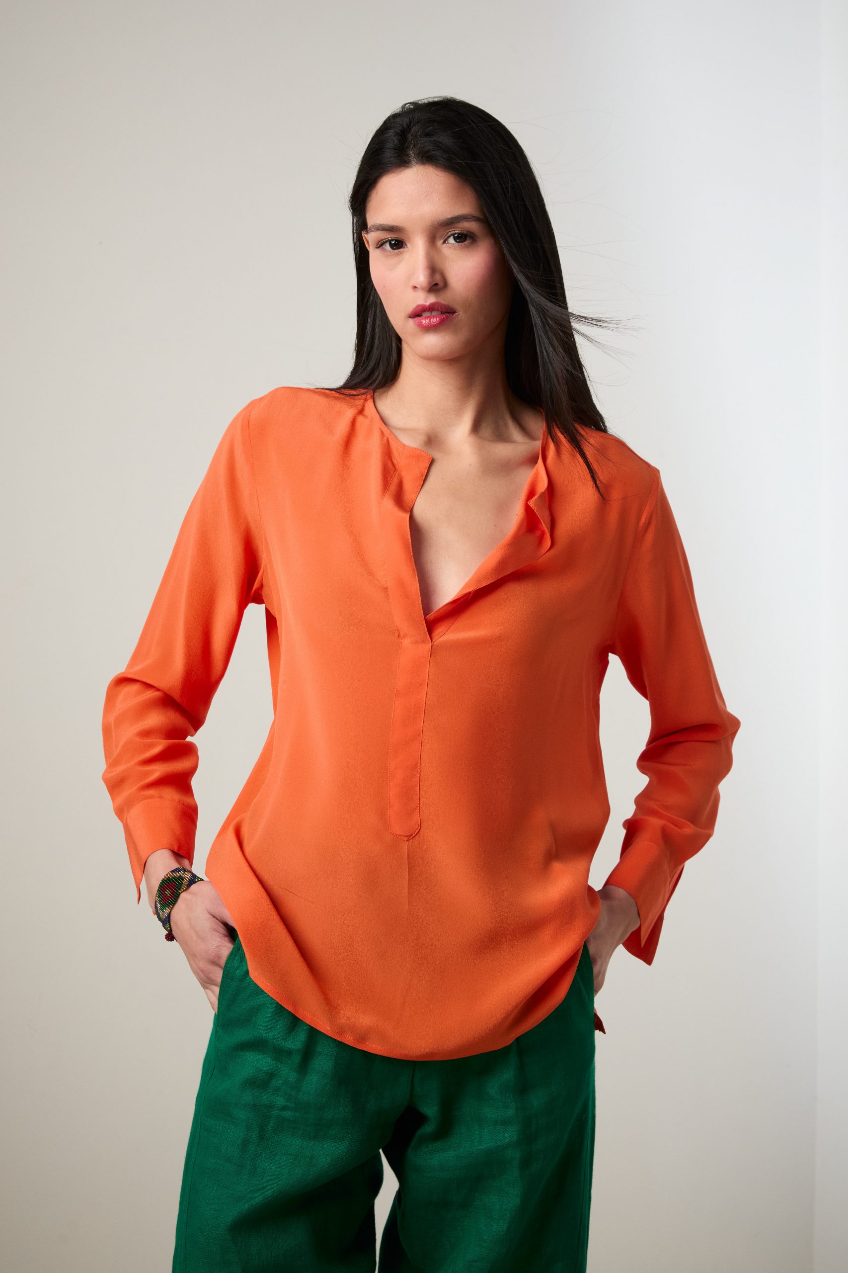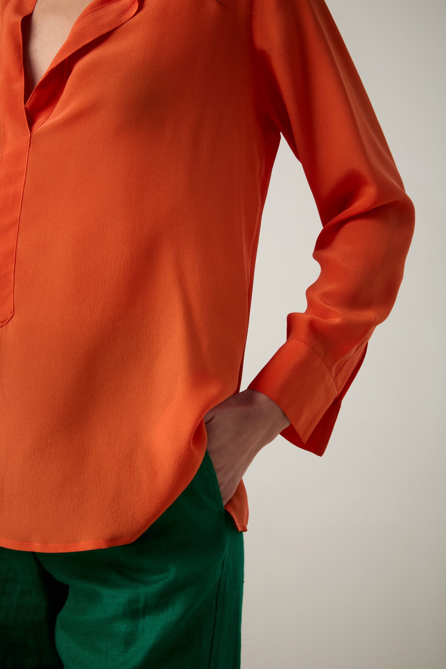 Camicia India di Carla Saibene , modello iconico della collezione, in seta crepe de chine arancio mandarino. Questa camicia è una rivisitazione urban chic della kurta indiana, estremamente versatile, dal taglio dritto con spacchi laterali, senza colletto, maniche lunghe  con polsini da camicia senza bottoni, ha un allure un po’ maschile ma allo stesso tempo molto femminile.