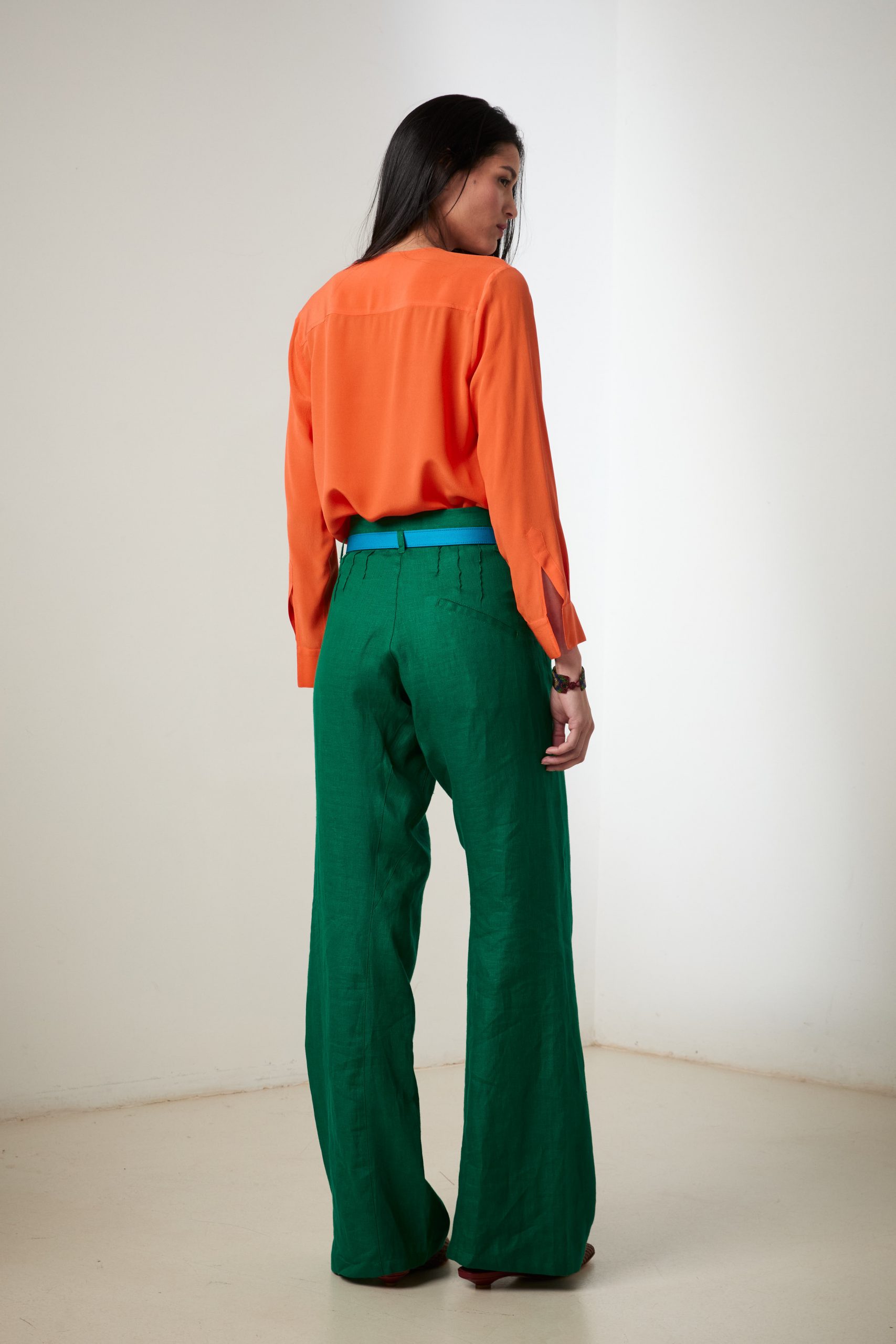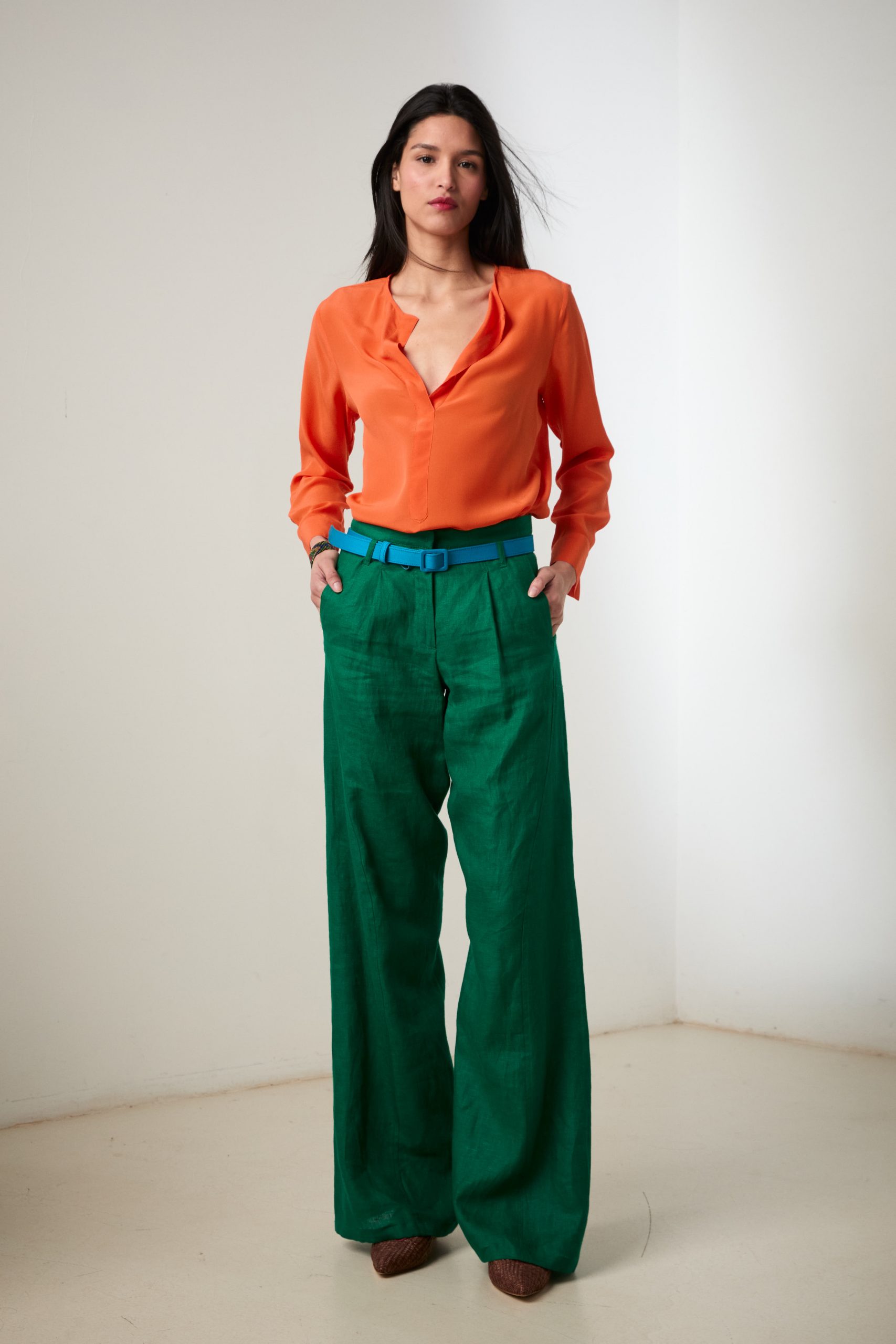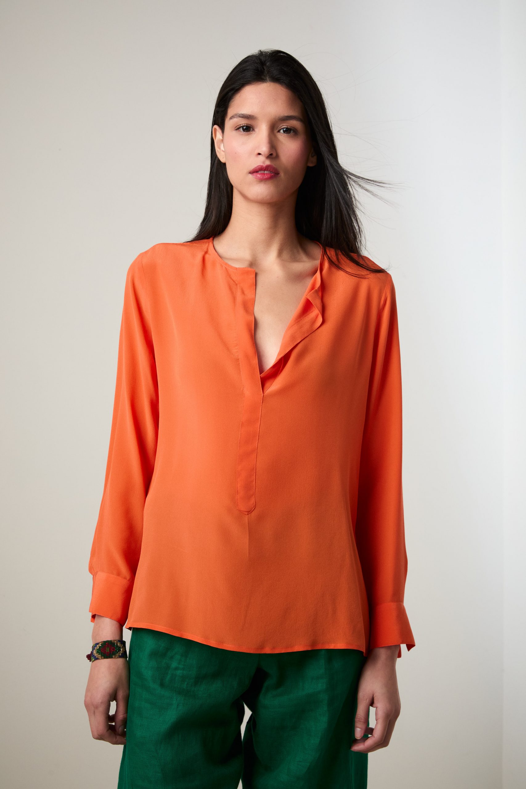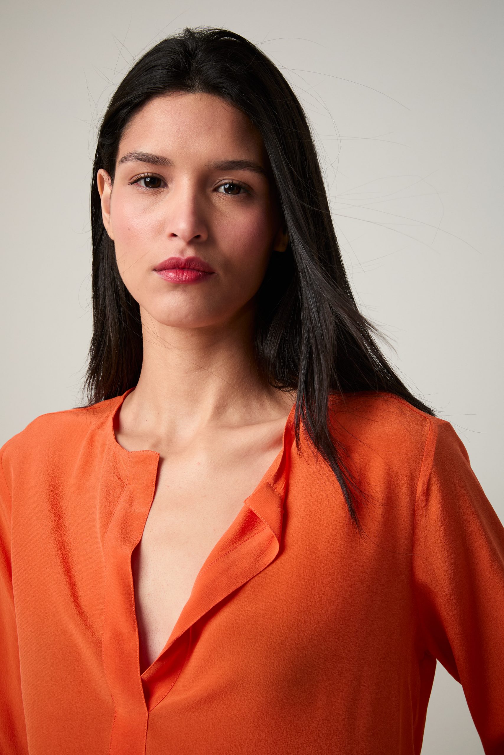 Camicia India di Carla Saibene , modello iconico della collezione, in seta crepe de chine arancio mandarino. Questa camicia è una rivisitazione urban chic della kurta indiana, estremamente versatile, dal taglio dritto con spacchi laterali, senza colletto, maniche lunghe  con polsini da camicia senza bottoni, ha un allure un po’ maschile ma allo stesso tempo molto femminile.