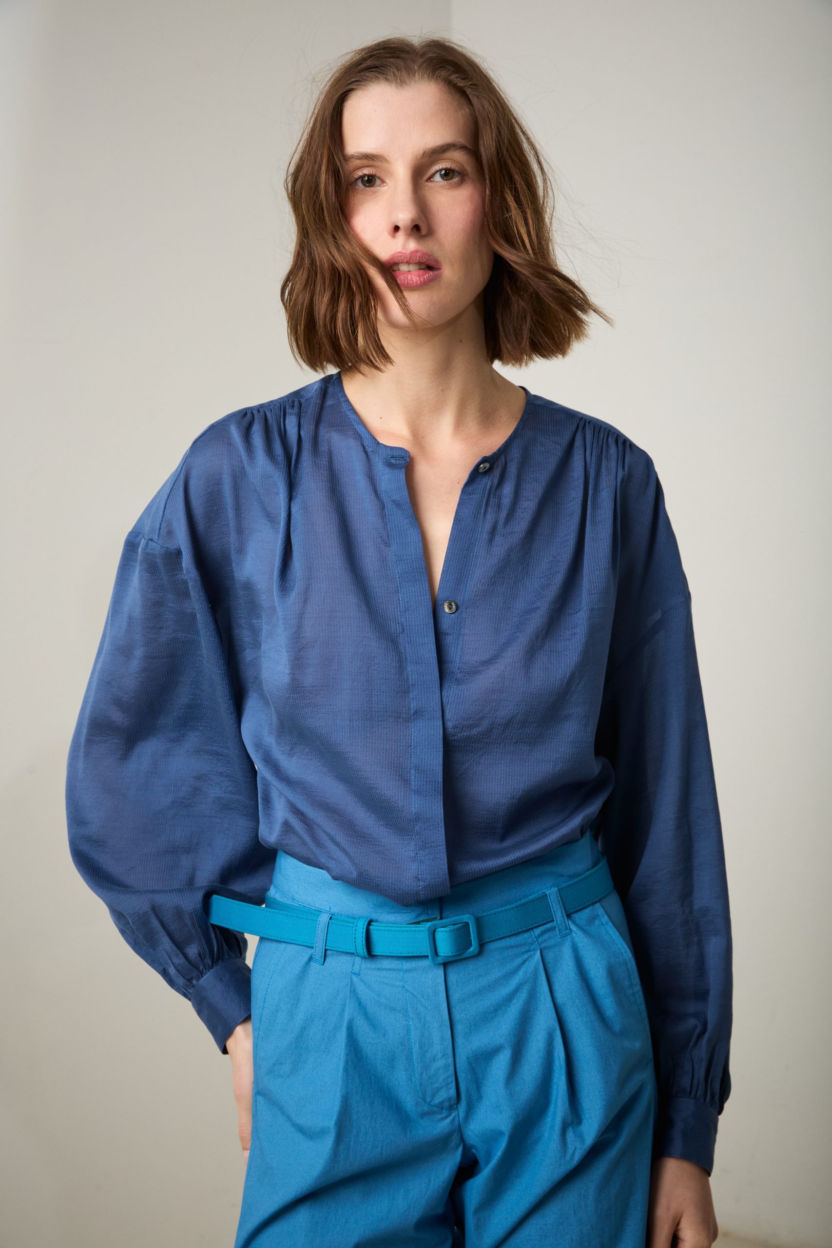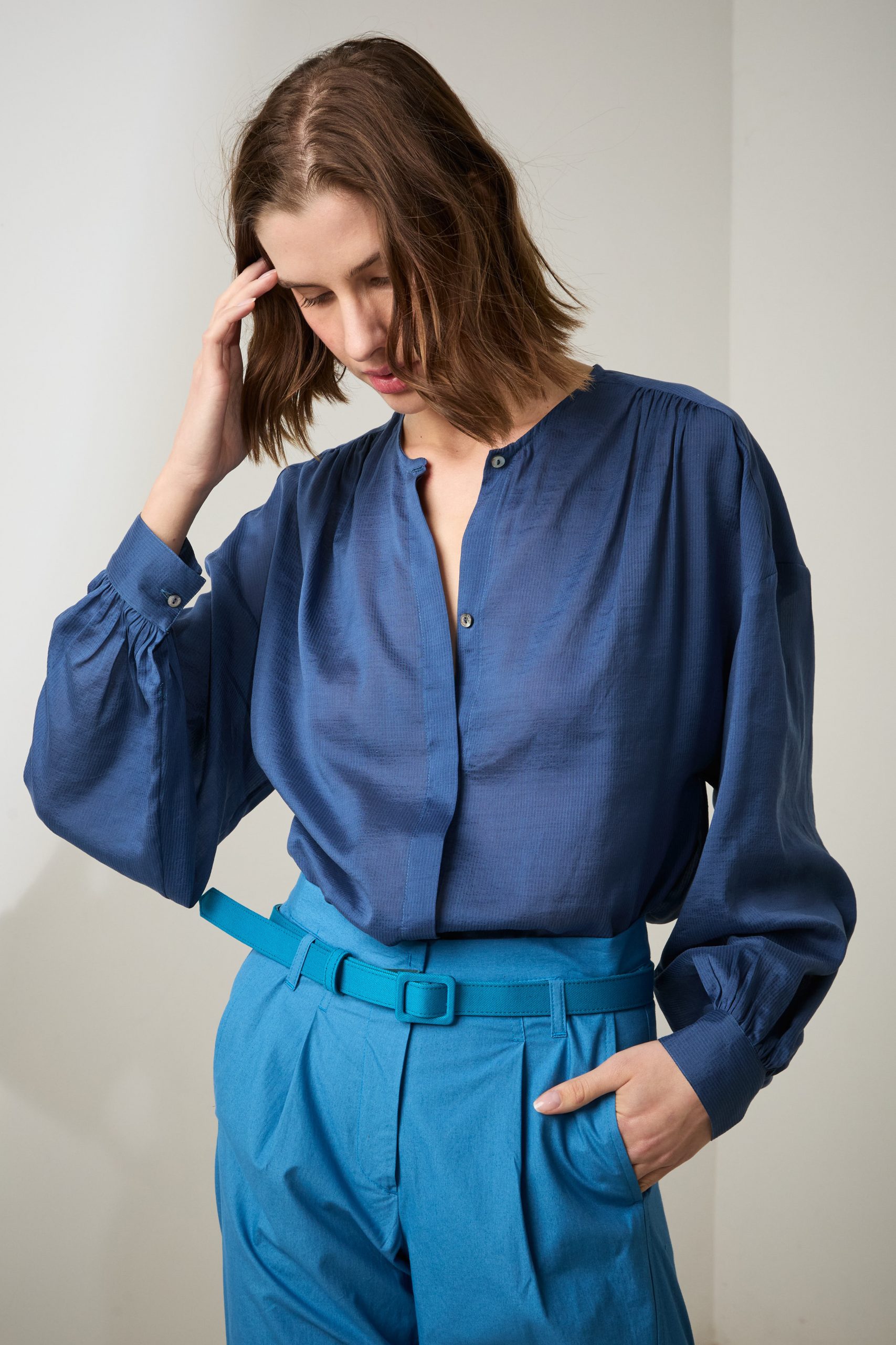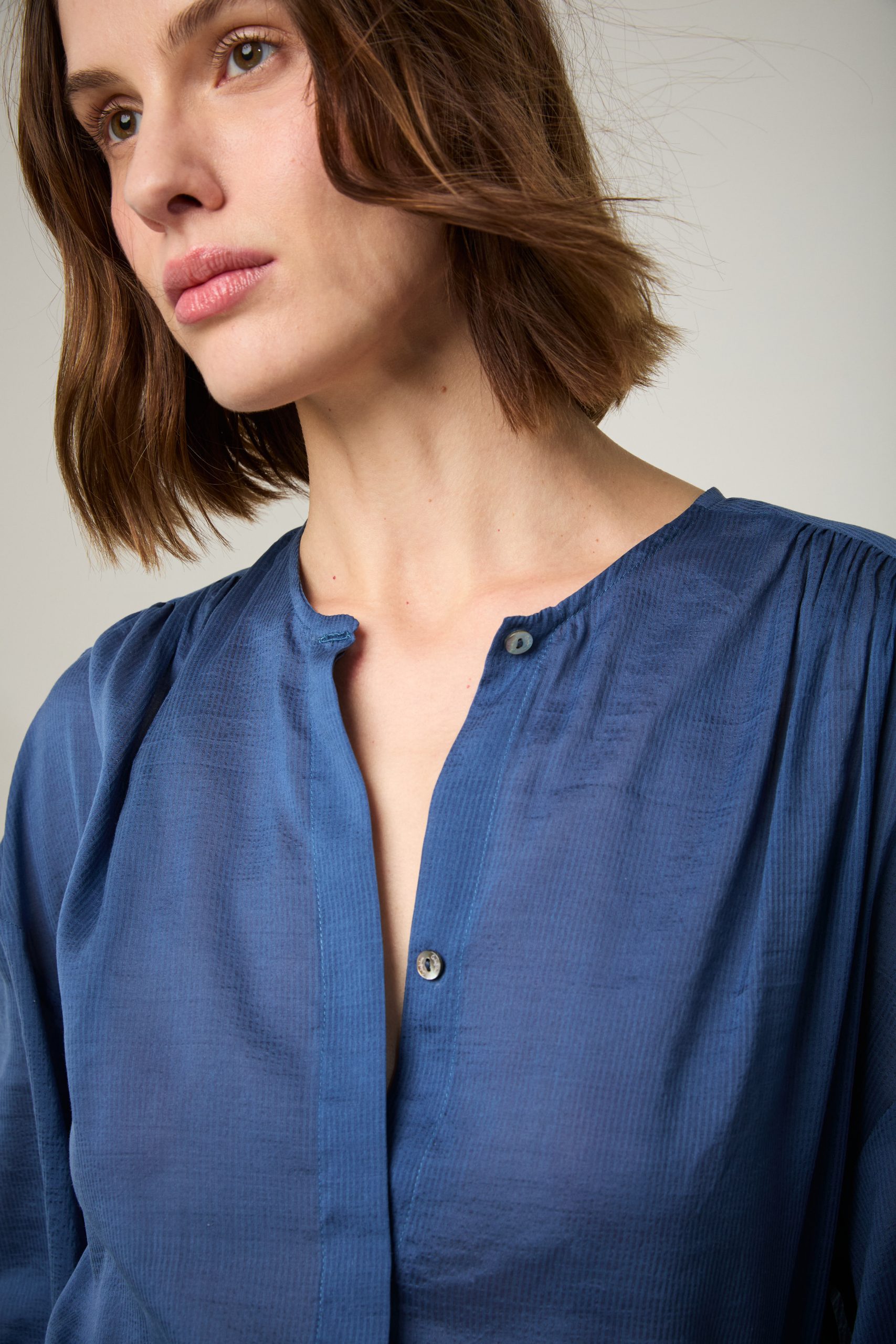 Camicia Luce di Carla Saibene, in cotone e seta effetto seersucker blu dal taglio morbido, con ampie maniche lunghe, girocollo, arricciata sulle spalle e sul retro