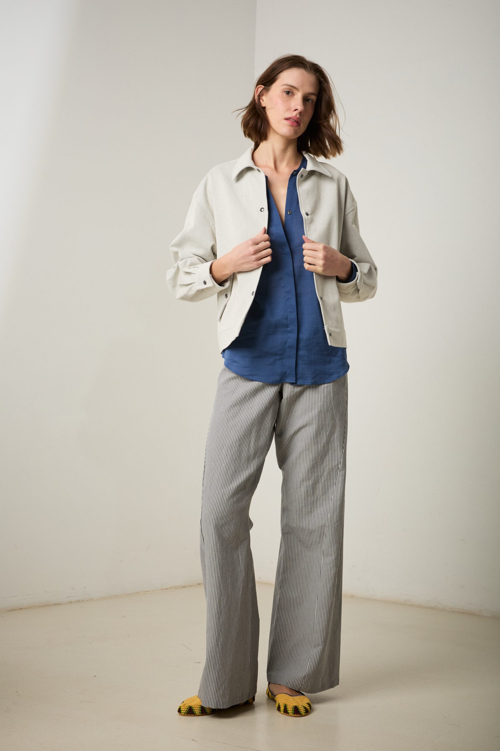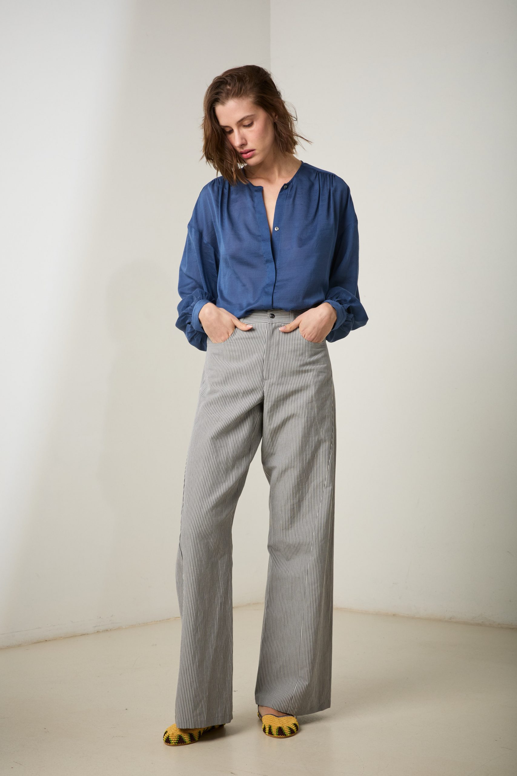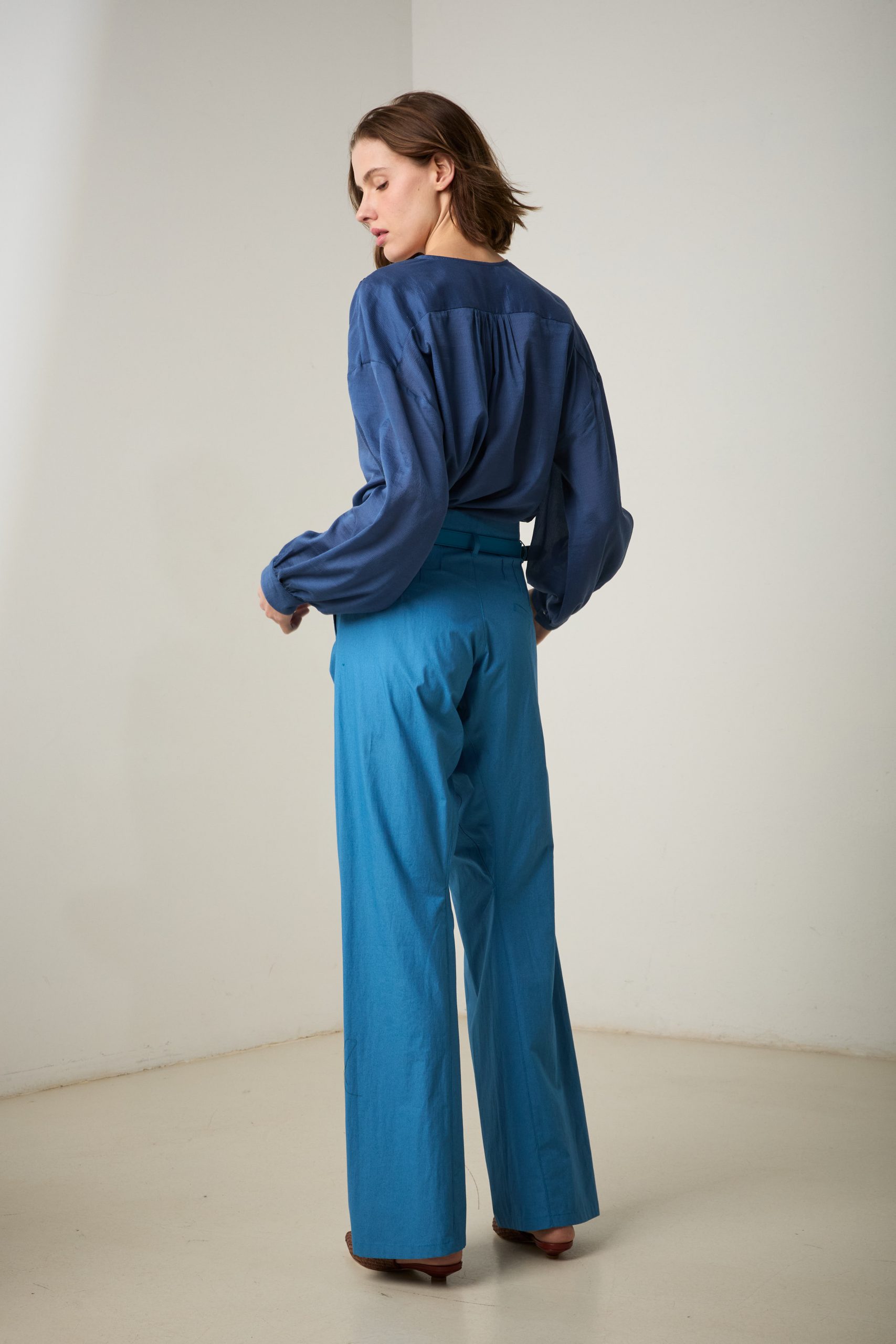 Camicia Luce di Carla Saibene, in cotone e seta effetto seersucker blu dal taglio morbido, con ampie maniche lunghe, girocollo, arricciata sulle spalle e sul retro