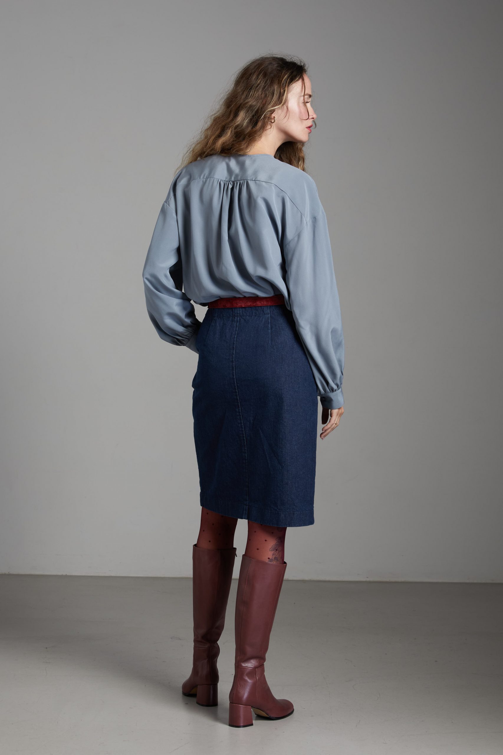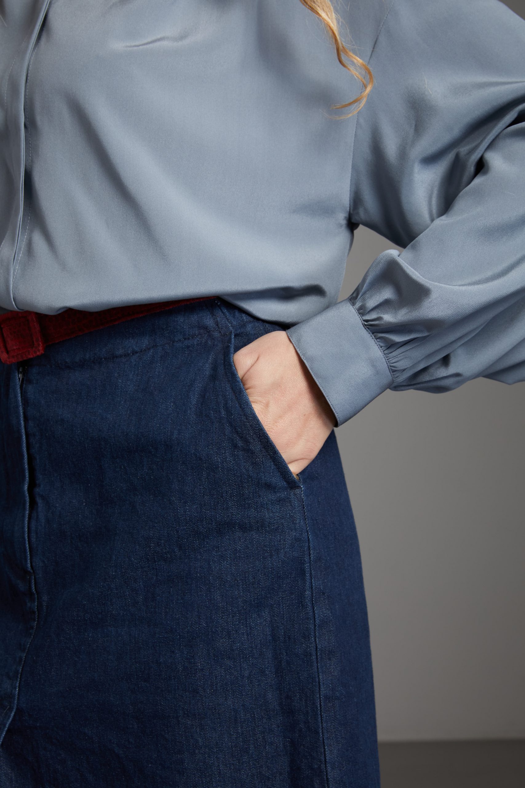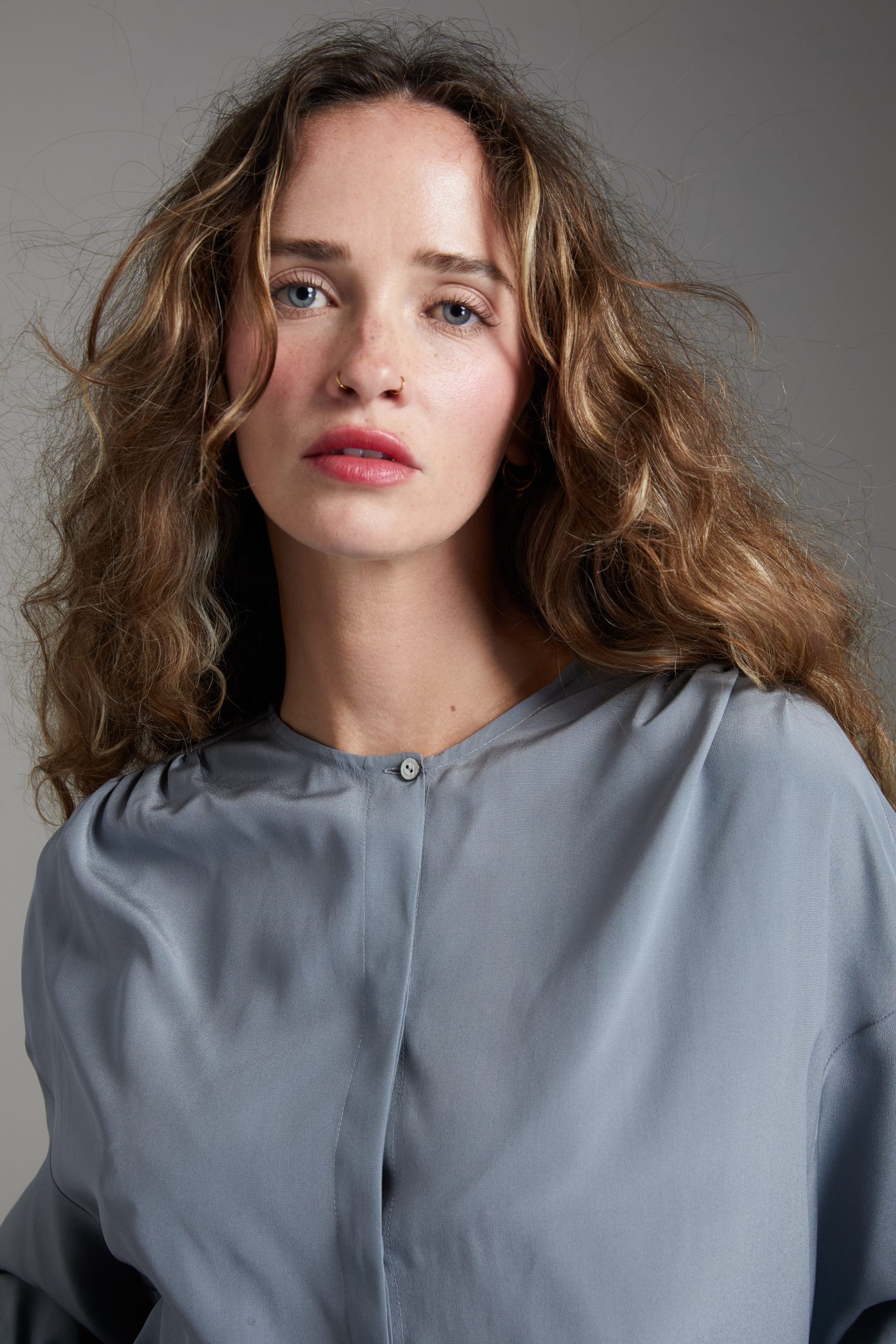 Camicia Luce di Carla Saibene, in seta grigia dal taglio morbido, con ampie maniche lunghe, girocollo, arricciata sulle spalle e sul retro.