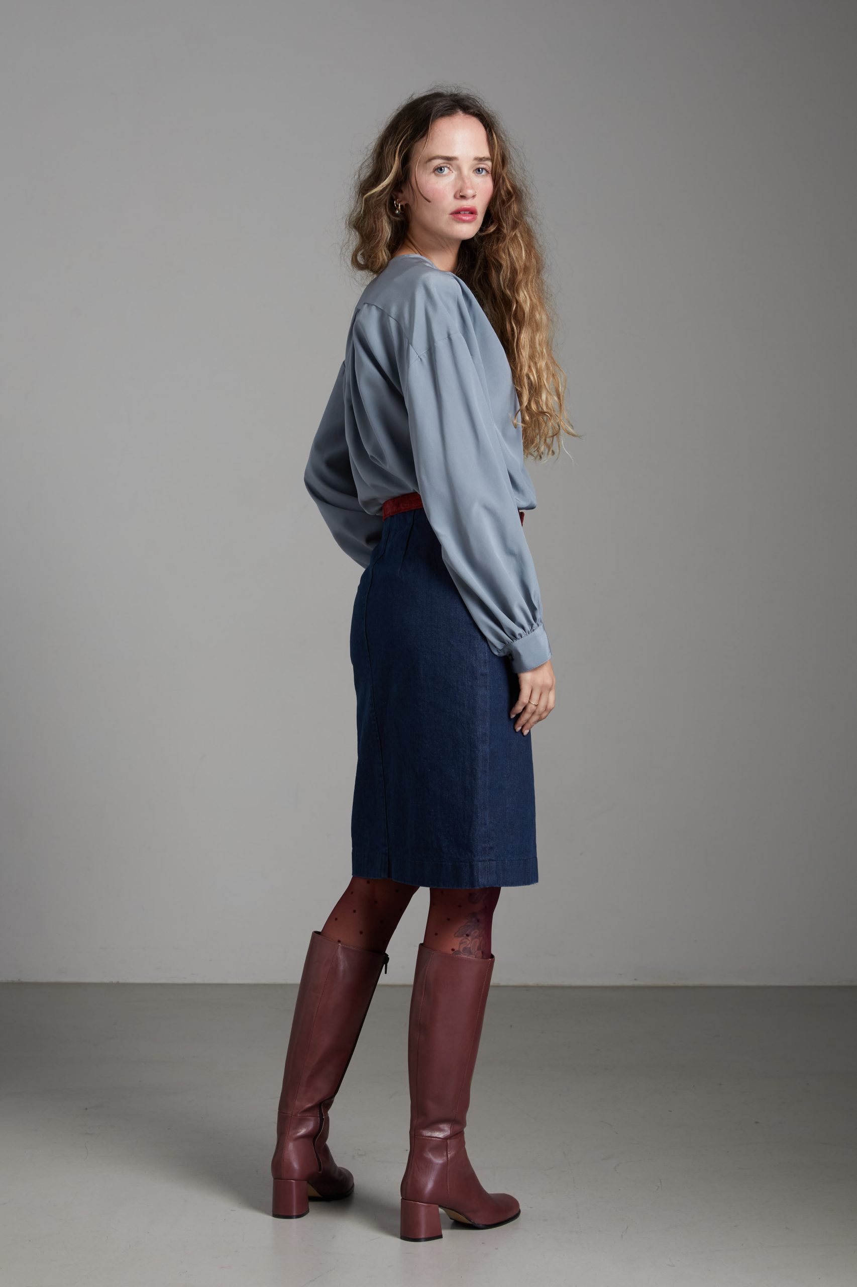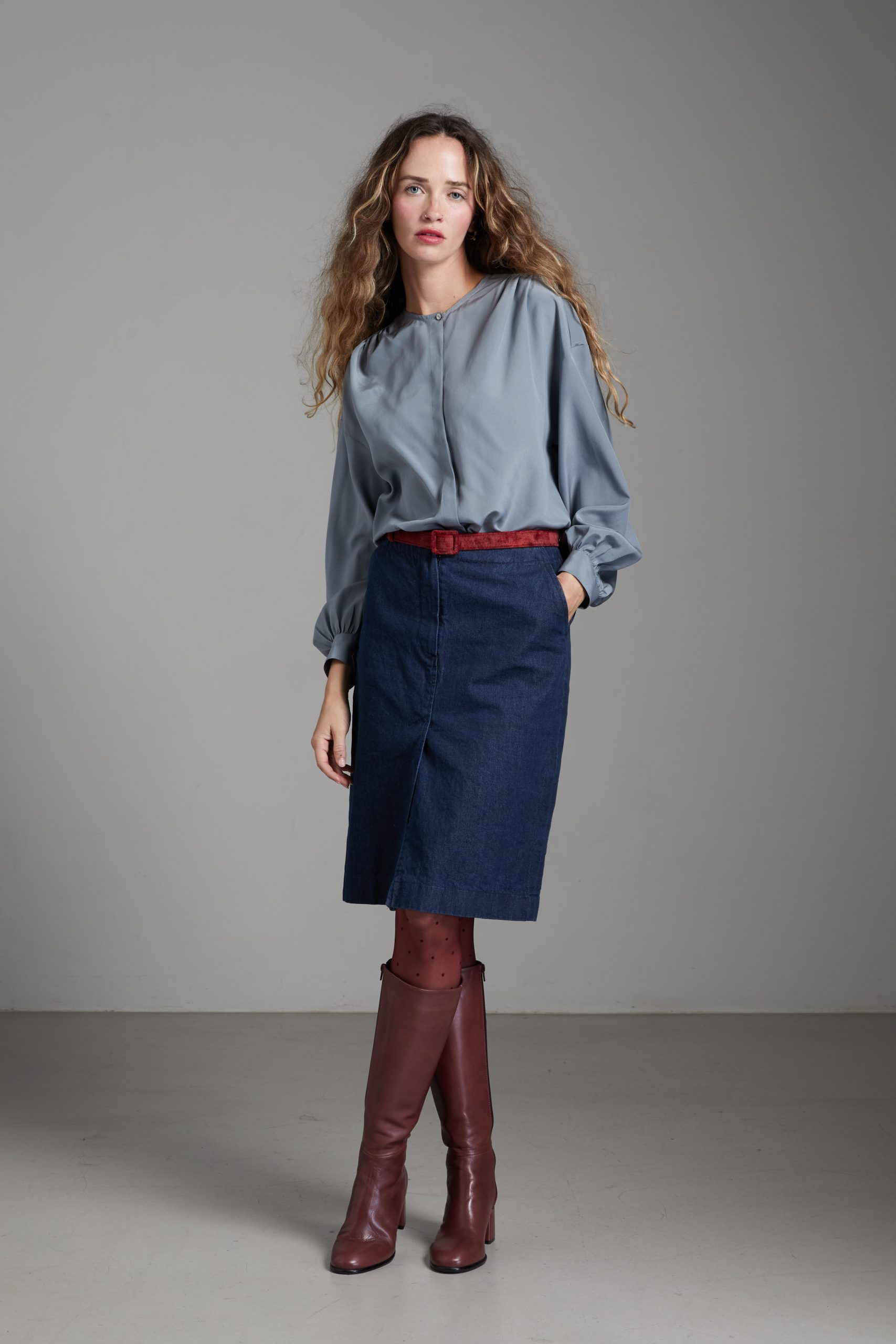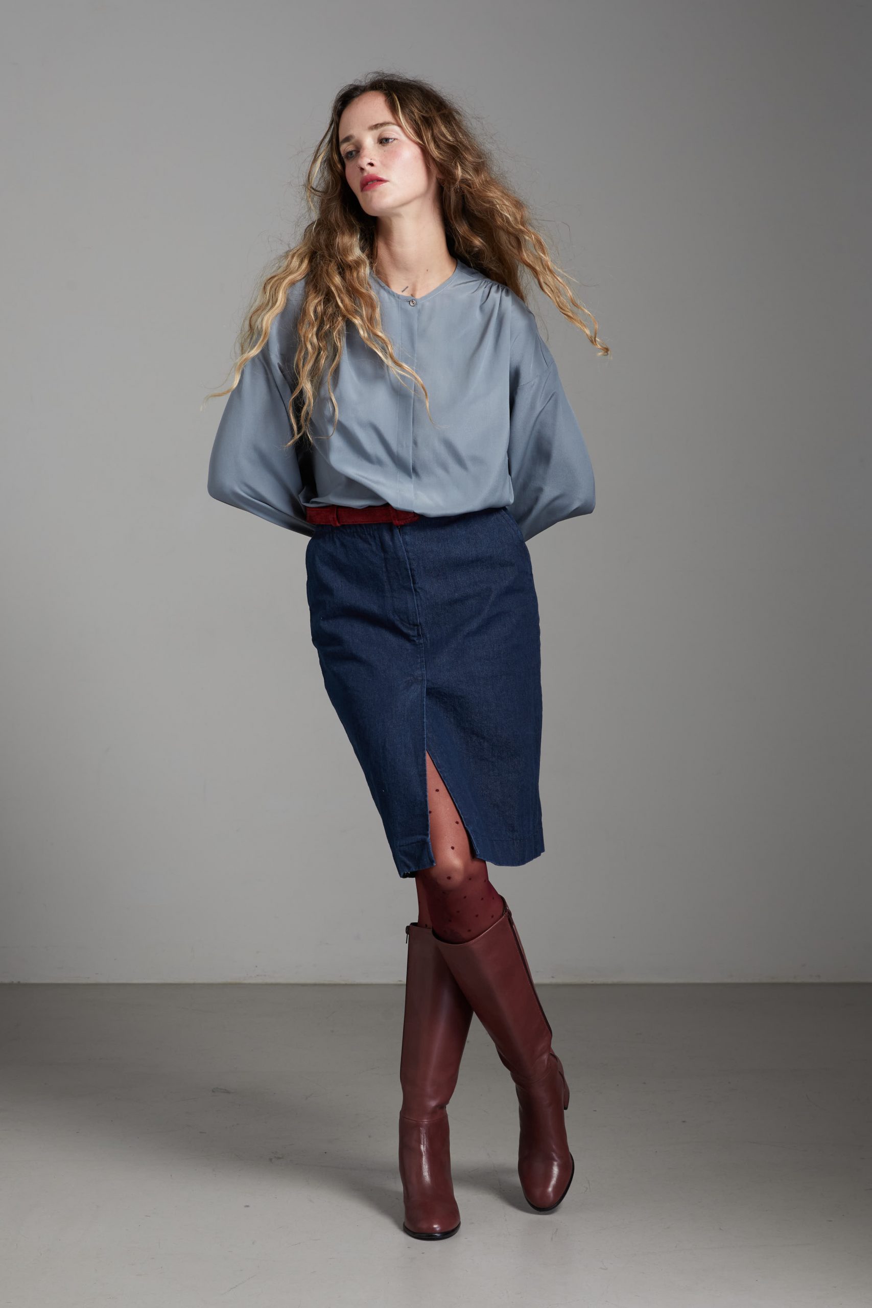 Camicia Luce di Carla Saibene, in seta grigia dal taglio morbido, con ampie maniche lunghe, girocollo, arricciata sulle spalle e sul retro.