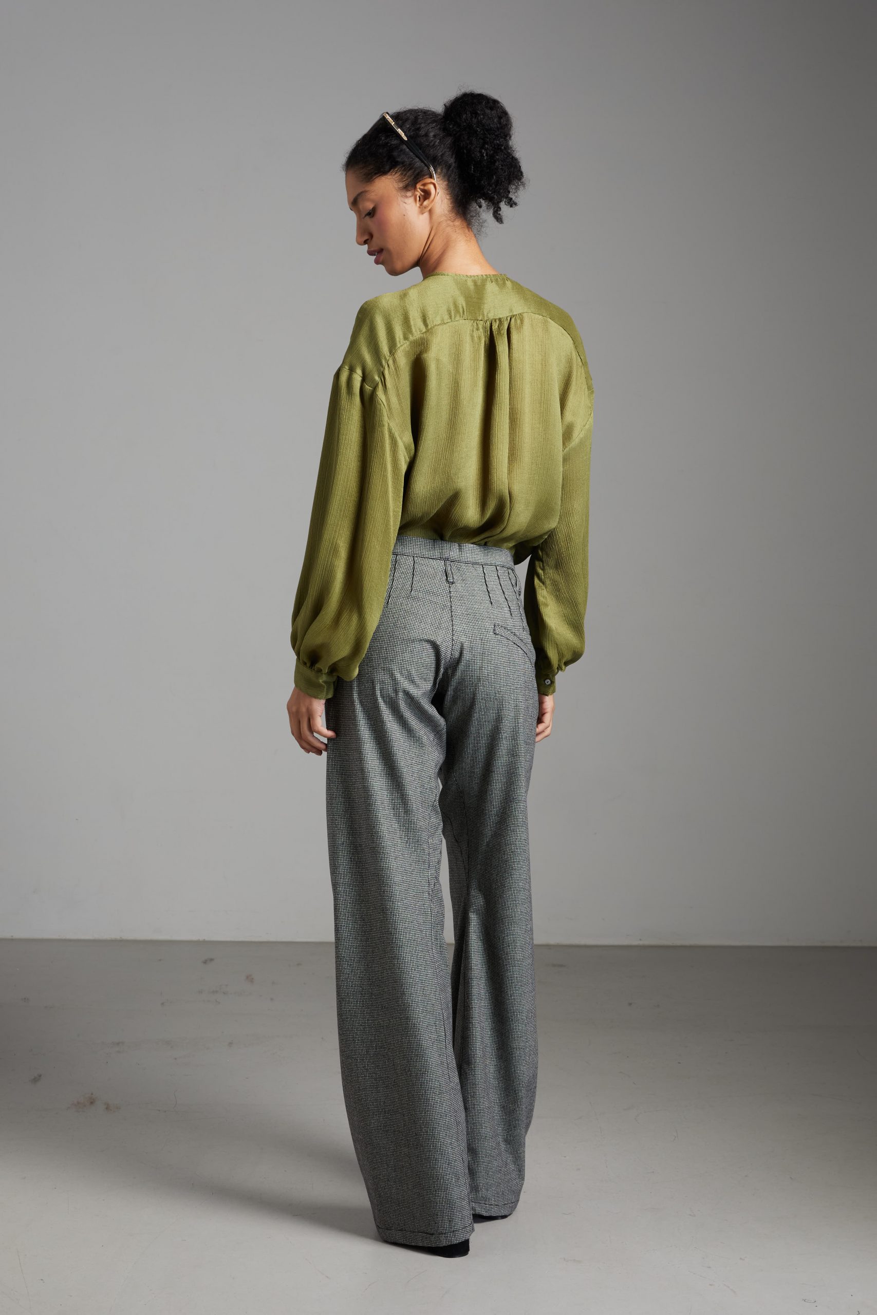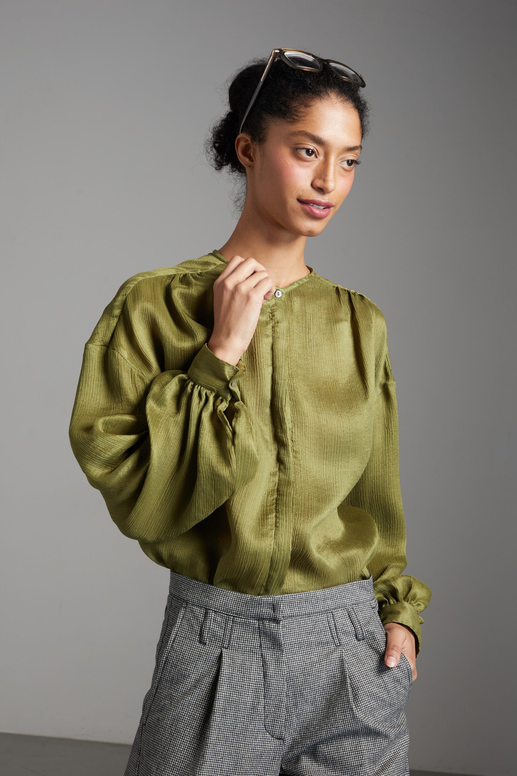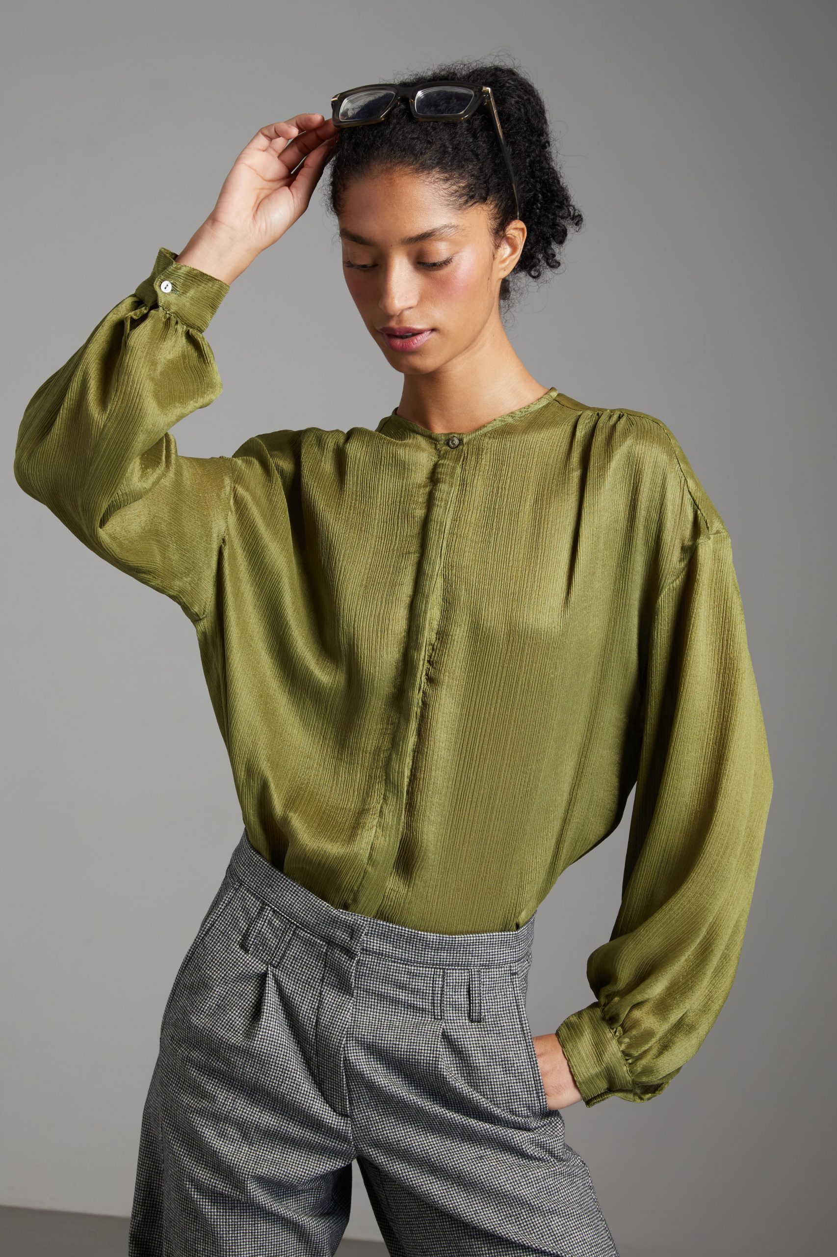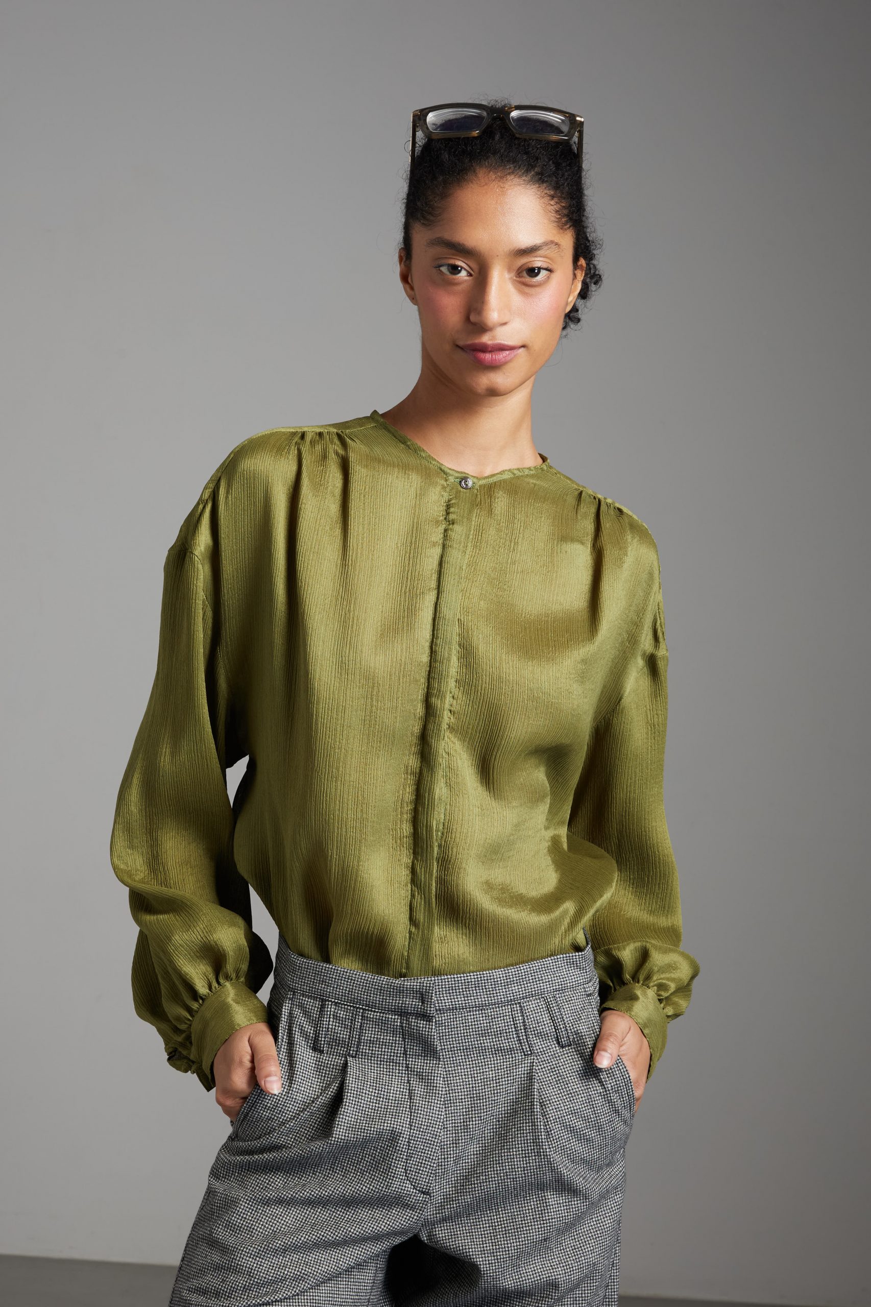 Camicia Luce di Carla Saibene, in seta double verde dal taglio morbido, con ampie maniche lunghe, girocollo, arricciata sulle spalle e sul retro