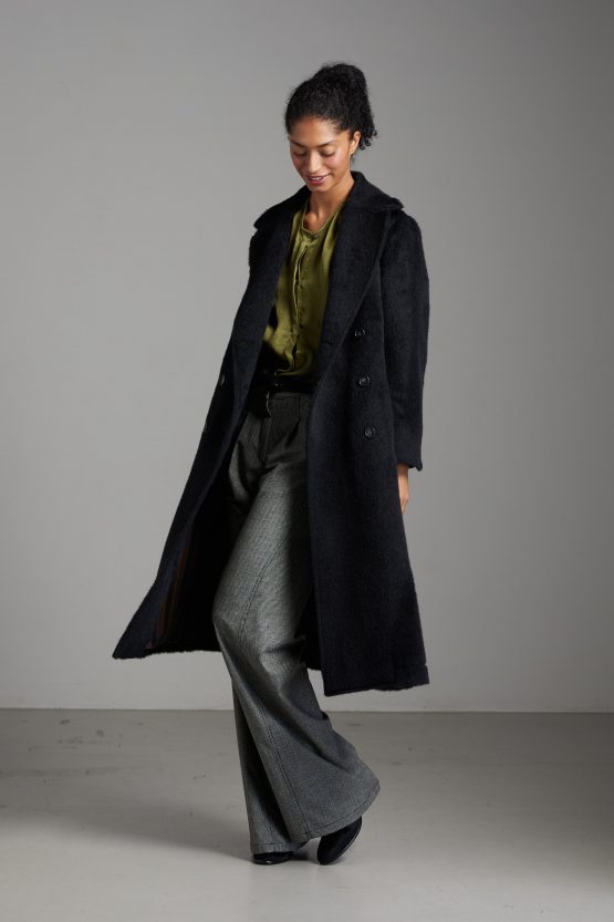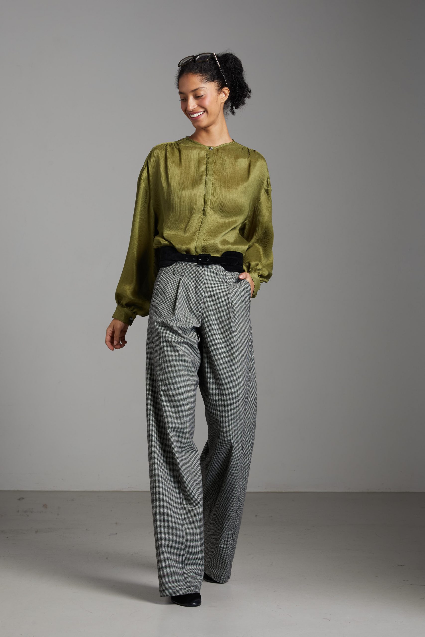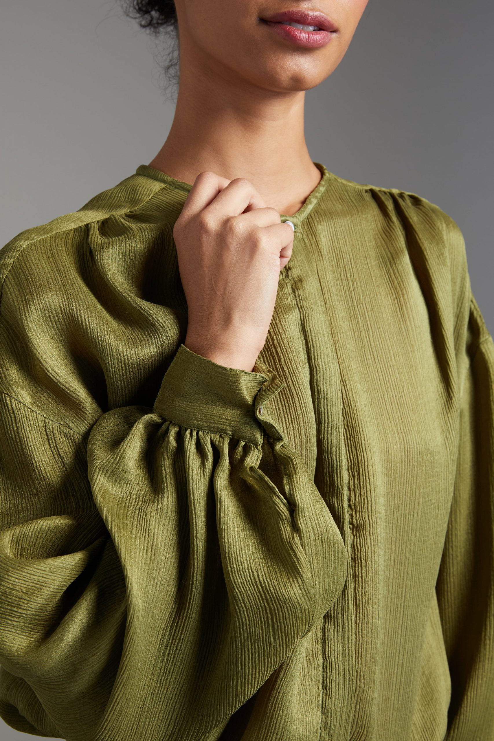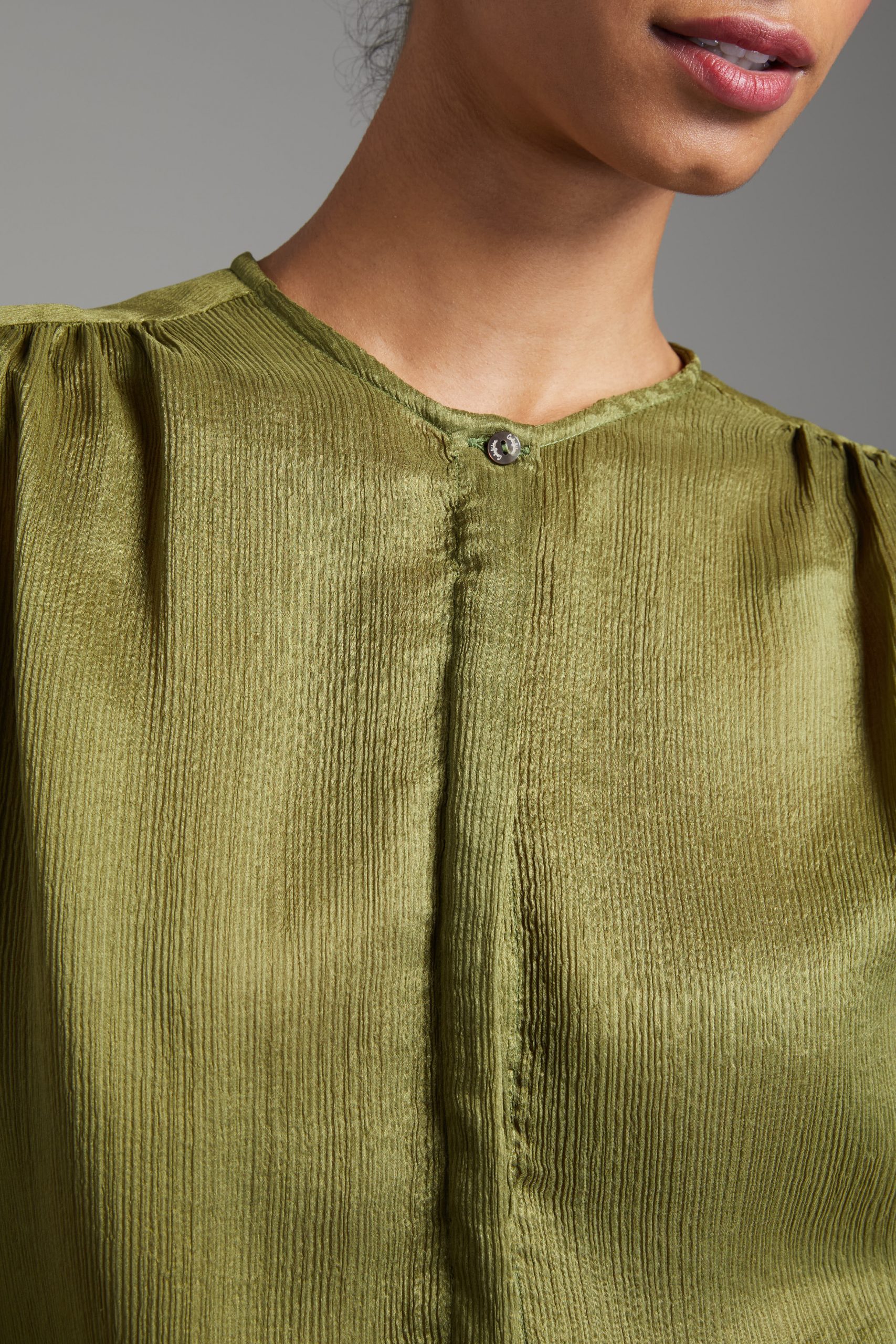 Camicia Luce di Carla Saibene, in seta double verde dal taglio morbido, con ampie maniche lunghe, girocollo, arricciata sulle spalle e sul retro