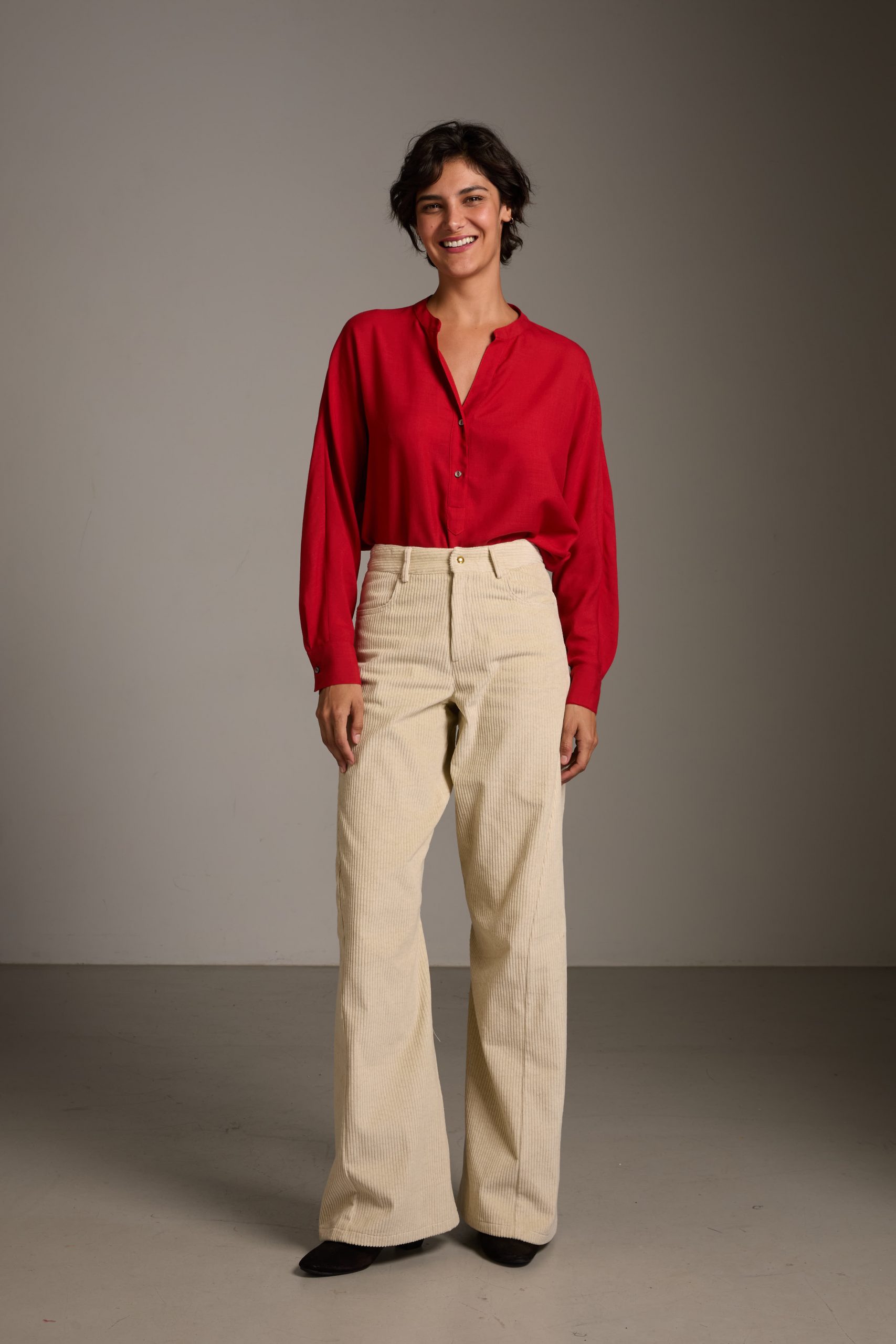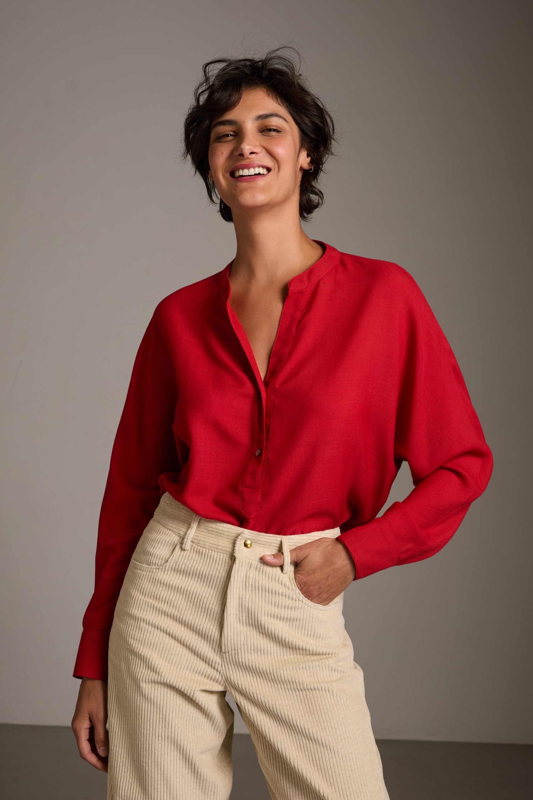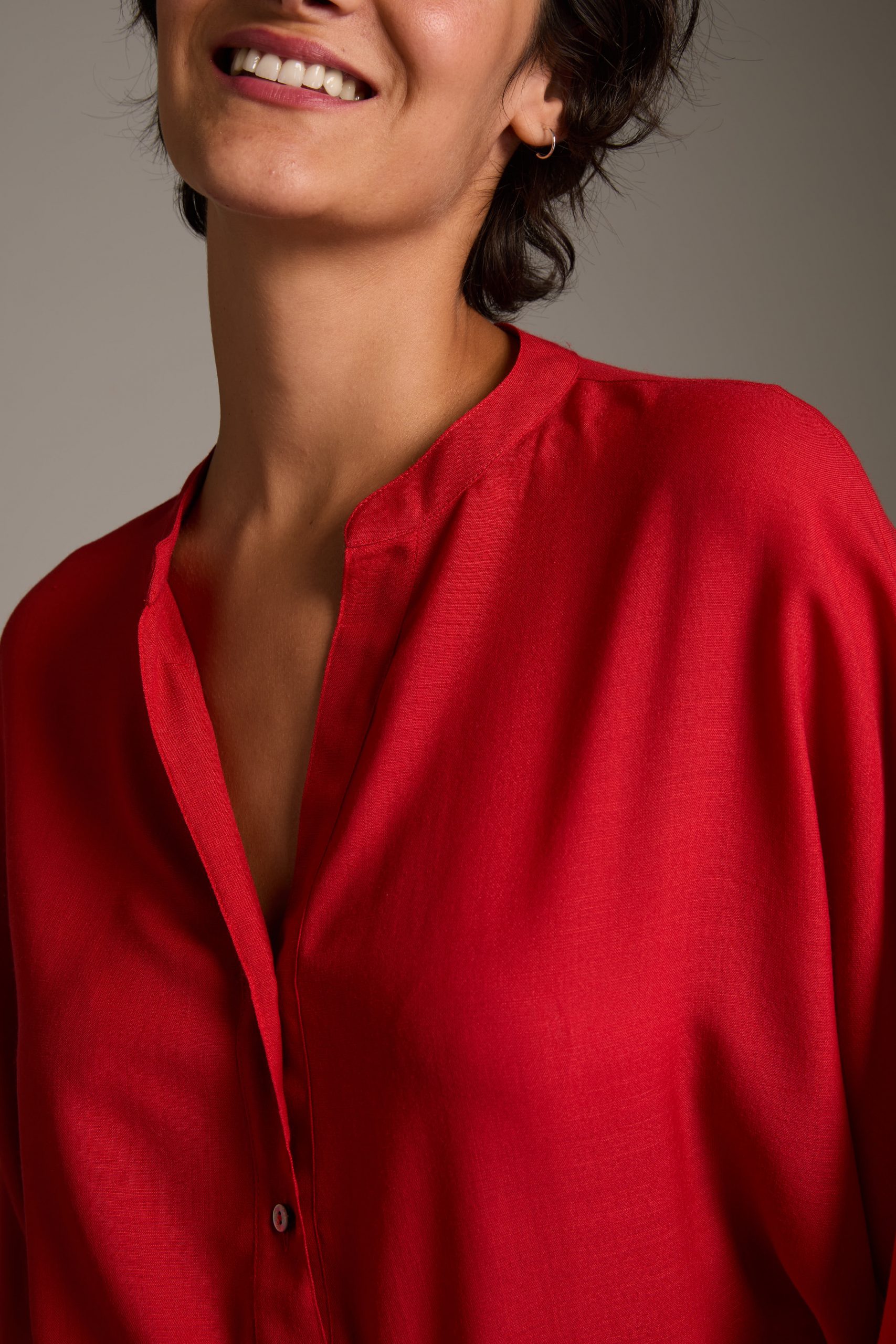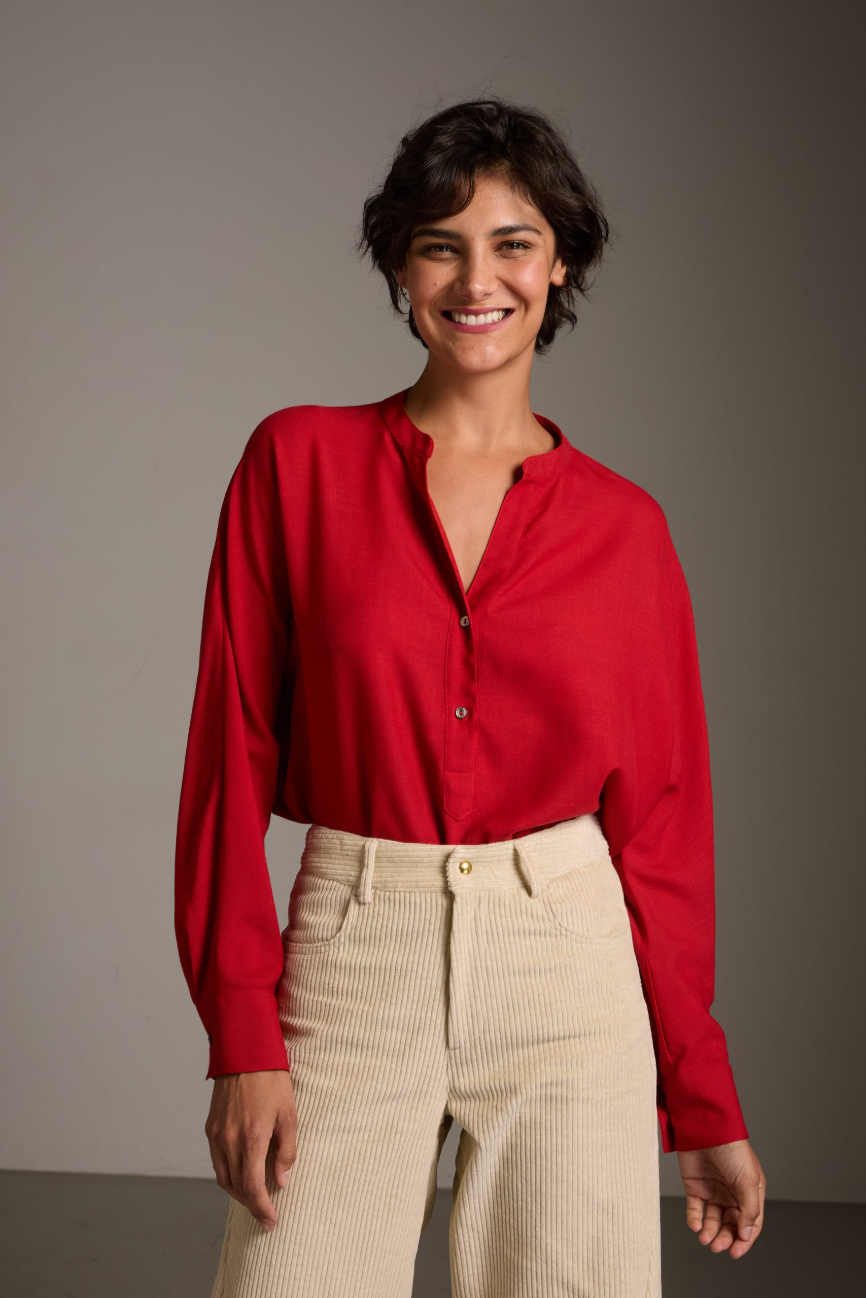 Camicia Marta di Carla Saibene in lana rossa, manica a pipistrello dalla silhouette morbida.
