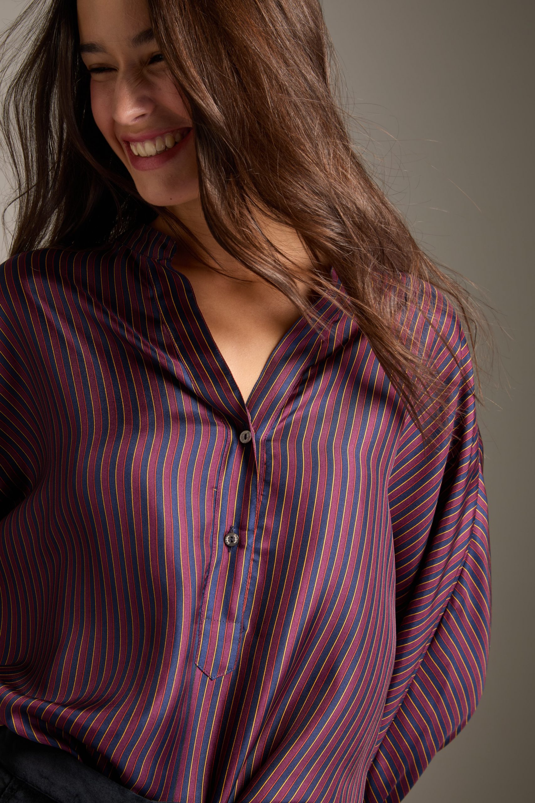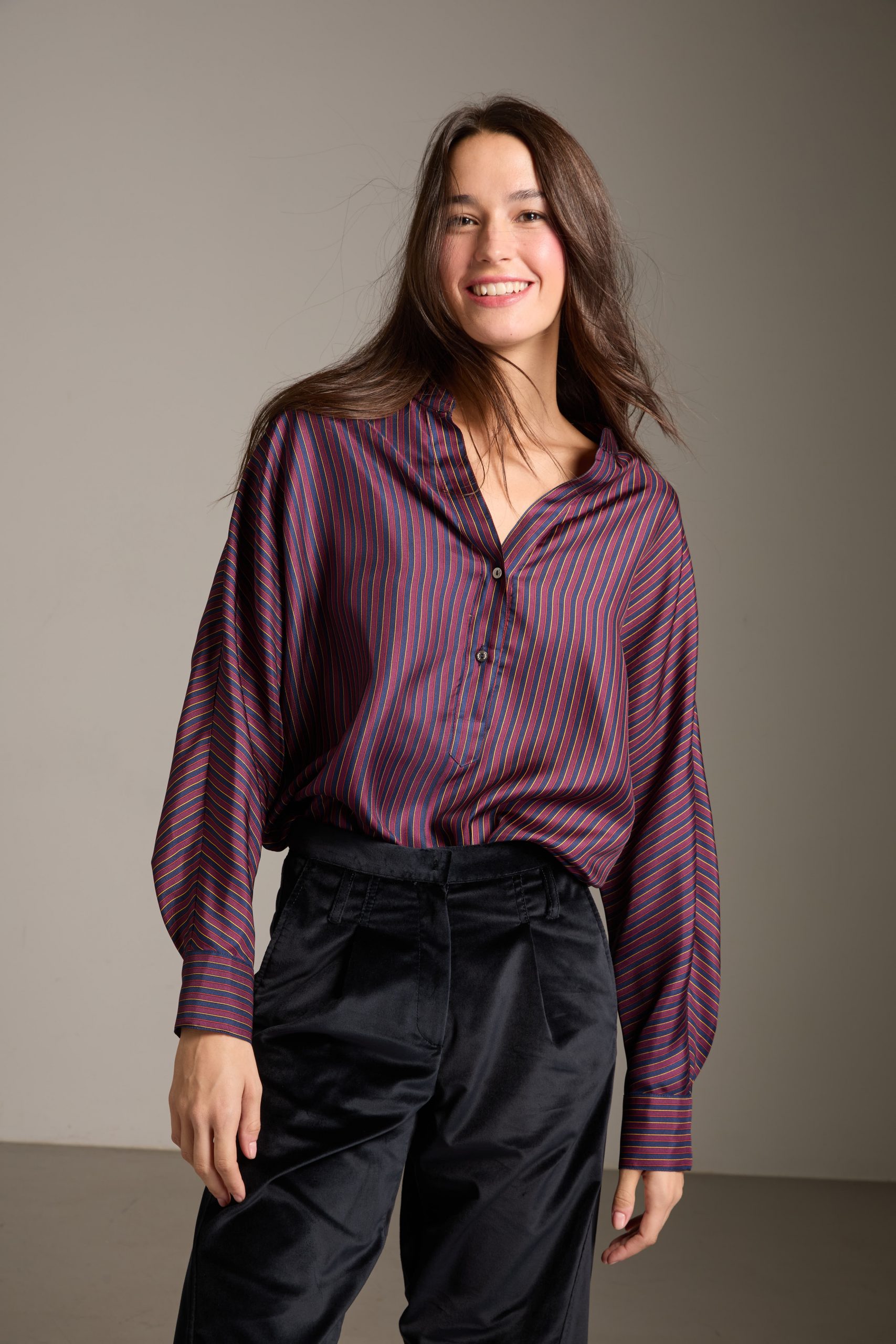 Camicia Marta di Carla Saibene in twill di seta a righe bordeaux e blu, manica a pipistrello dalla silhouette morbida.