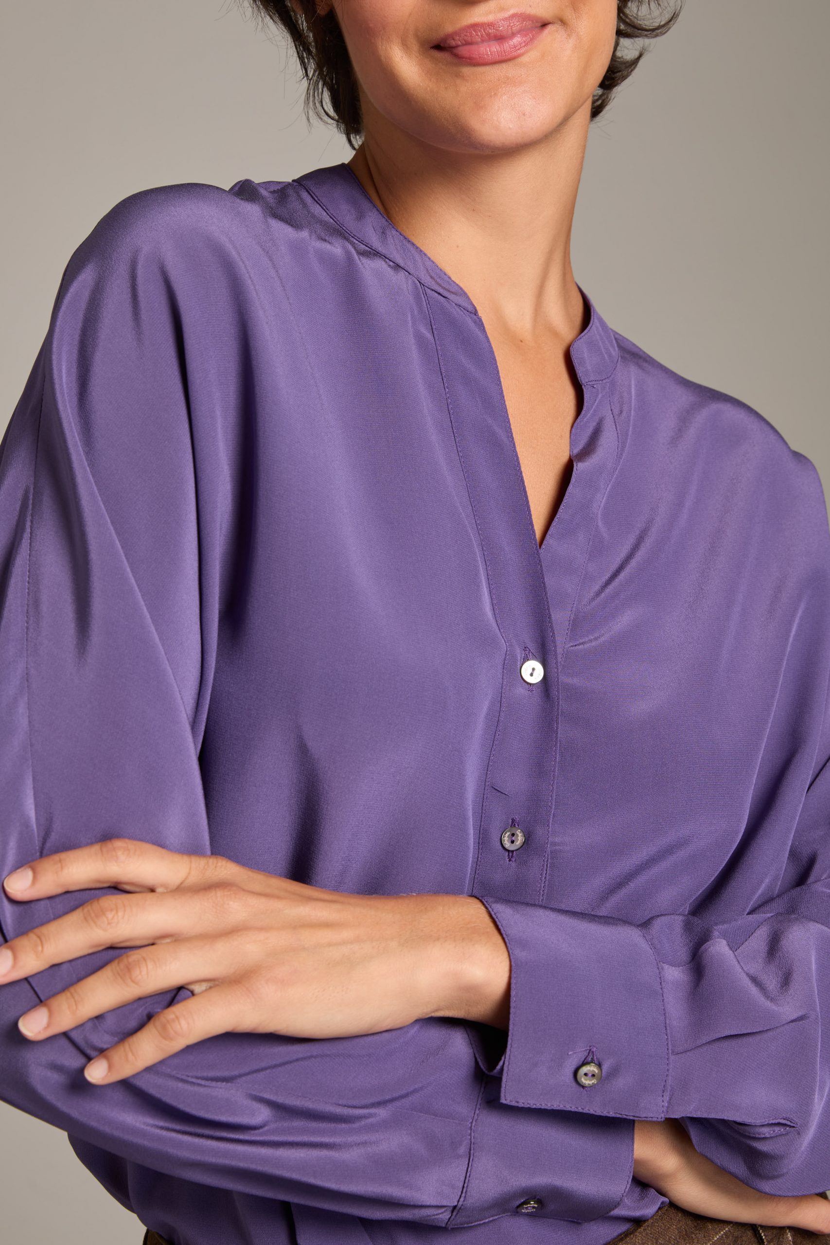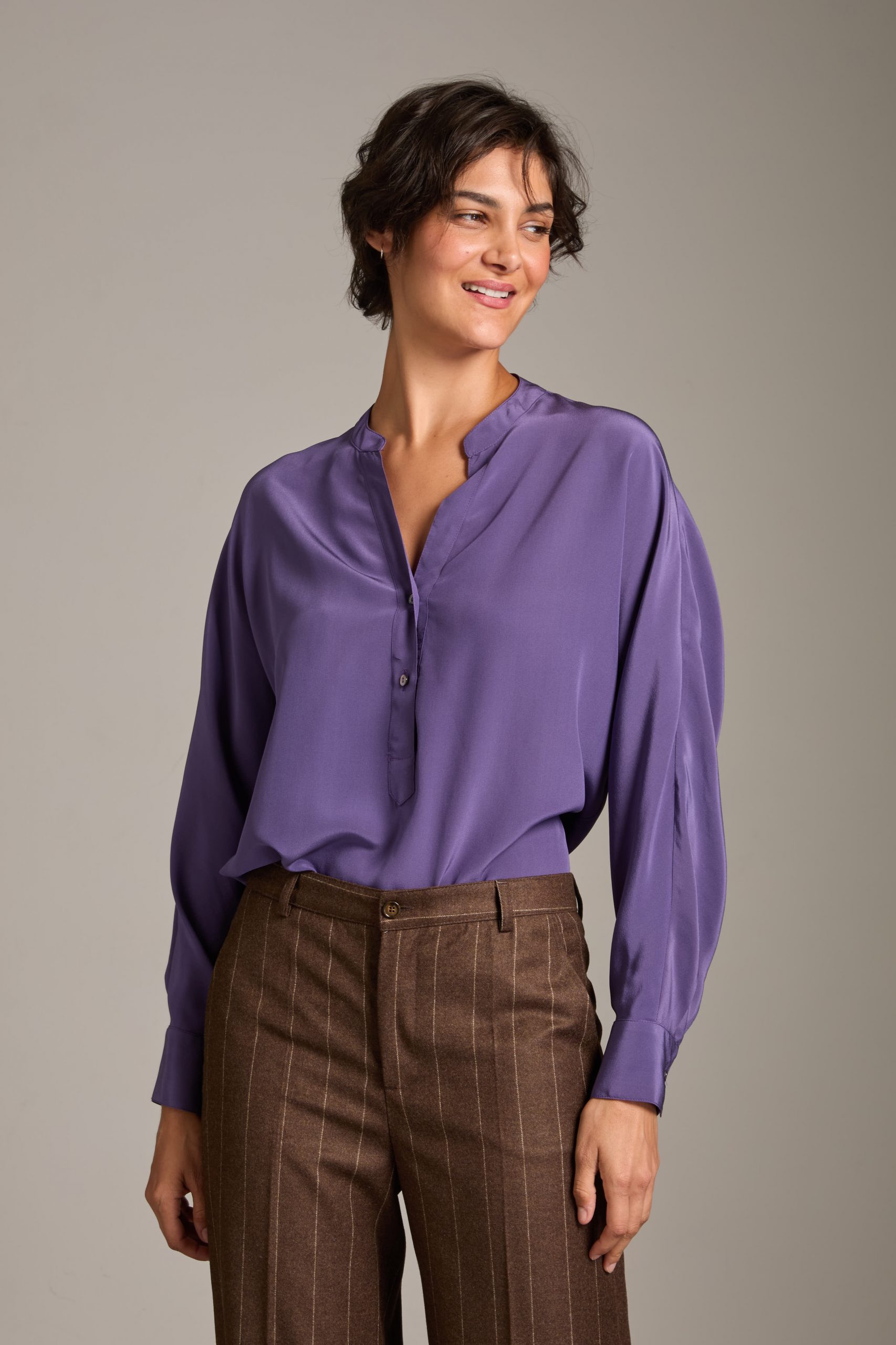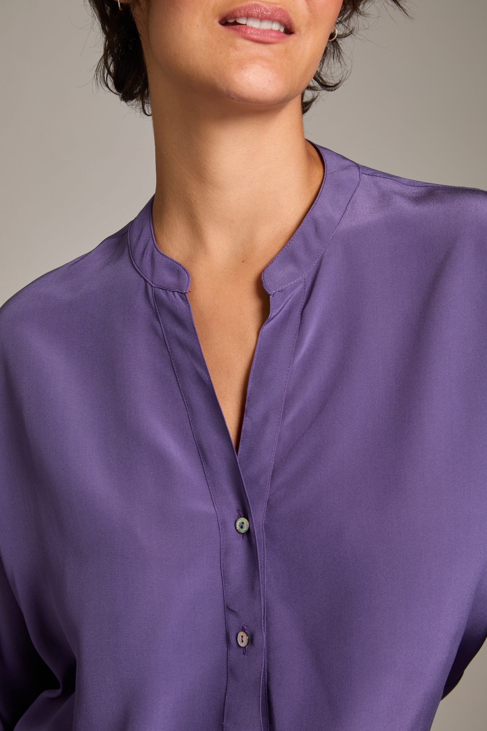 Camicia Marta di Carla Saibene in seta crepe de chine violetto, manica a pipistrello dalla silhouette morbida.