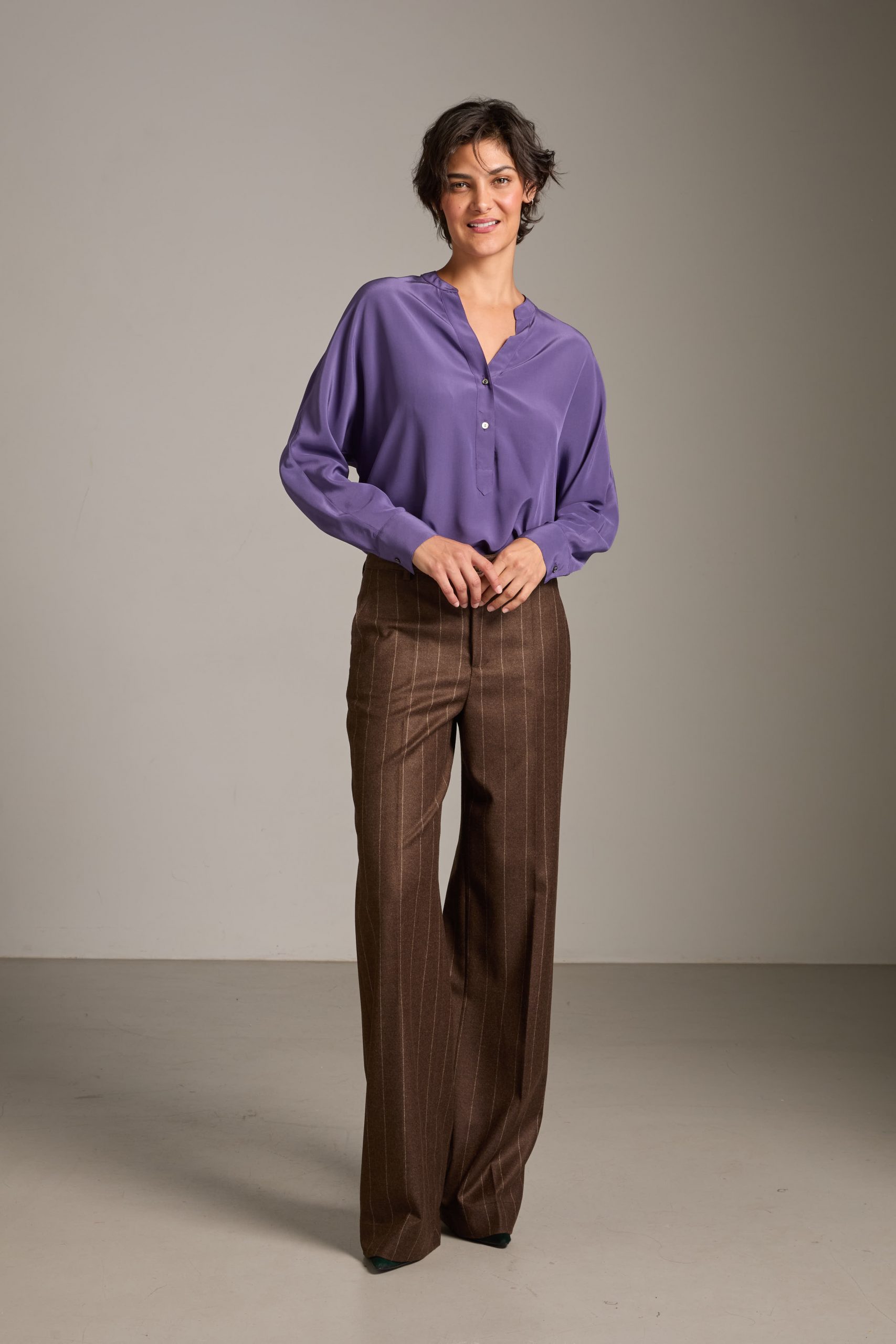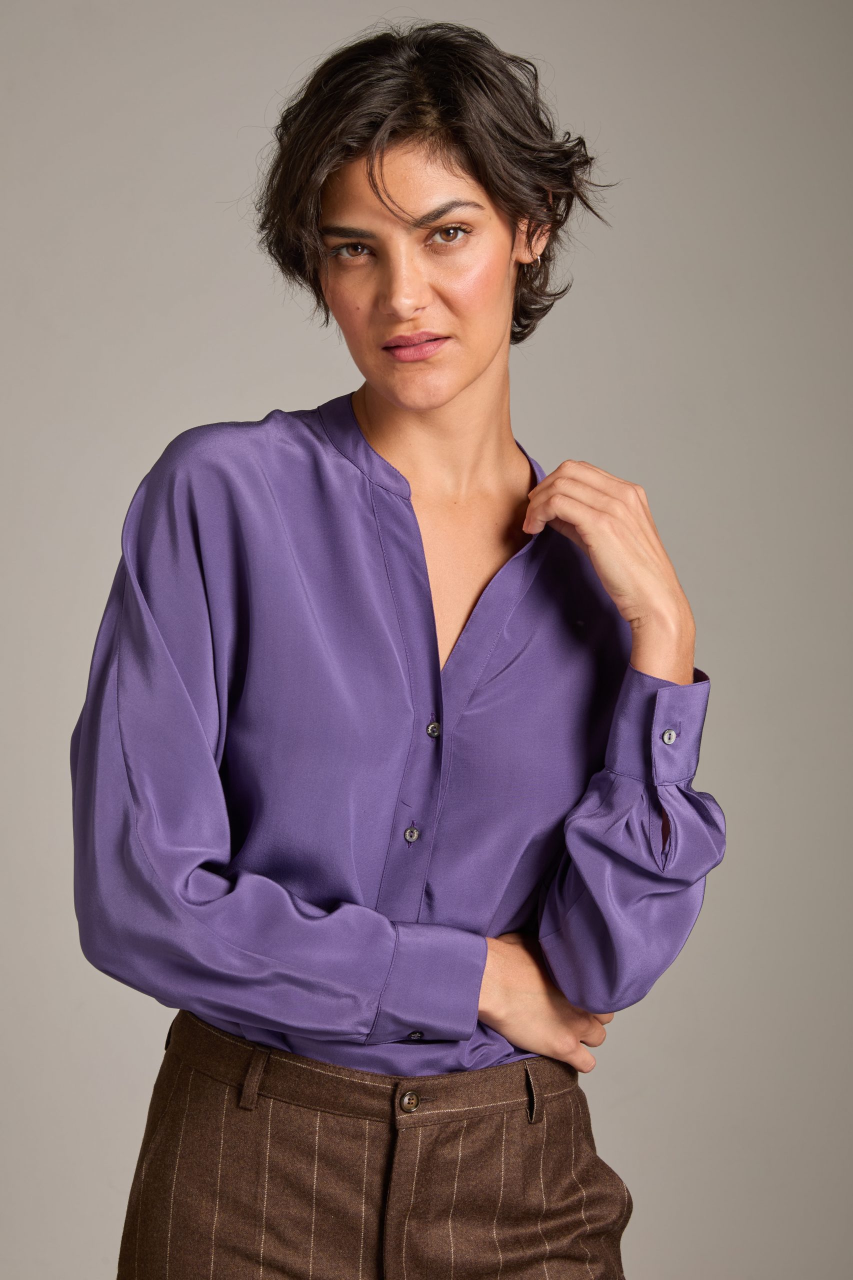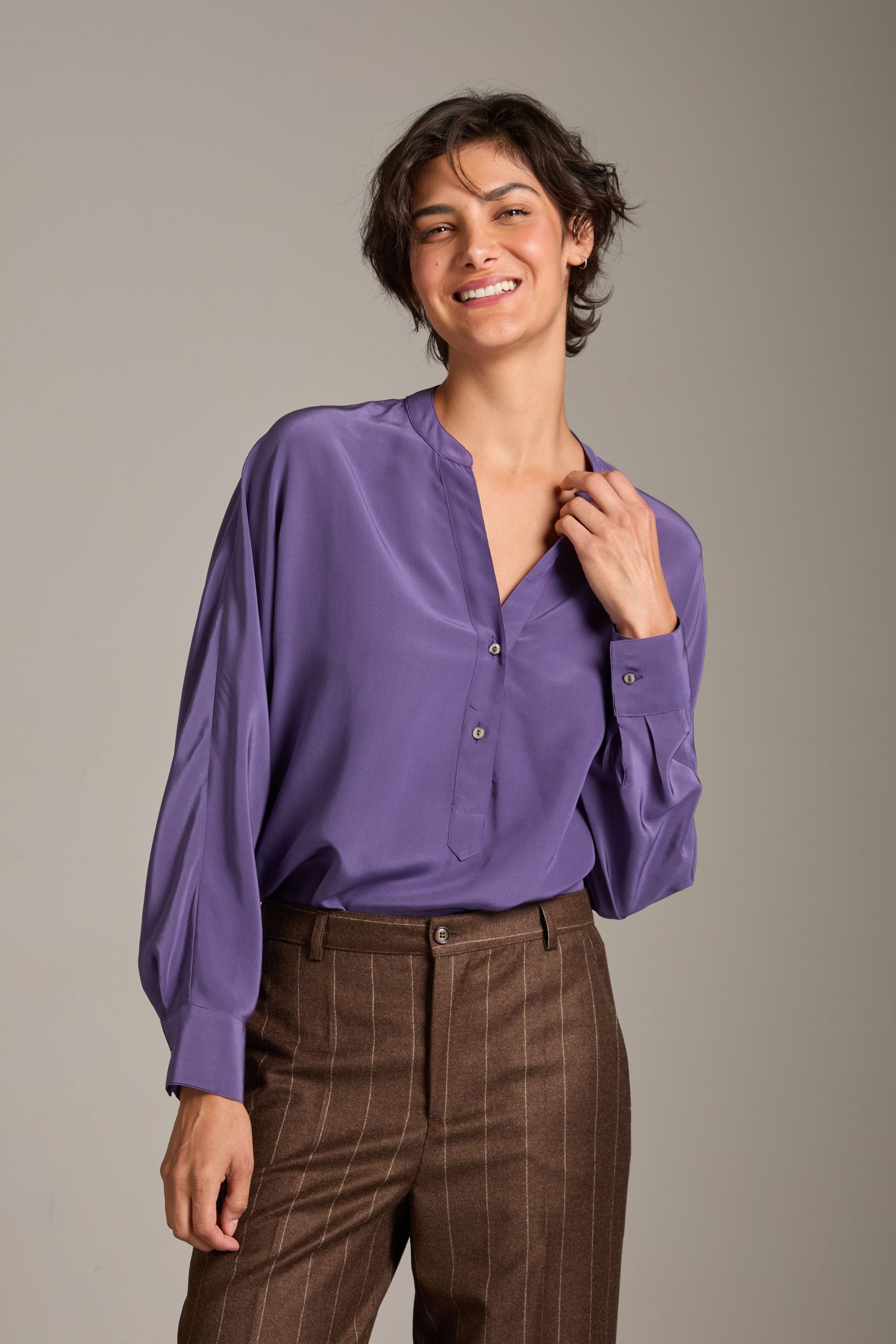 Camicia Marta di Carla Saibene in seta crepe de chine violetto, manica a pipistrello dalla silhouette morbida.