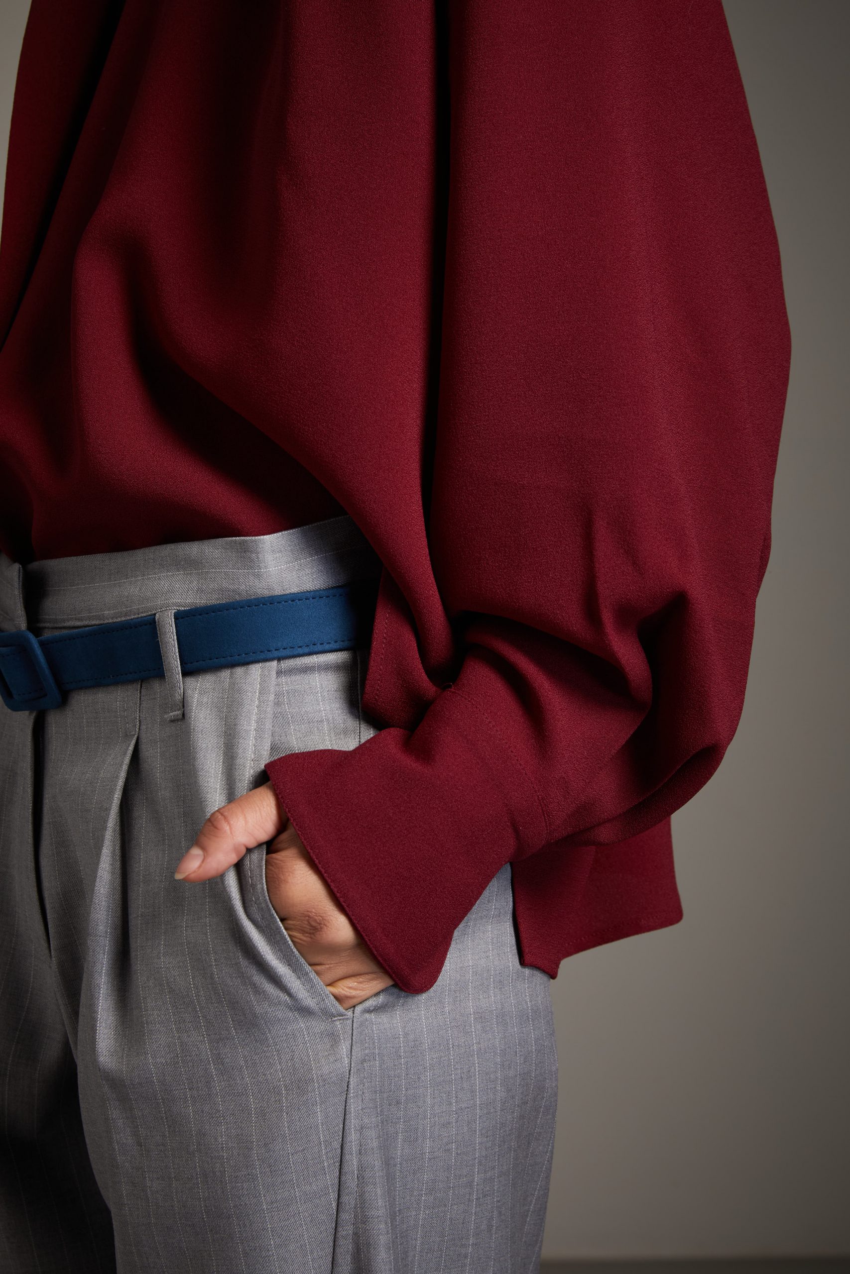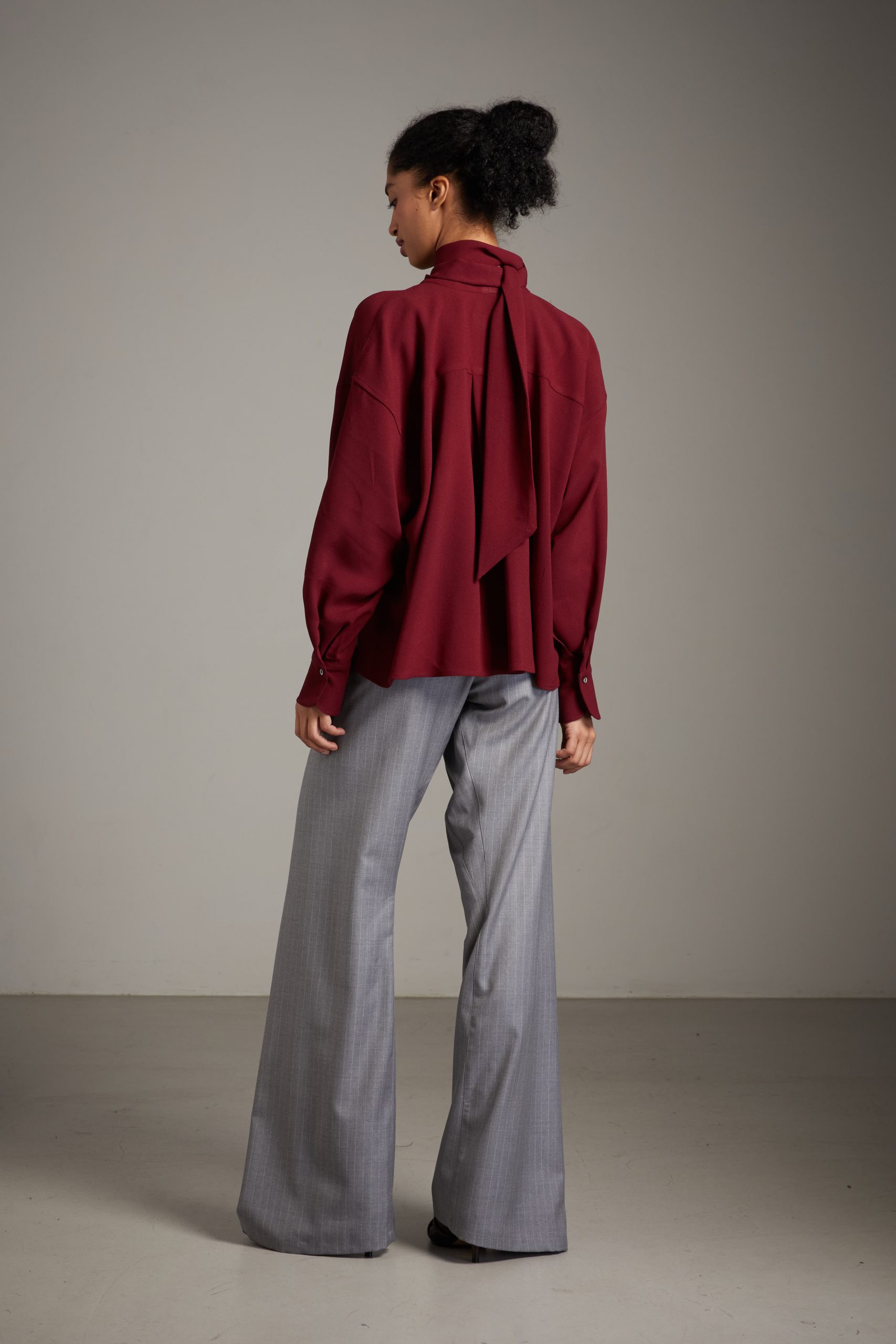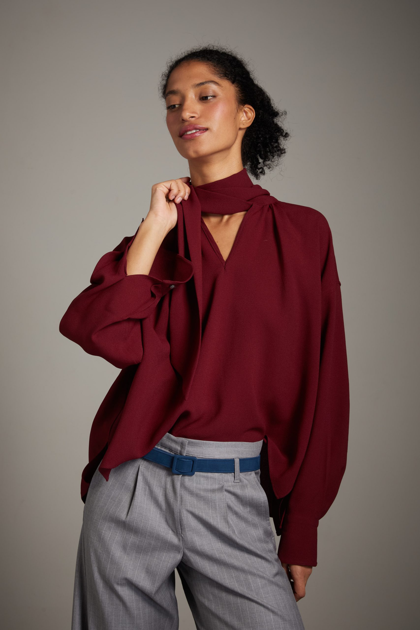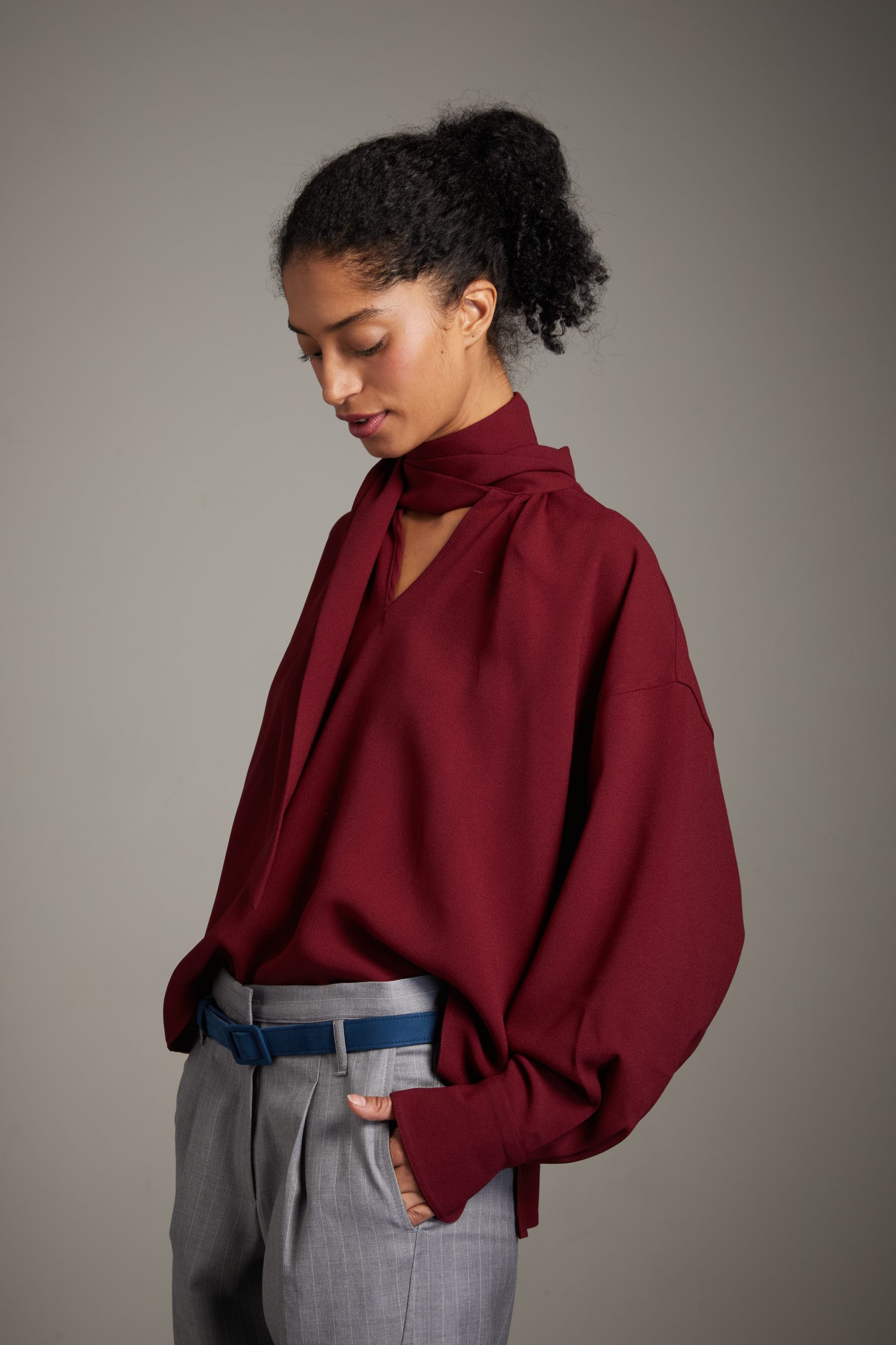 Camicia Uma di Carla Saibene, over, in crepe di lana e seta bordeaux, maniche lunghe, collo a cravatta da annodare, scollo a v con leggera arricciatura ai lati.
