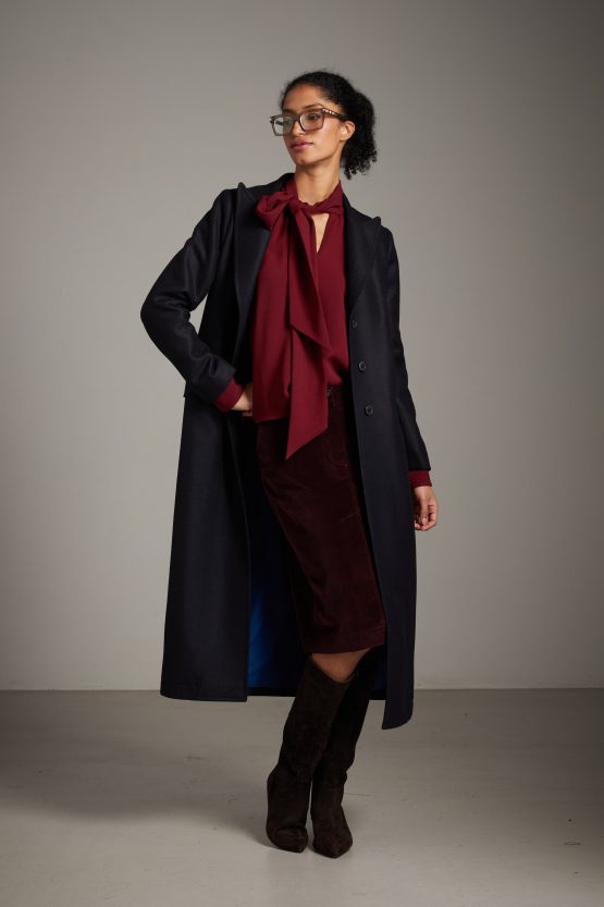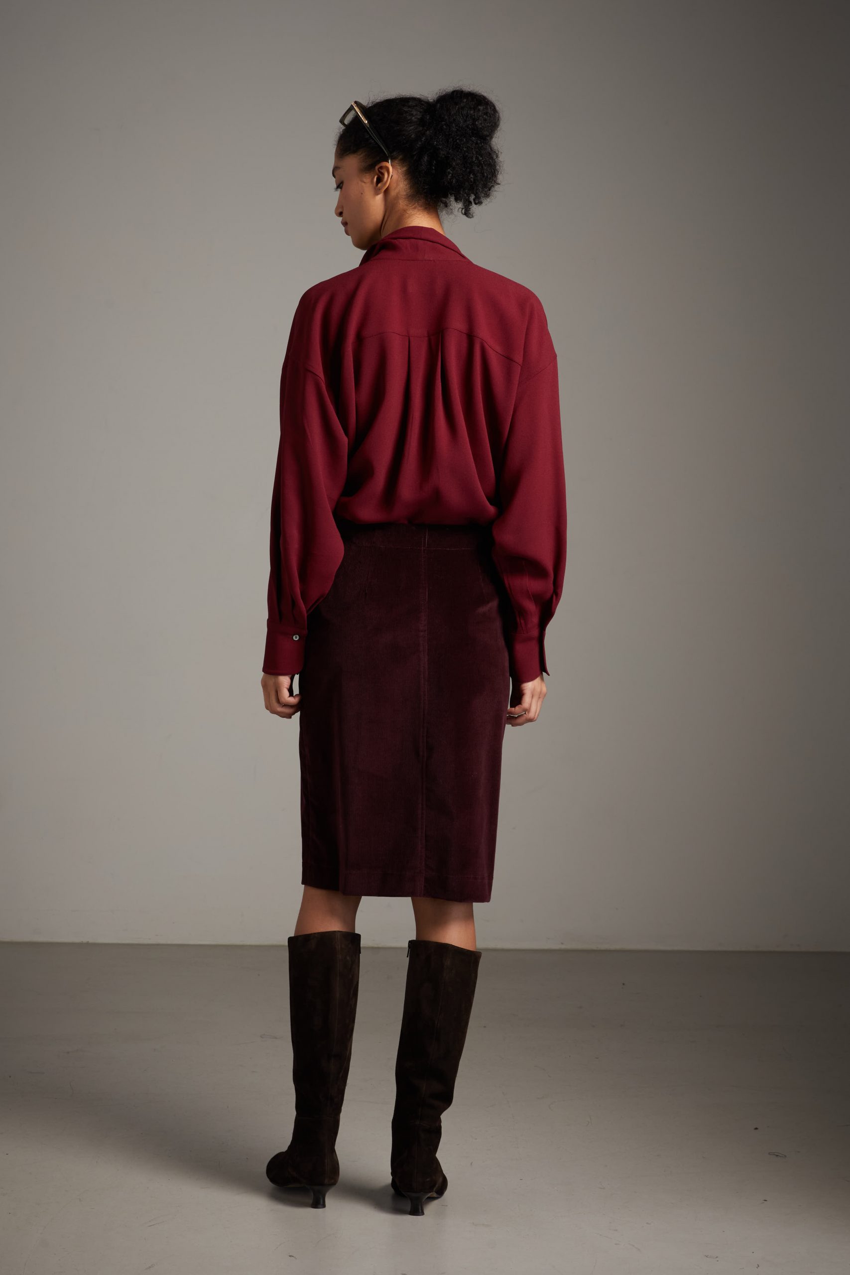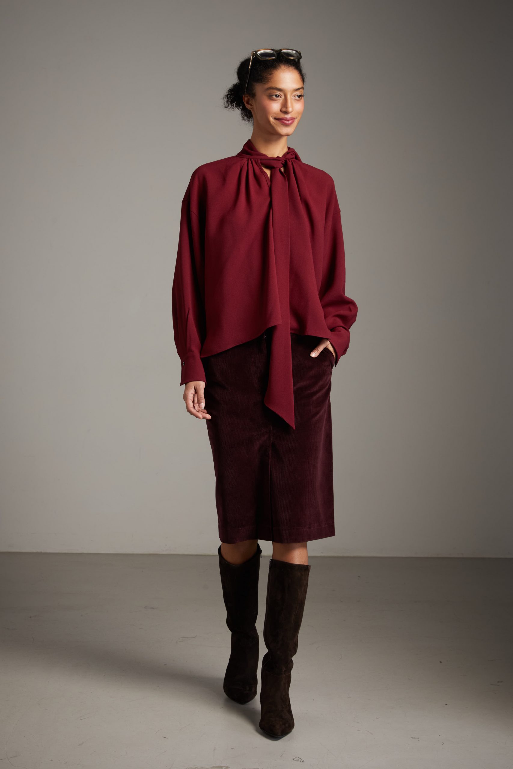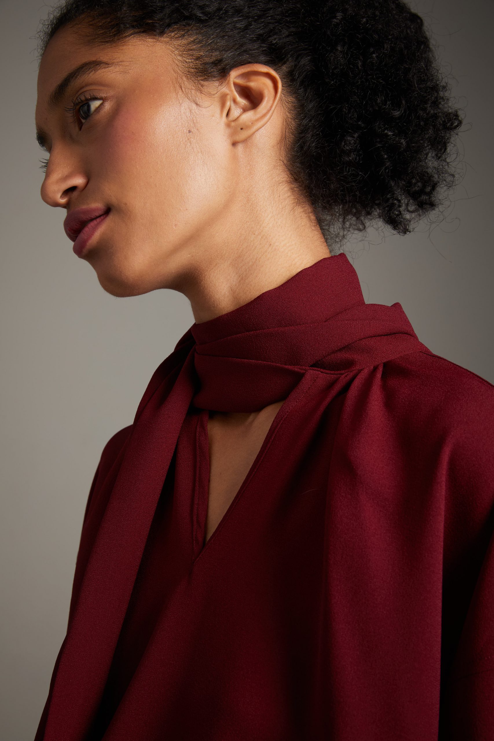Camicia Uma di Carla Saibene, over, in crepe di lana e seta bordeaux, maniche lunghe, collo a cravatta da annodare, scollo a v con leggera arricciatura ai lati.
