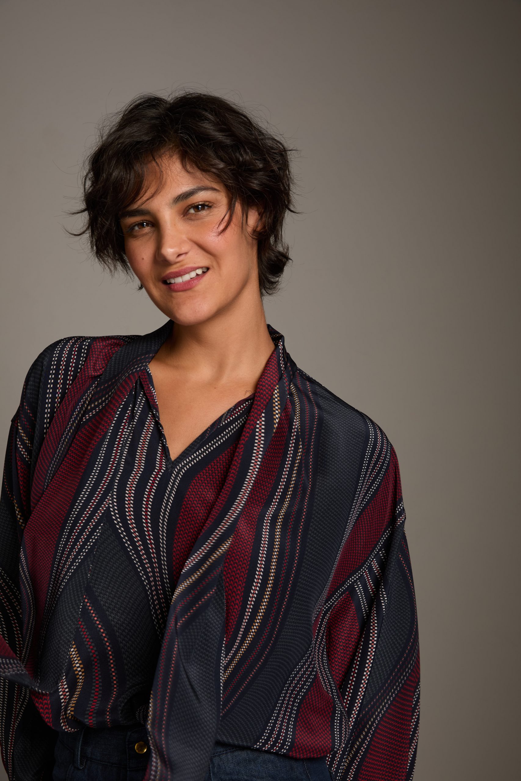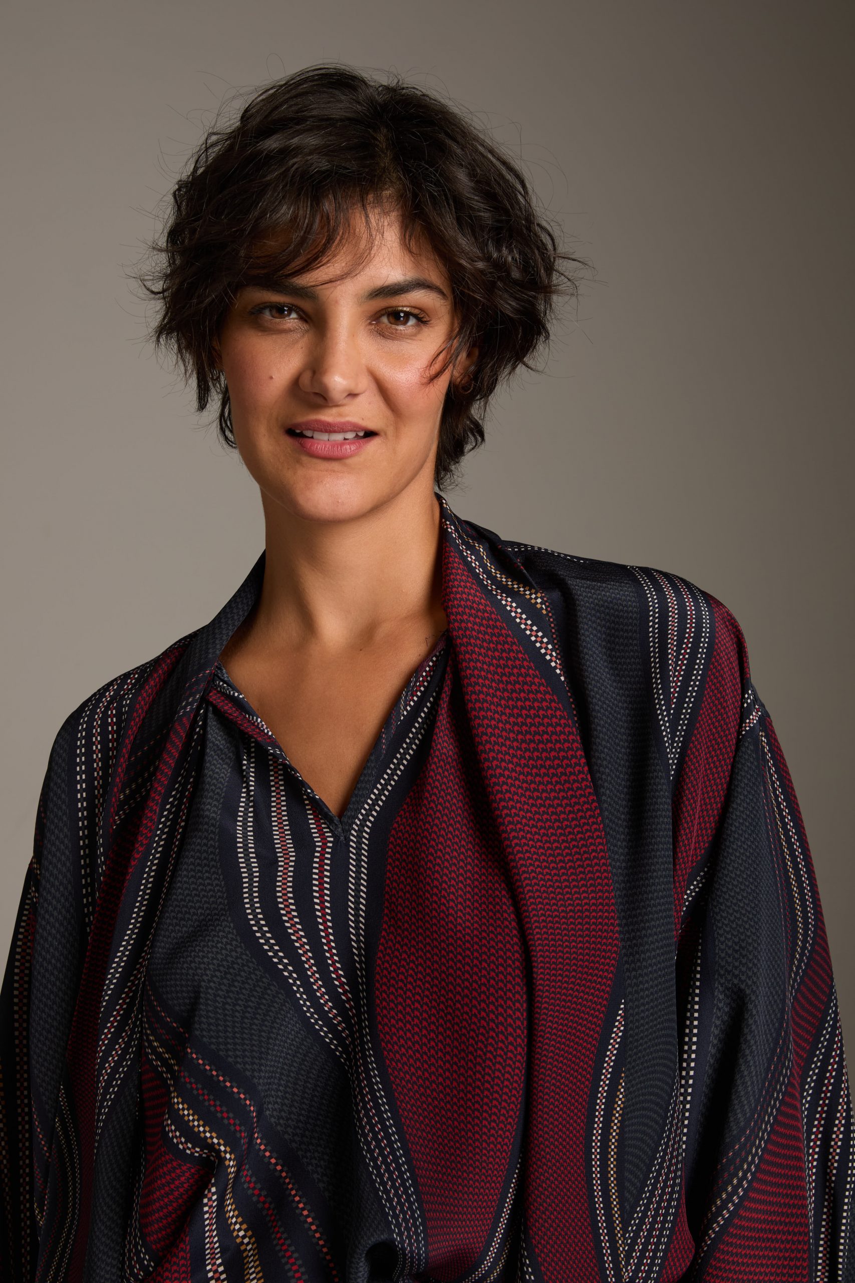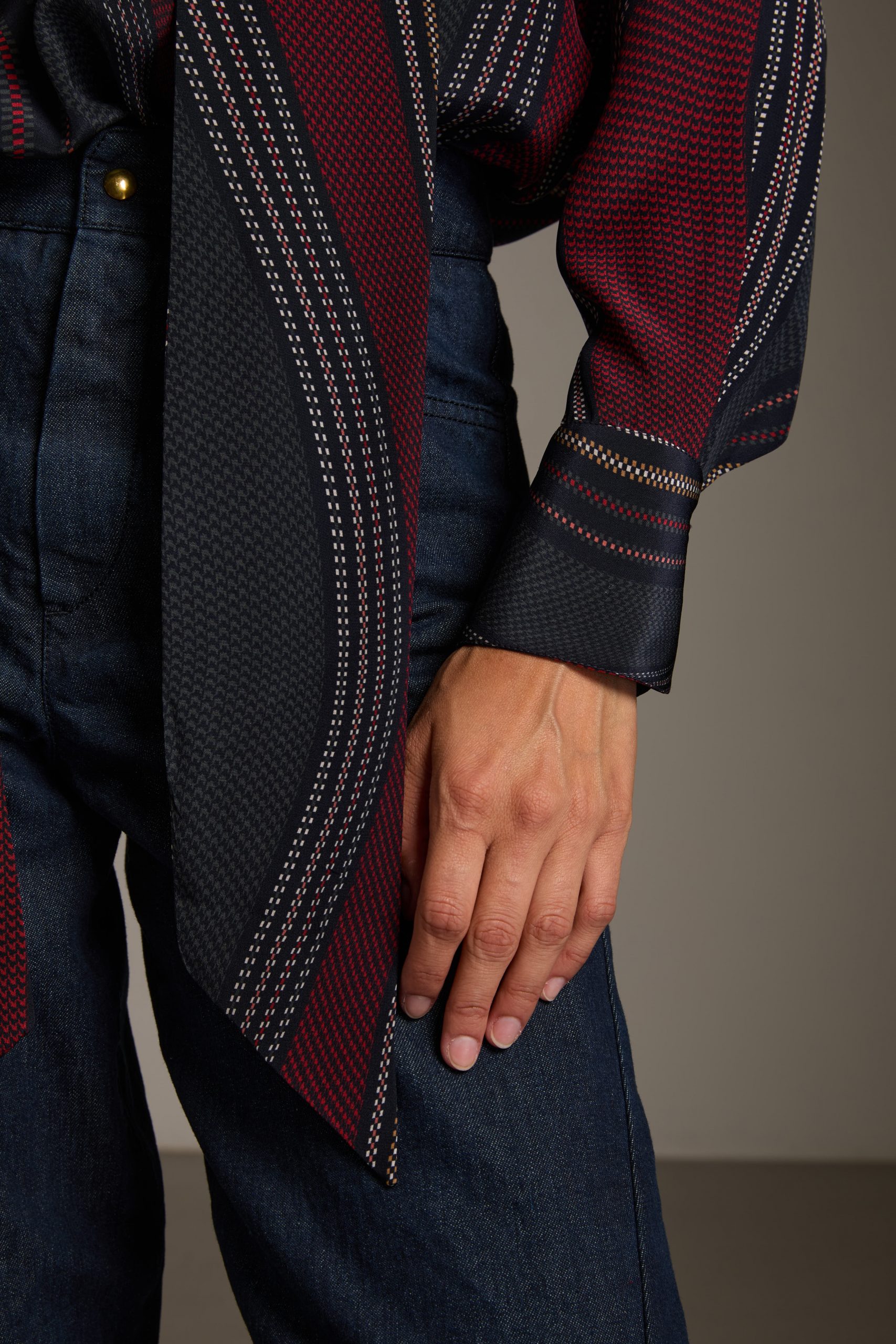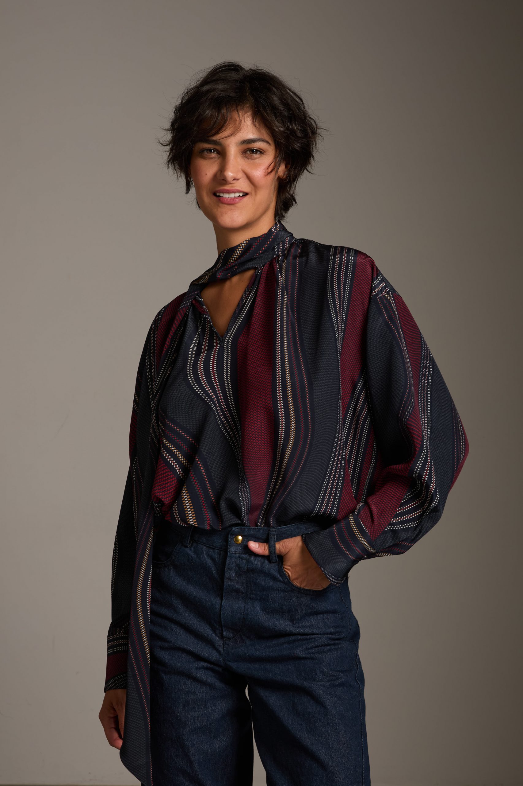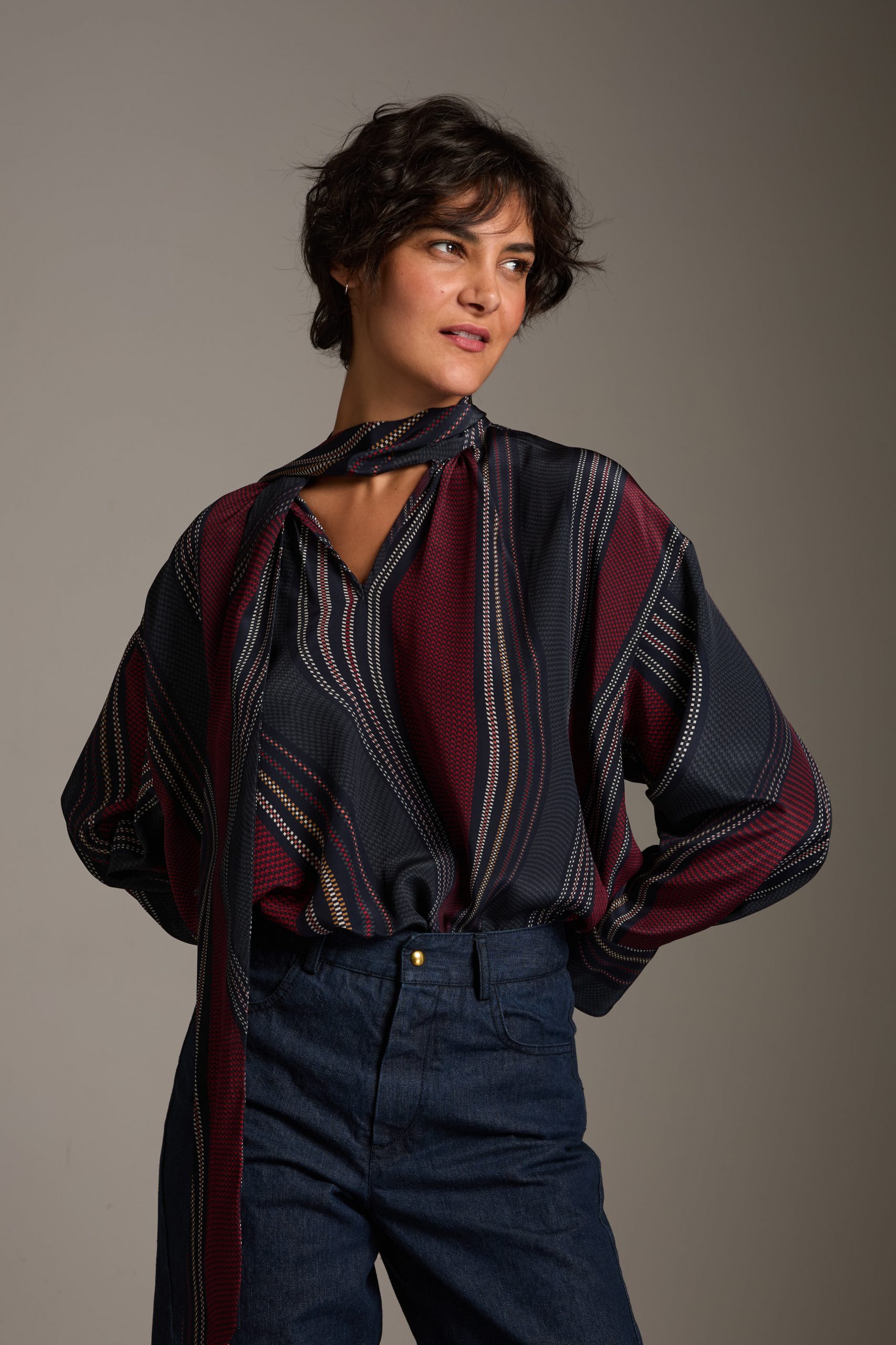 Camicia Uma di Carla Saibene, over, in seta crepe de chine stampa blu bianco e bordeaux, maniche lunghe, collo a cravatta da annodare, scollo a v con leggera arricciatura ai lati.