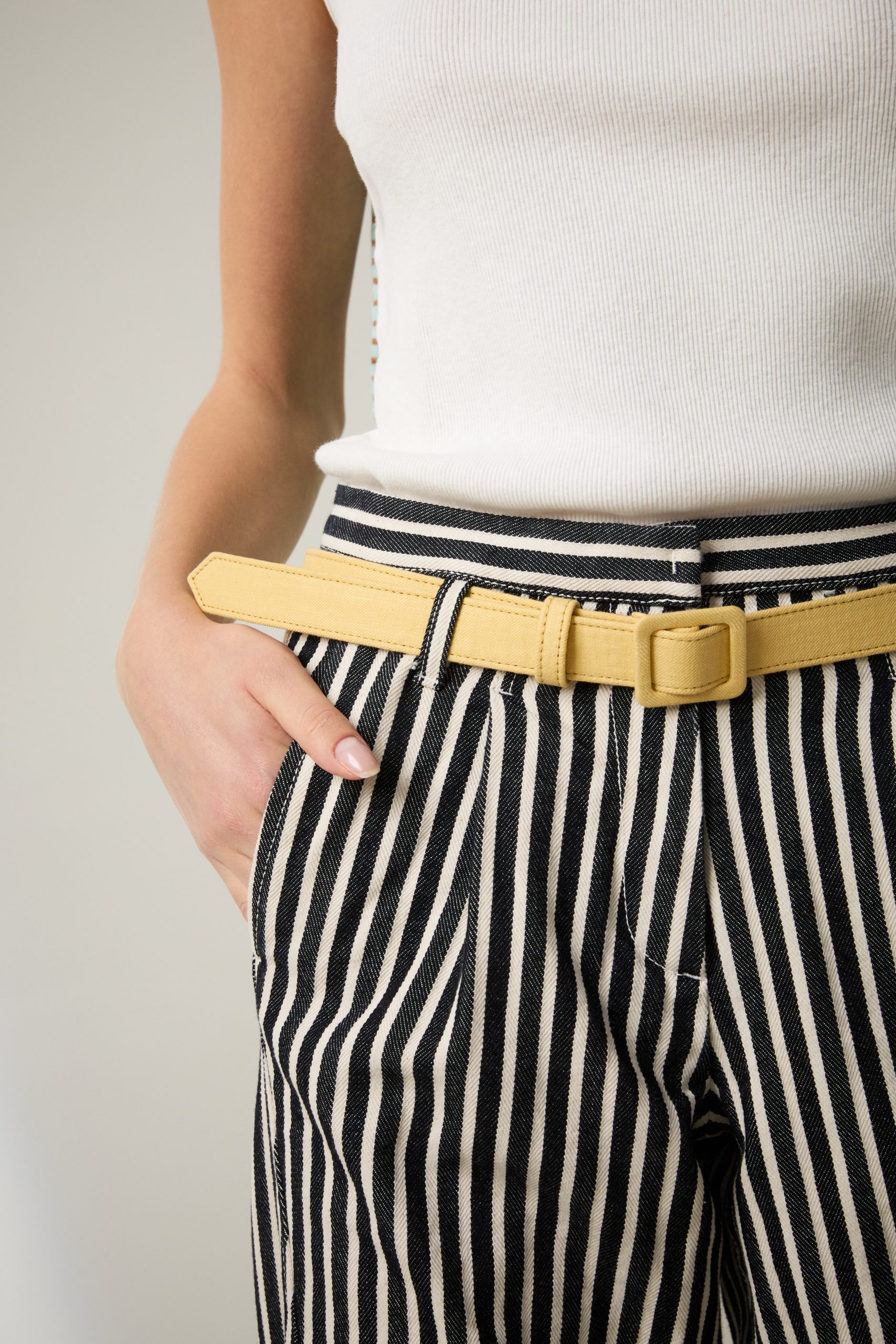 Cintura in pelle rivestita in lino giallo chiaro con fibbia rettangolare e passante di Carla Saibene. E’ regolabile a piacere, adatta sia su abiti e gonne che su un paio di pantaloni.