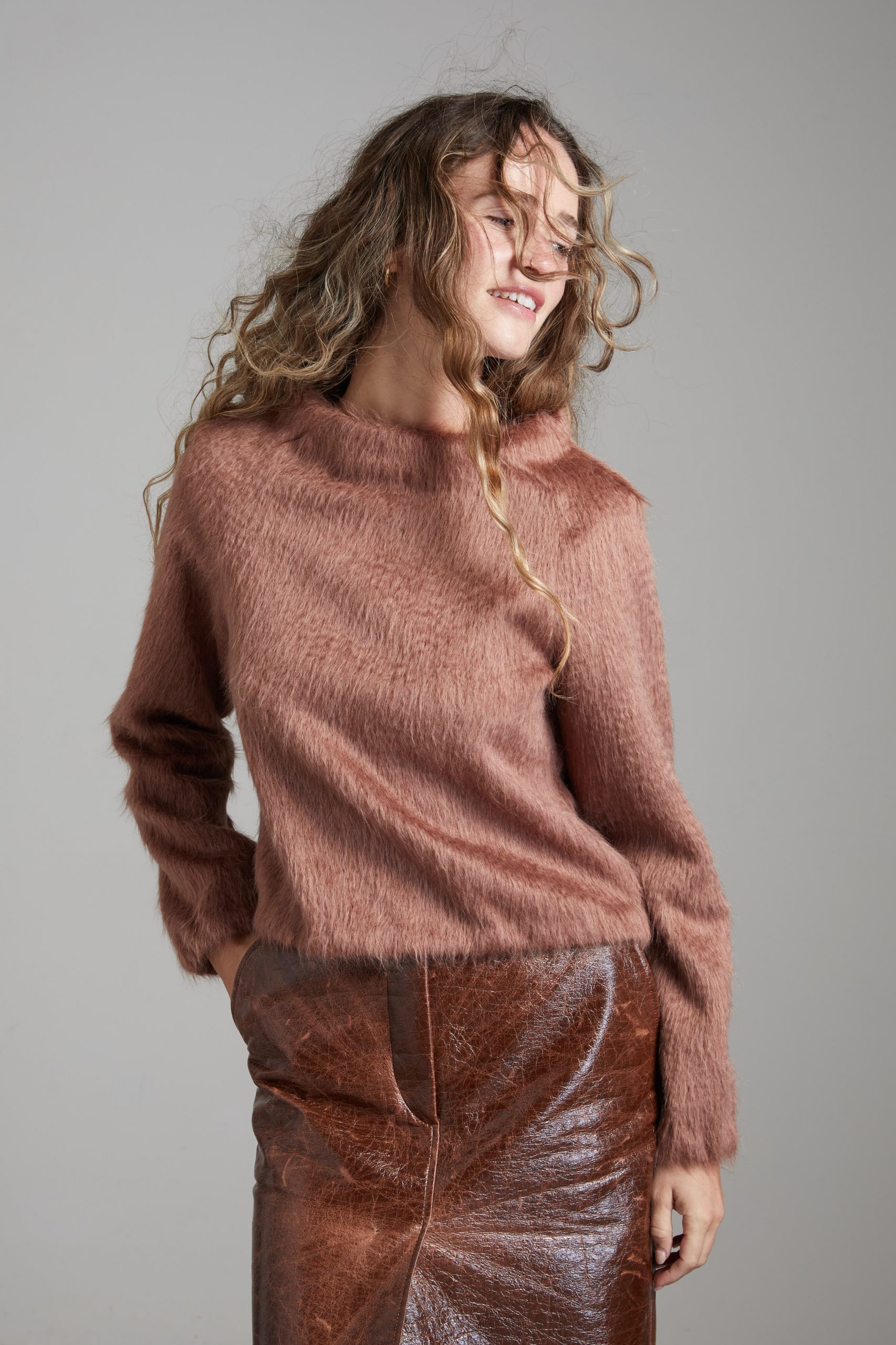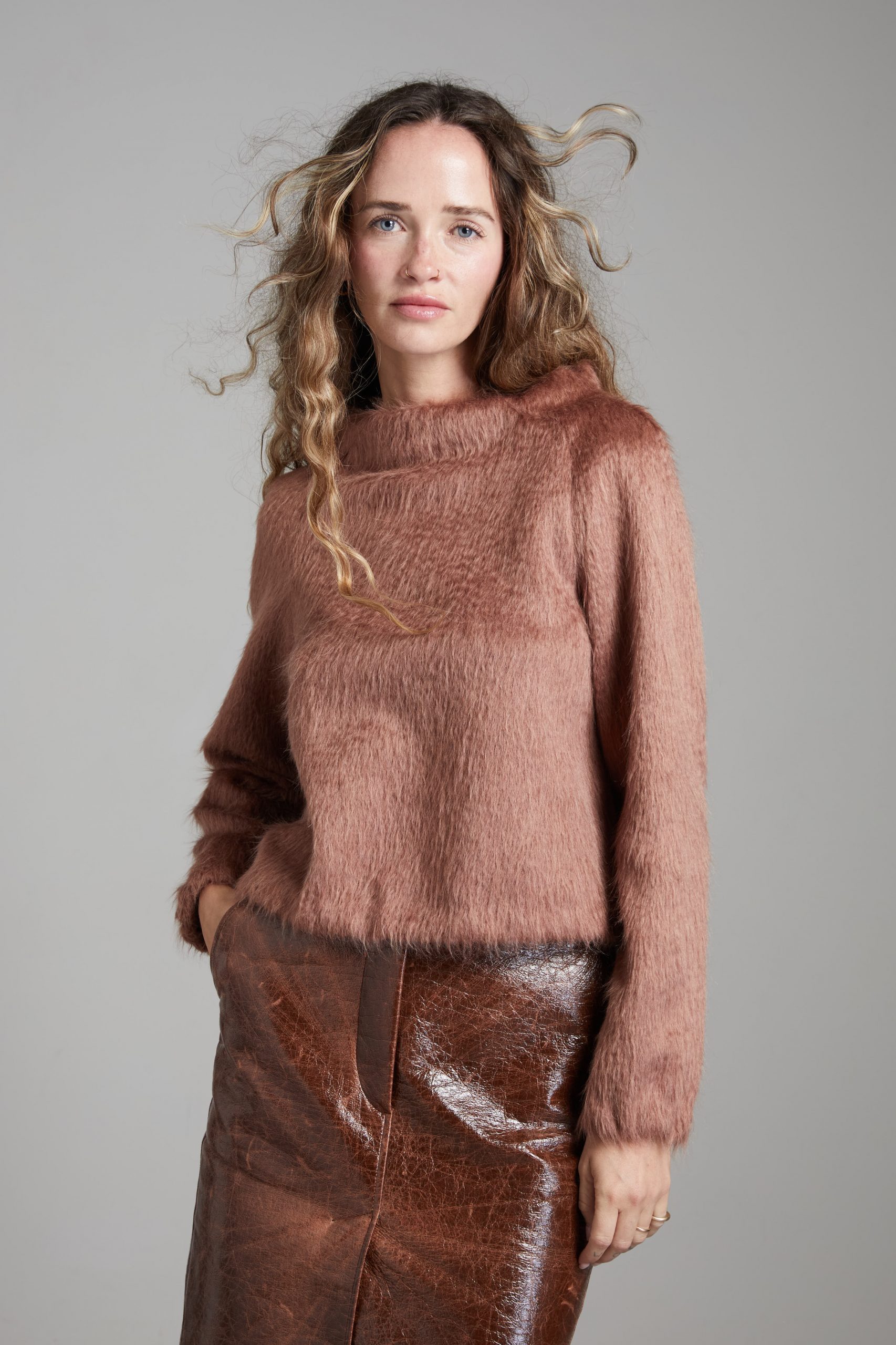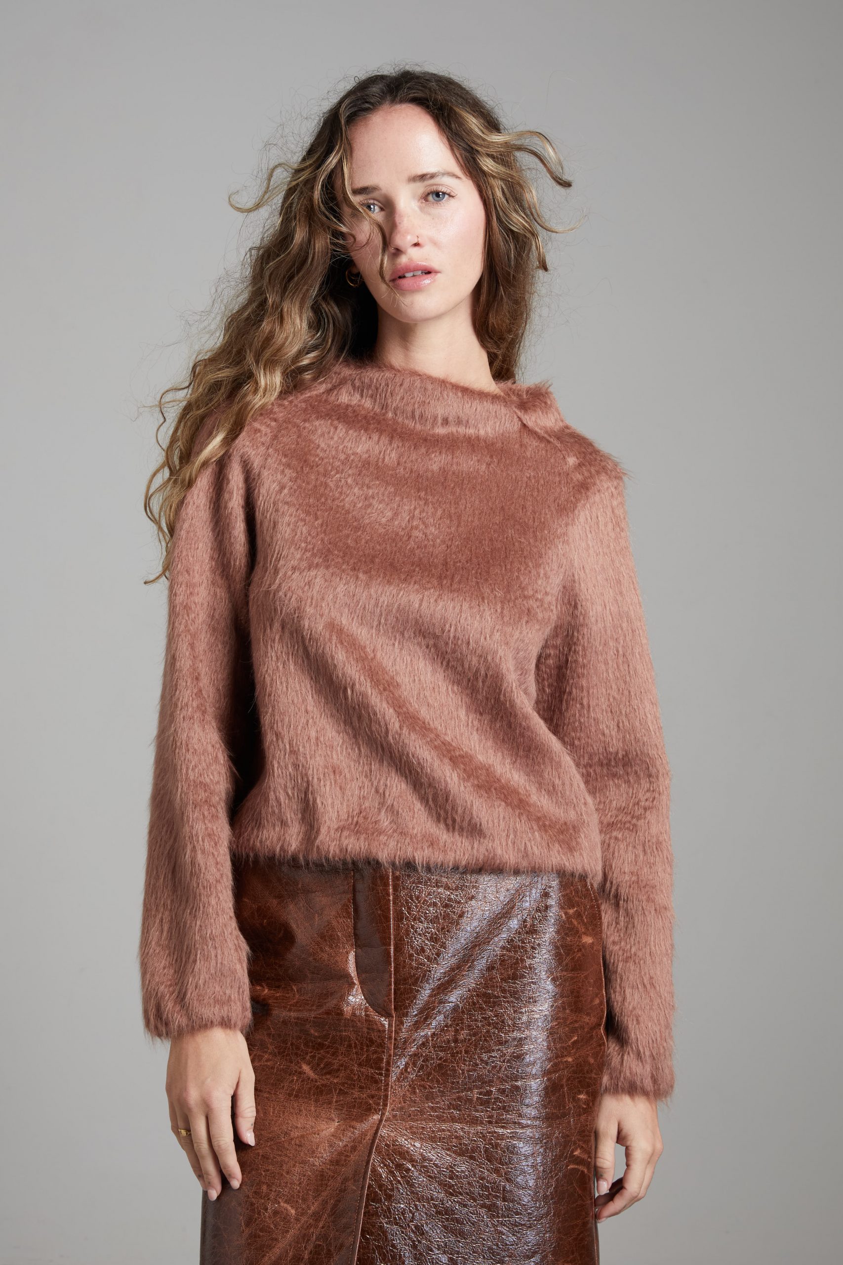 Felpa Grace di Carla Saibene, un nuovo modello con linea dritta e corta, collo a cratere, in alpaca rosa cipria.