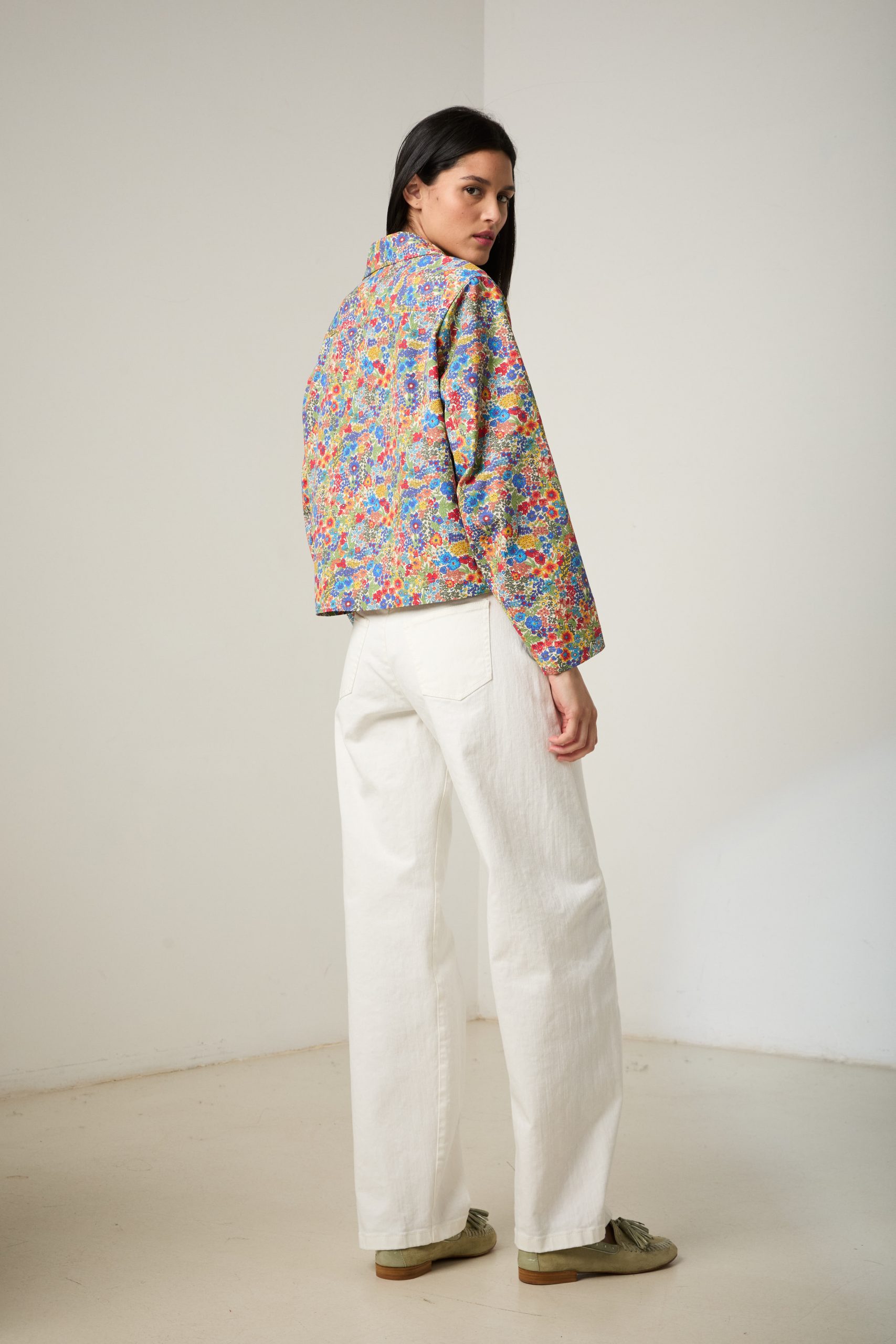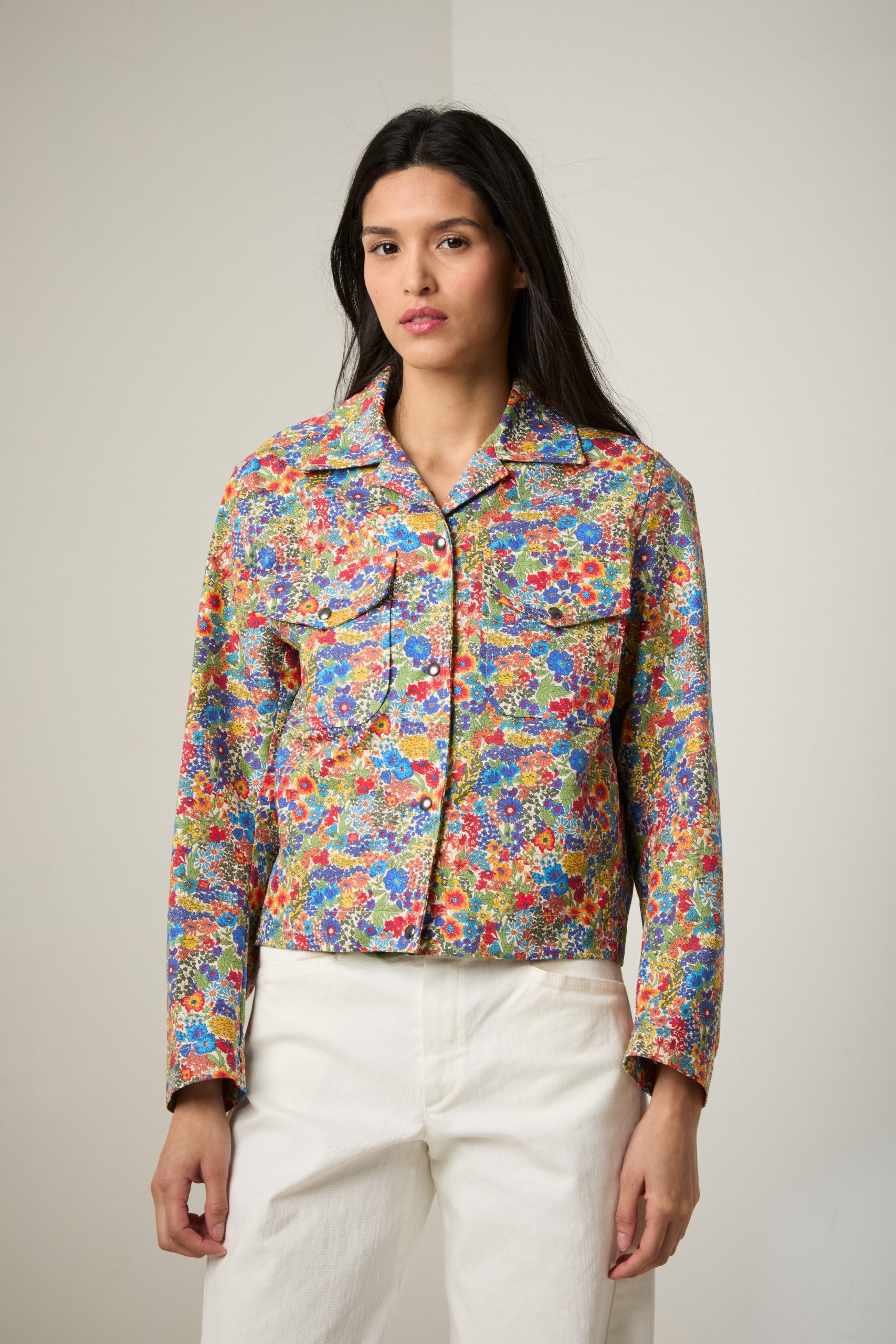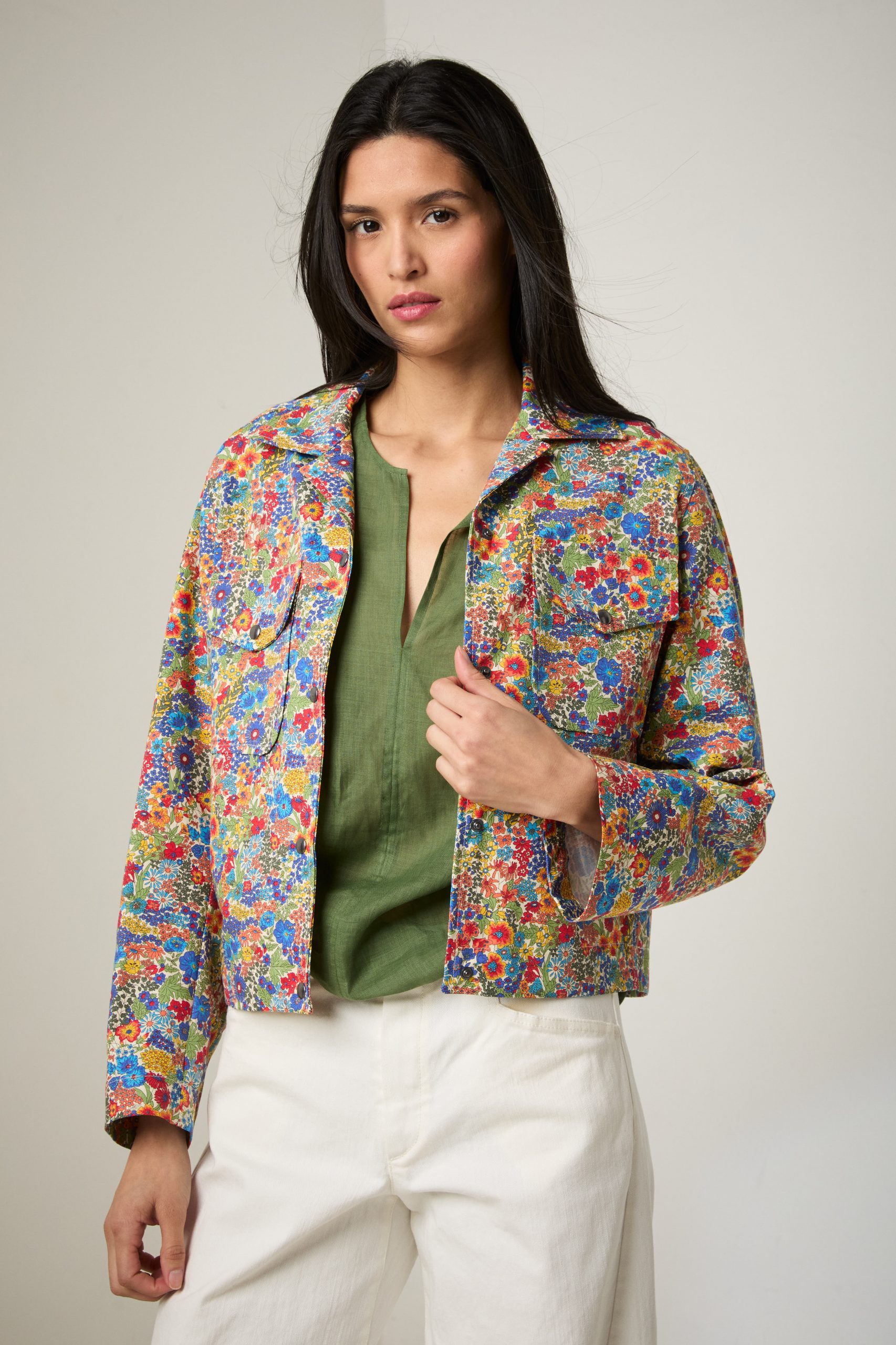 Giacca Carrie in cotone a fiori multicolor Liberty di Carla Saibene, una rivisitazione in chiave femminile della giacca da lavoro, con colletto, maniche ampie dalla forma anatomica, taschini applicati con aletta e tasche a scomparsa nel fianco.