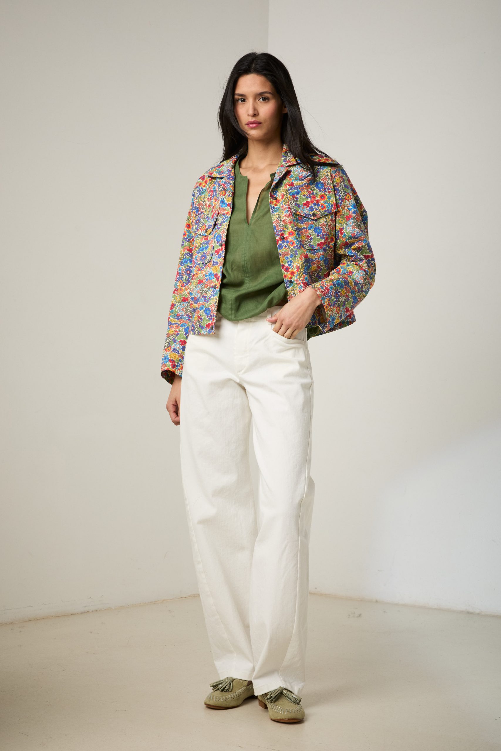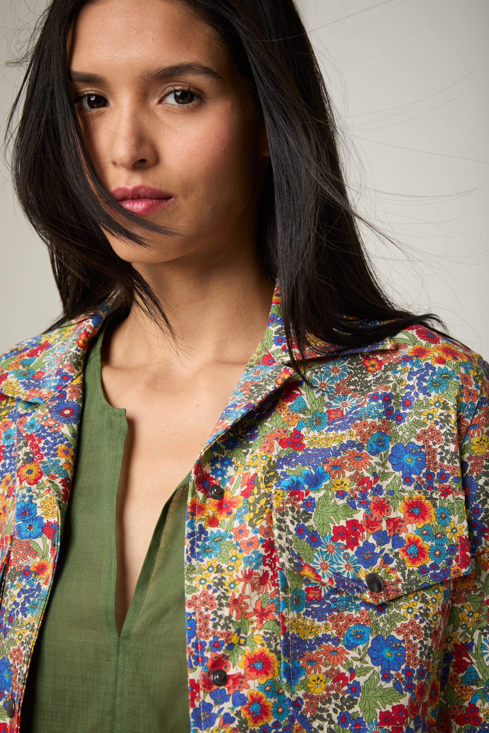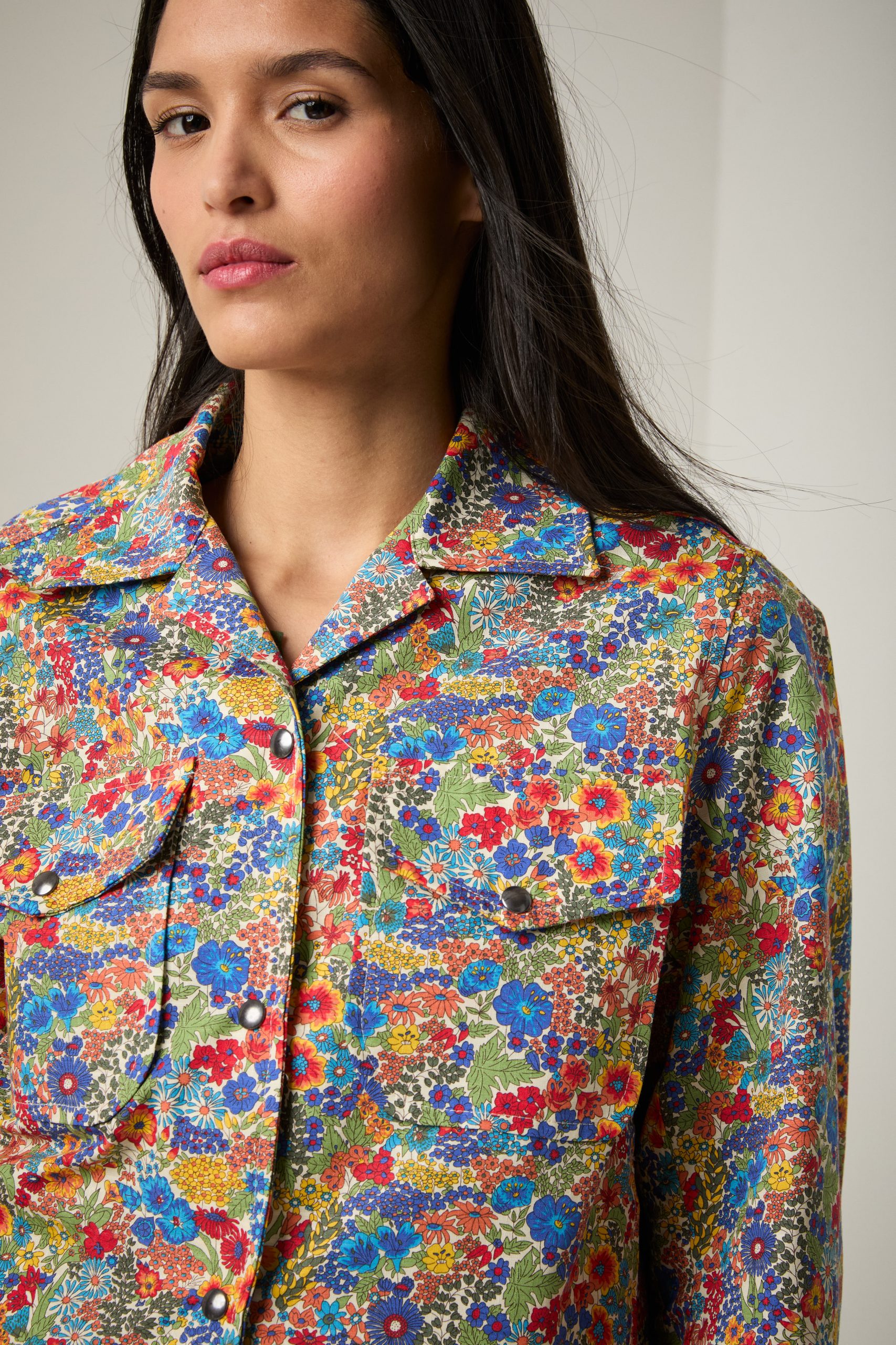 Giacca Carrie in cotone a fiori multicolor Liberty di Carla Saibene, una rivisitazione in chiave femminile della giacca da lavoro, con colletto, maniche ampie dalla forma anatomica, taschini applicati con aletta e tasche a scomparsa nel fianco.