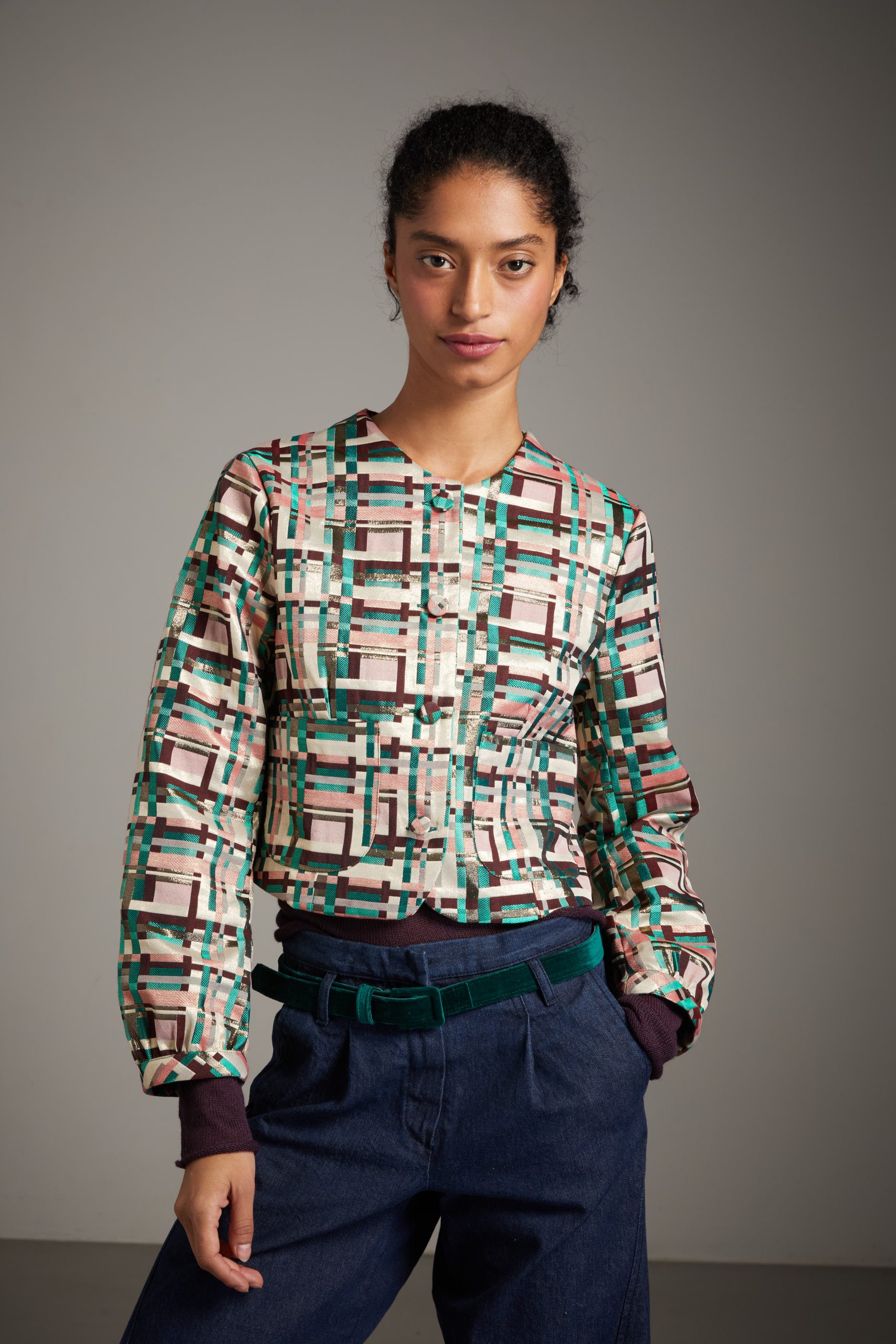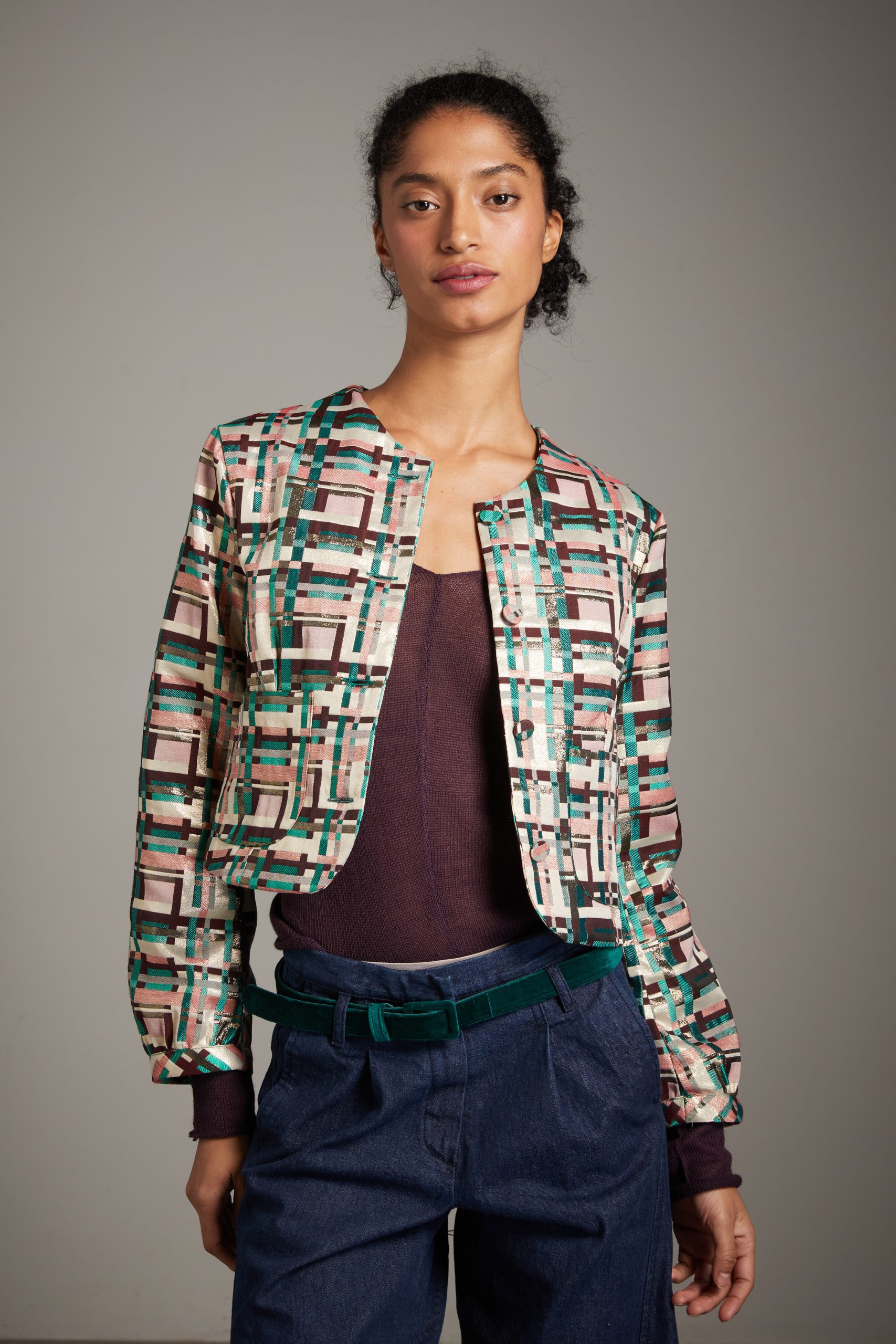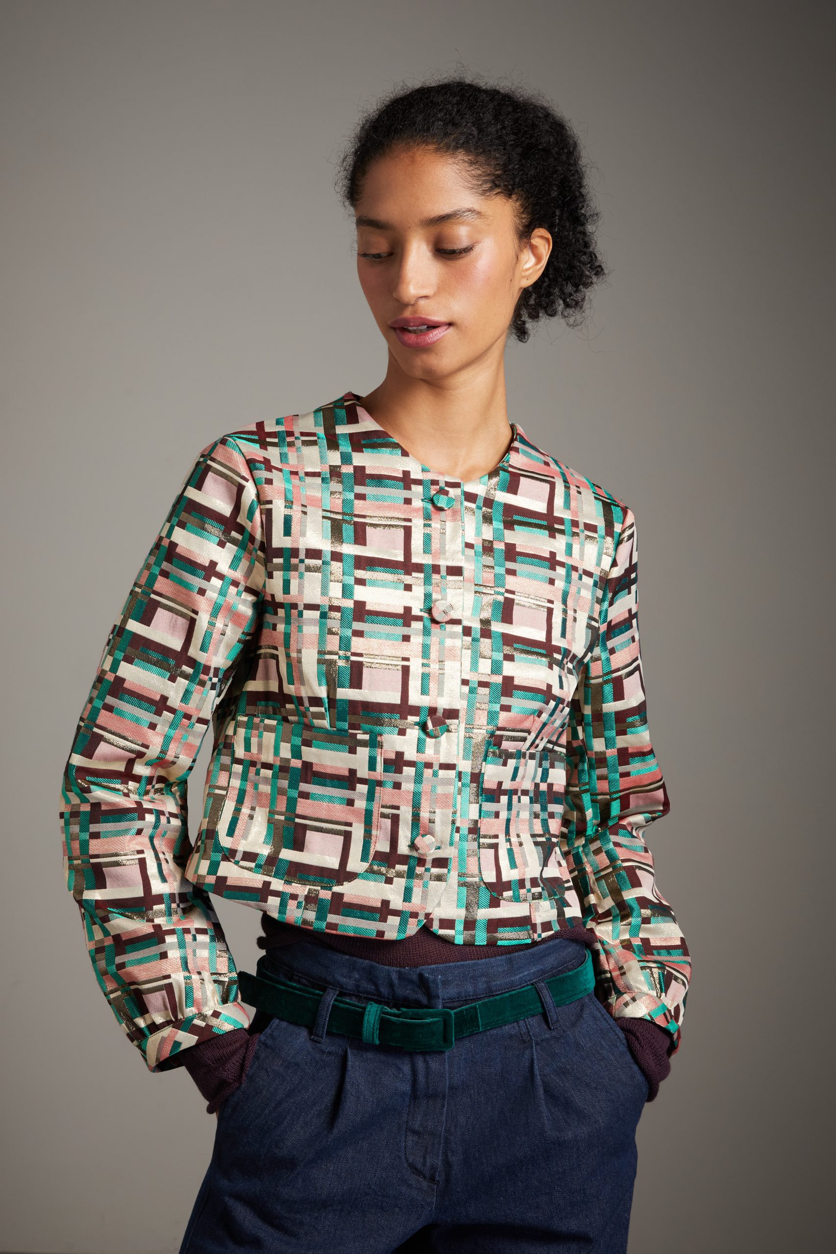 Giacca Clio di Carla Saibene, dal taglio dritto e corto con taschine applicate e maniche arricciate in lurex jacquardoro.verede e bordeaux.