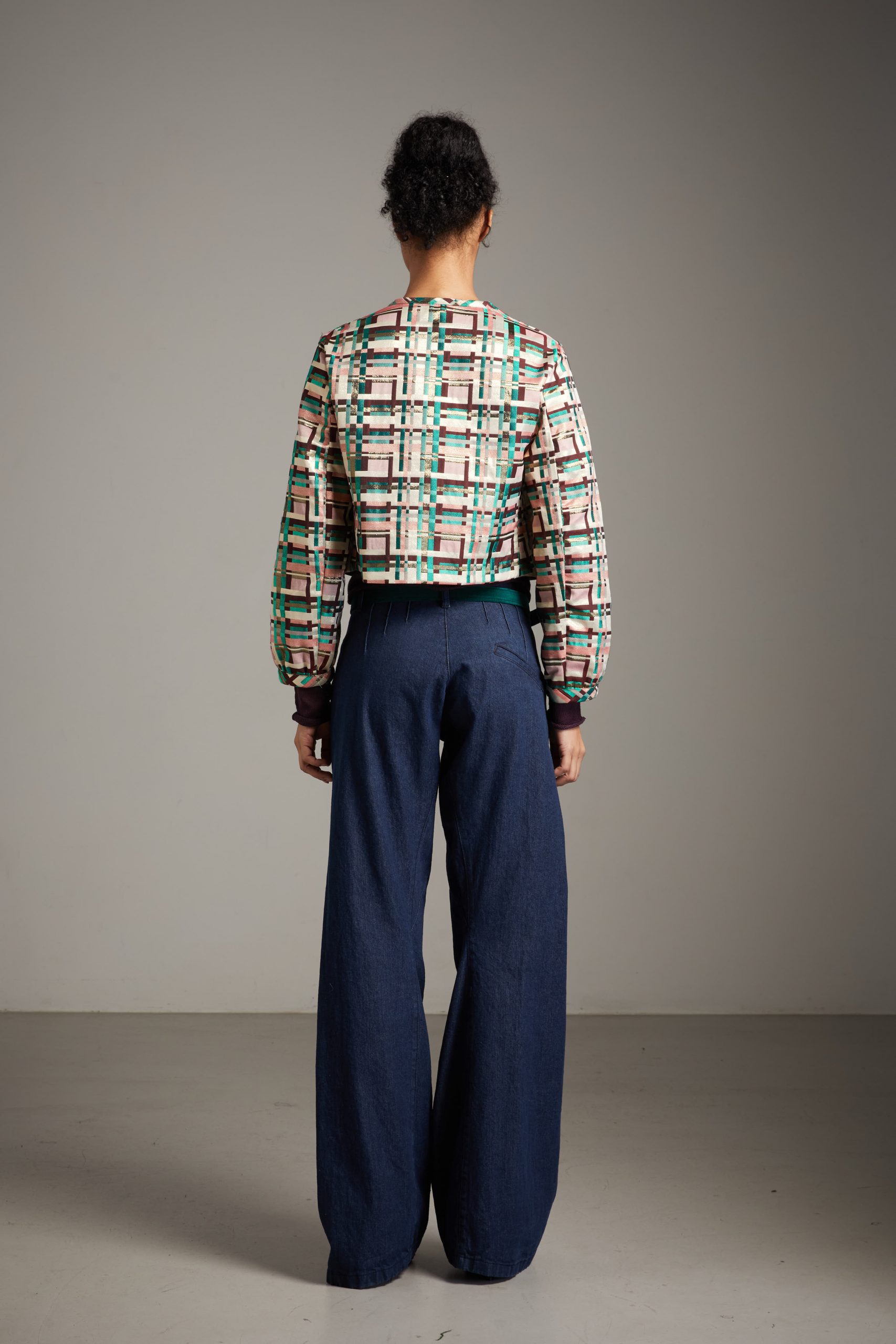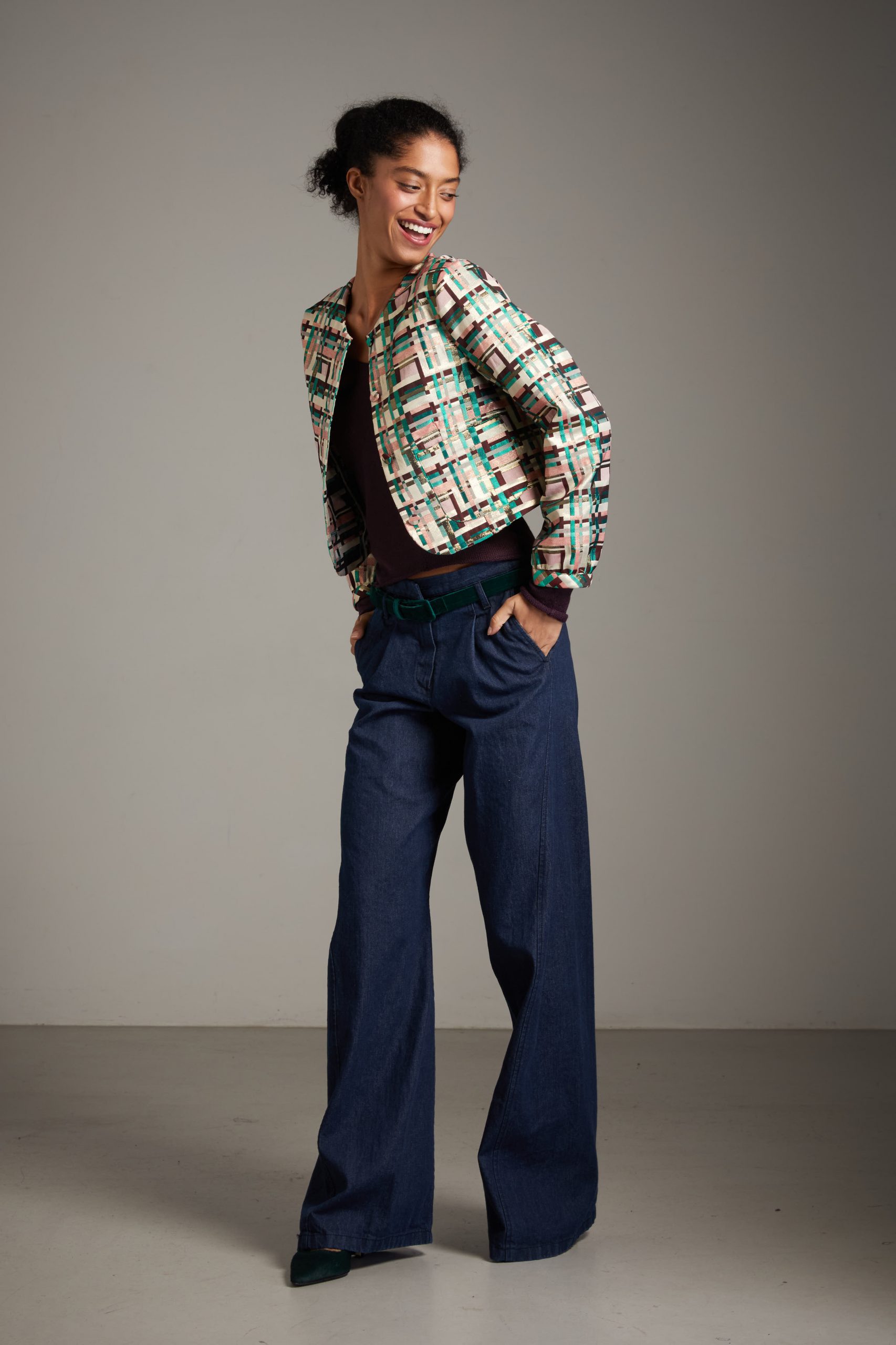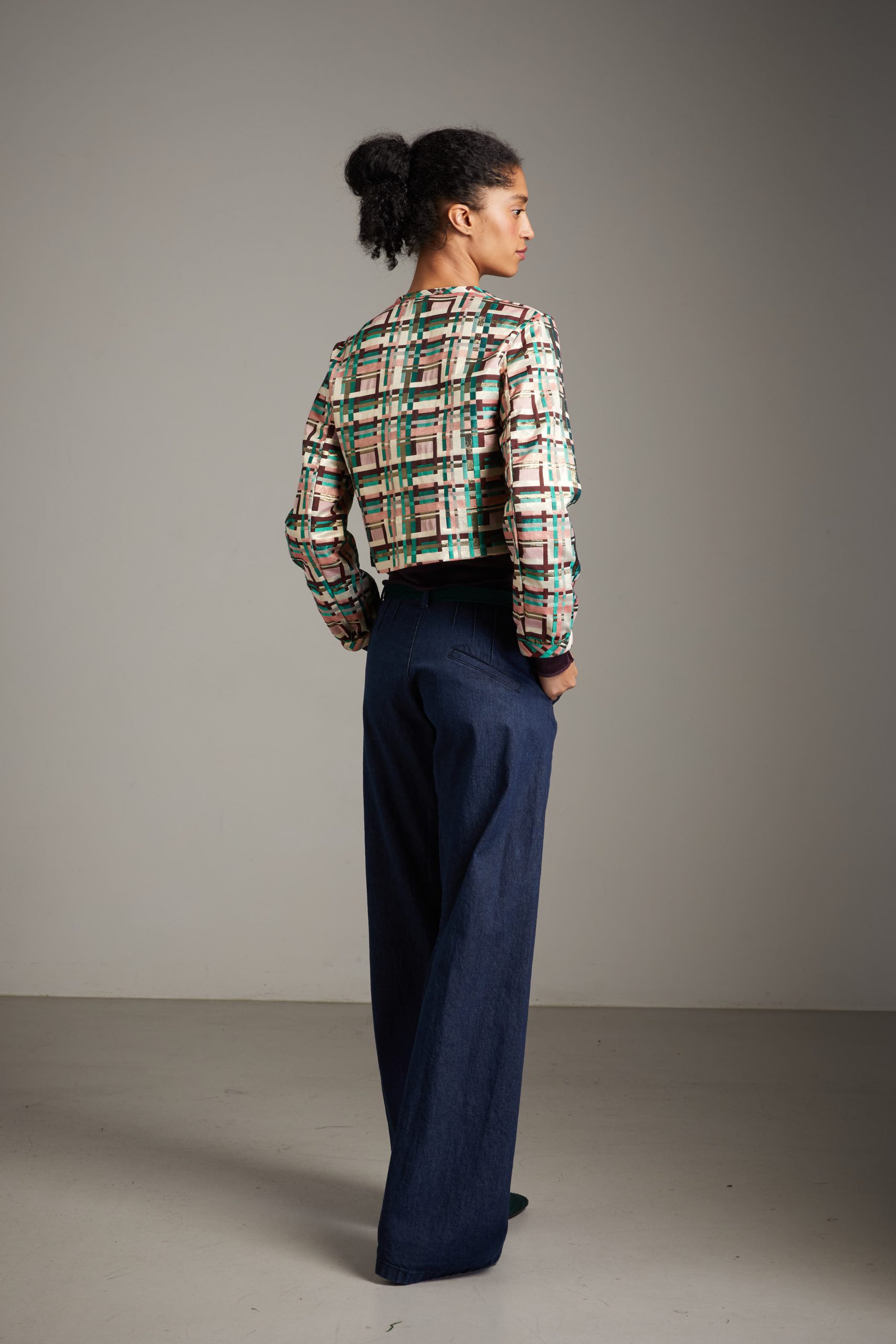 Giacca Clio di Carla Saibene, dal taglio dritto e corto con taschine applicate e maniche arricciate in lurex jacquardoro.verede e bordeaux.