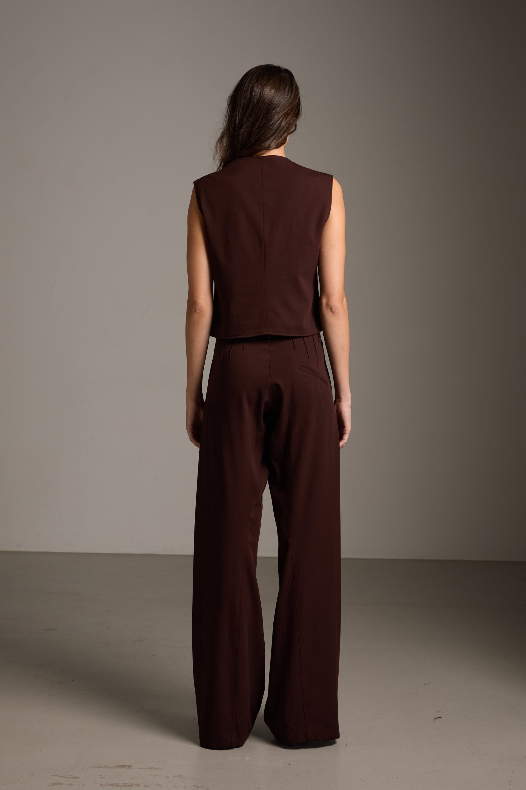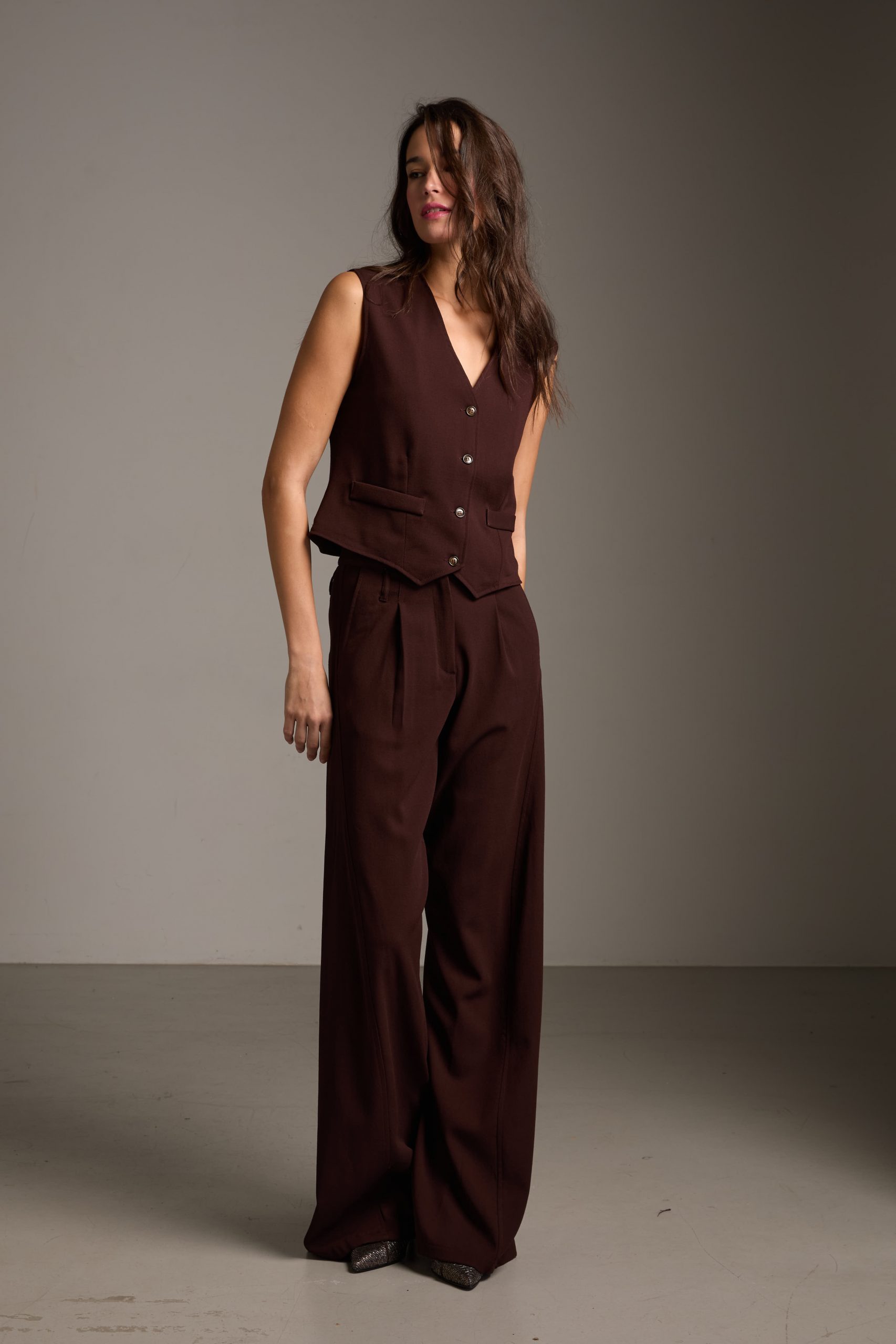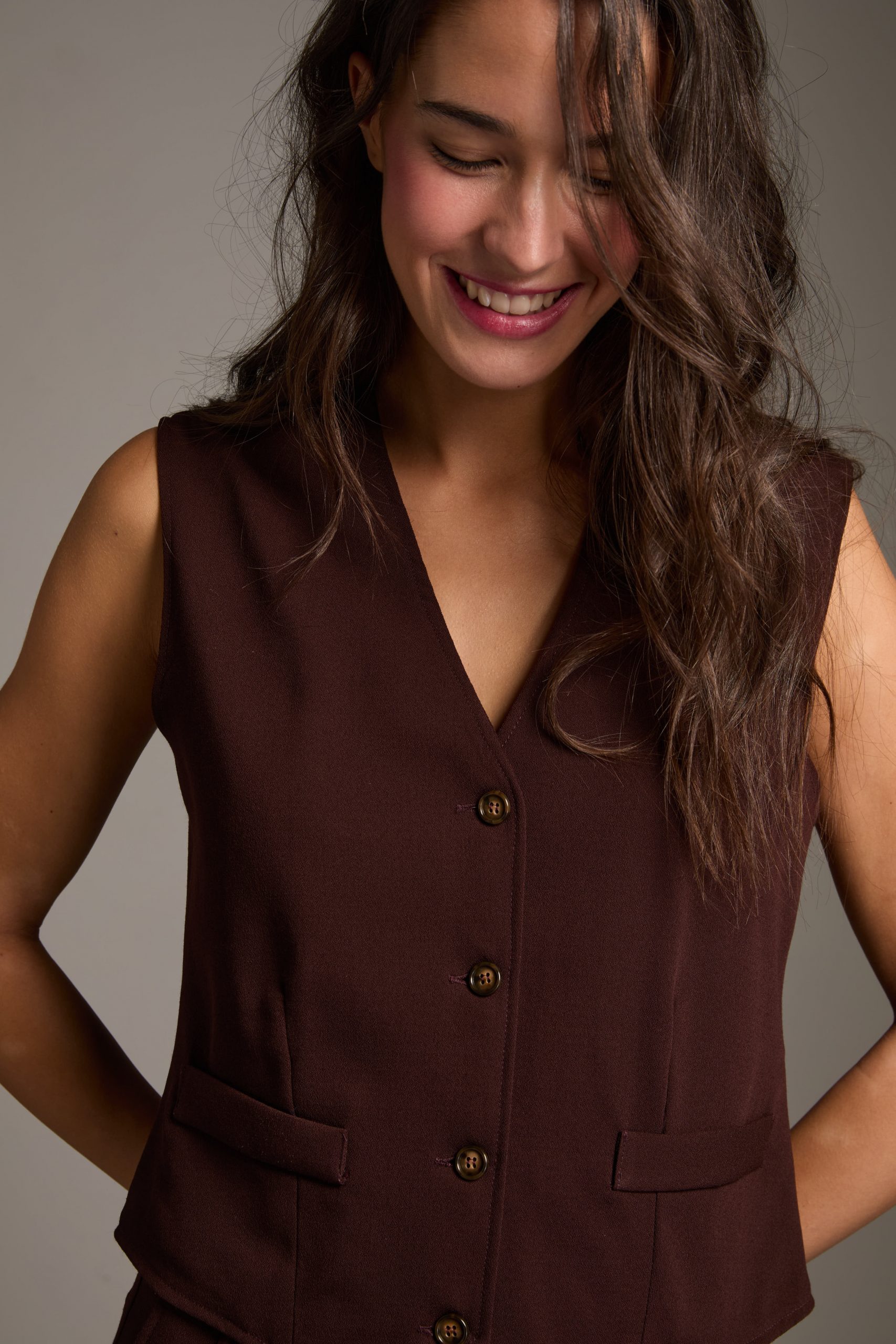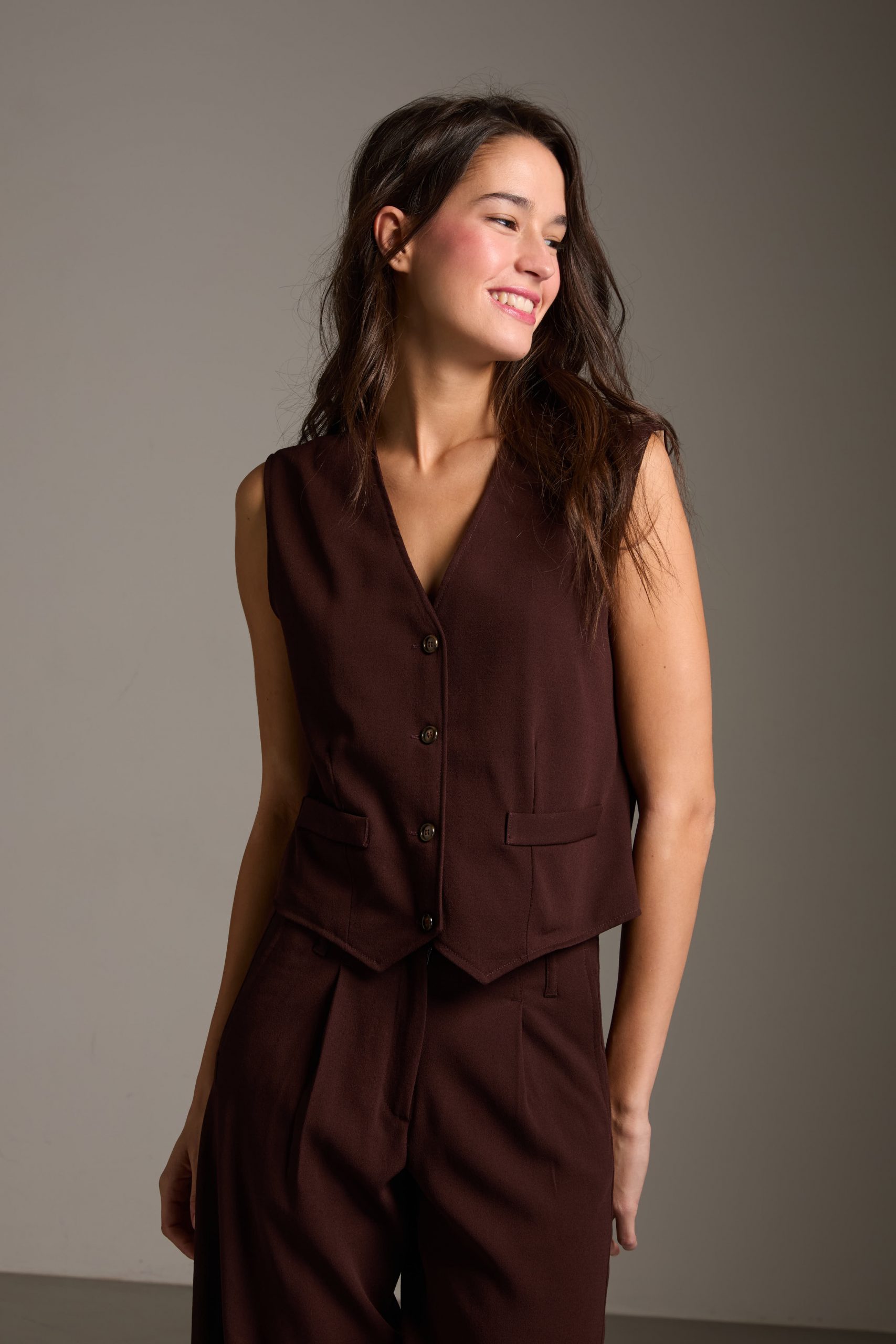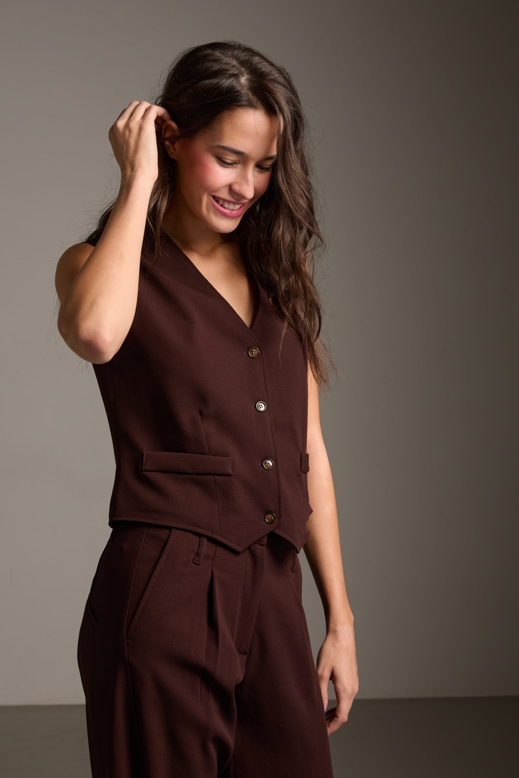 La versione in crepe di lana marrone leggera è perfetta sia come top che abbinato abbinato ai pantaloni e alla gicca dello stesso tessuto che su una camicia.