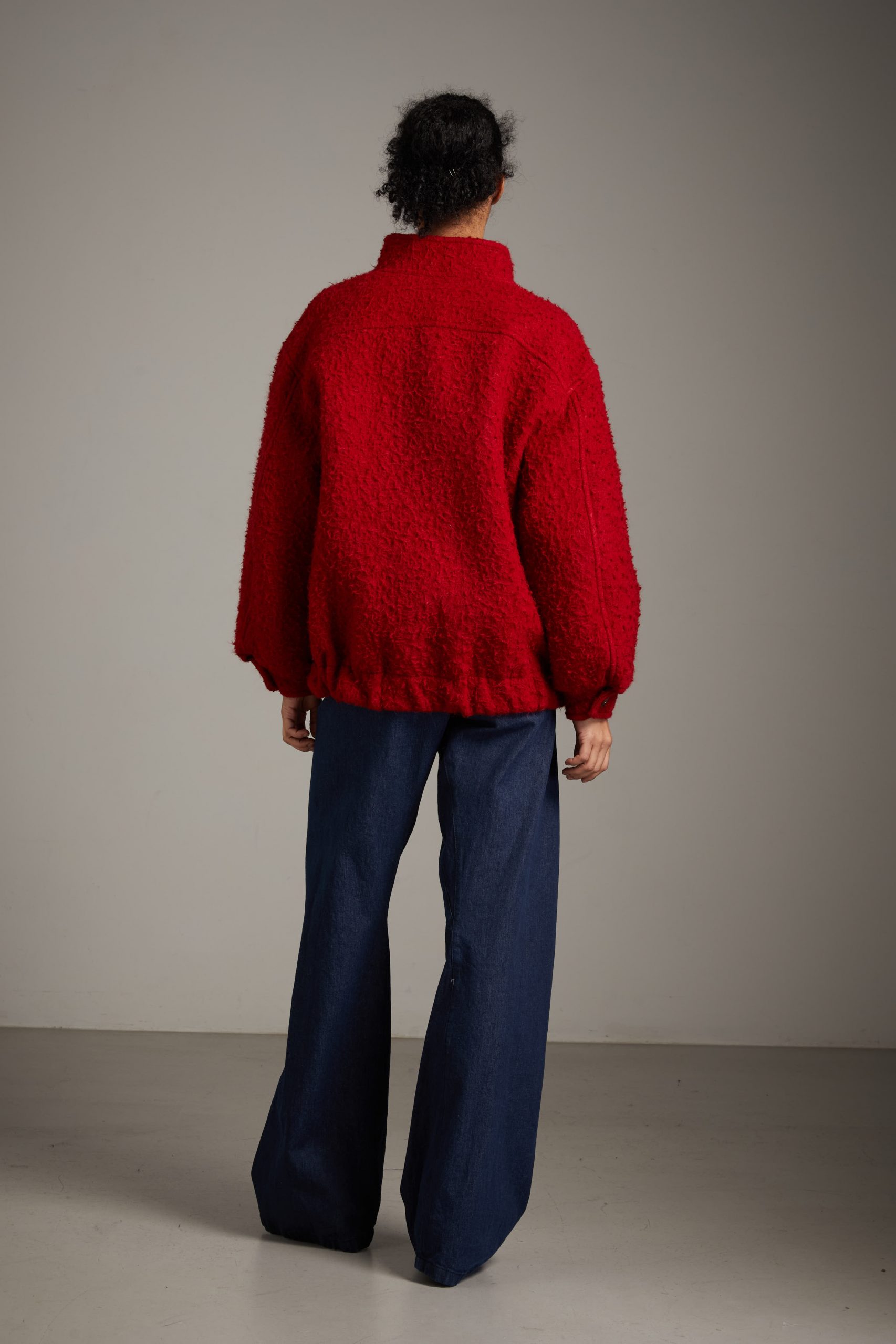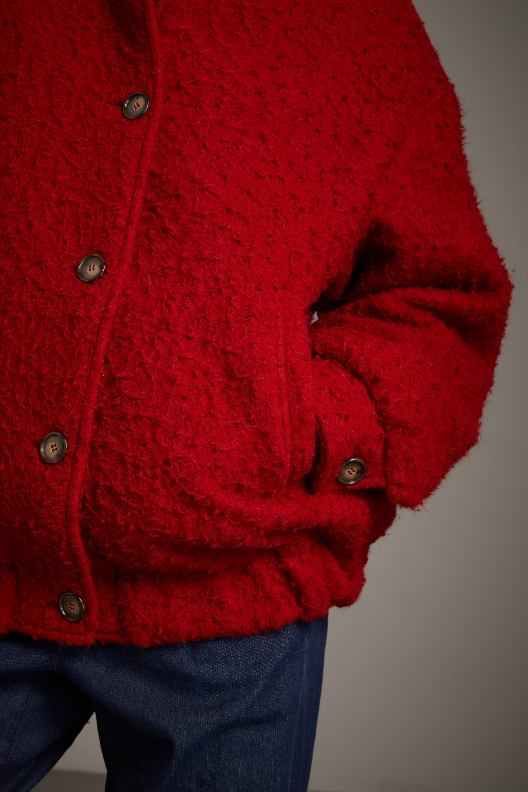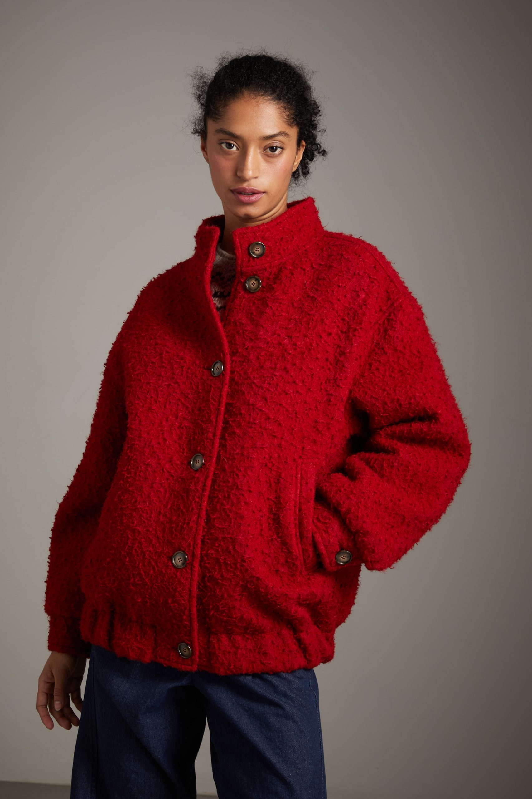 Giubbotto Mia di Carla Saibene, ispirato dal taglio bomber oversize, con elastico sul fondo, collo alto e abbottonatura sul davanti in casentino rosso