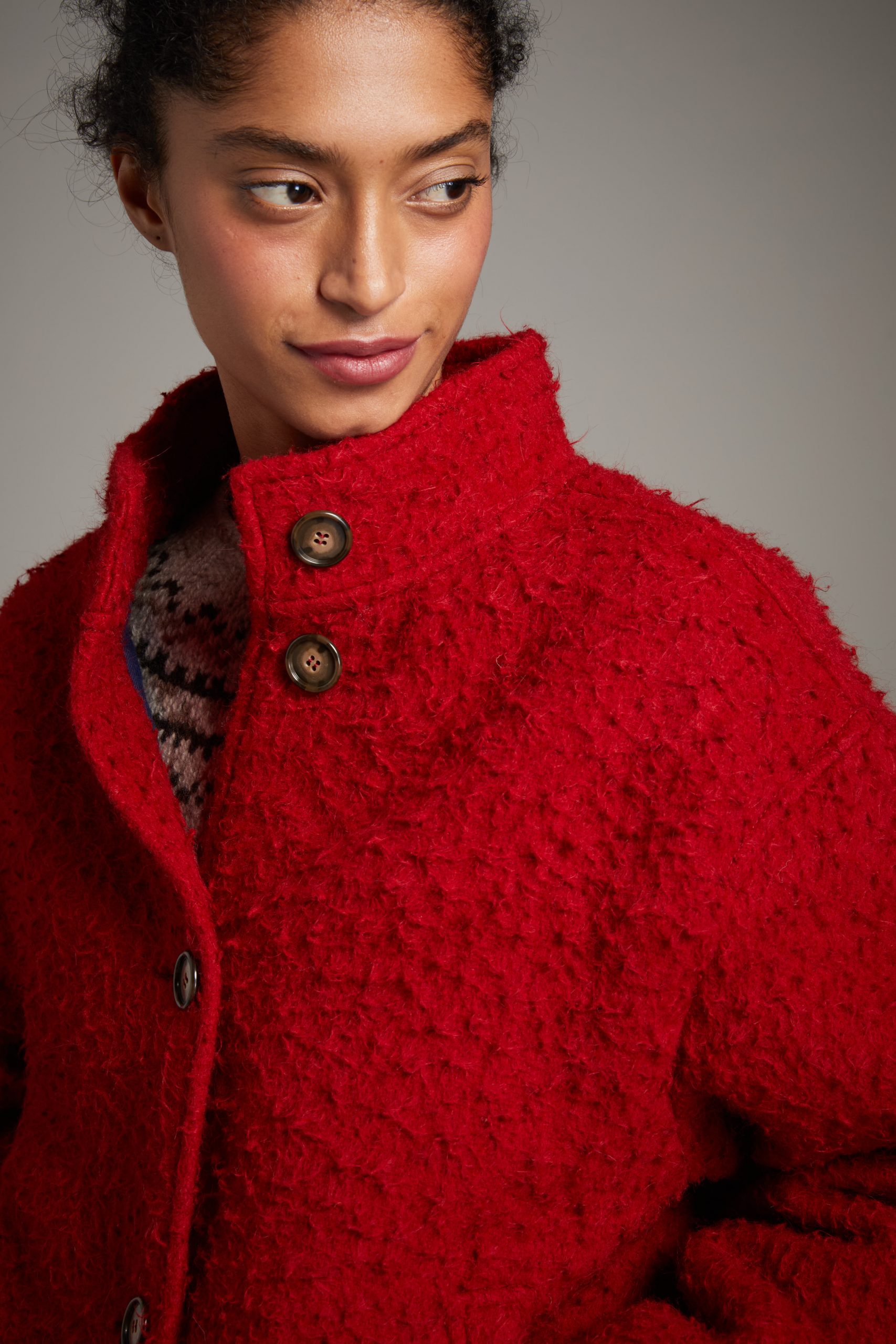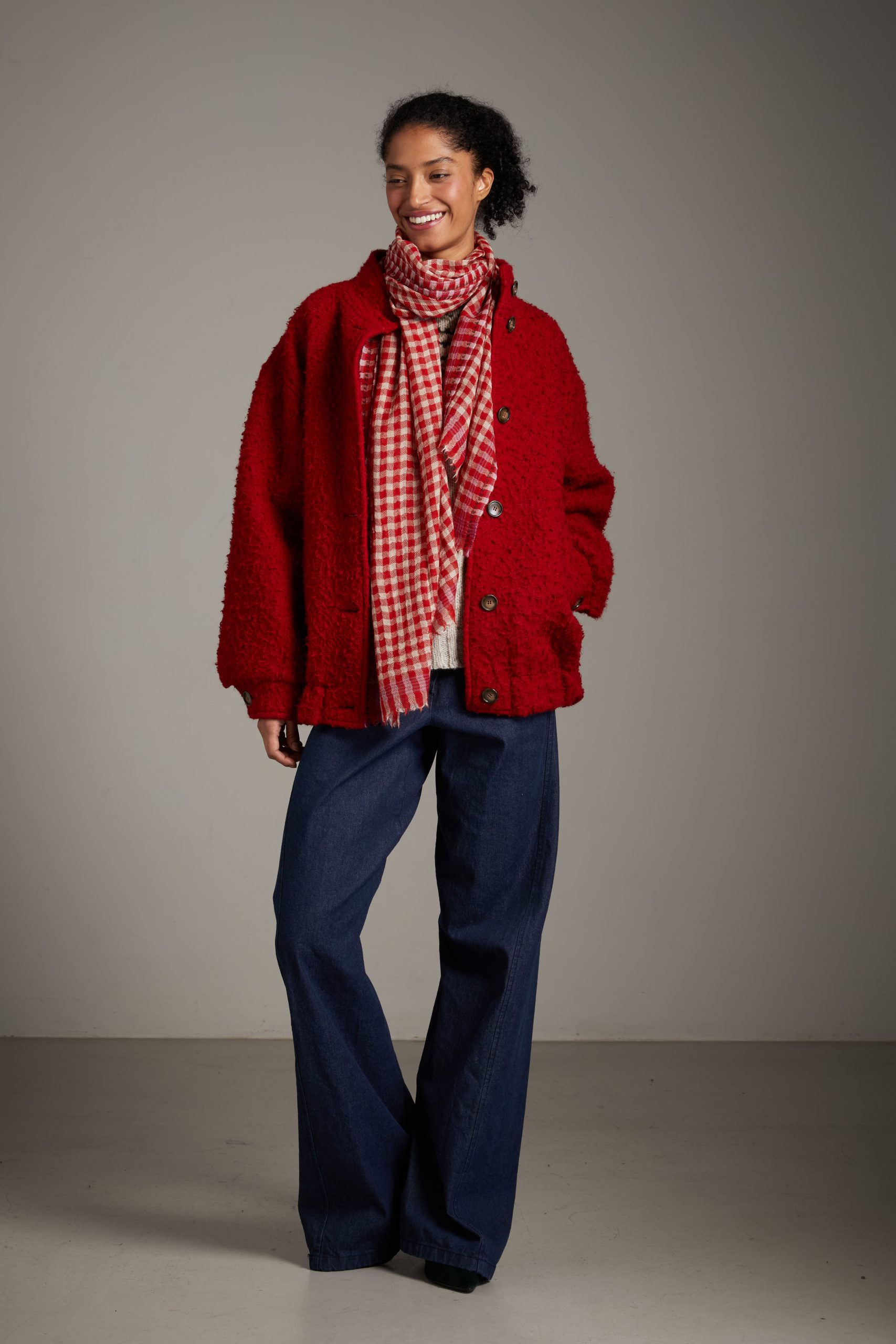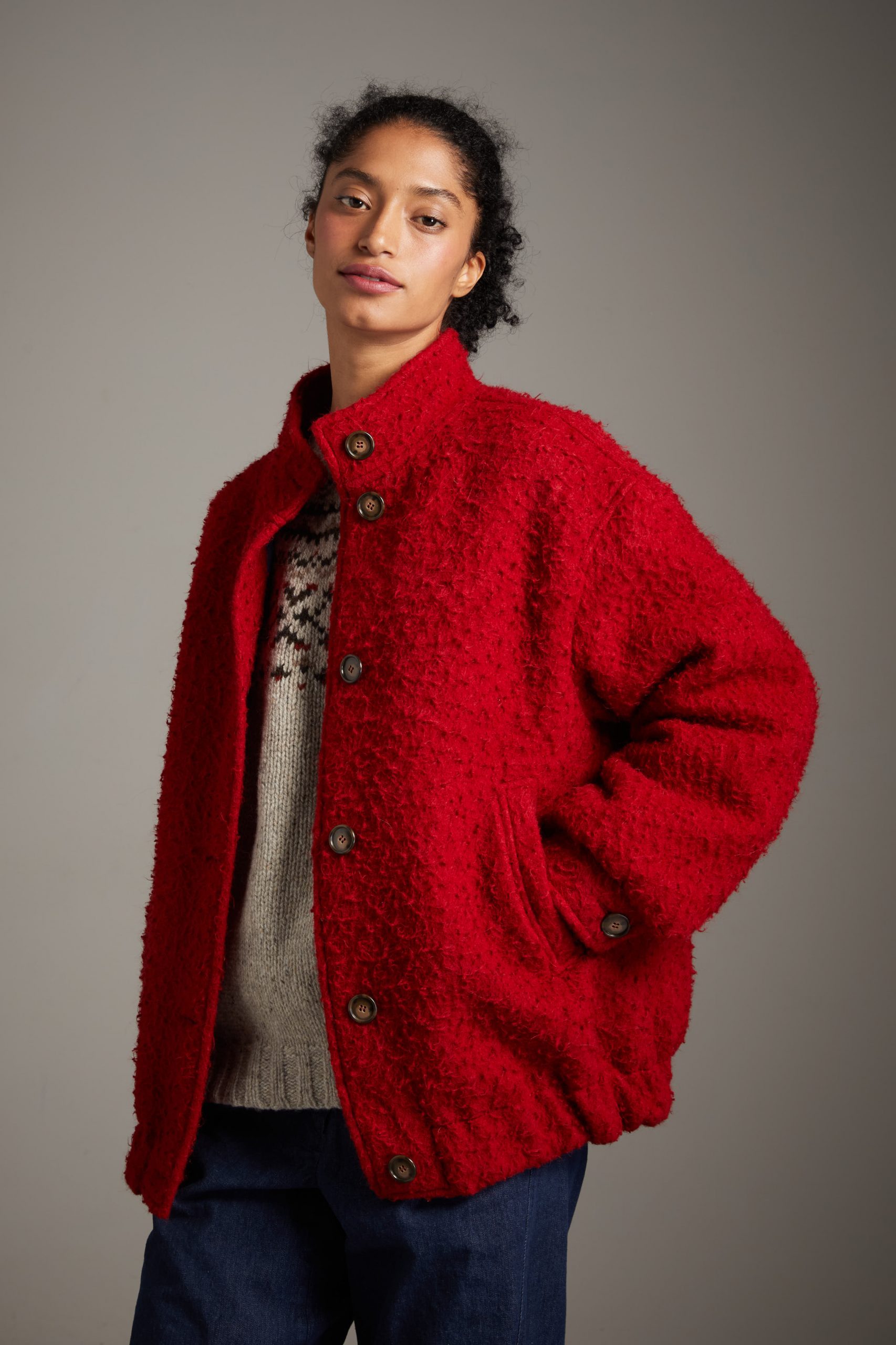 Giubbotto Mia di Carla Saibene, ispirato dal taglio bomber oversize, con elastico sul fondo, collo alto e abbottonatura sul davanti in casentino rosso