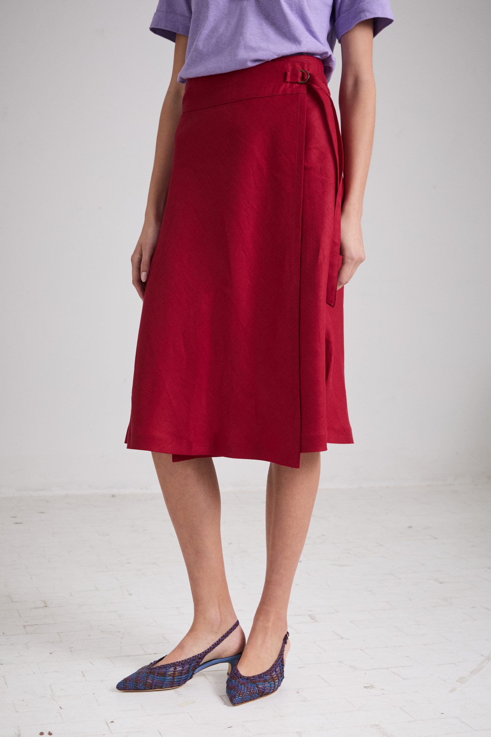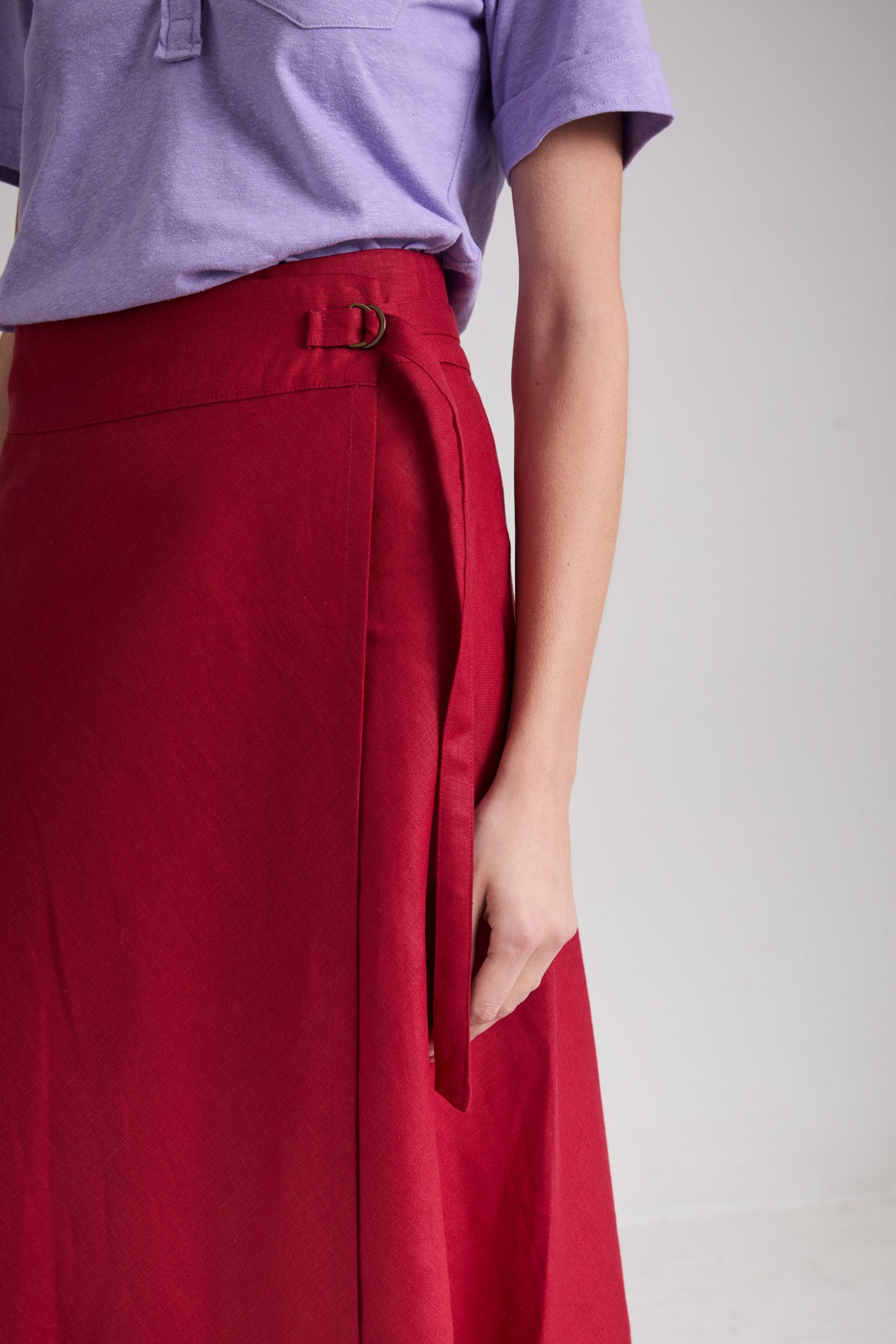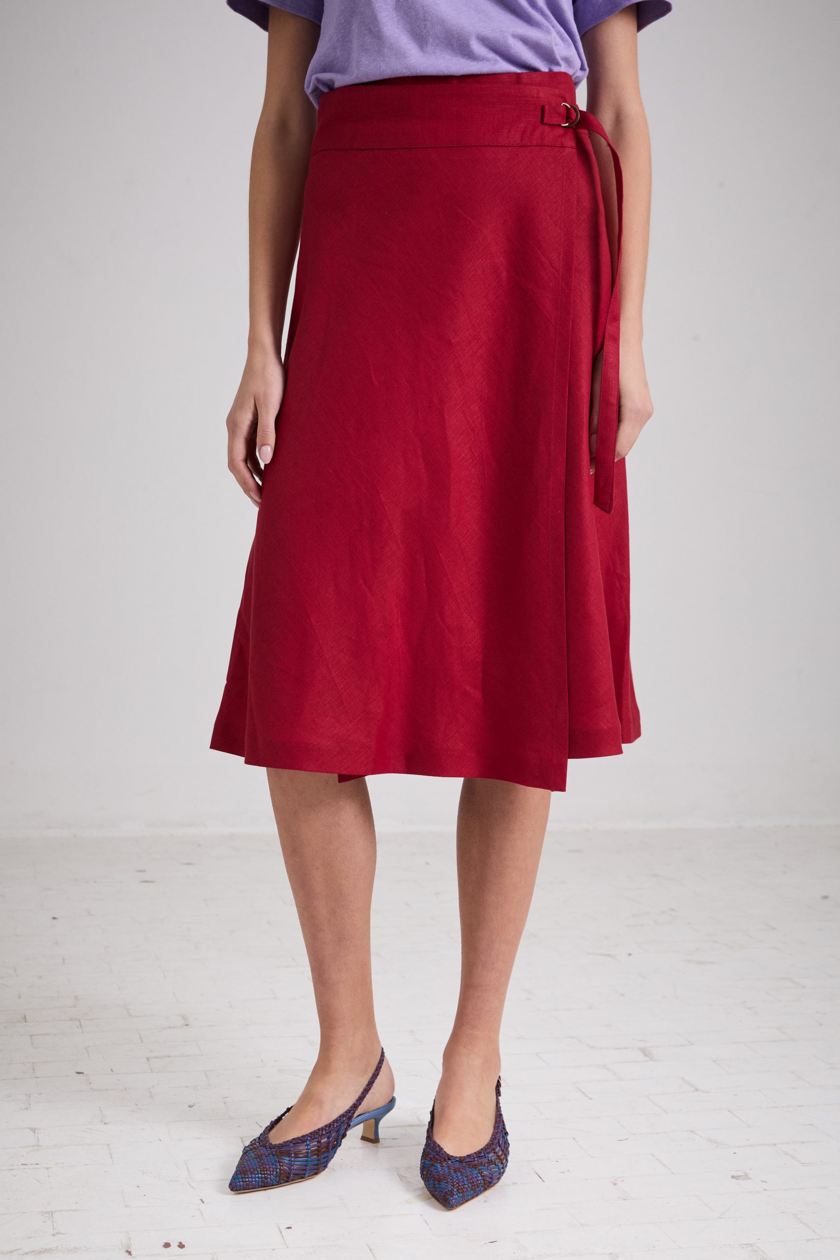 Gonna Brigitte di Carla Saibene, lunghezza midi, dalla linea leggermente svasata, in lino rosso scuro. Il taglio in sbieco rende questo modello donante e femminile, con baschina alta e regolabile a piacere grazie al laccio in vita chiuso con fibbie a doppia D.