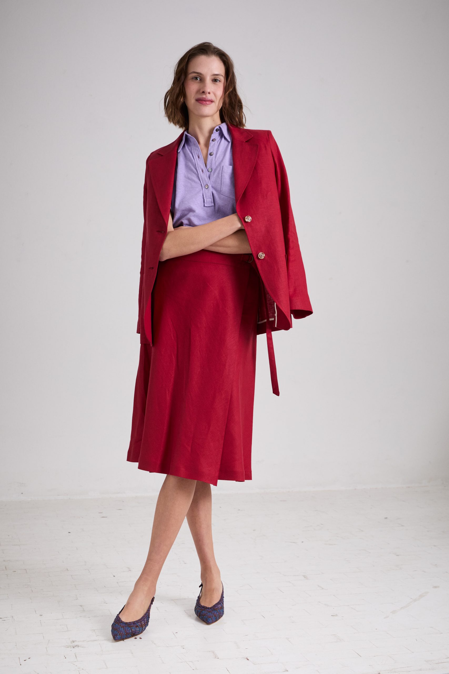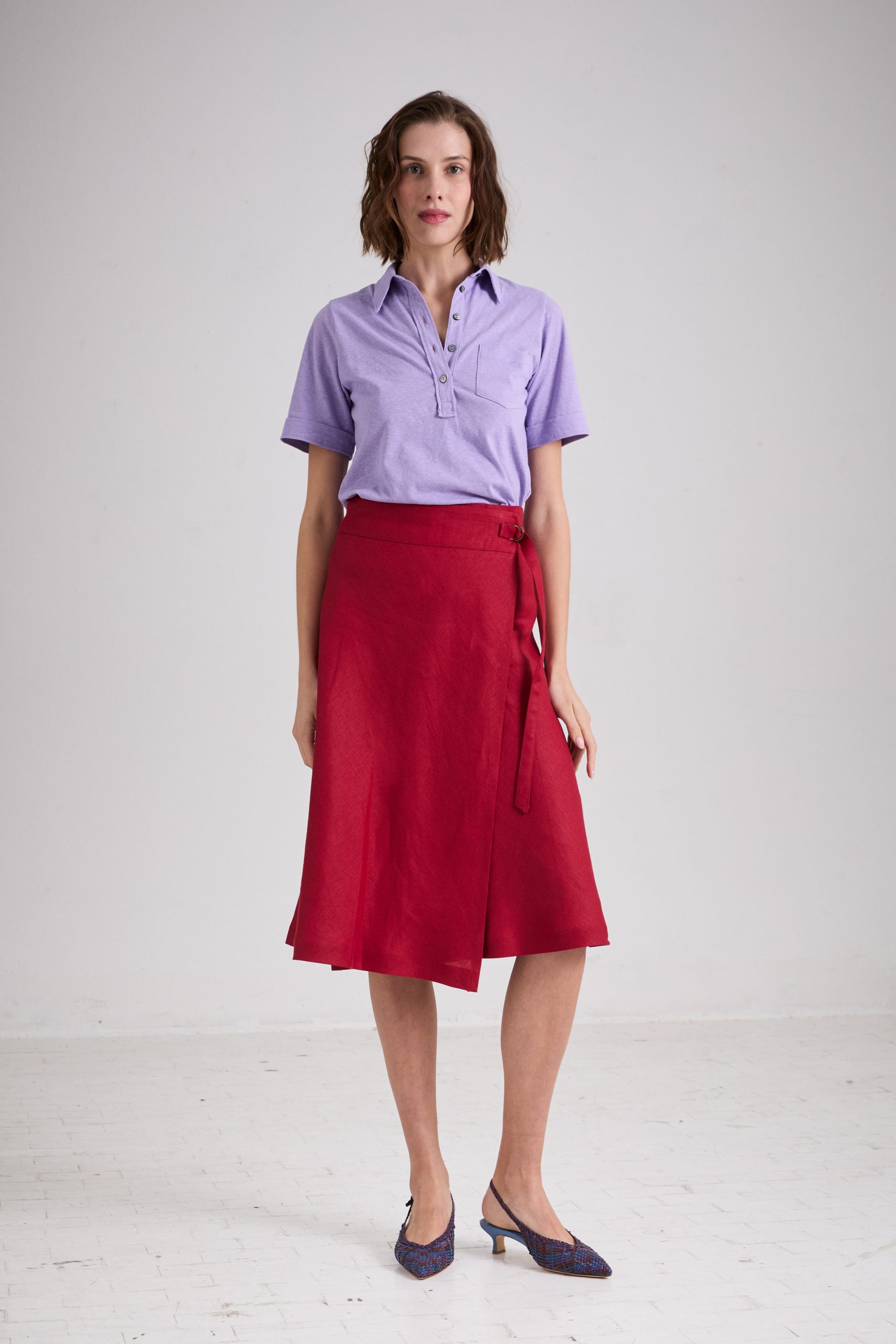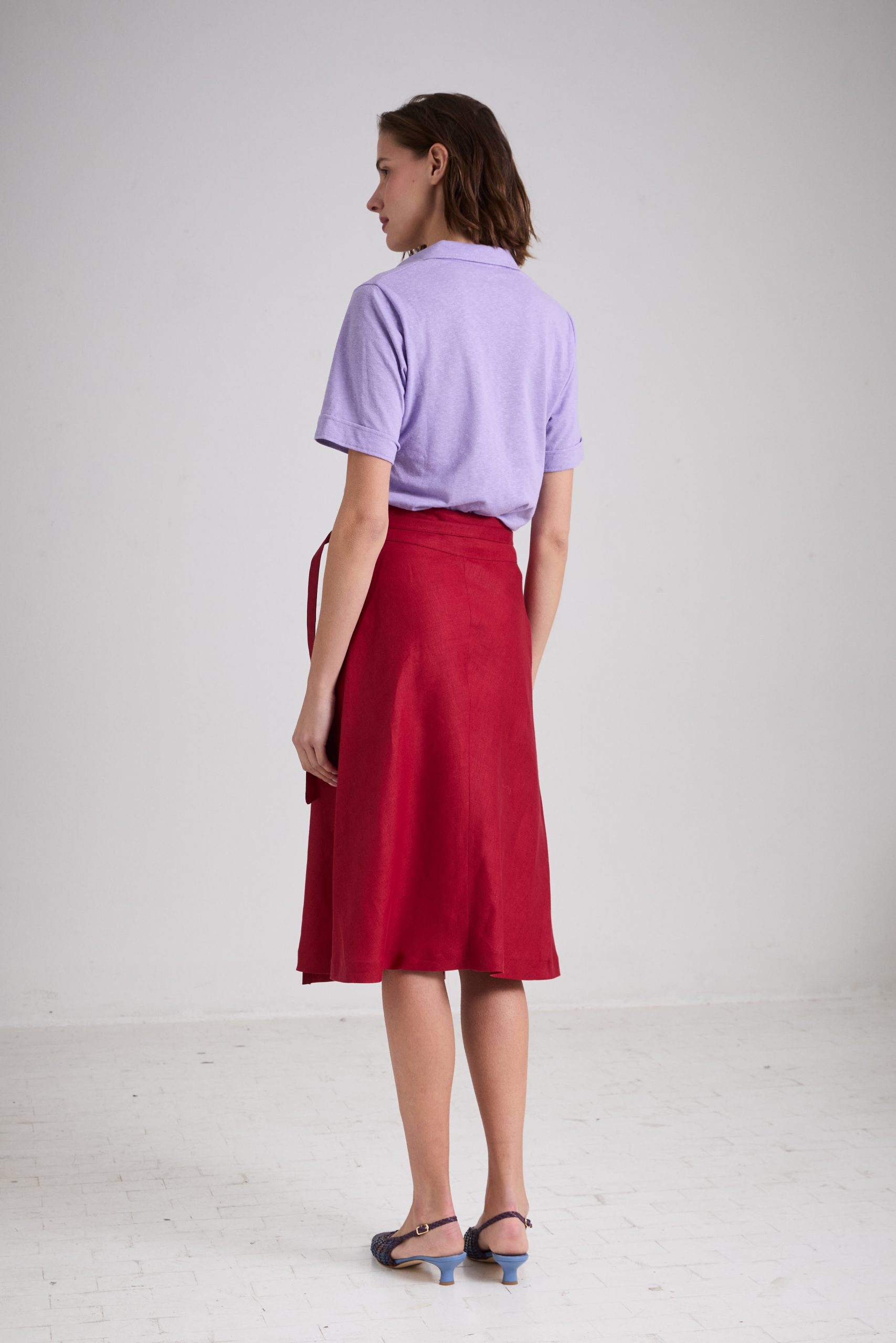 Gonna Brigitte di Carla Saibene, lunghezza midi, dalla linea leggermente svasata, in lino rosso scuro. Il taglio in sbieco rende questo modello donante e femminile, con baschina alta e regolabile a piacere grazie al laccio in vita chiuso con fibbie a doppia D.