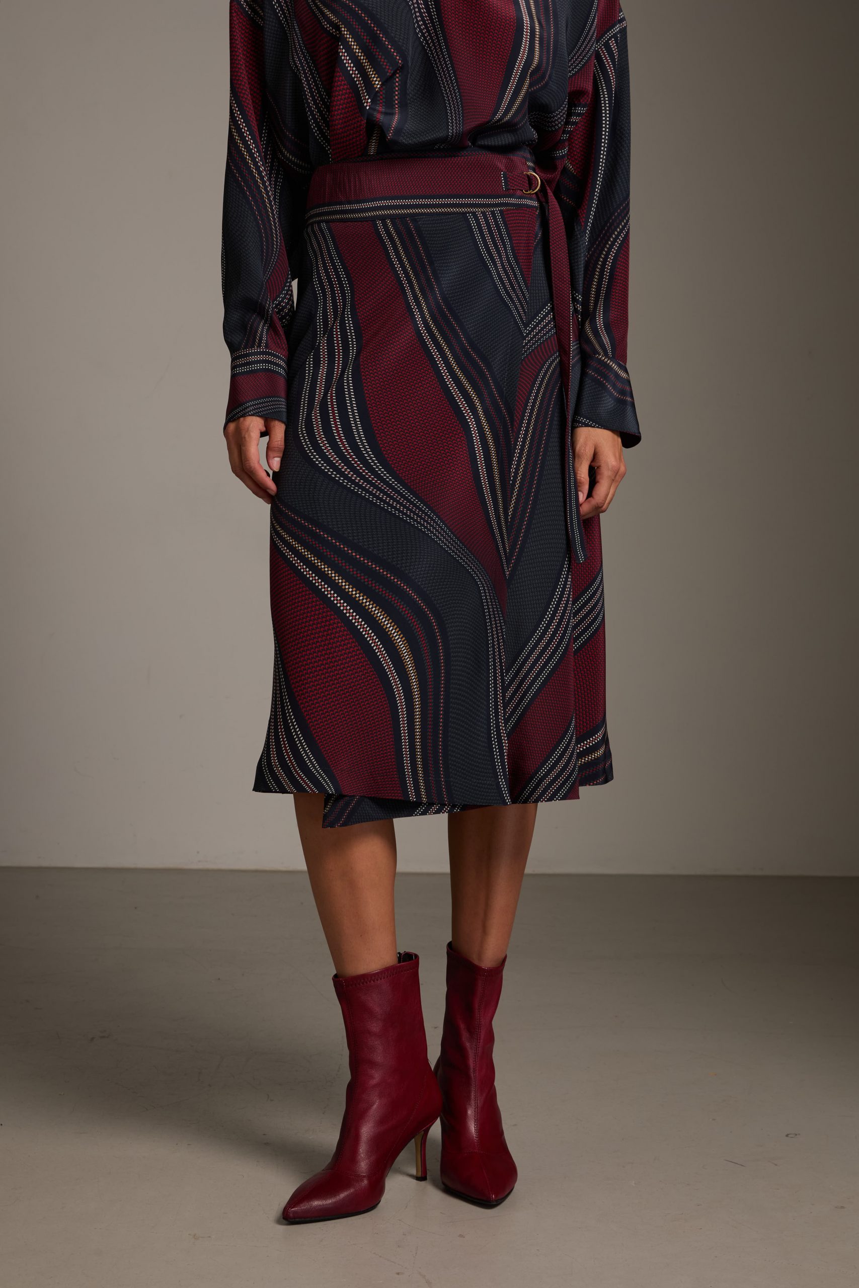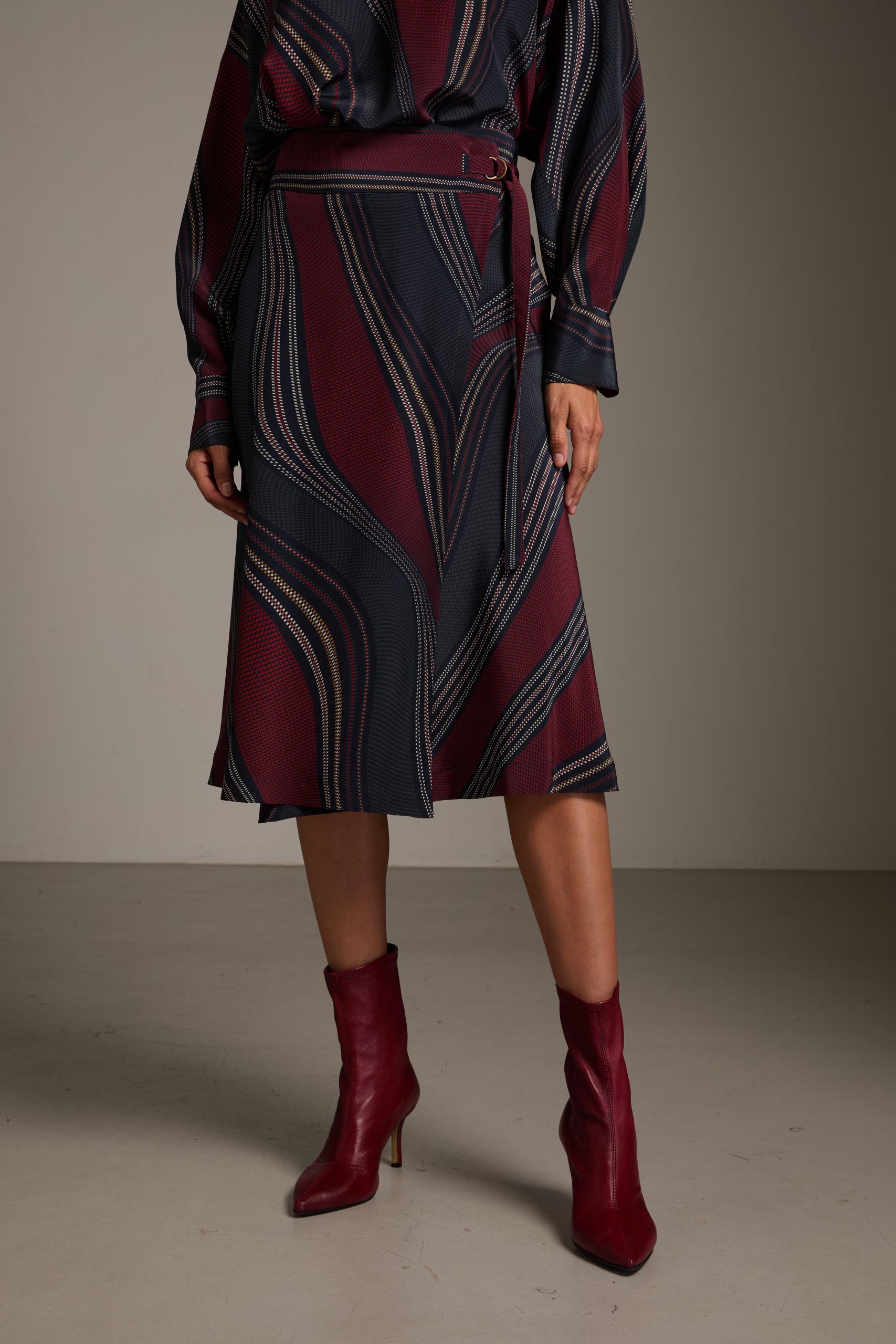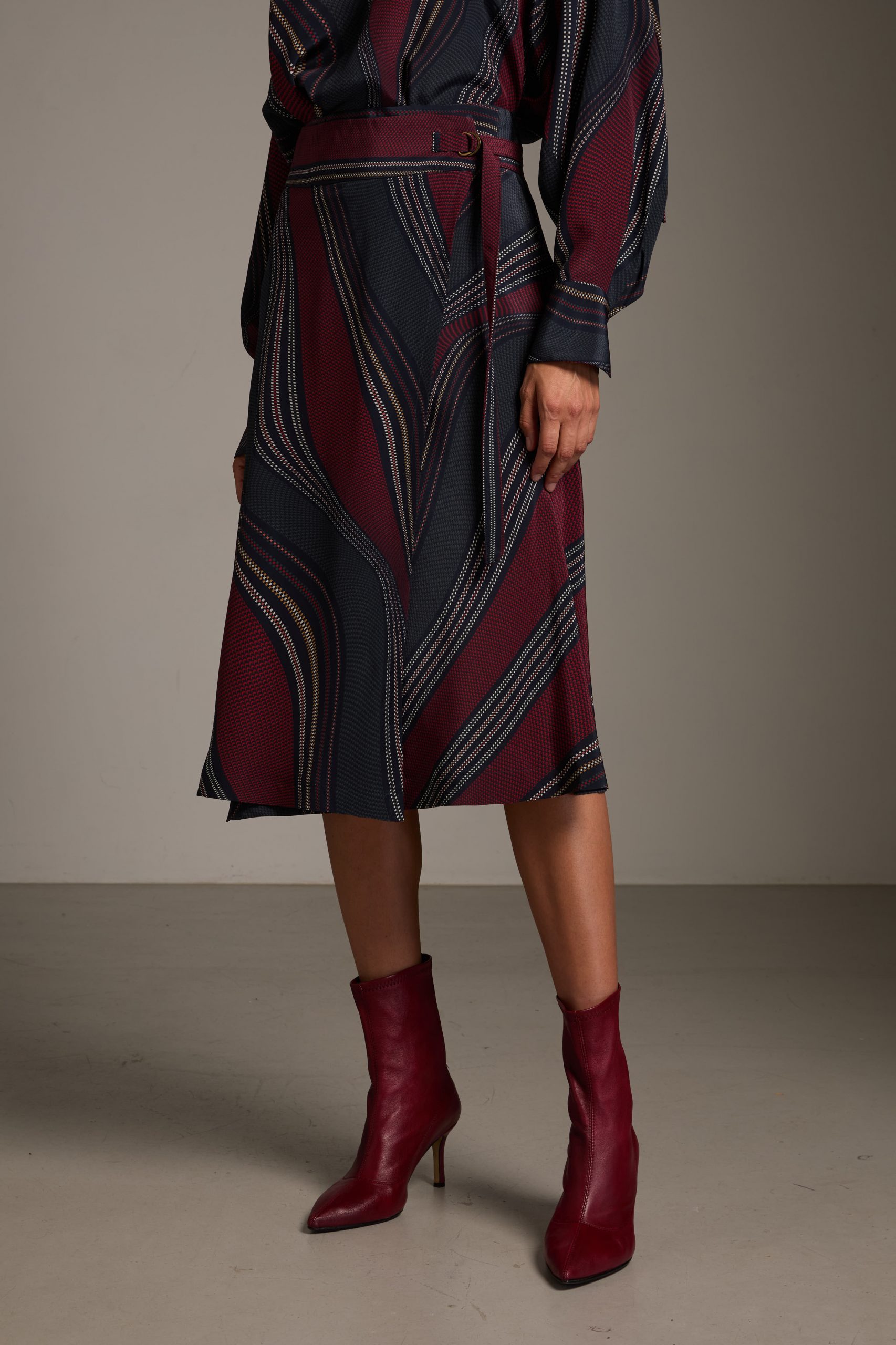 Gonna Brigitte di Carla Saibene, lunghezza midi, dalla linea leggermente svasata, in seta stampata blue bordeaux. Il taglio in sbieco rende questo modello donante e femminile, con baschina alta e regolabile a piacere grazie al laccio in vita chiuso con fibbie a doppia D.