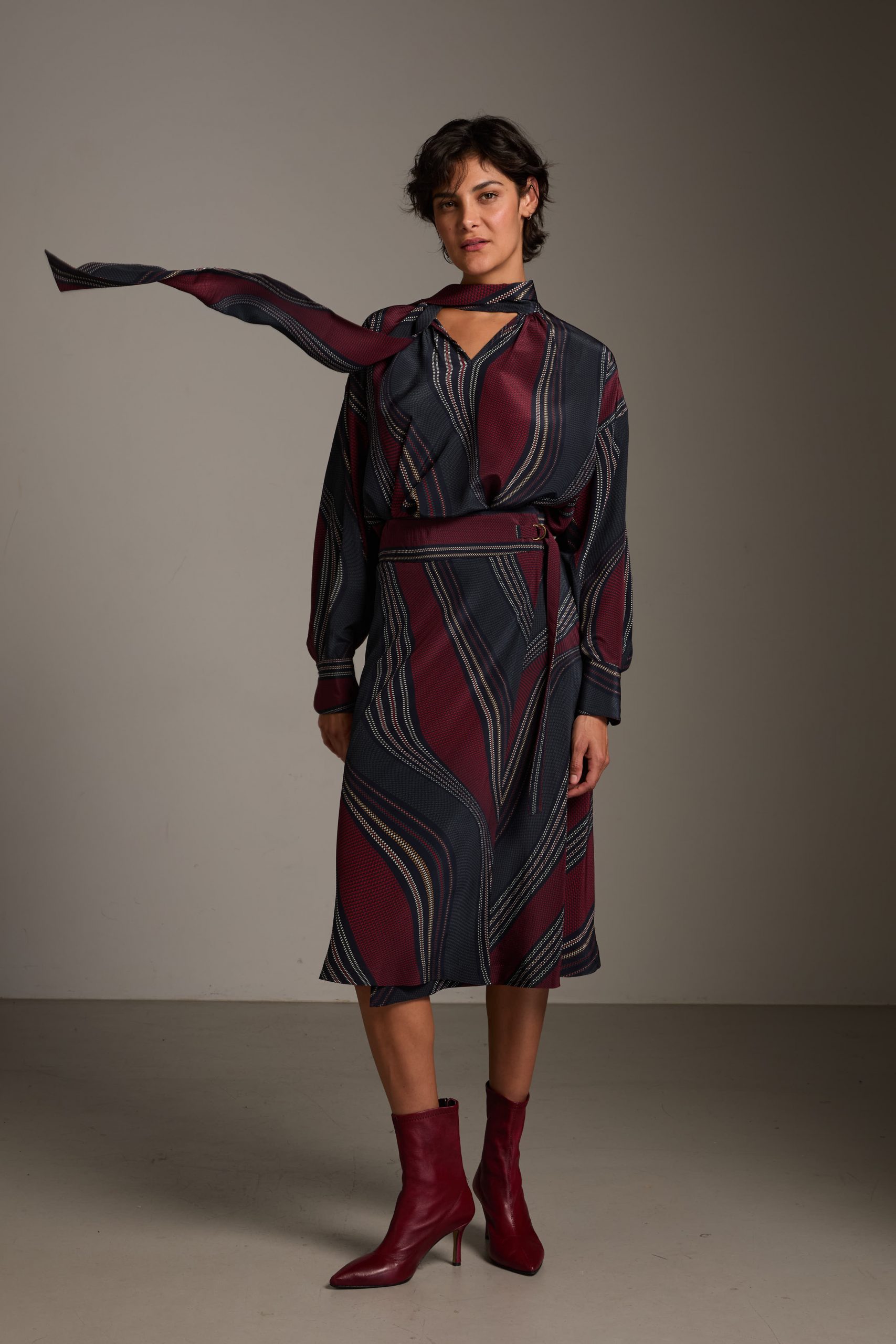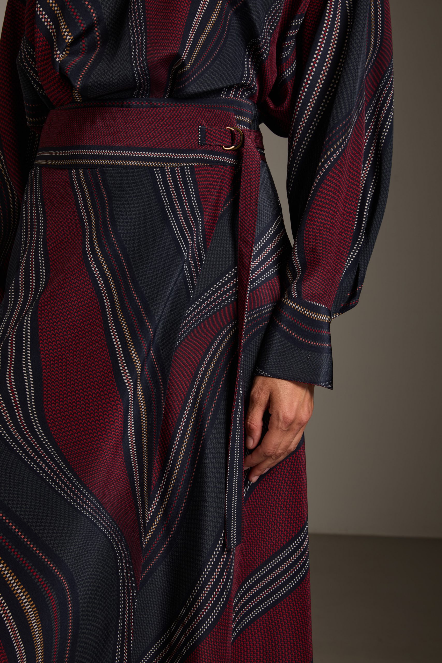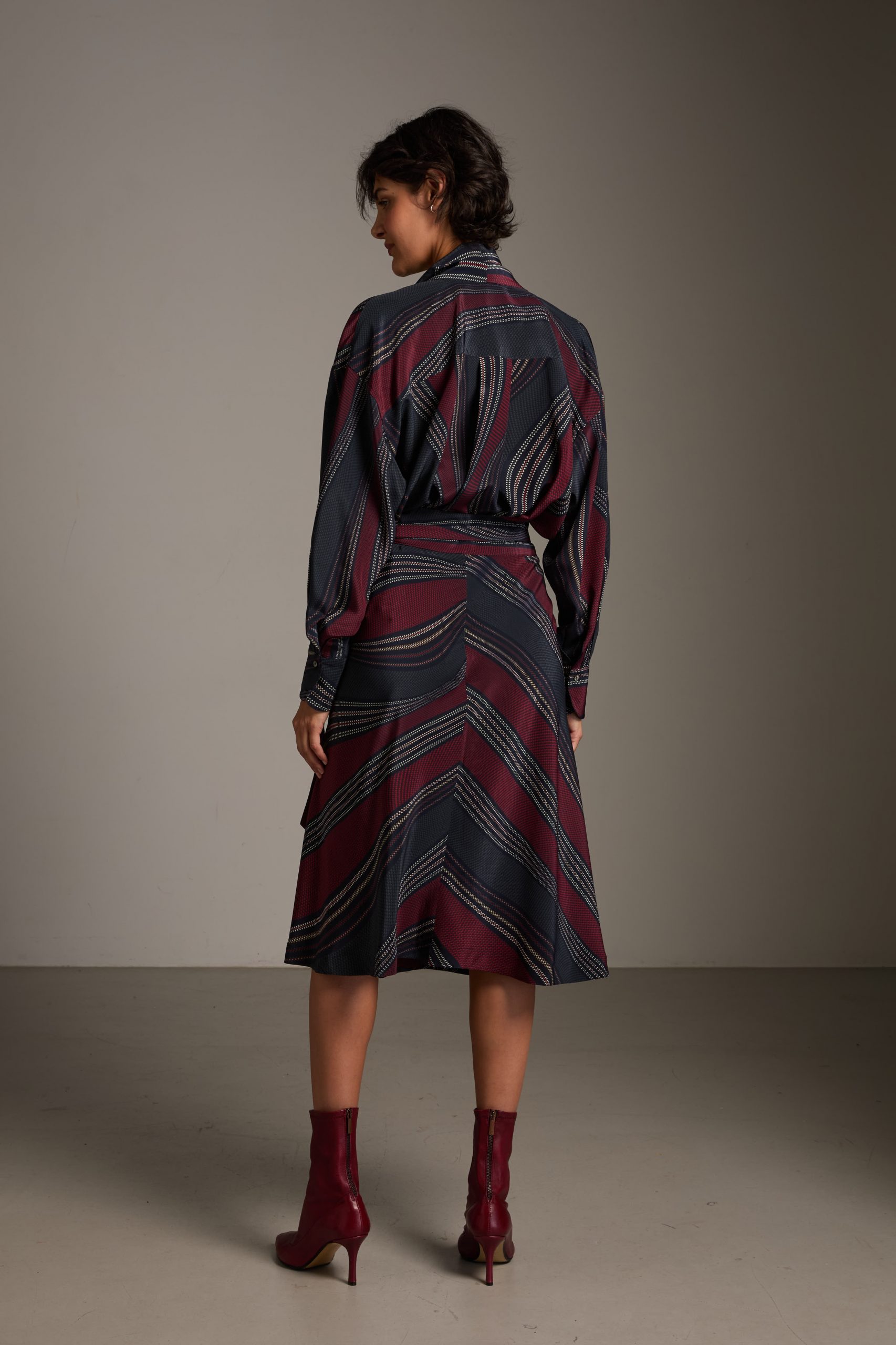 Gonna Brigitte di Carla Saibene, lunghezza midi, dalla linea leggermente svasata, in seta stampata blue bordeaux. Il taglio in sbieco rende questo modello donante e femminile, con baschina alta e regolabile a piacere grazie al laccio in vita chiuso con fibbie a doppia D.