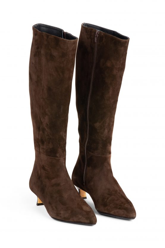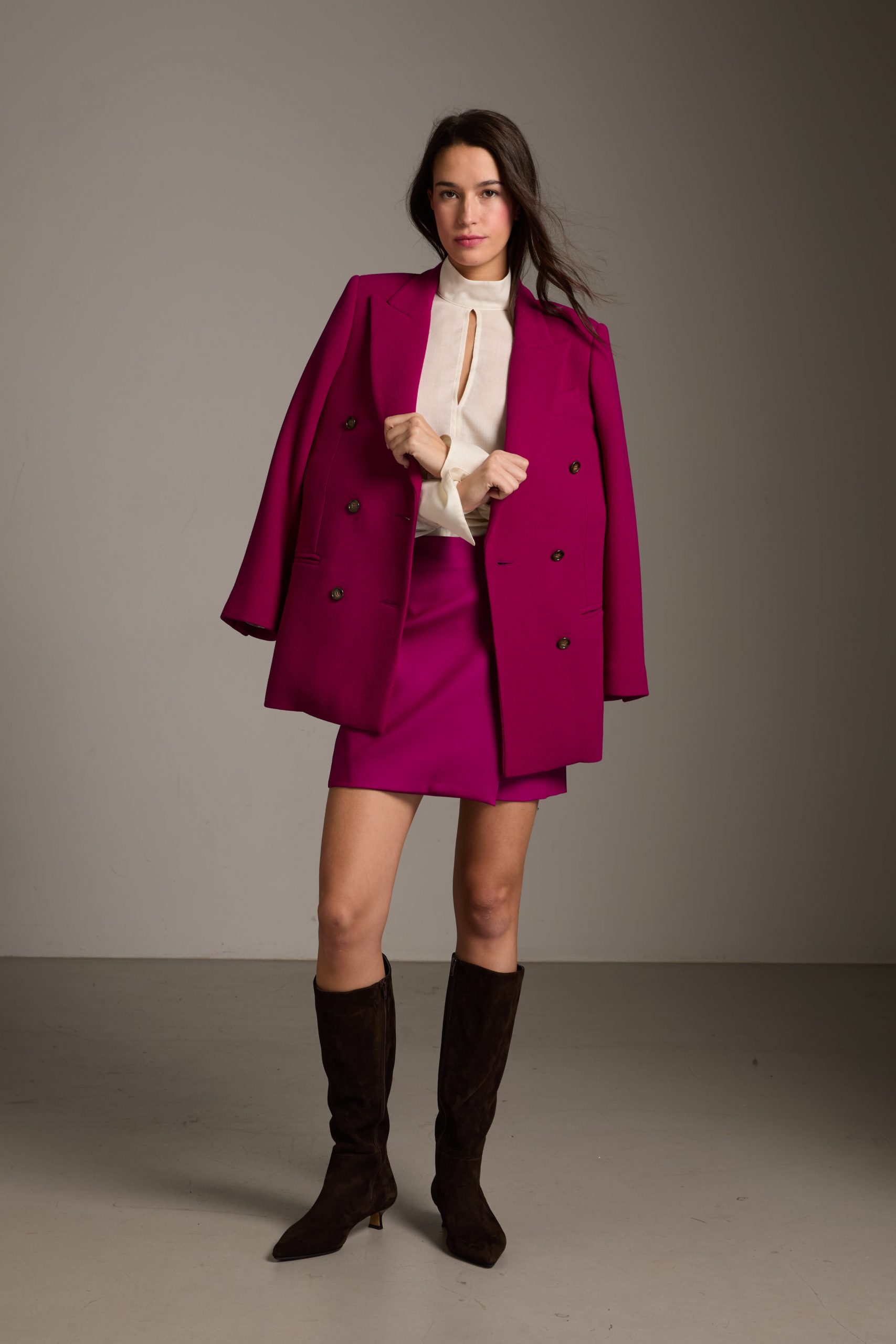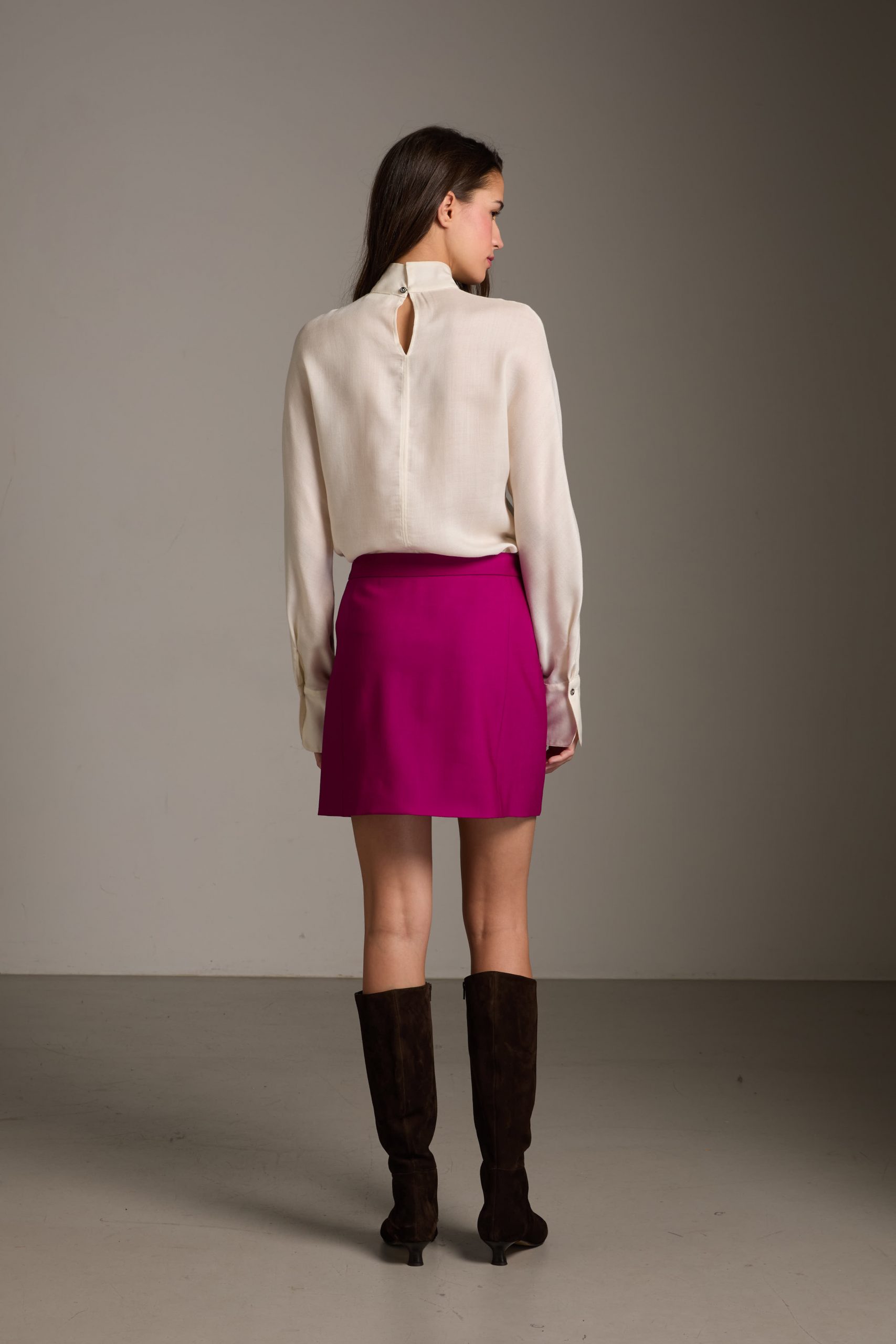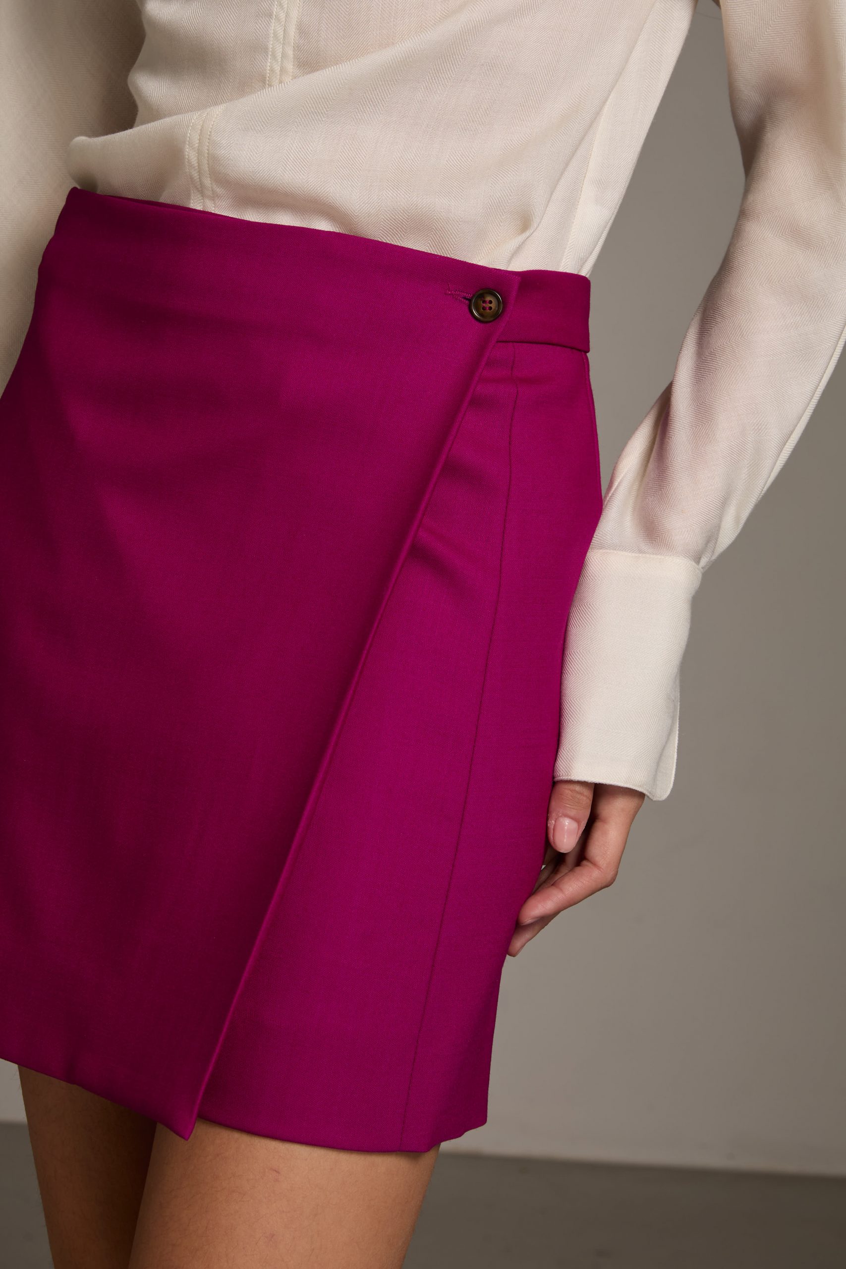 Minigonna Minnie di Carla Saibene, dalla linea dritta e chiusura a portafoglio con due bottoni, in lana ciclamino