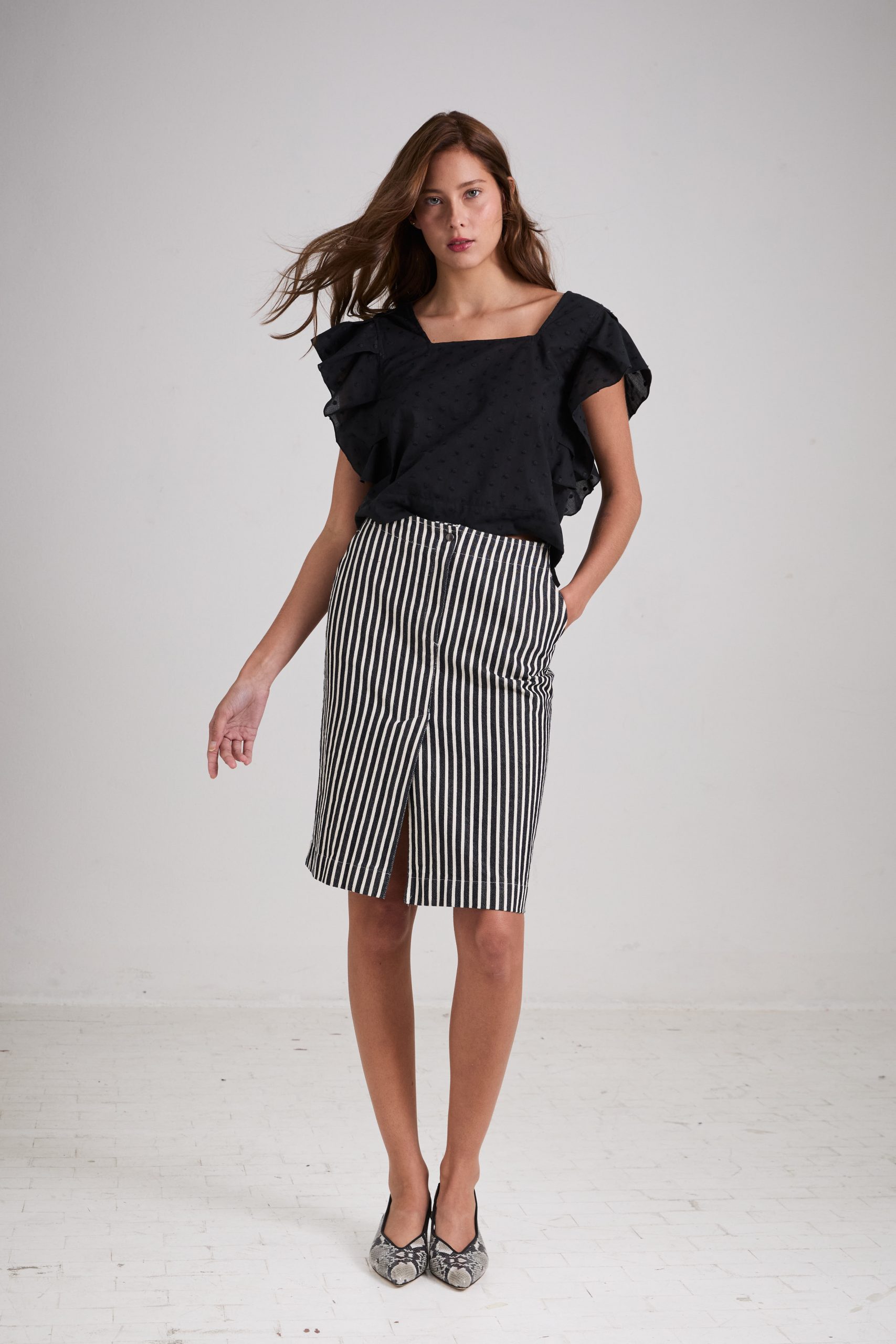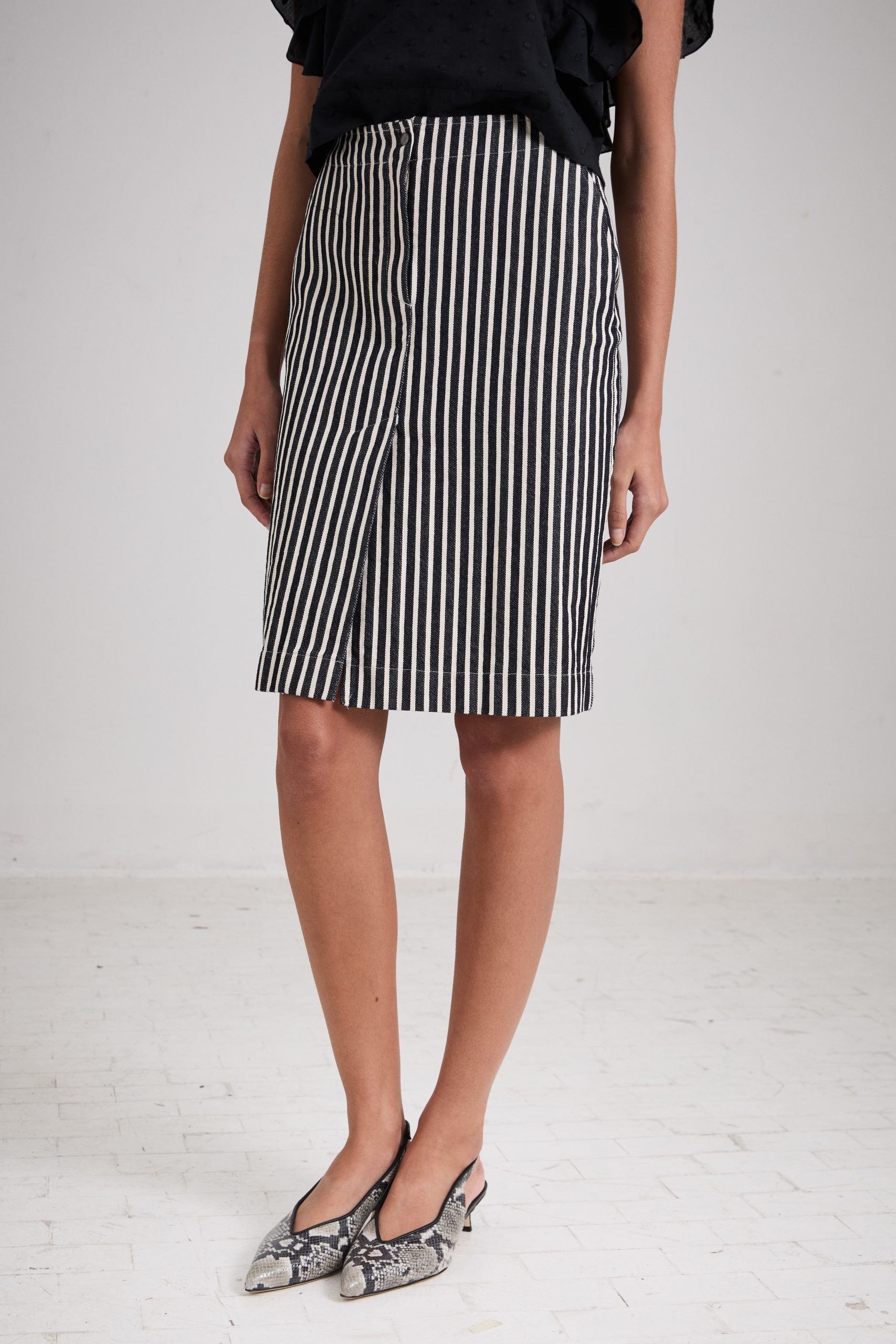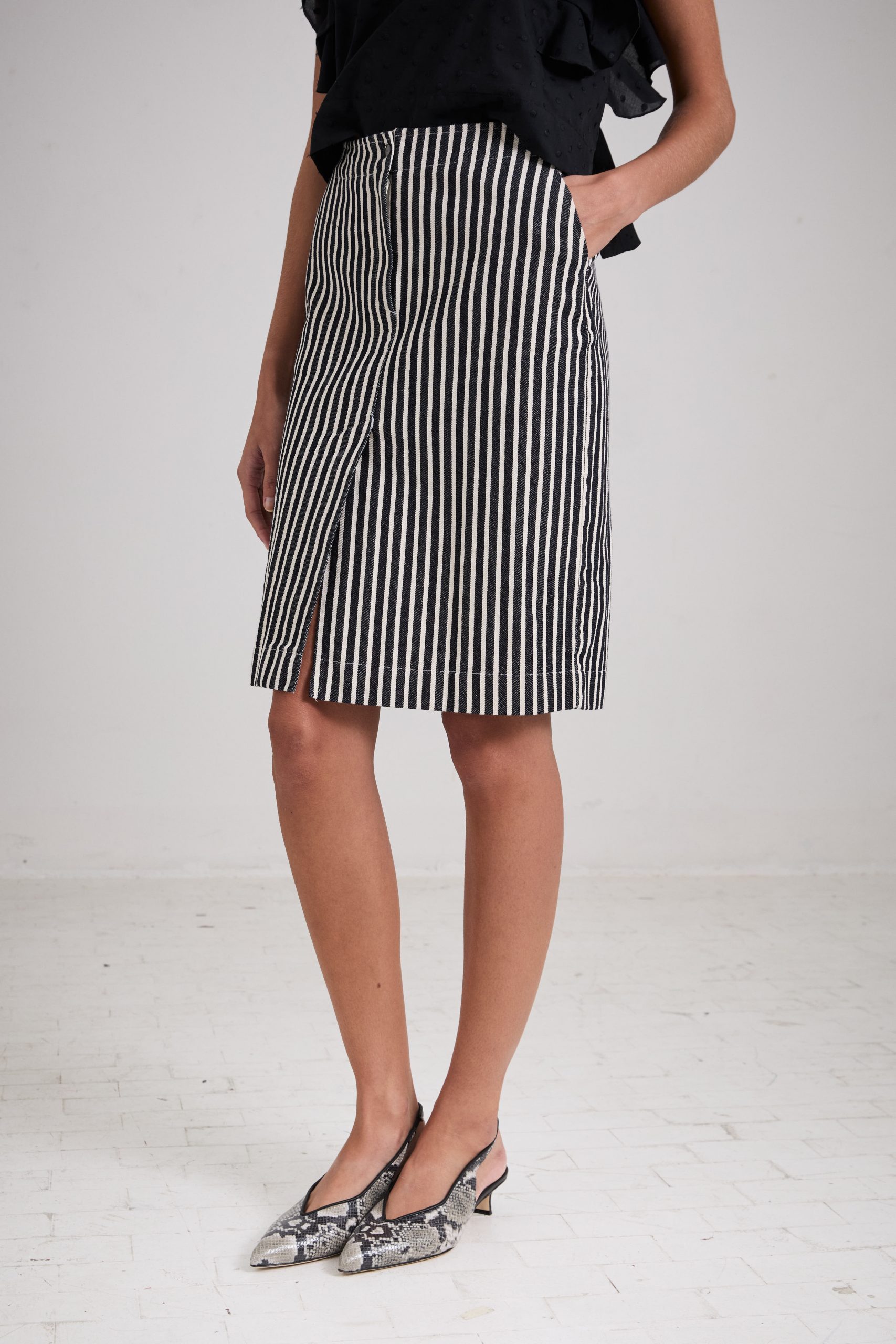 Gonna Virna di Carla Saibene, al ginocchio dalla linea dritta, con spacco centrale frontale, con dettagli ispirati ai pantaloni maschili, tasche laterali e patta centrale in denim a righe bianche e nere