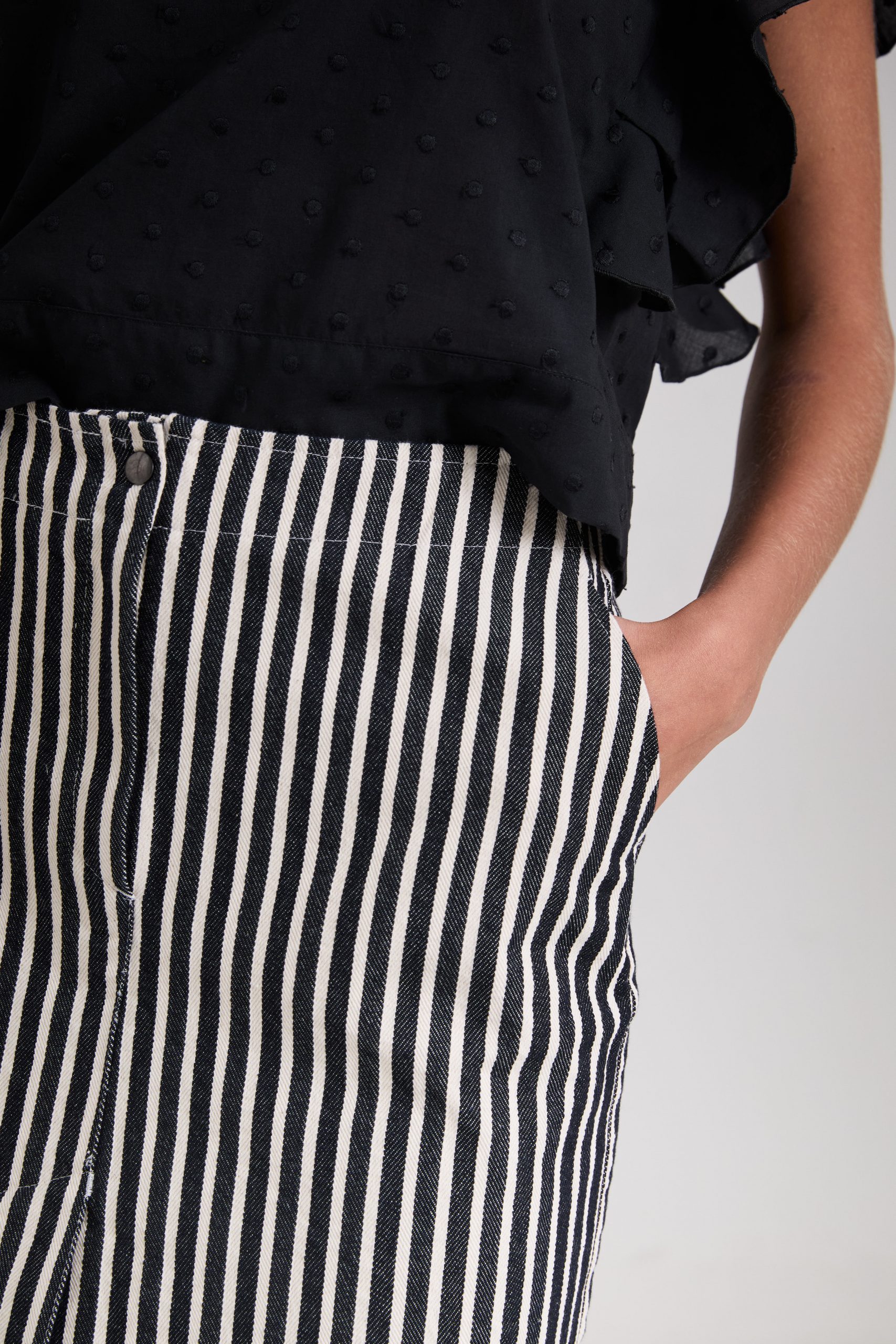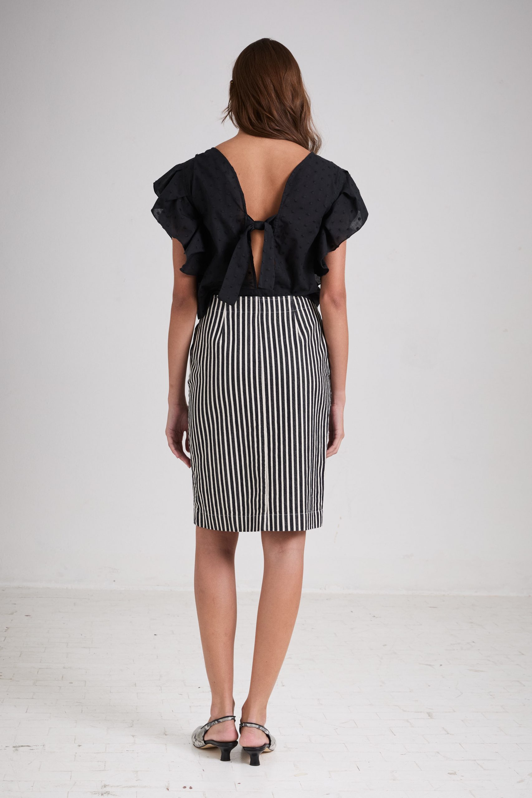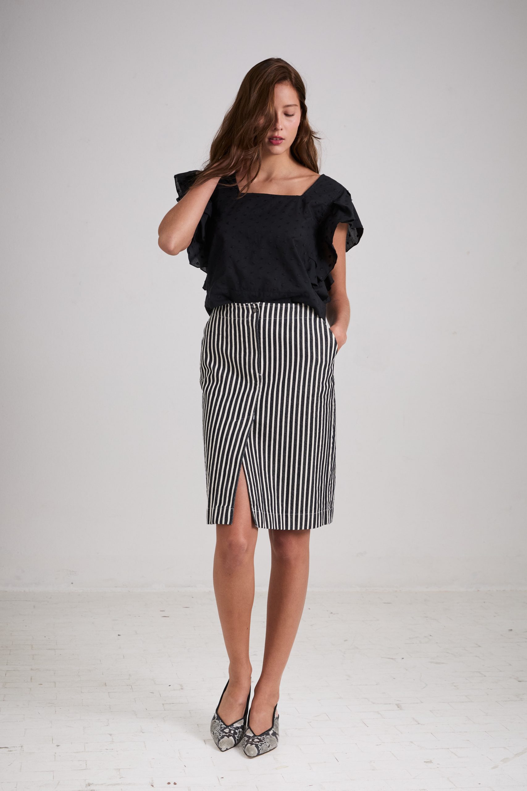 Gonna Virna di Carla Saibene, al ginocchio dalla linea dritta, con spacco centrale frontale, con dettagli ispirati ai pantaloni maschili, tasche laterali e patta centrale in denim a righe bianche e nere